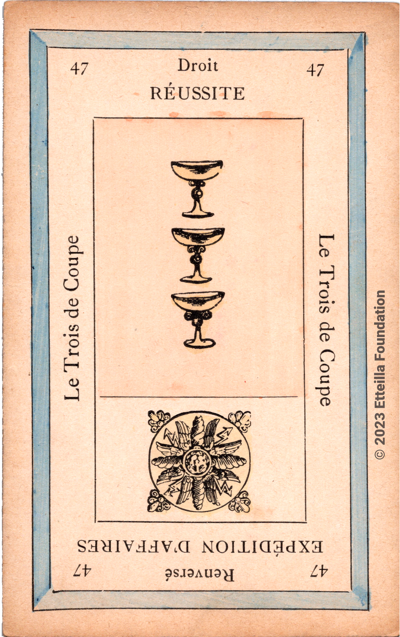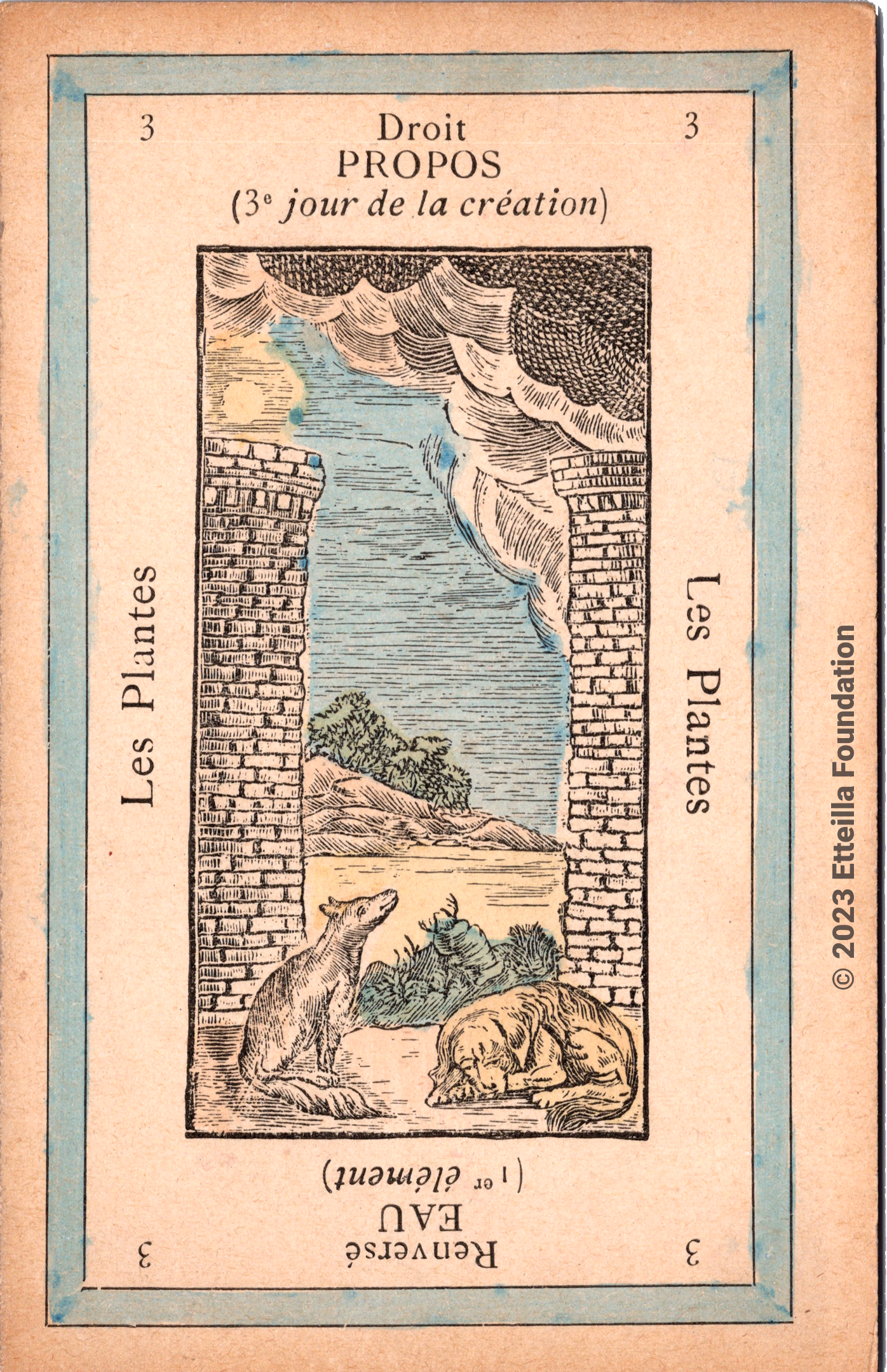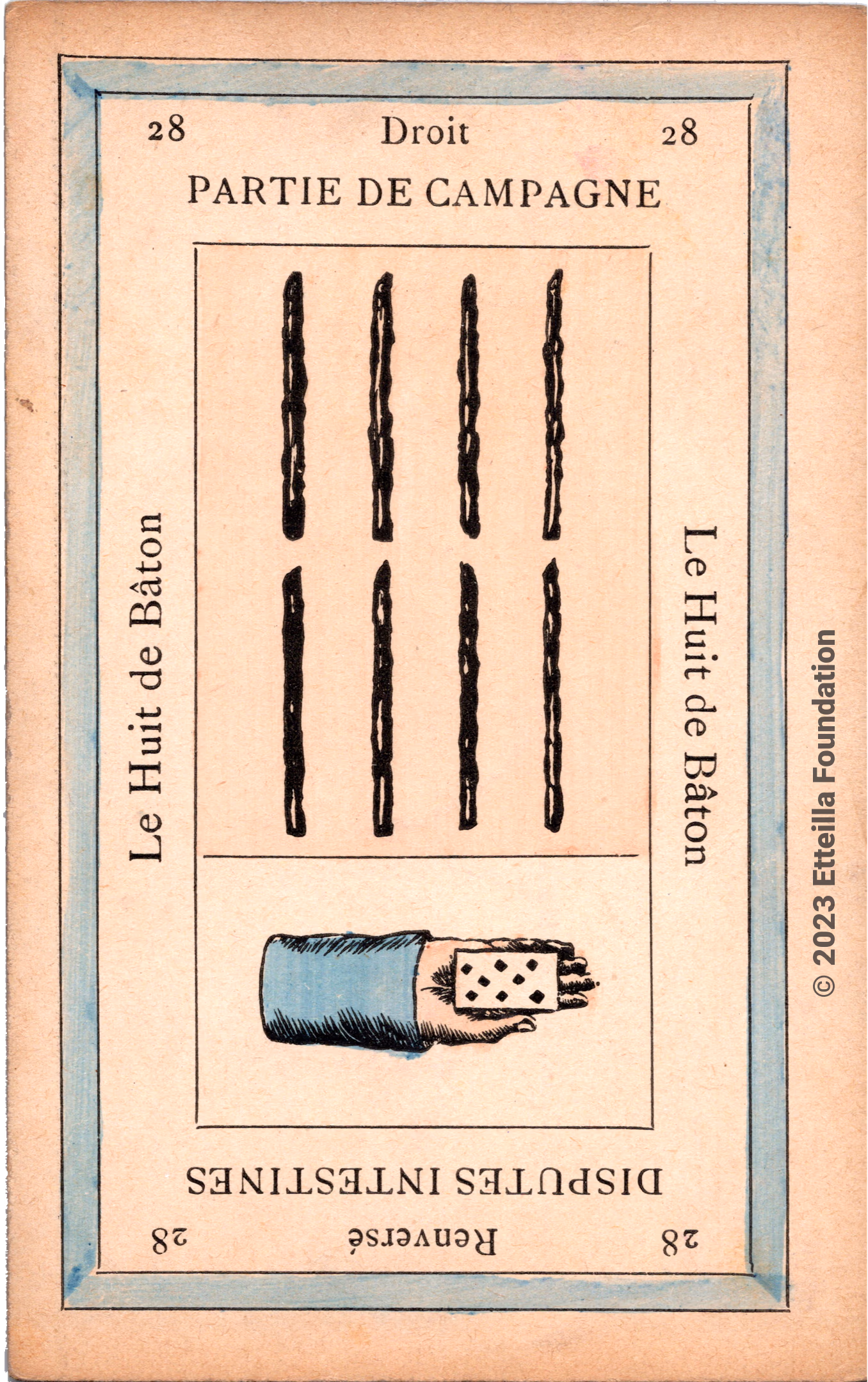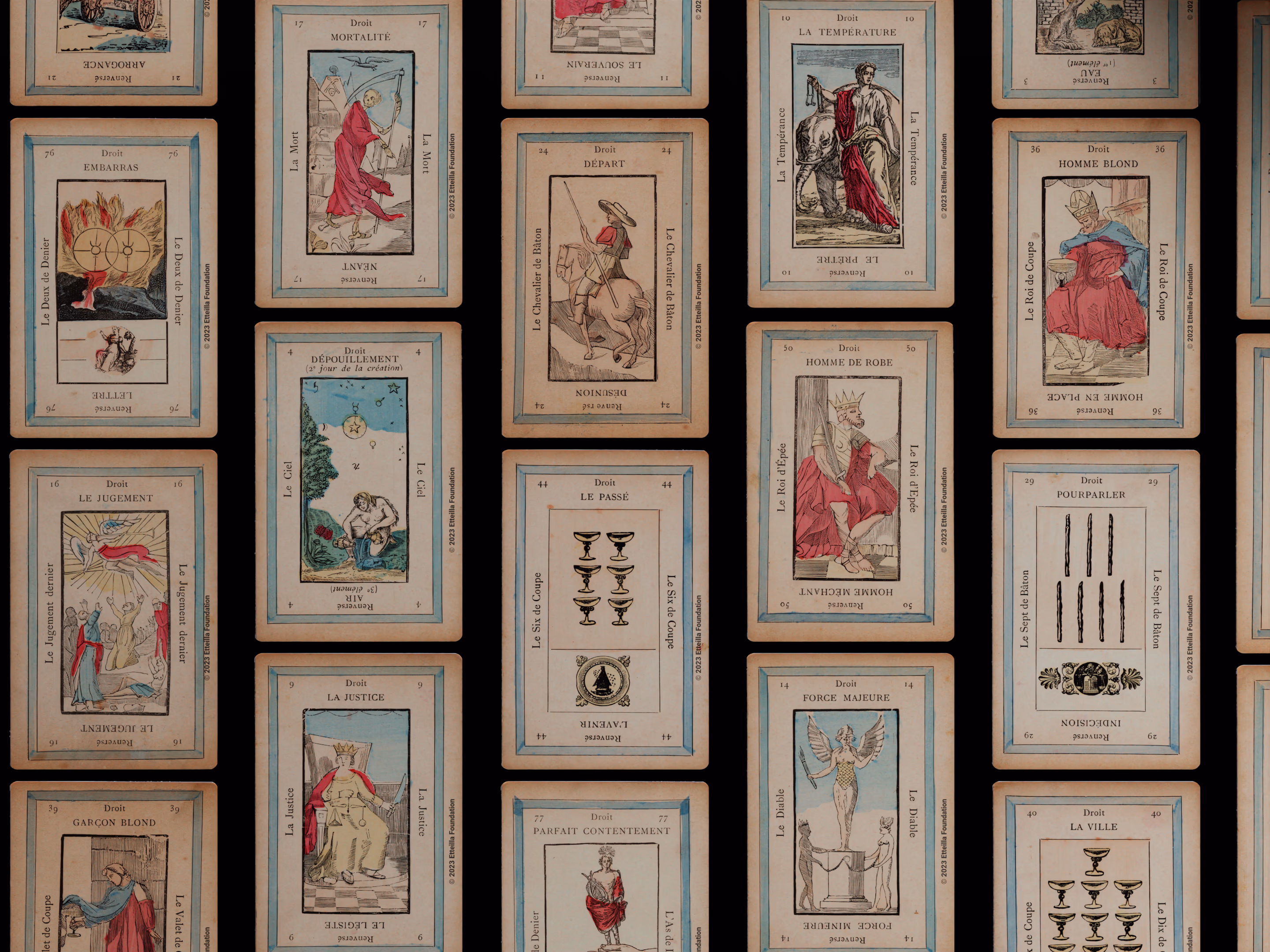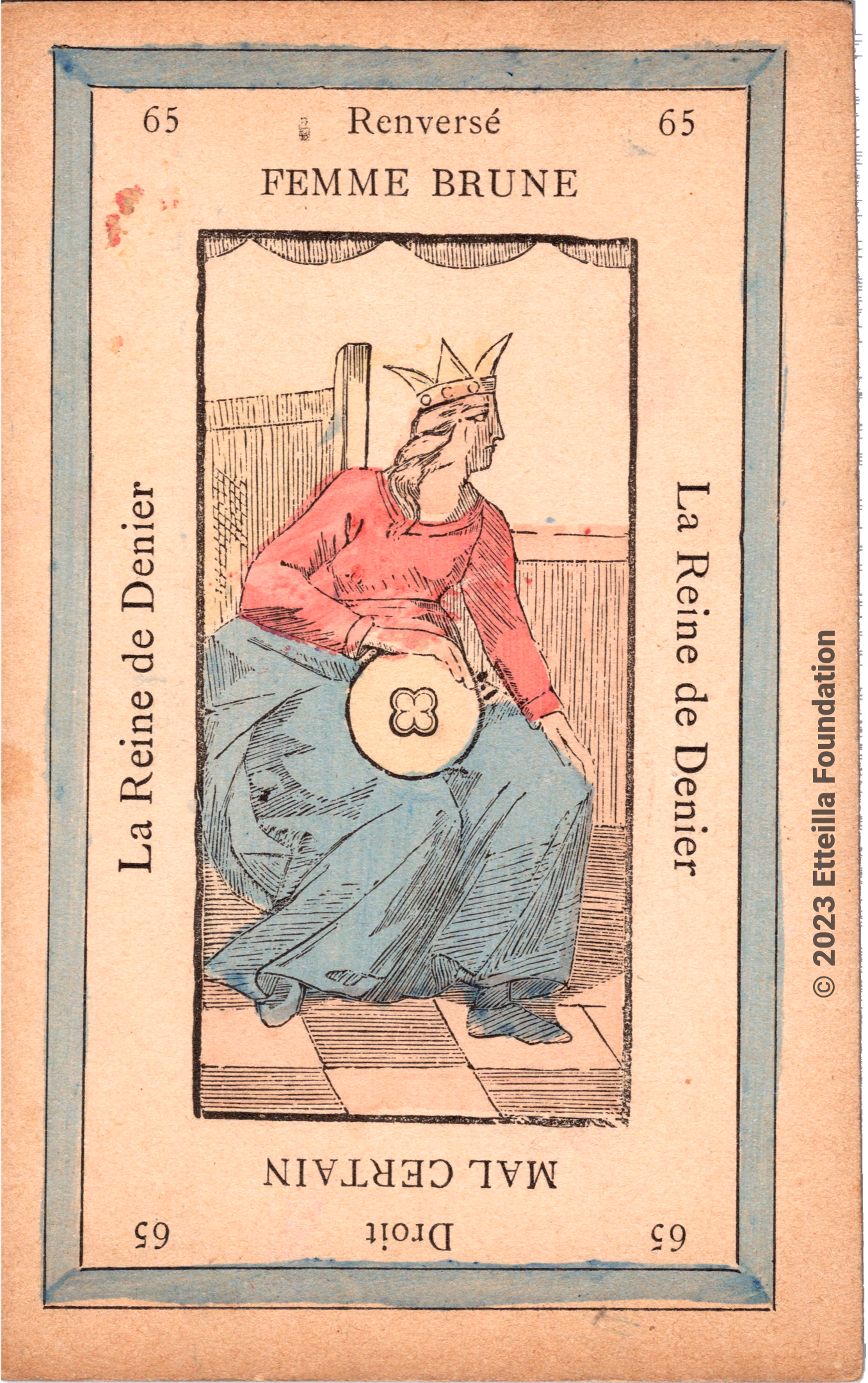 In 1838 Simon Blocquel, a student of Etteilla, published this updated version of the Etteilla tarot deck under the title “Grand livre de Thot.”. This version is commonly known as the Lismon Etteilla or Etteilla Type II.