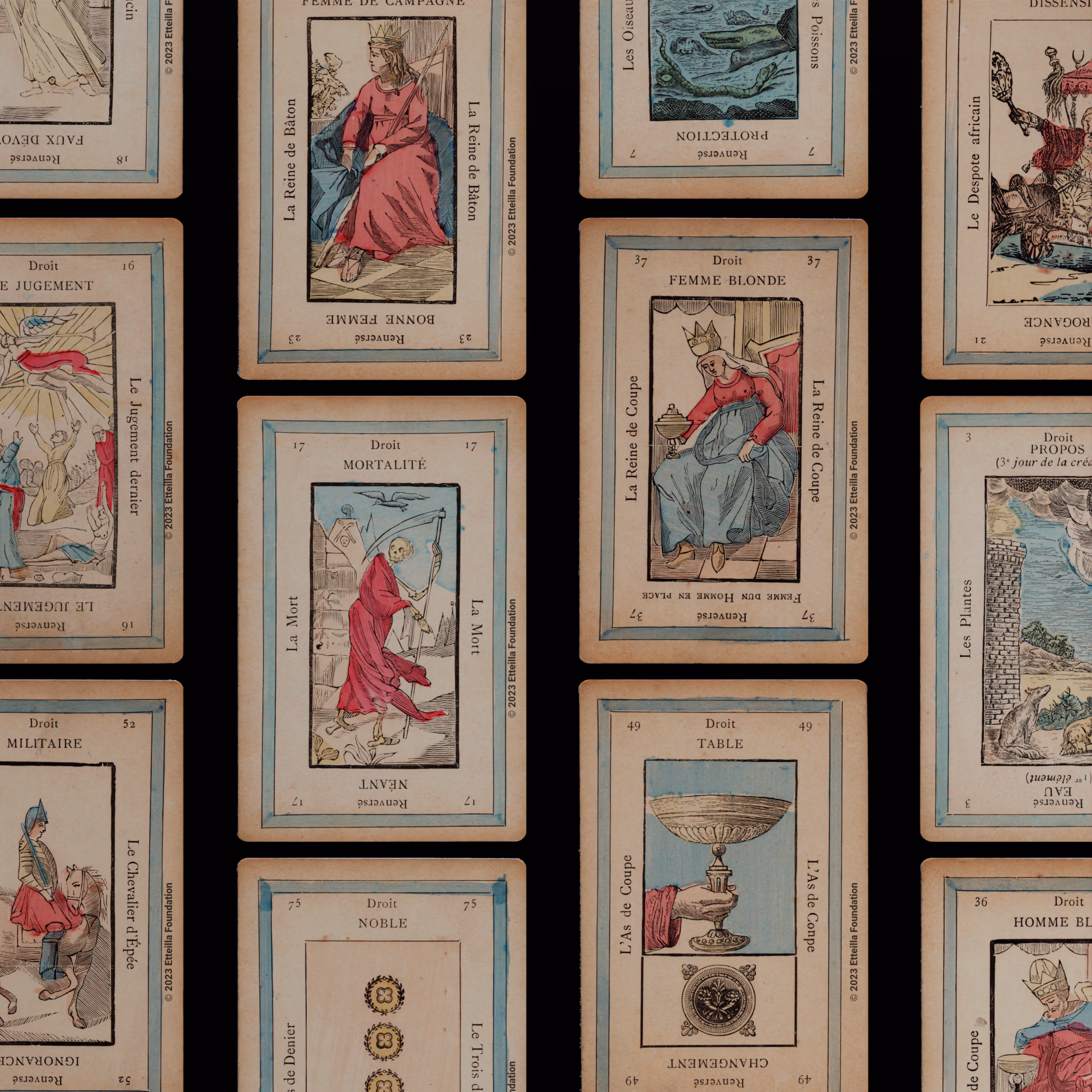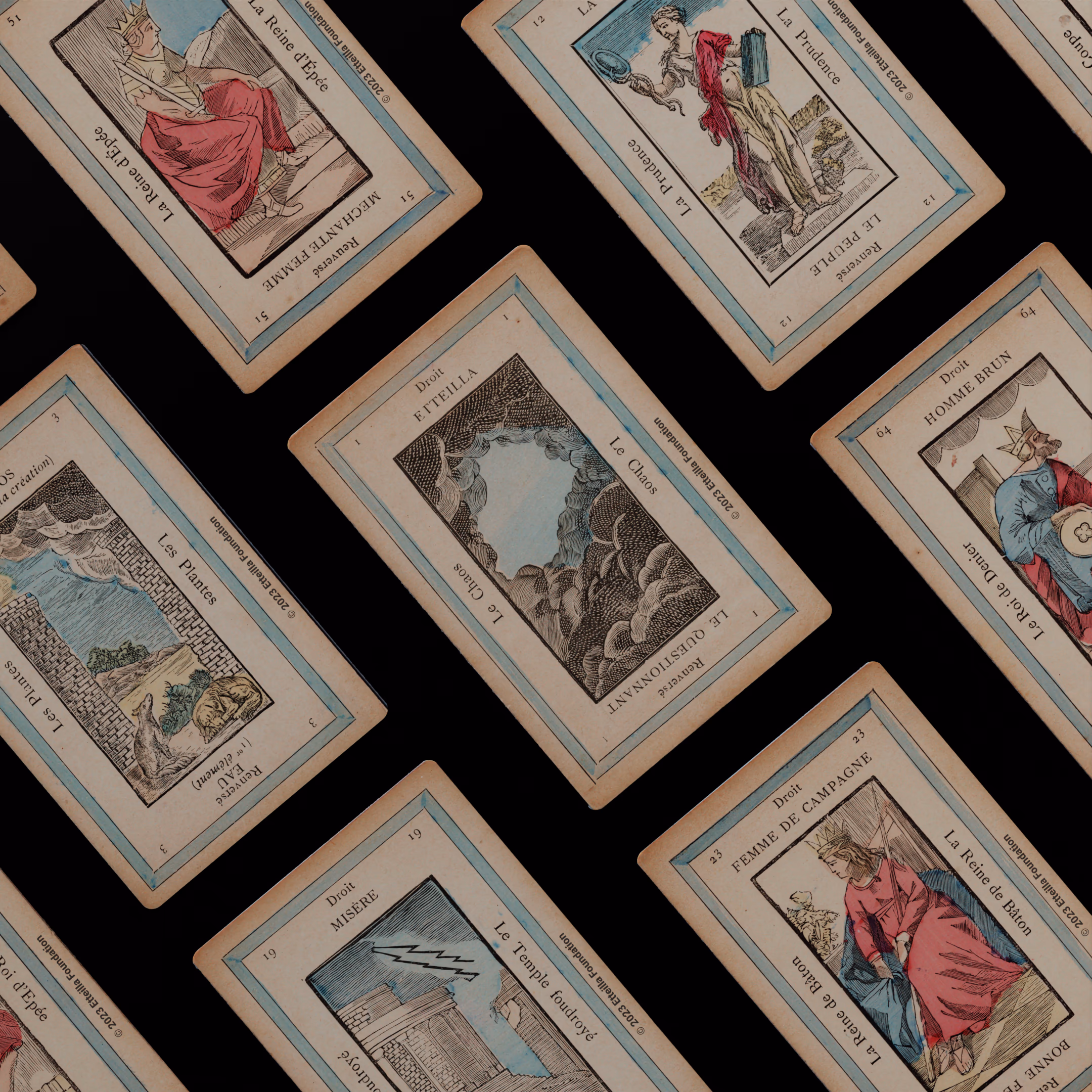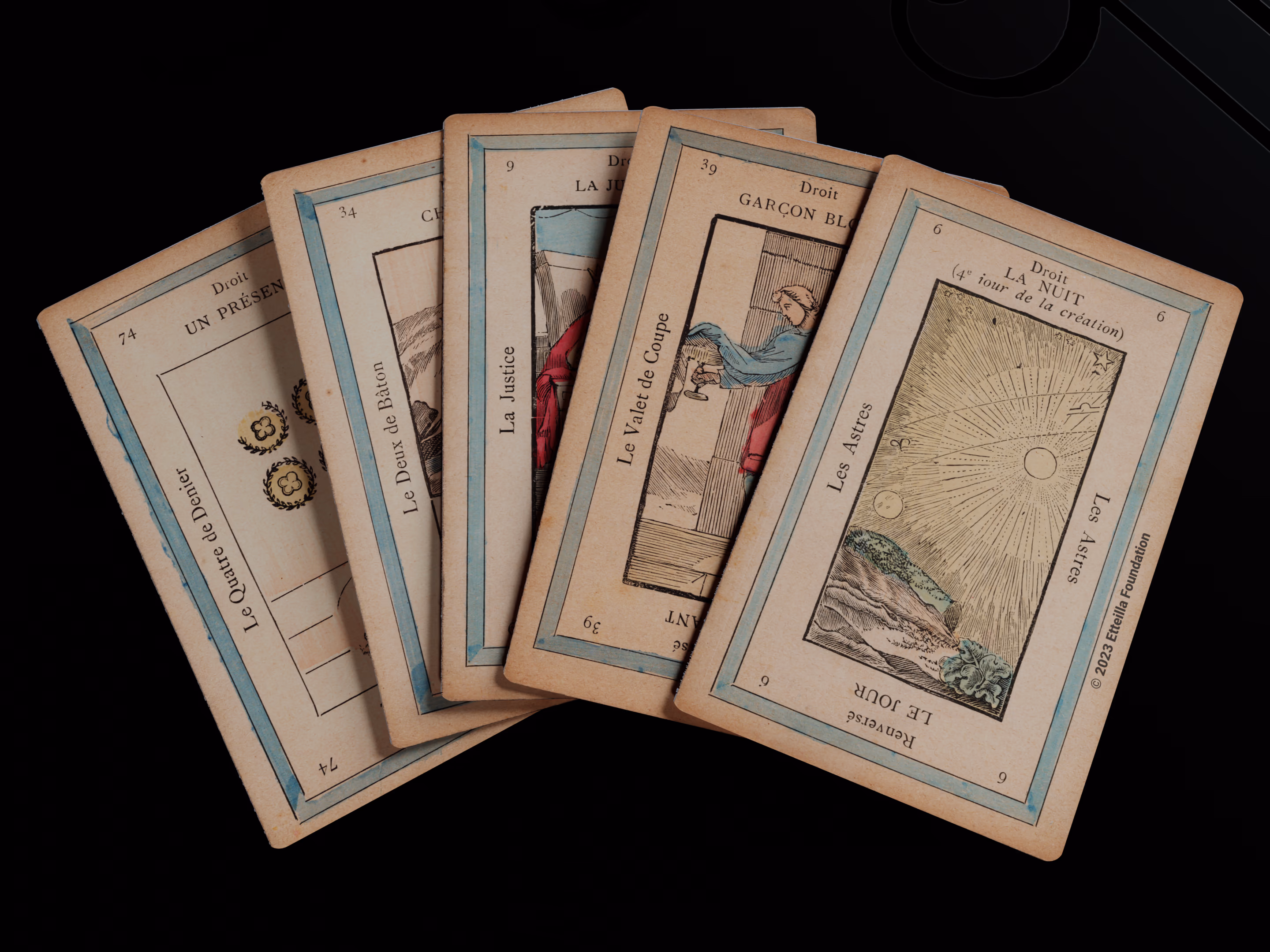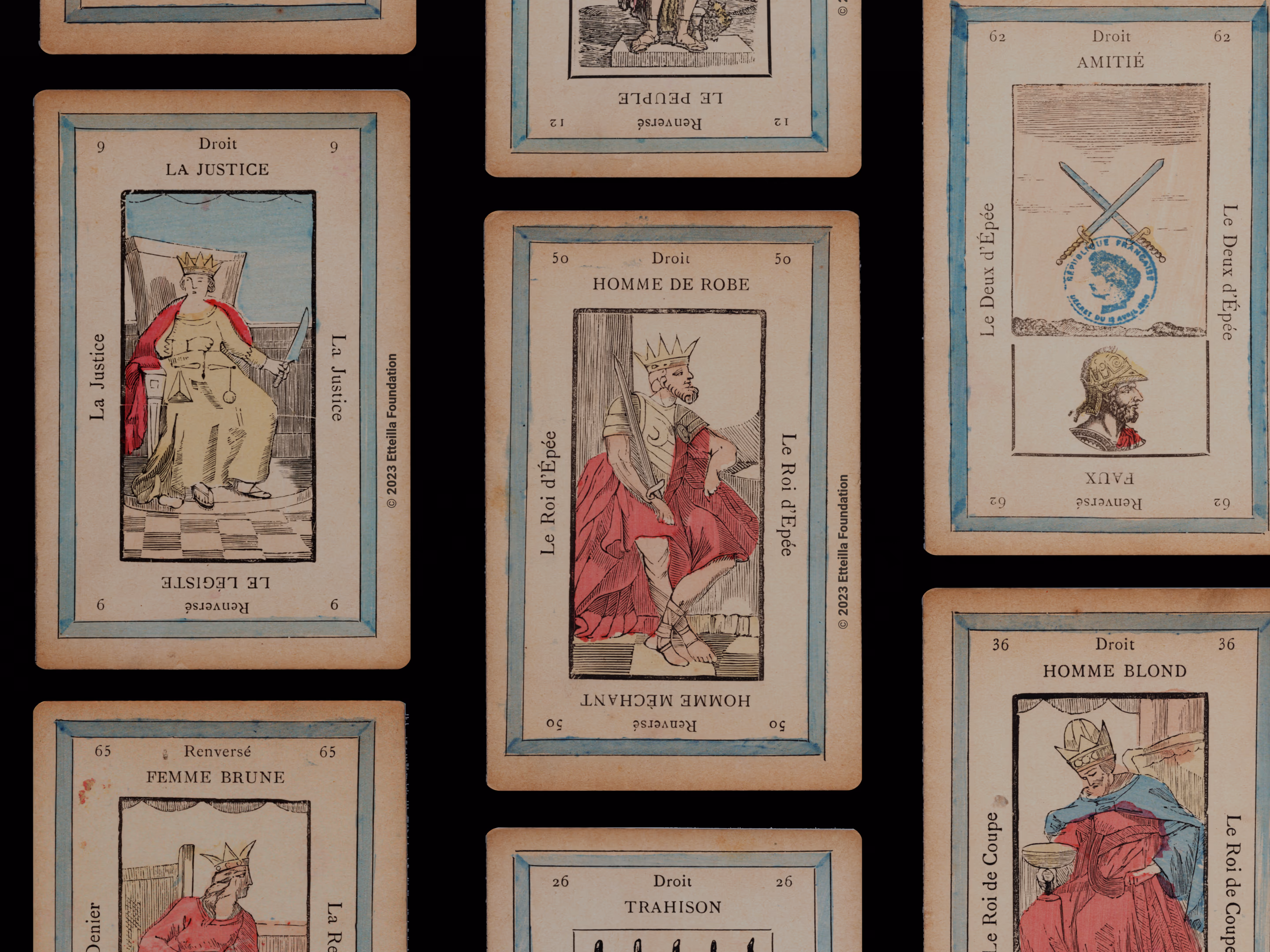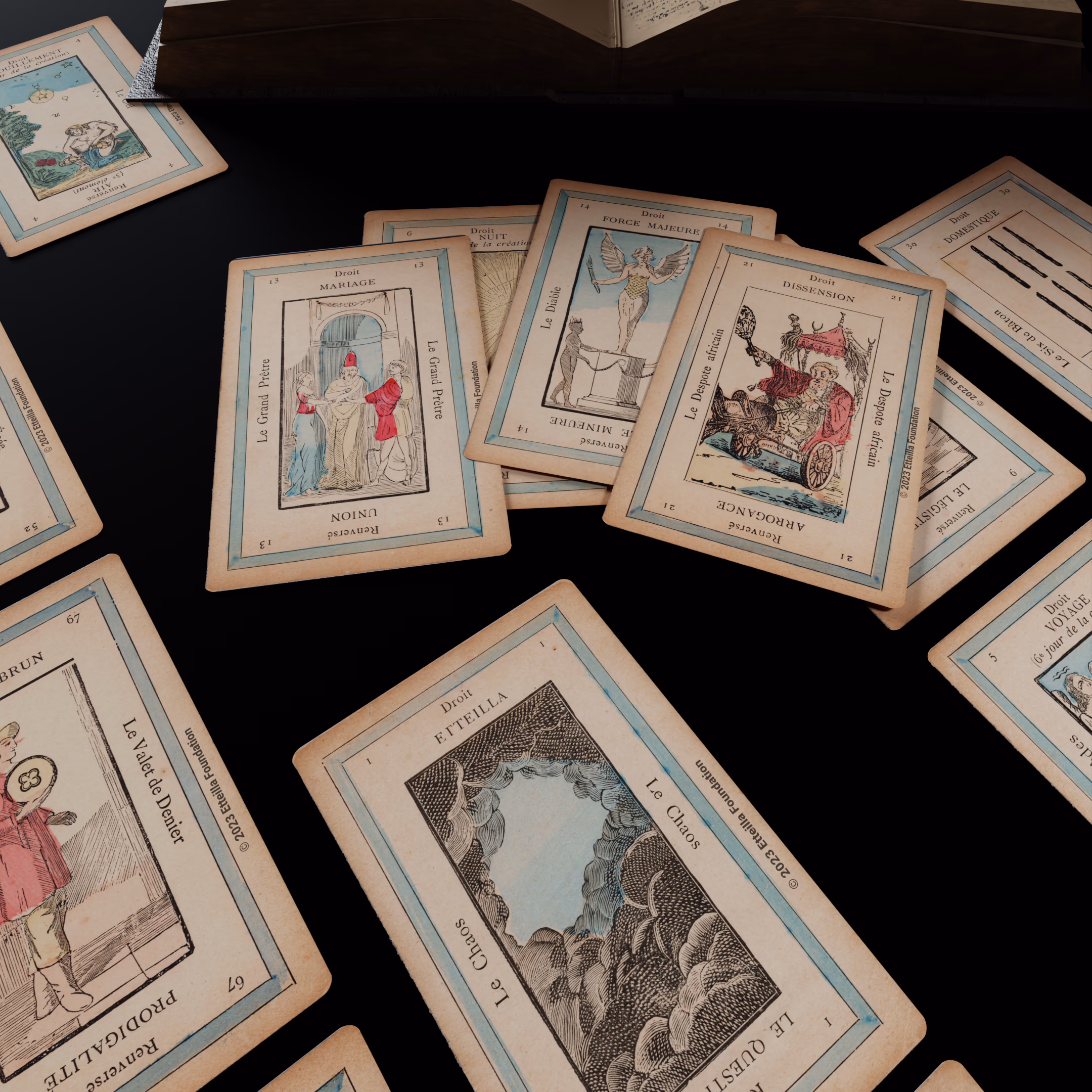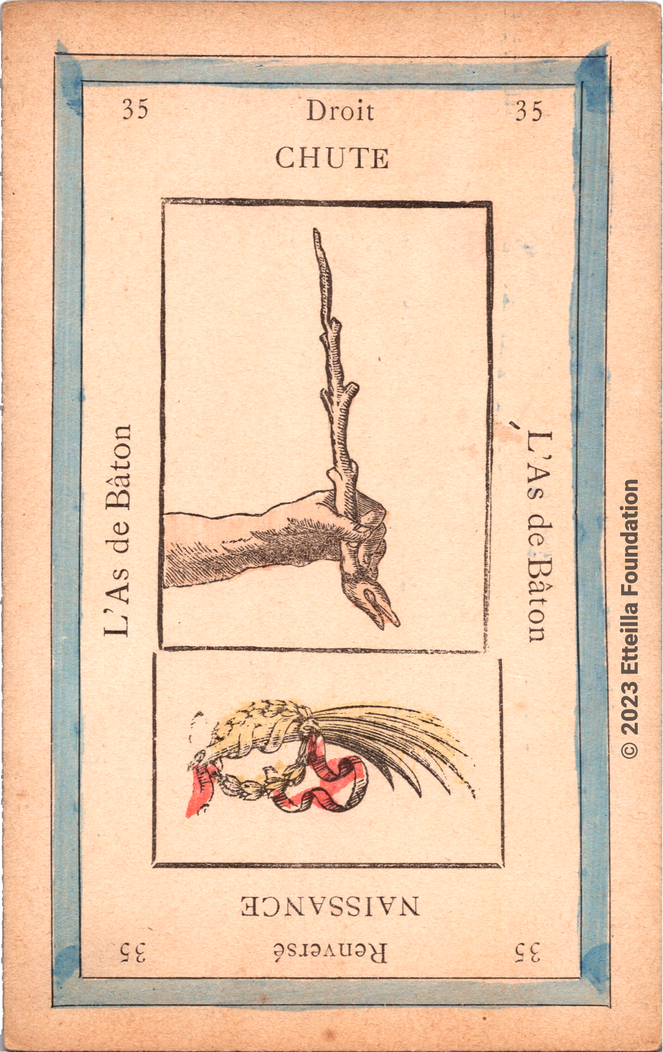 In 1838 Simon Blocquel, a student of Etteilla, published this updated version of the Etteilla tarot deck under the title “Grand livre de Thot.”. This version is commonly known as the Lismon Etteilla or Etteilla Type II.