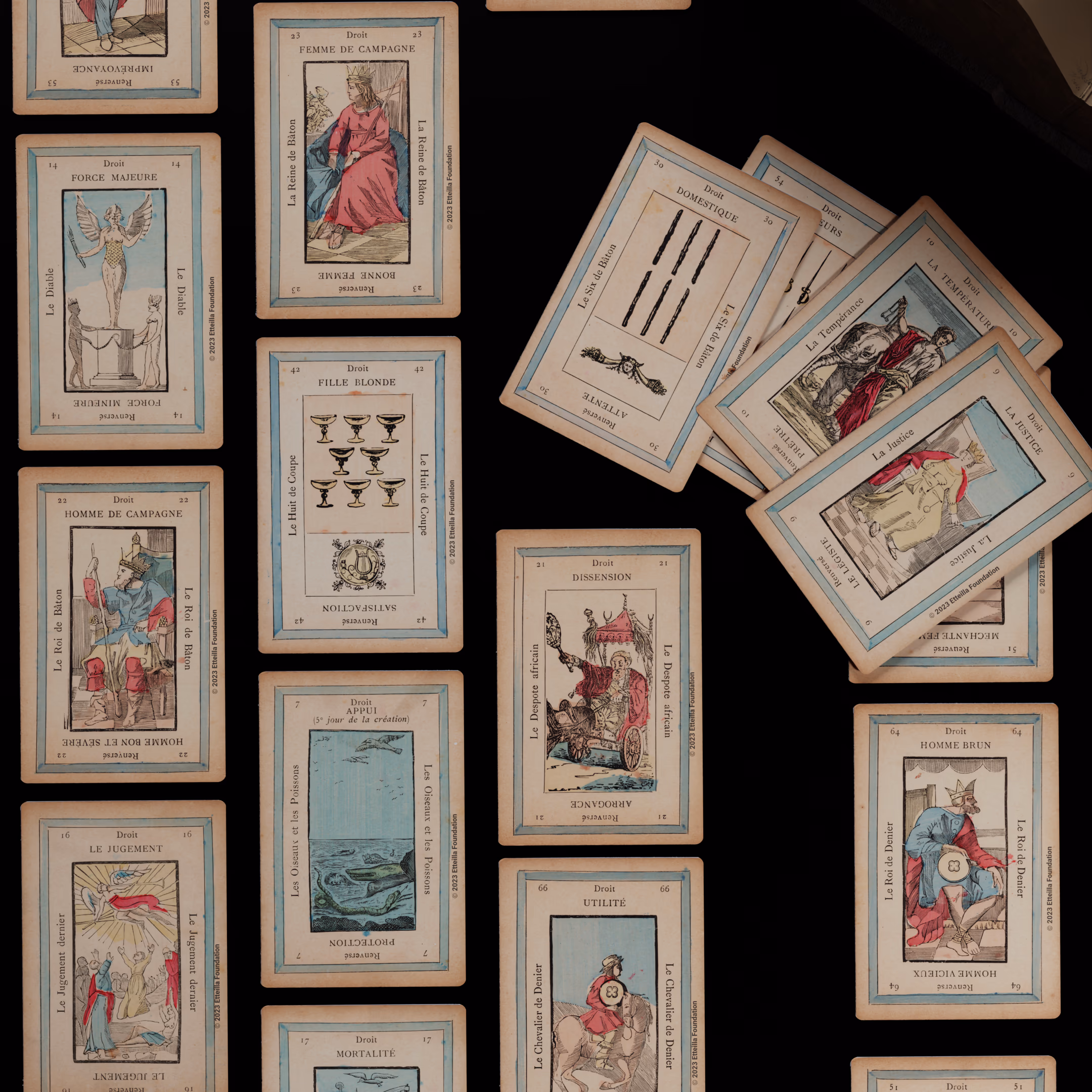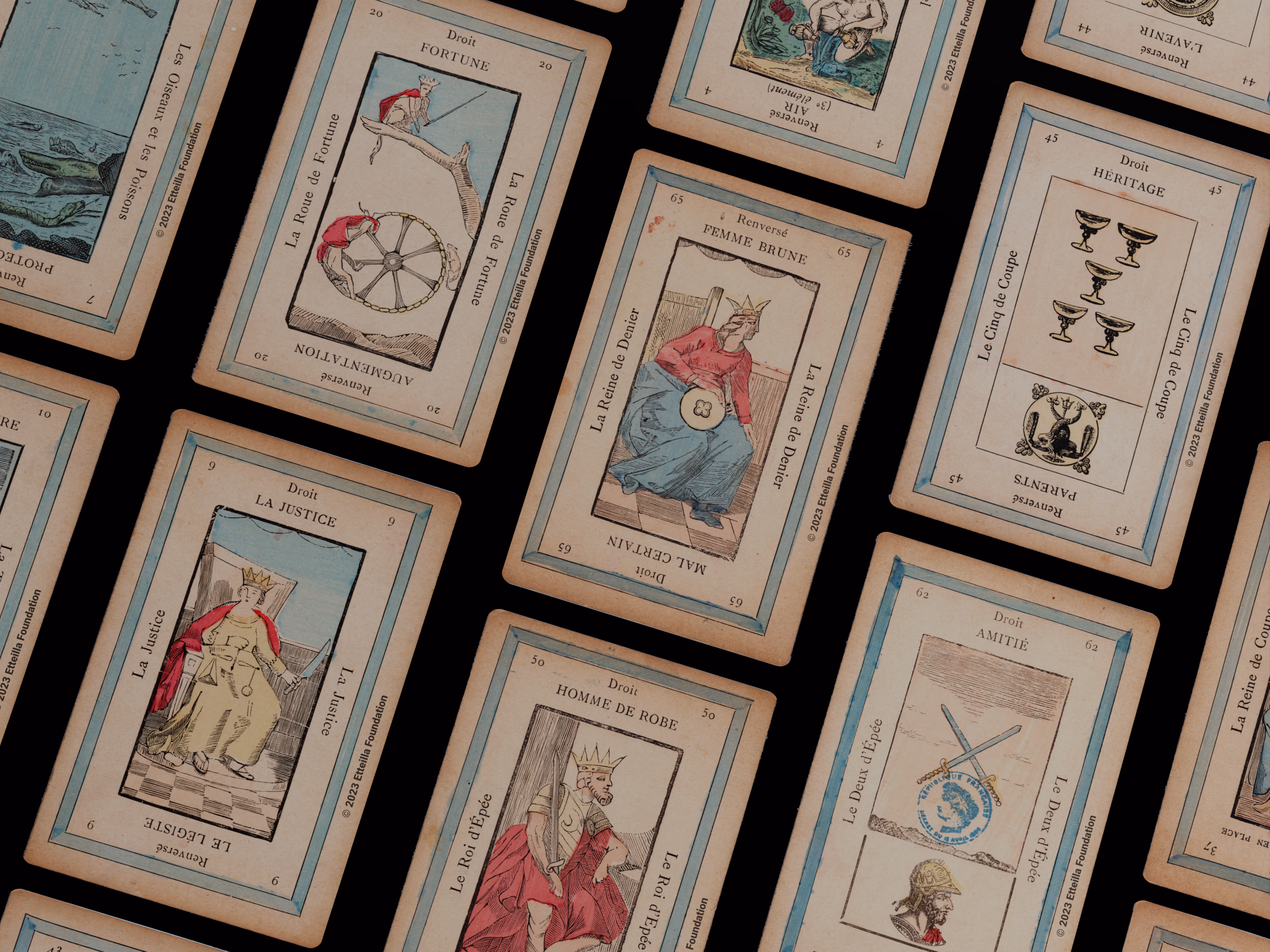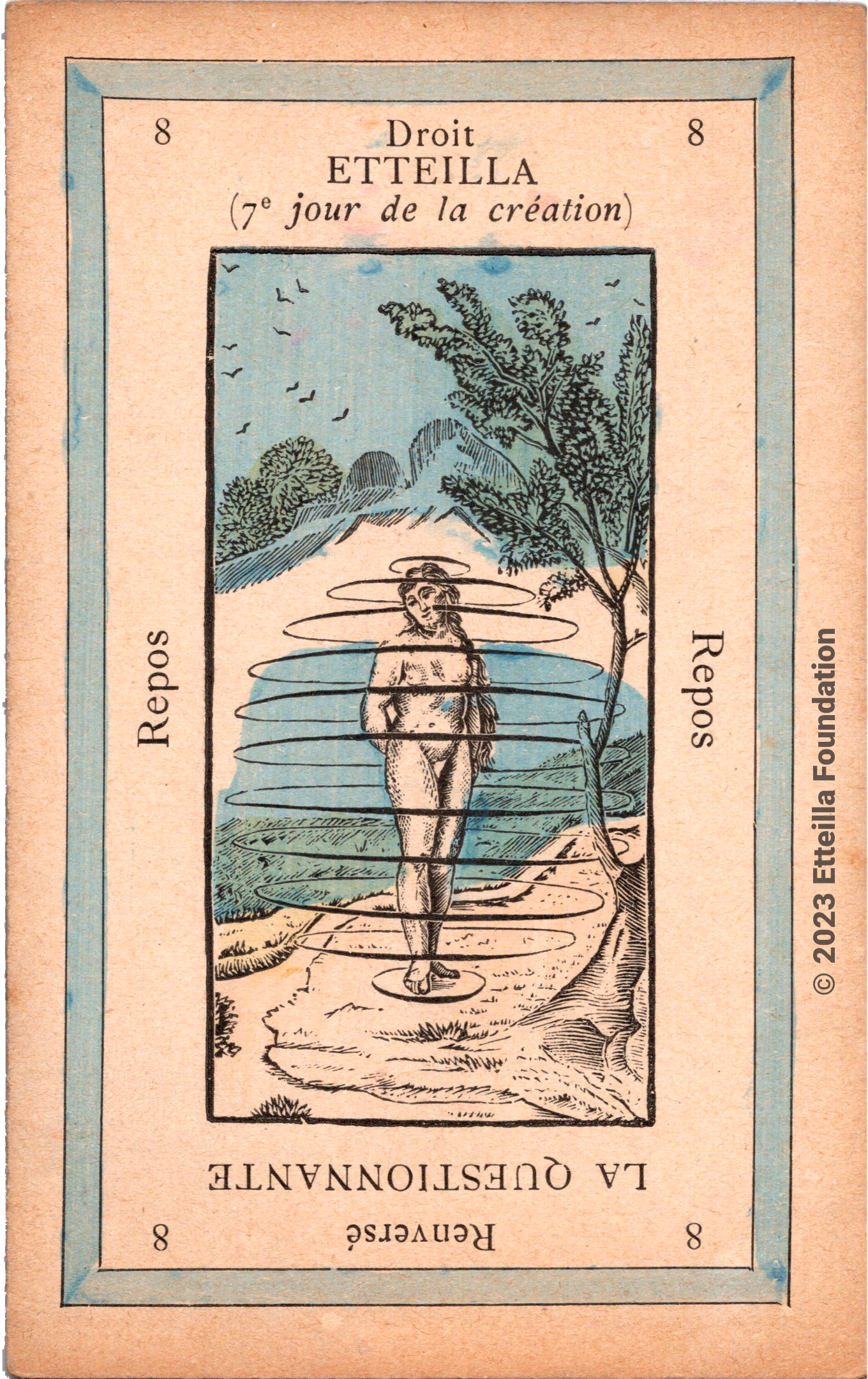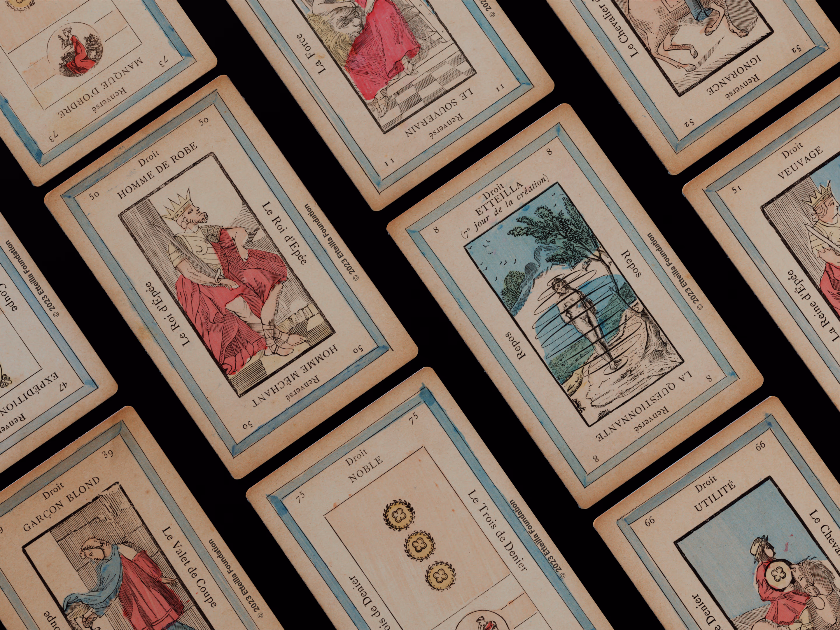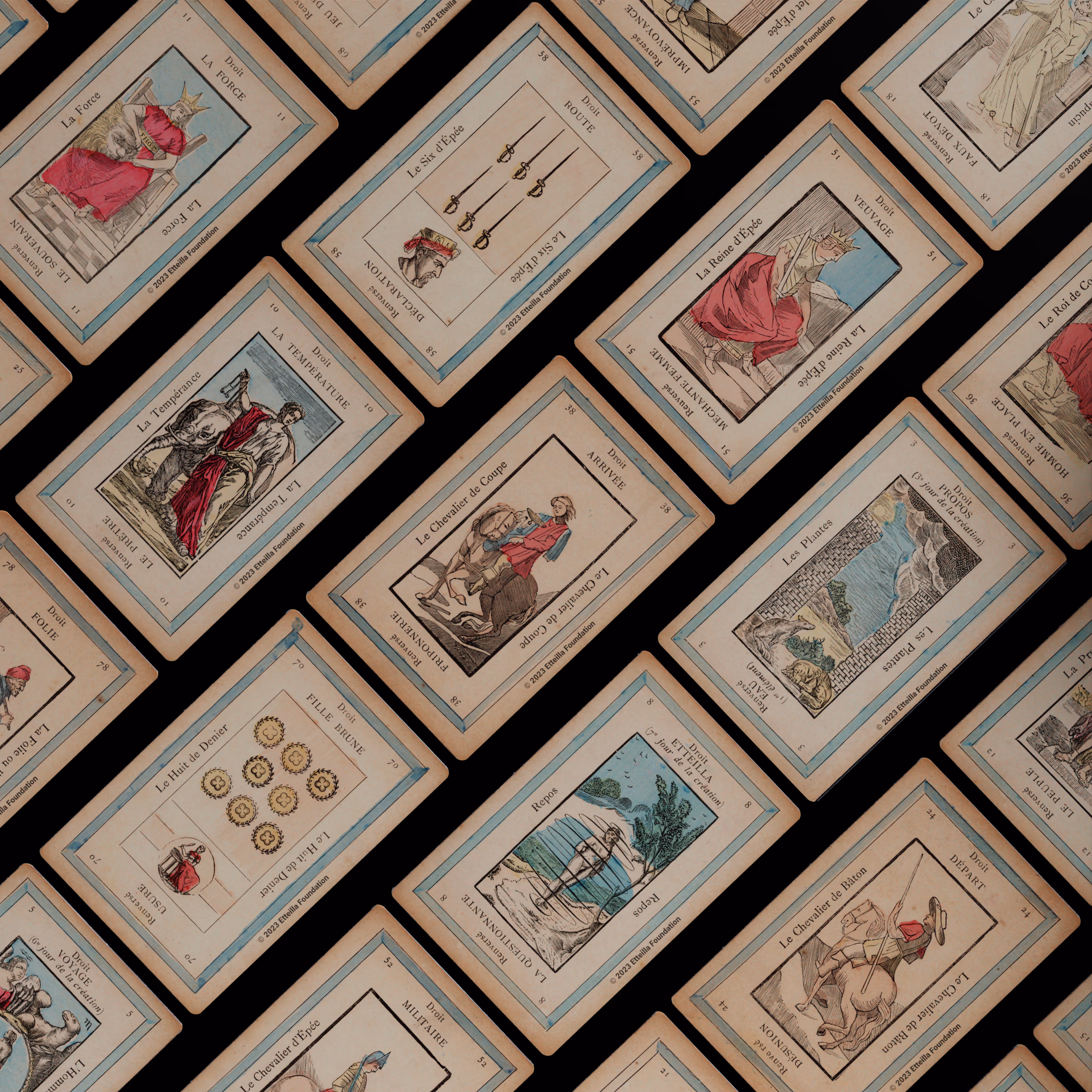 In 1838 Simon Blocquel, a student of Etteilla, published this updated version of the Etteilla tarot deck under the title “Grand livre de Thot.”. This version is commonly known as the Lismon Etteilla or Etteilla Type II.