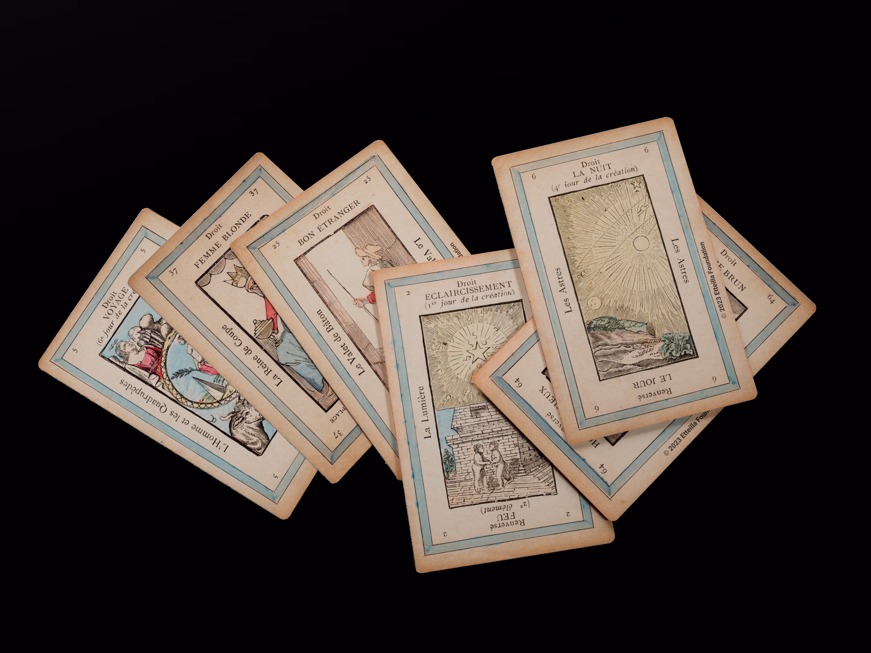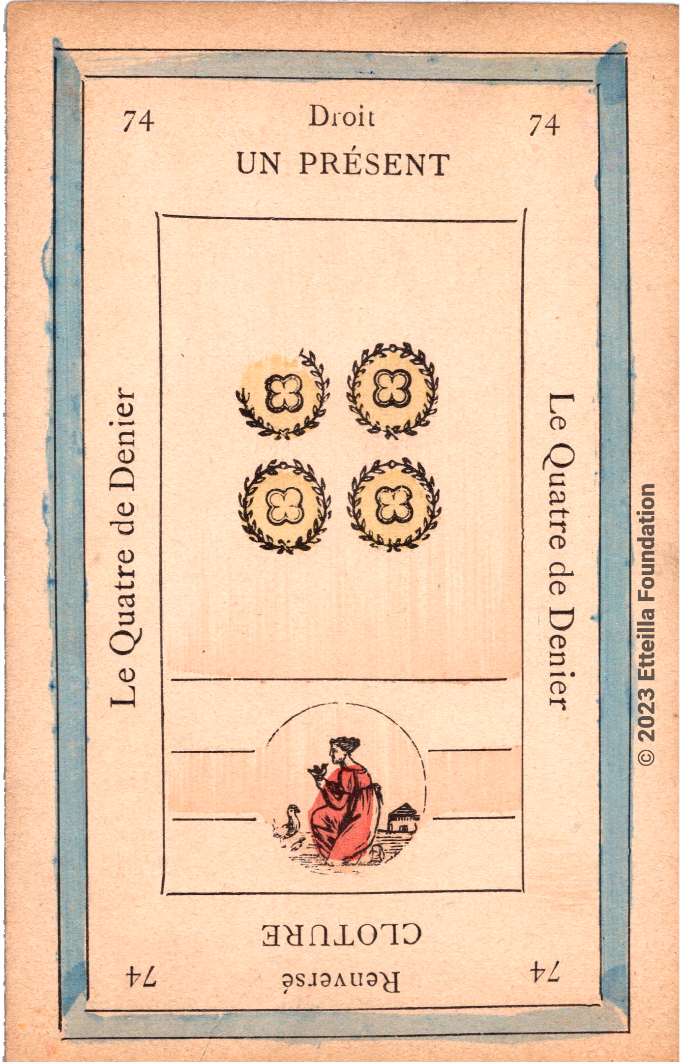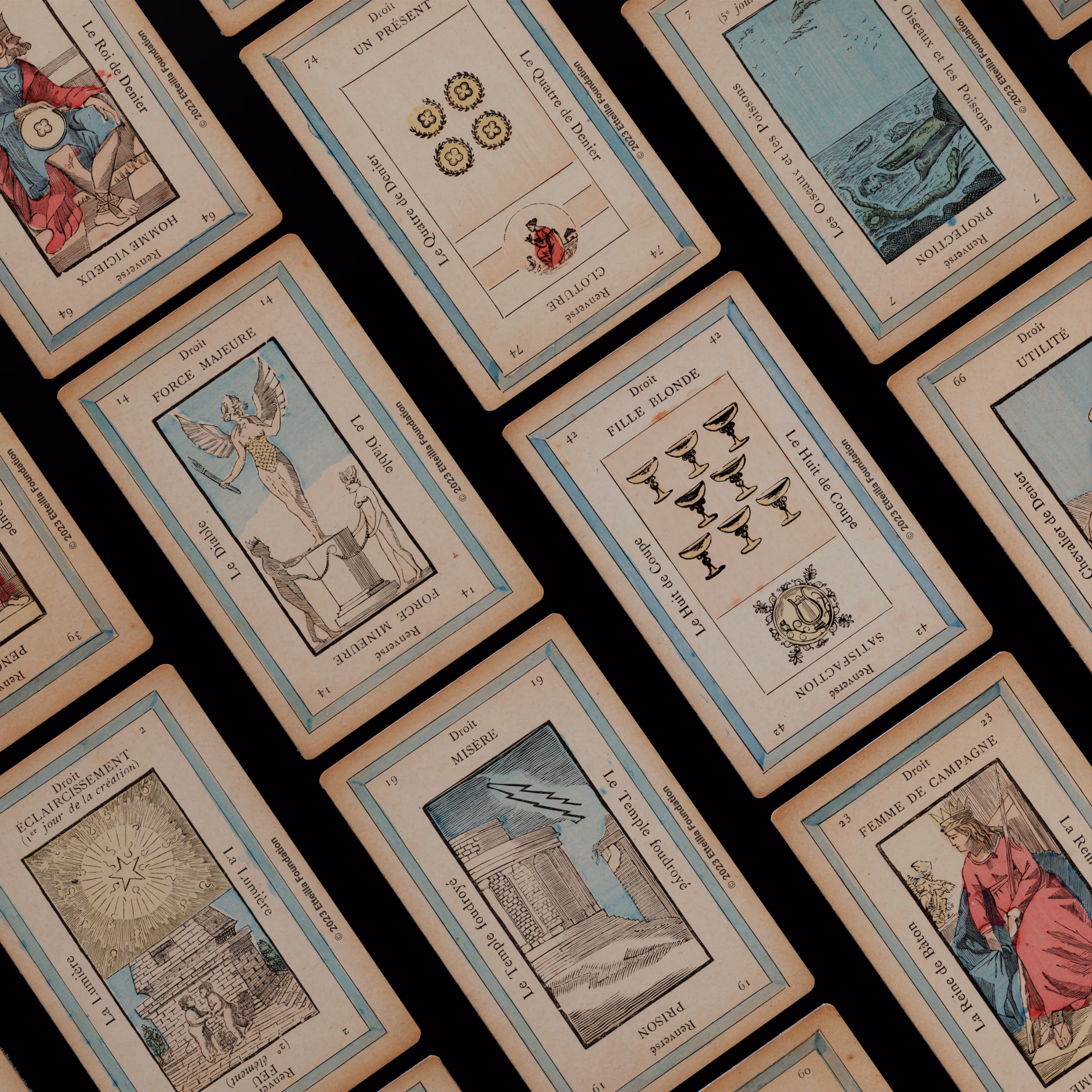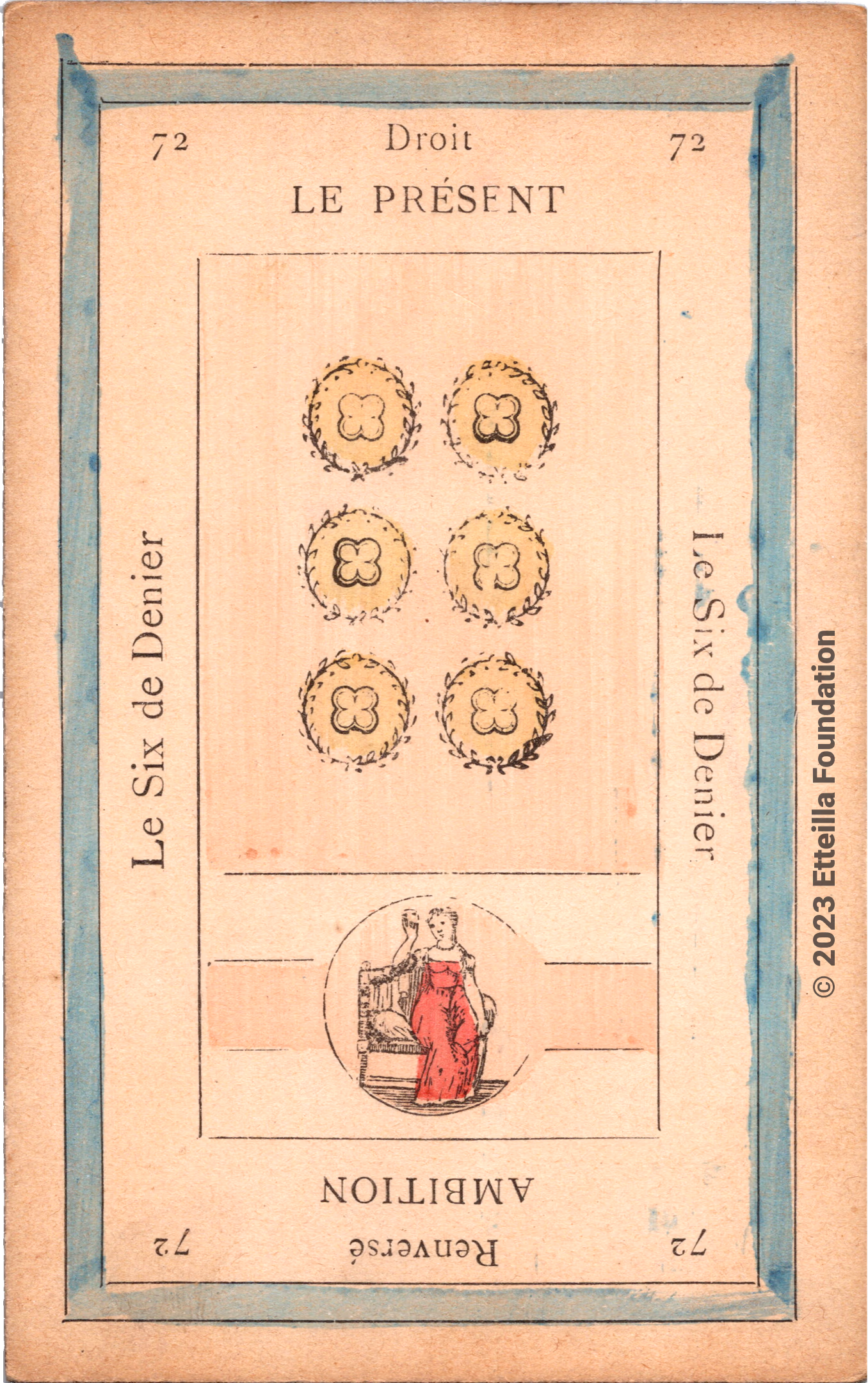 This deck most recognizable feature of this deck is that each card is framed with stencil painted blue borders. The designs are painted using a six-color palette: light blue, red, green, yellow, gold, and peach. The cards are French titled, with titles on either side and a single black line inner border. Numbered at each of the four corners, the cards also have upright and reversed meanings at the top and bottom. In the tradition of Etteilla, Simon Blocquel often employed anagrammatic pseudonyms such as Blismon, Z. Lismon, Zlismon when publishing Tarot decks and associated literature. Our deck is complete, in very good condition, and comes with its box. It has a 1890 République Français tax stamp on the Two of Swords card. Importantly the Unbroken wreath of card #74 indicates that this deck is an early printing as the card #74 block was damaged at some point during printing and late printing exhbits a broken wreath.