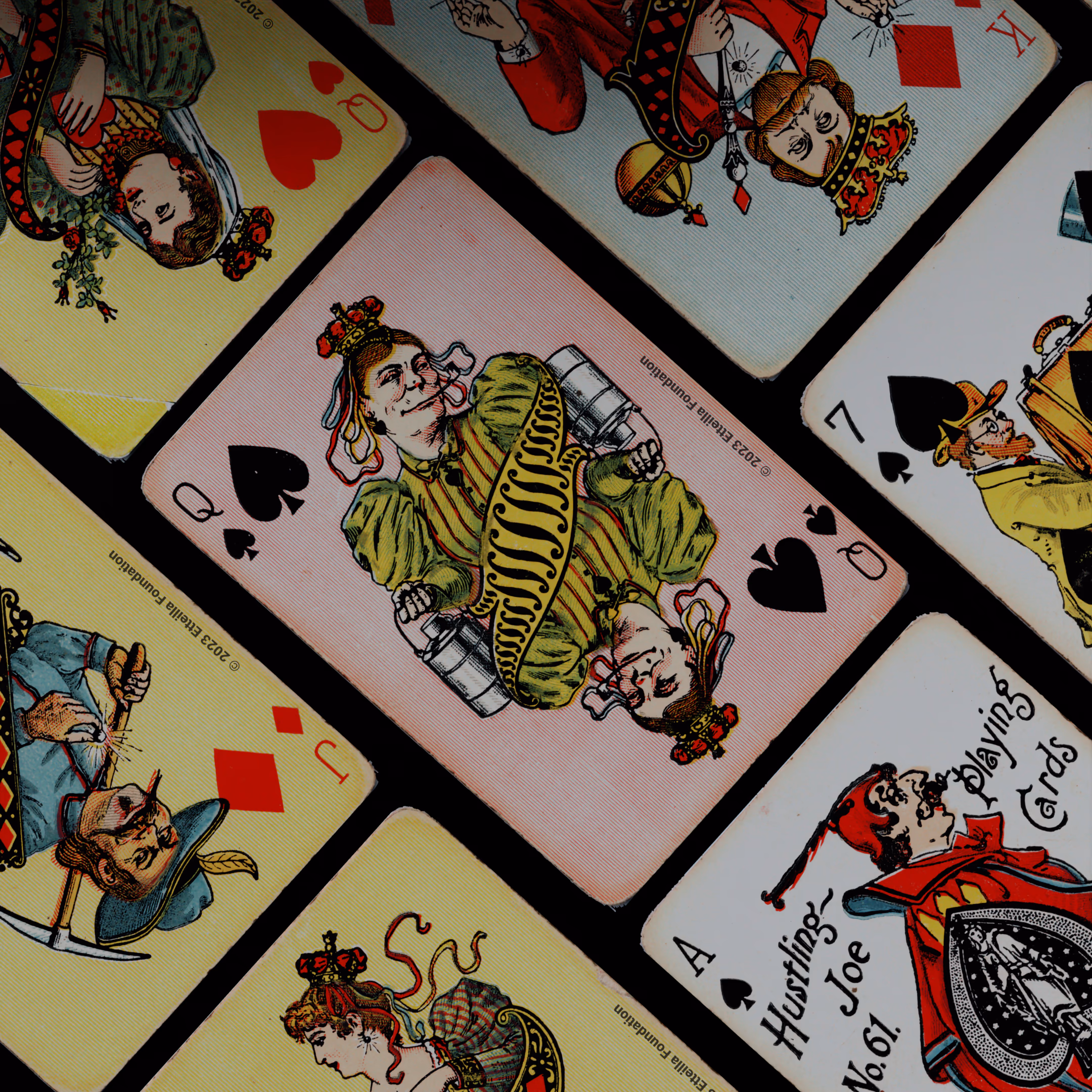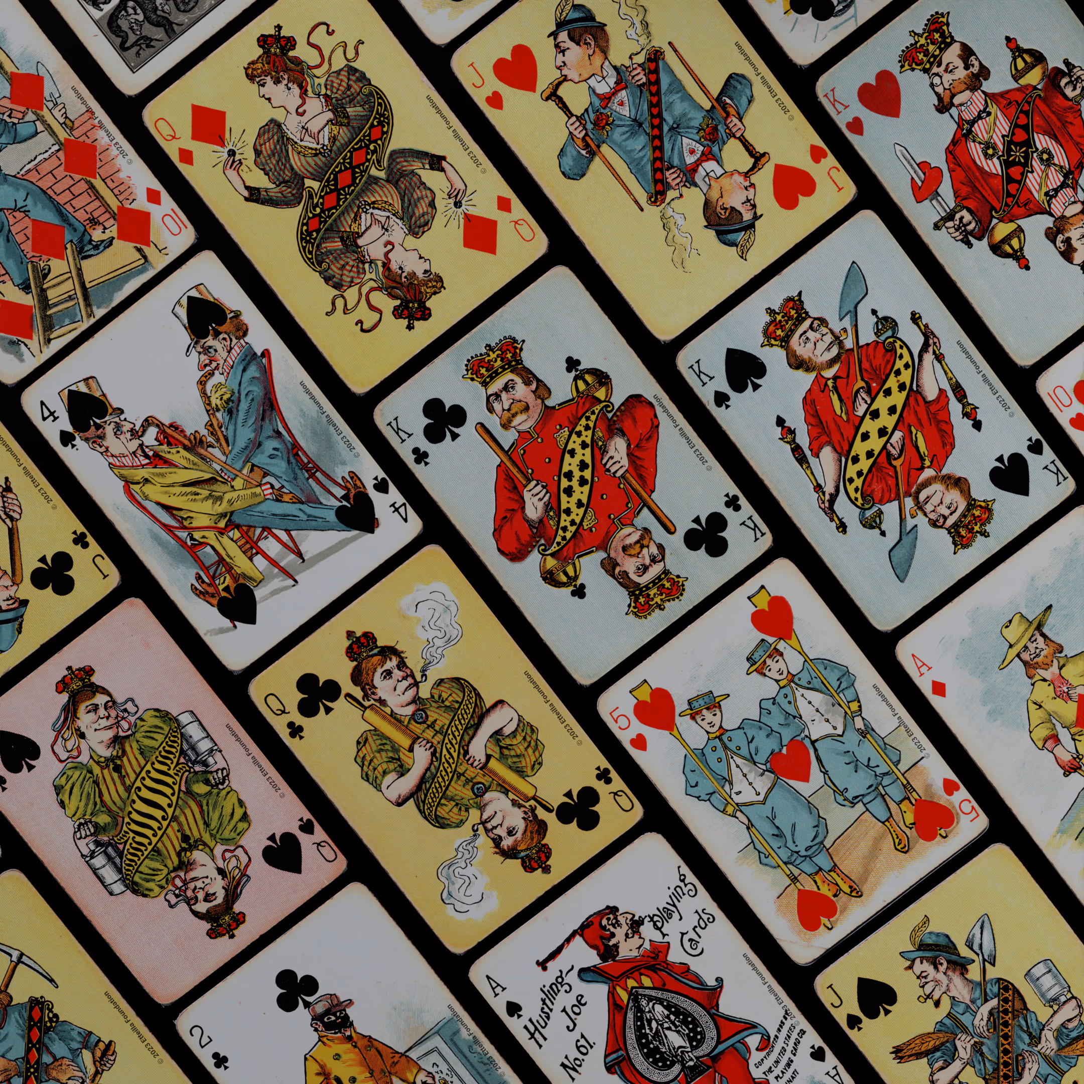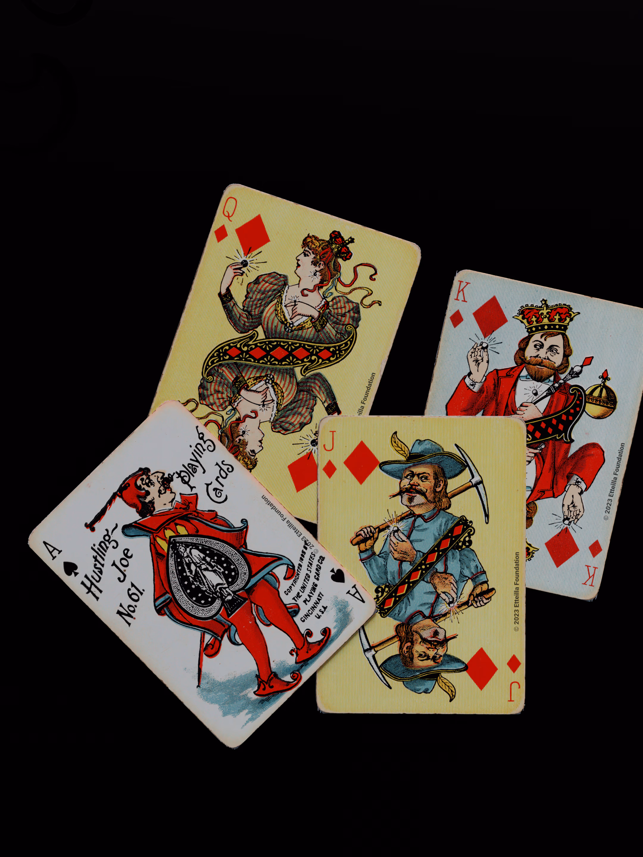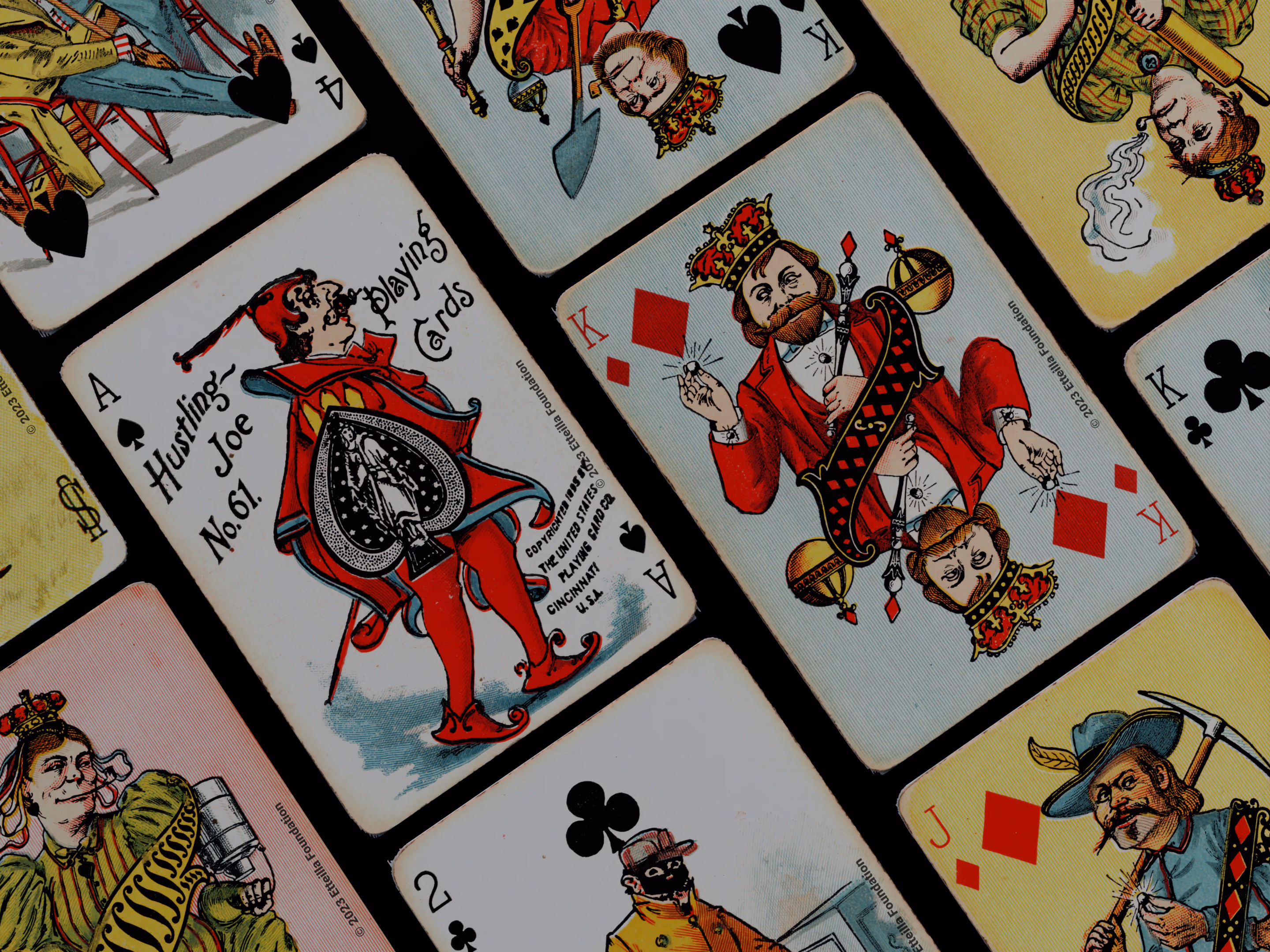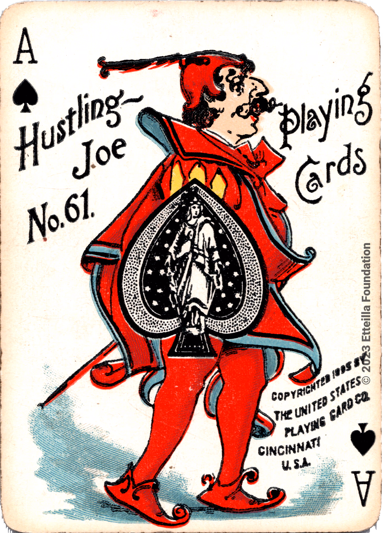 The Hustling Joe No 61 is a Transformation Deck type of playing cards, manufactured by The United States Playing Card Company in 1895. This is the first edition of the deck with the costume on the Ace of Spades in red. The second edition immediately issued after the intial release to correct some design flaws found in the first edition changed the costume to yellow. The back design is a double-ended black and white scene of gnomes ice skating in the moonlight.