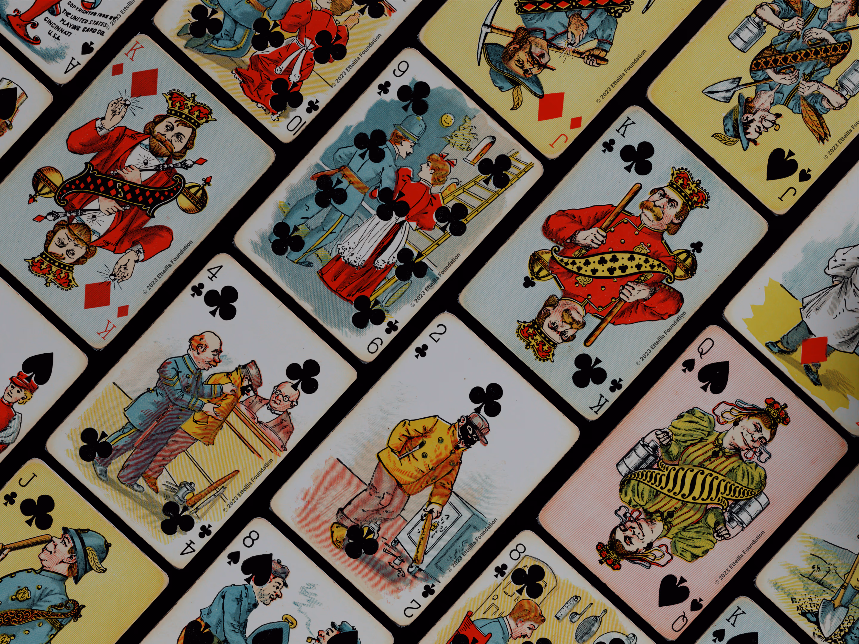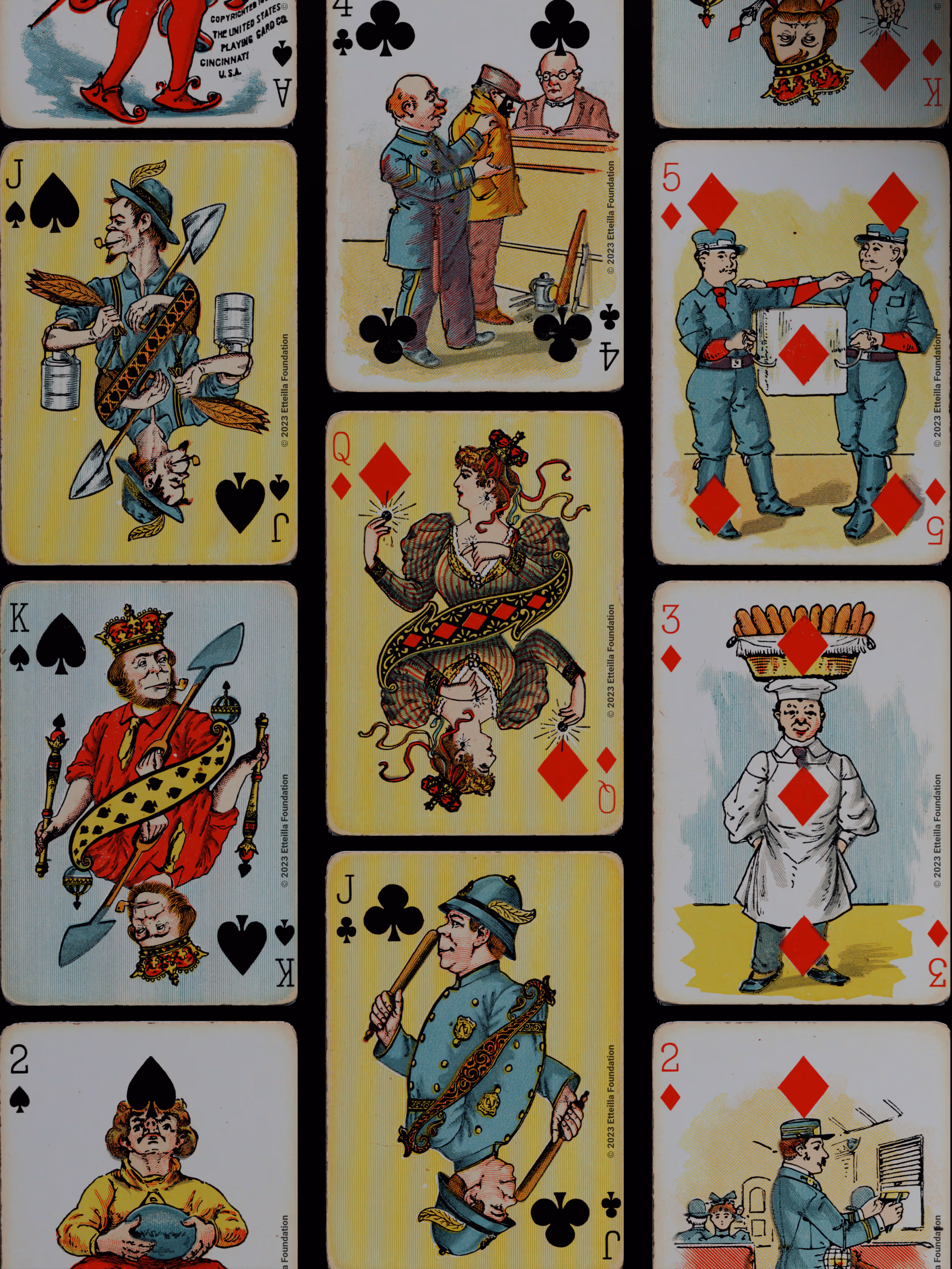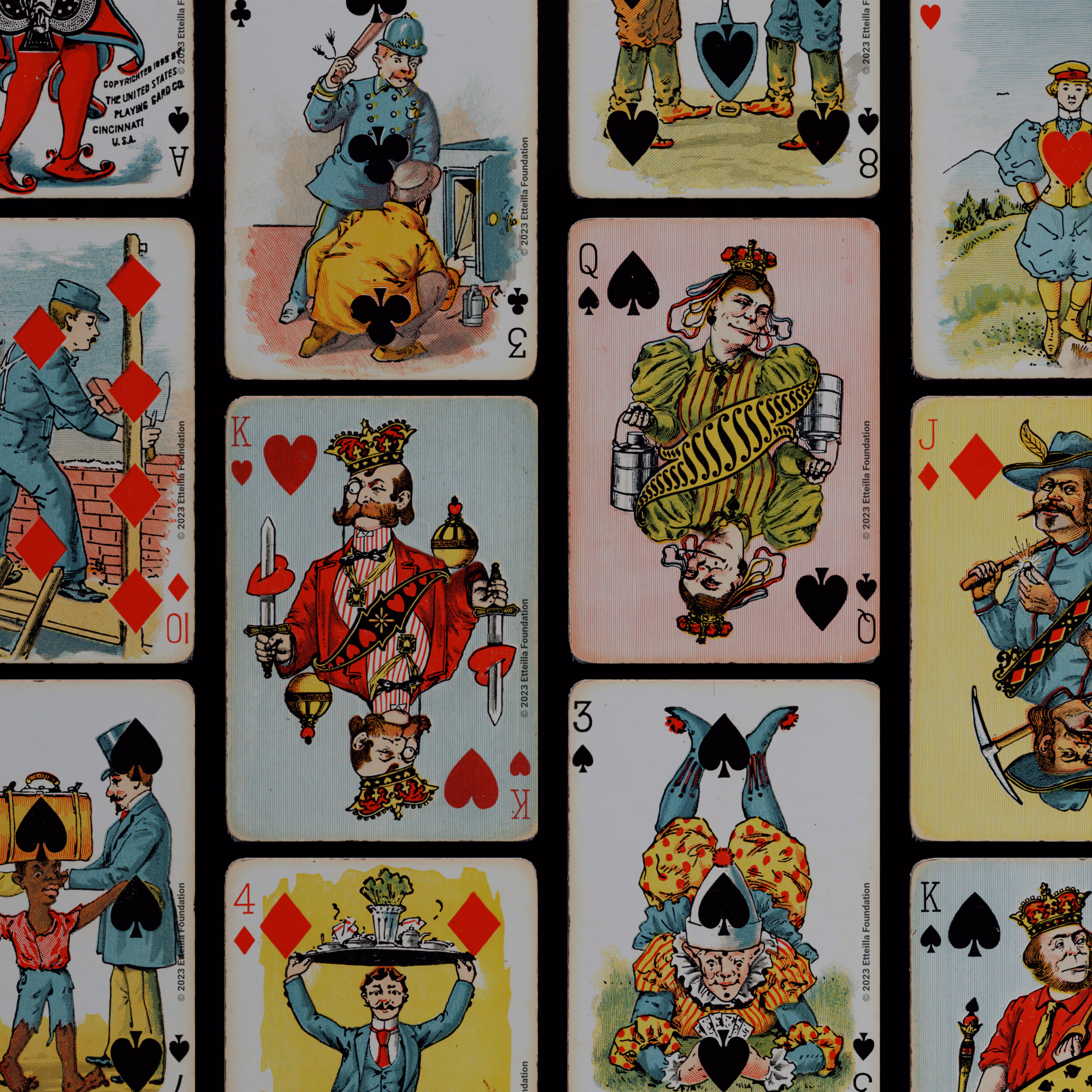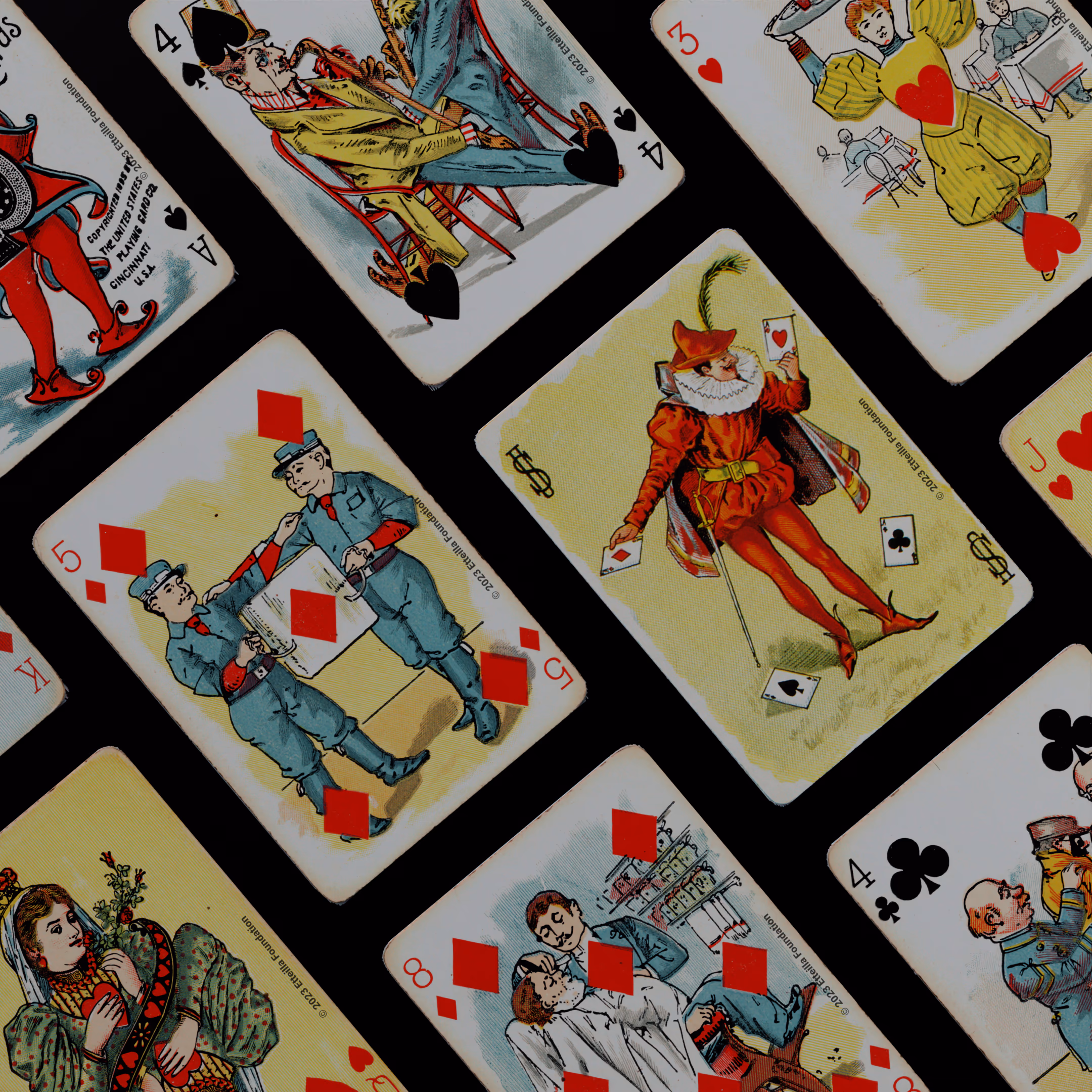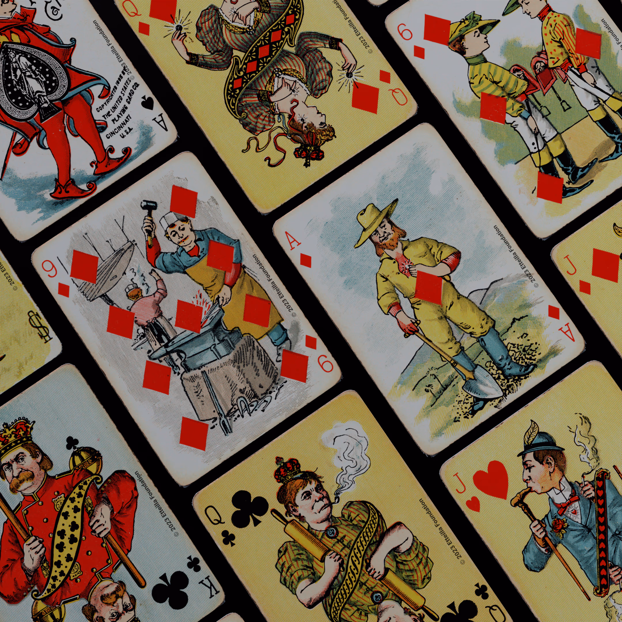 The Hustling Joe No 61 is a Transformation Deck type of playing cards, manufactured by The United States Playing Card Company in 1895. This is the first edition of the deck with the costume on the Ace of Spades in red. The second edition immediately issued after the intial release to correct some design flaws found in the first edition changed the costume to yellow. The back design is a double-ended black and white scene of gnomes ice skating in the moonlight.