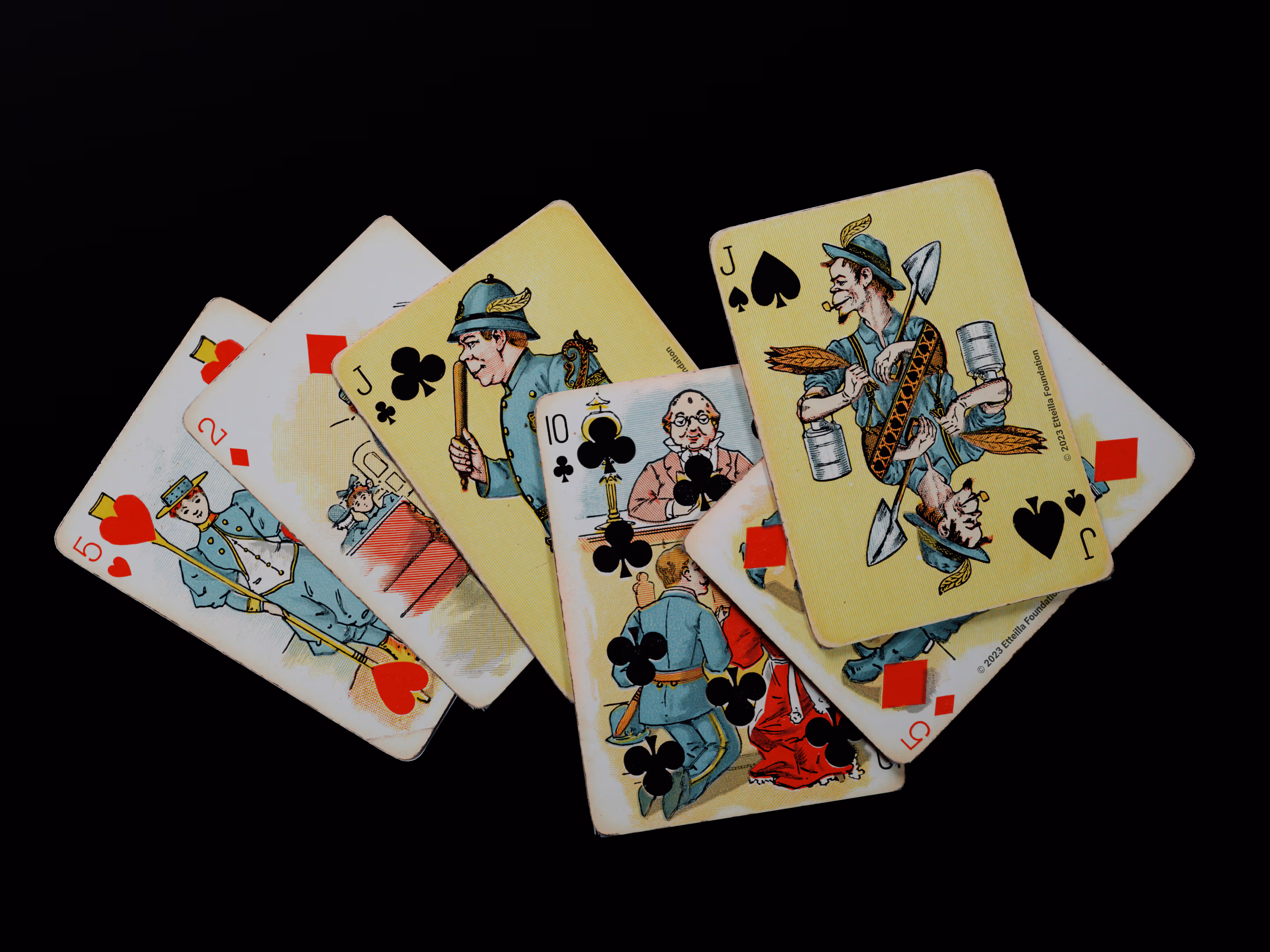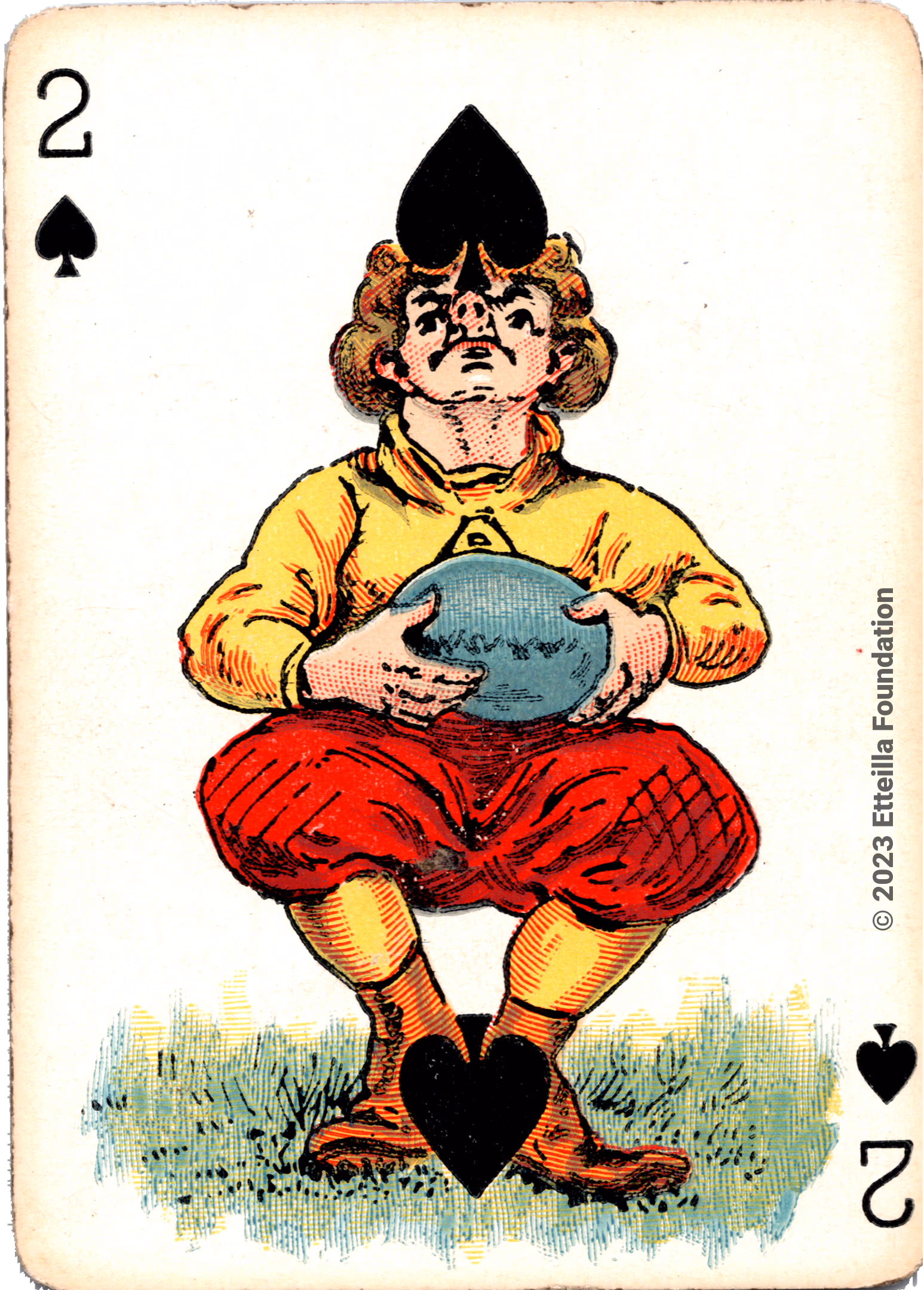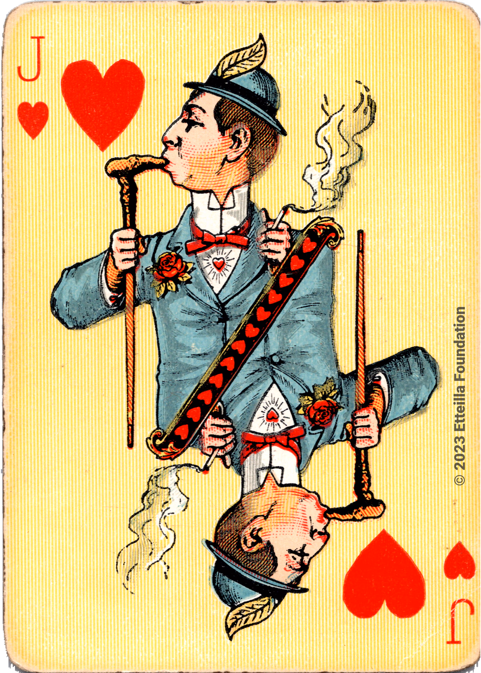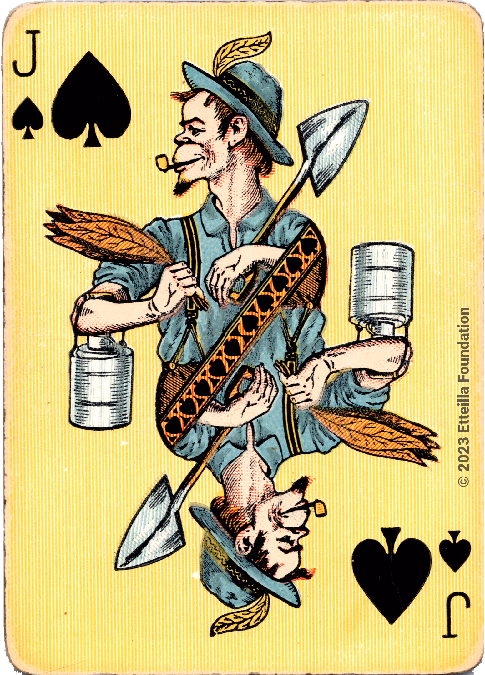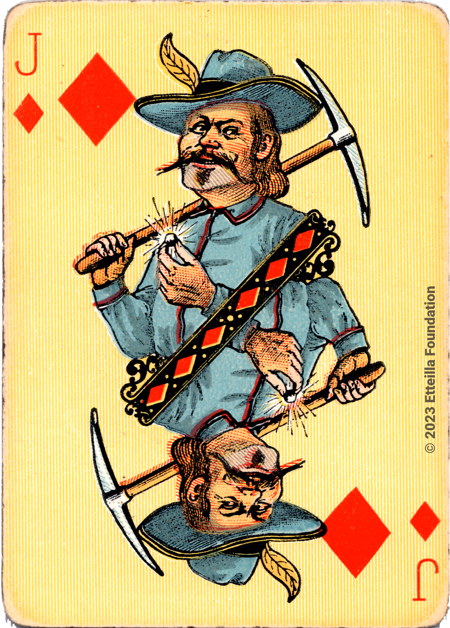 The Hustling Joe No 61 is a Transformation Deck type of playing cards, manufactured by The United States Playing Card Company in 1895. This is the first edition of the deck with the costume on the Ace of Spades in red. The second edition immediately issued after the intial release to correct some design flaws found in the first edition changed the costume to yellow. The back design is a double-ended black and white scene of gnomes ice skating in the moonlight.