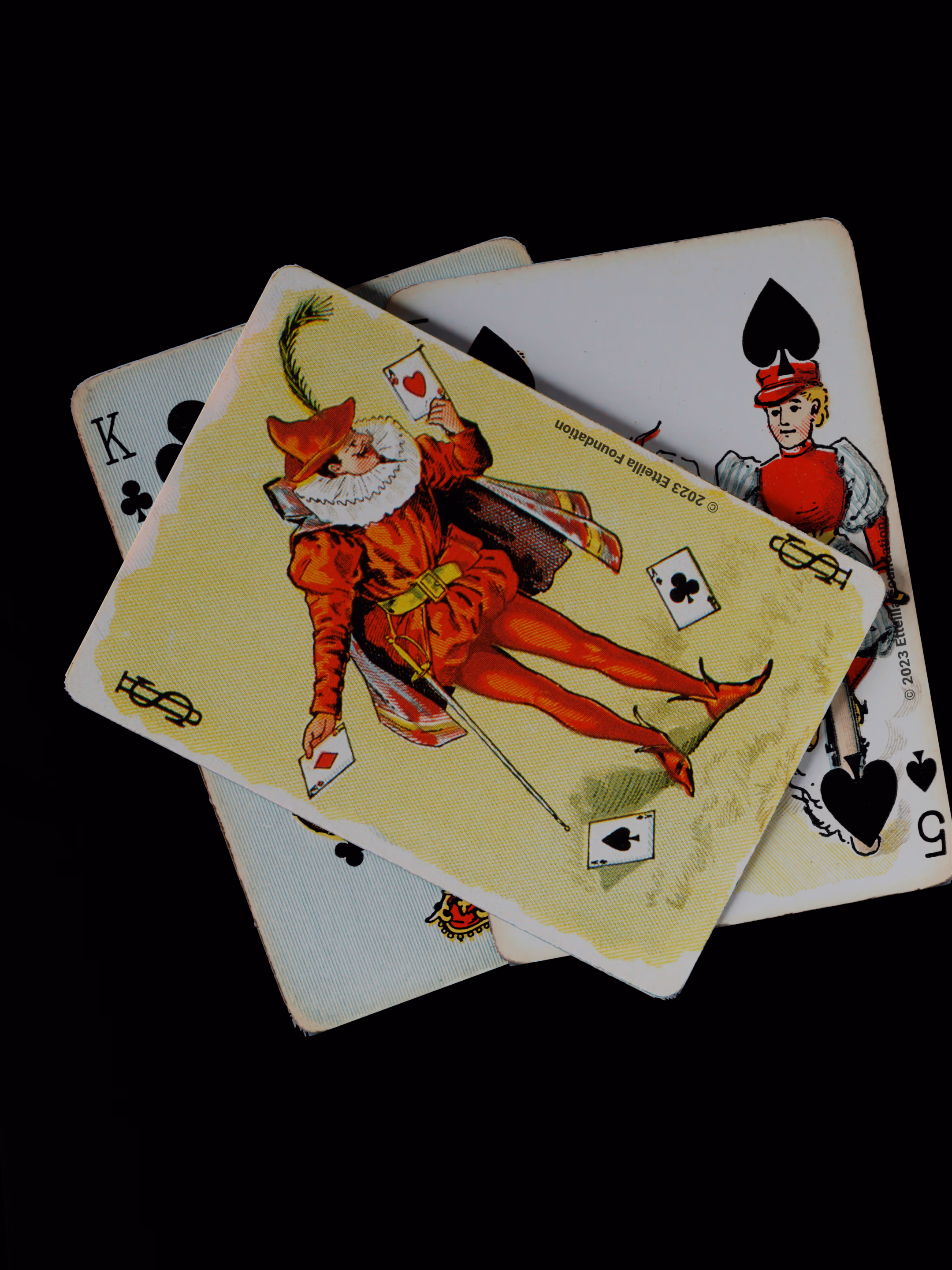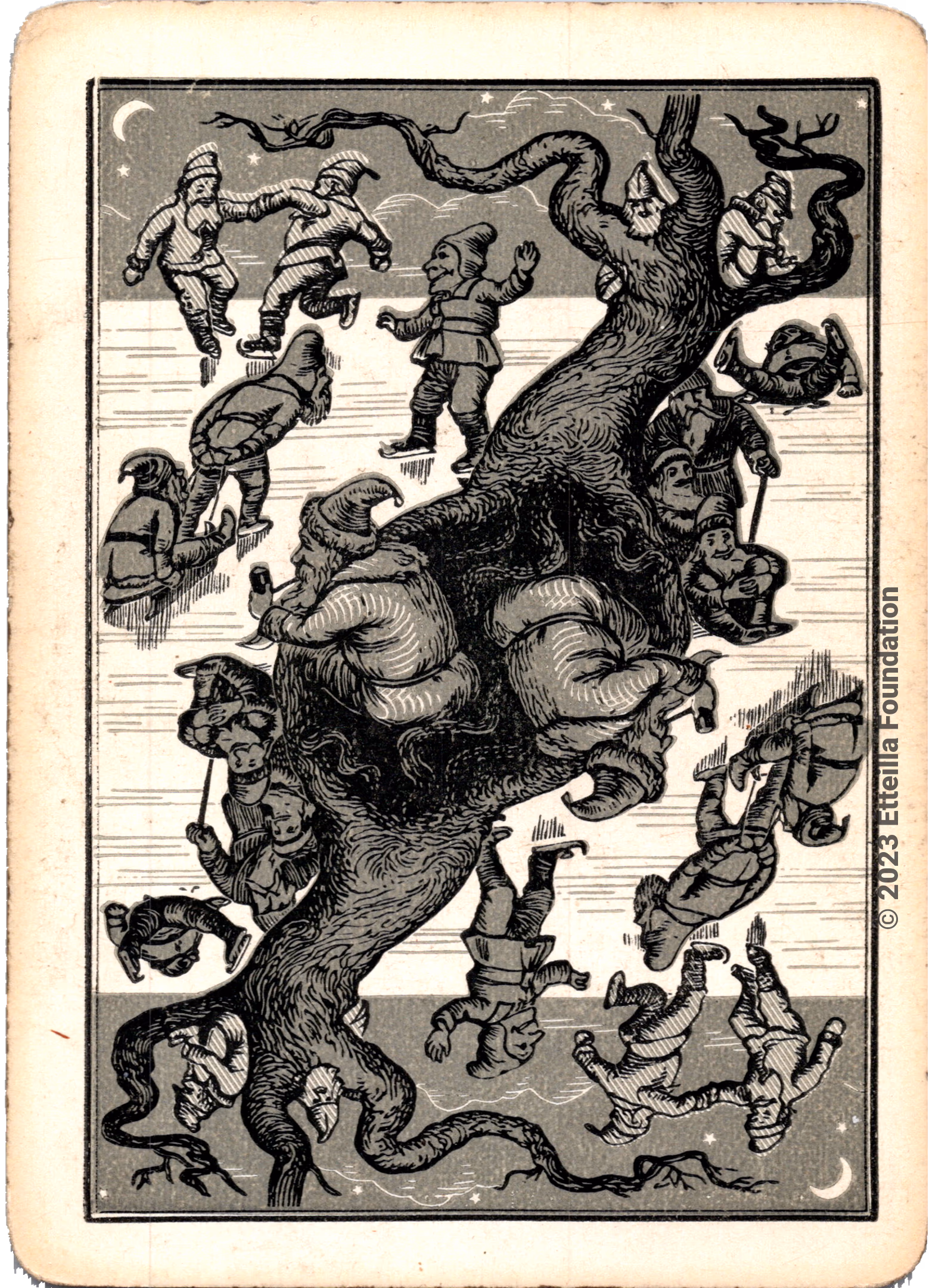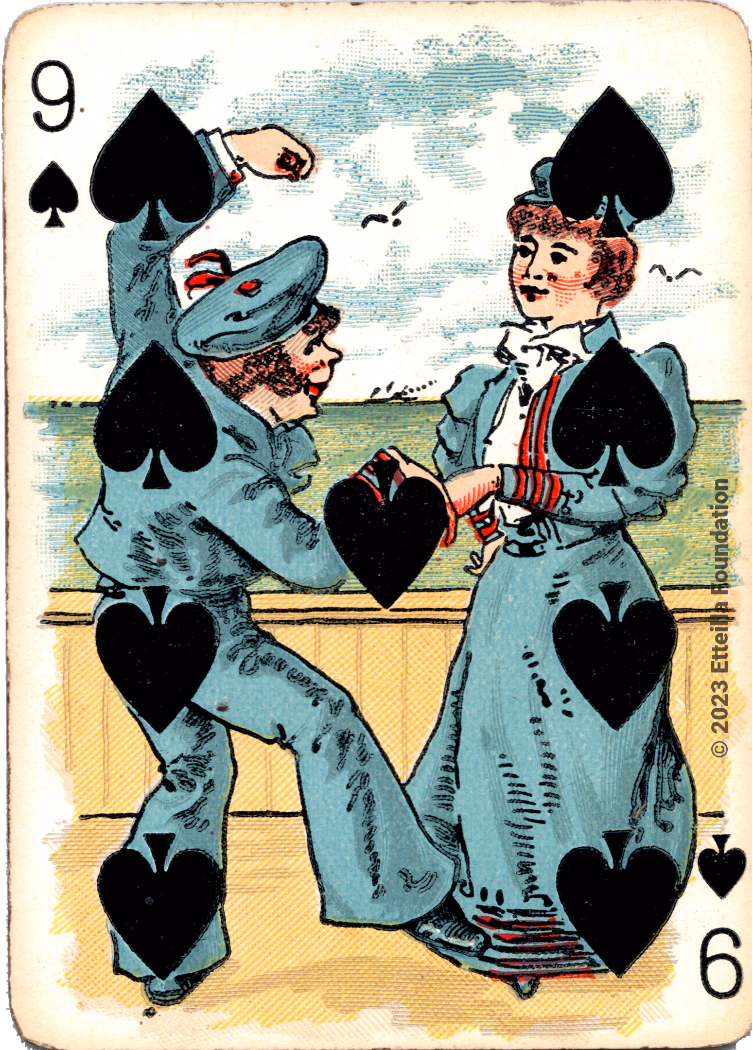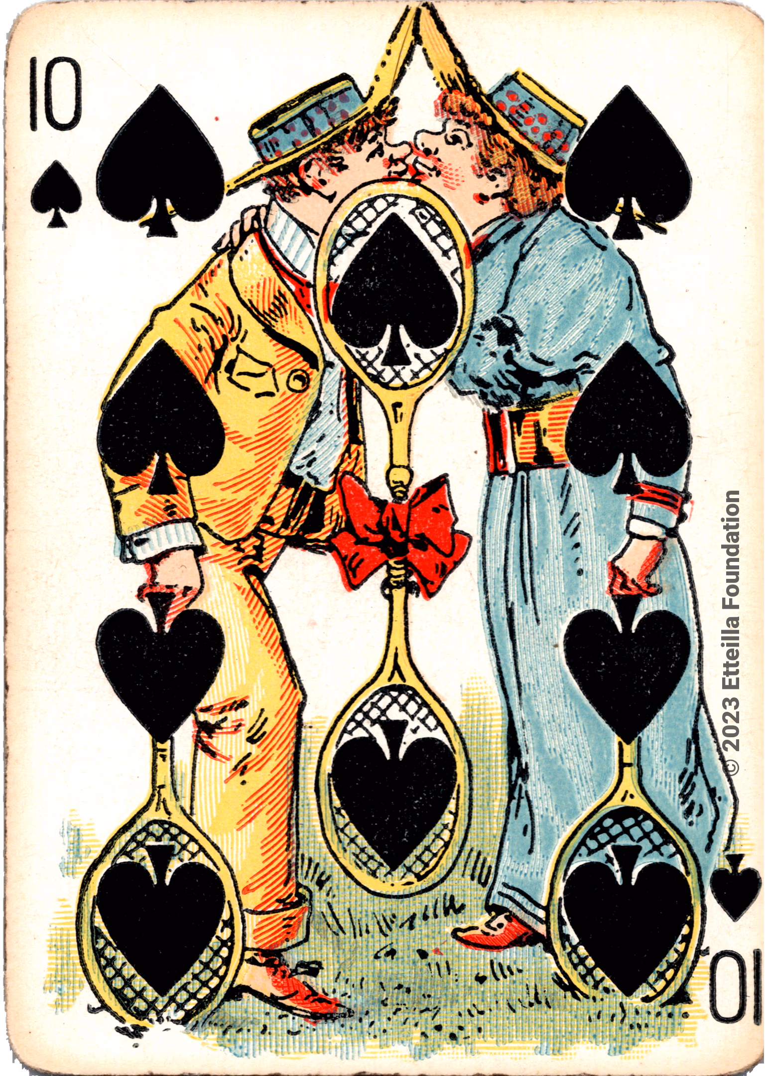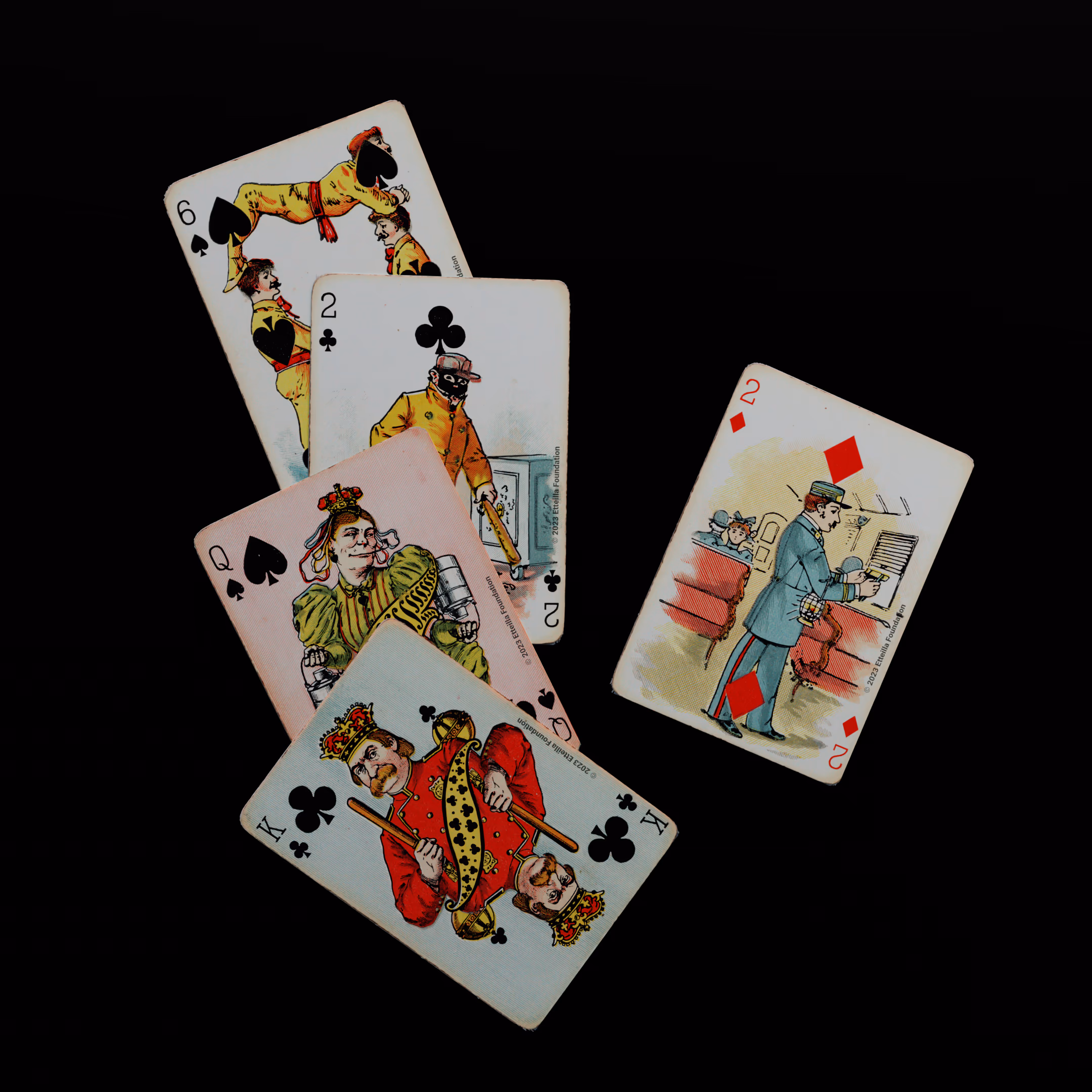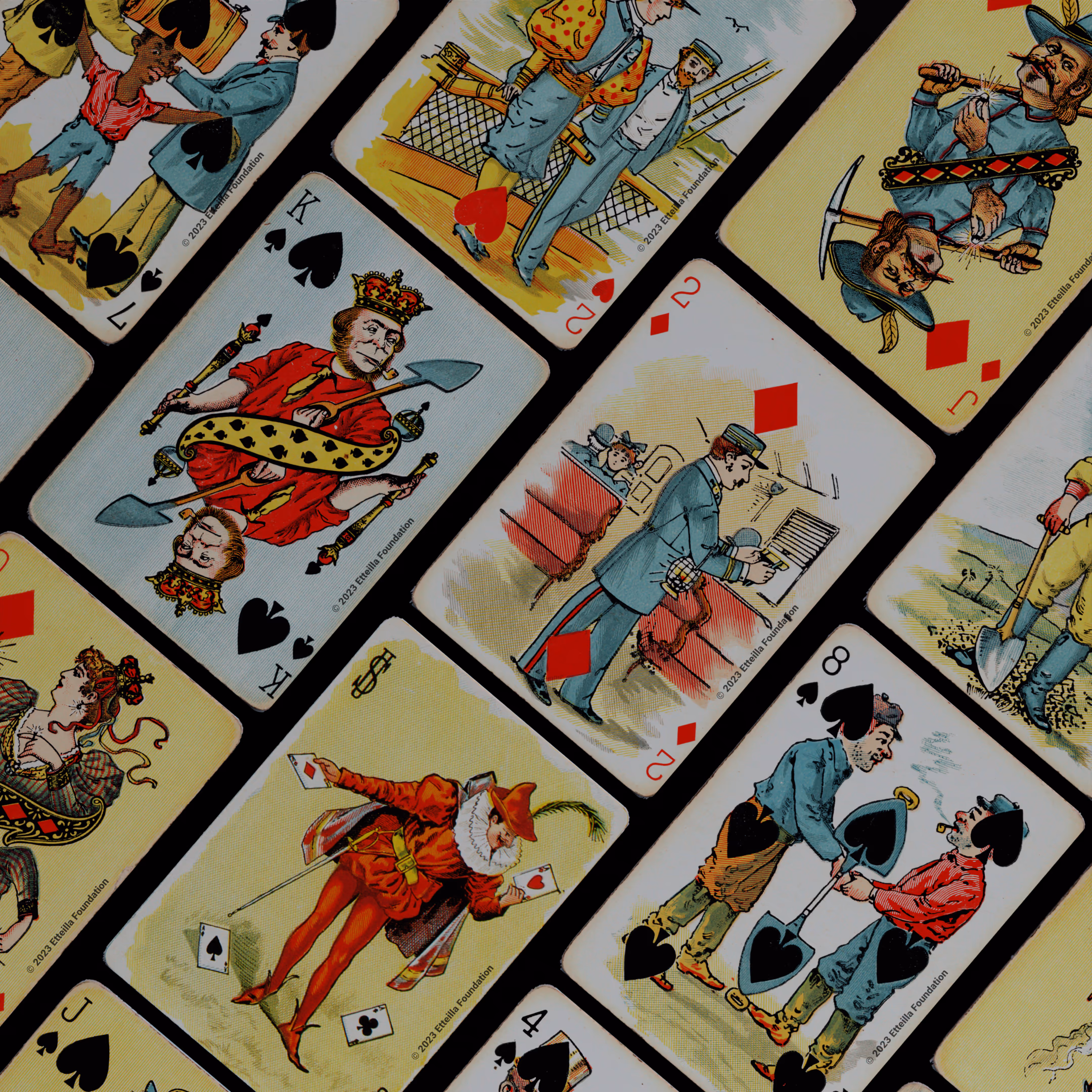 The Hustling Joe No 61 is a Transformation Deck type of playing cards, manufactured by The United States Playing Card Company in 1895. This is the first edition of the deck with the costume on the Ace of Spades in red. The second edition immediately issued after the intial release to correct some design flaws found in the first edition changed the costume to yellow. The back design is a double-ended black and white scene of gnomes ice skating in the moonlight.