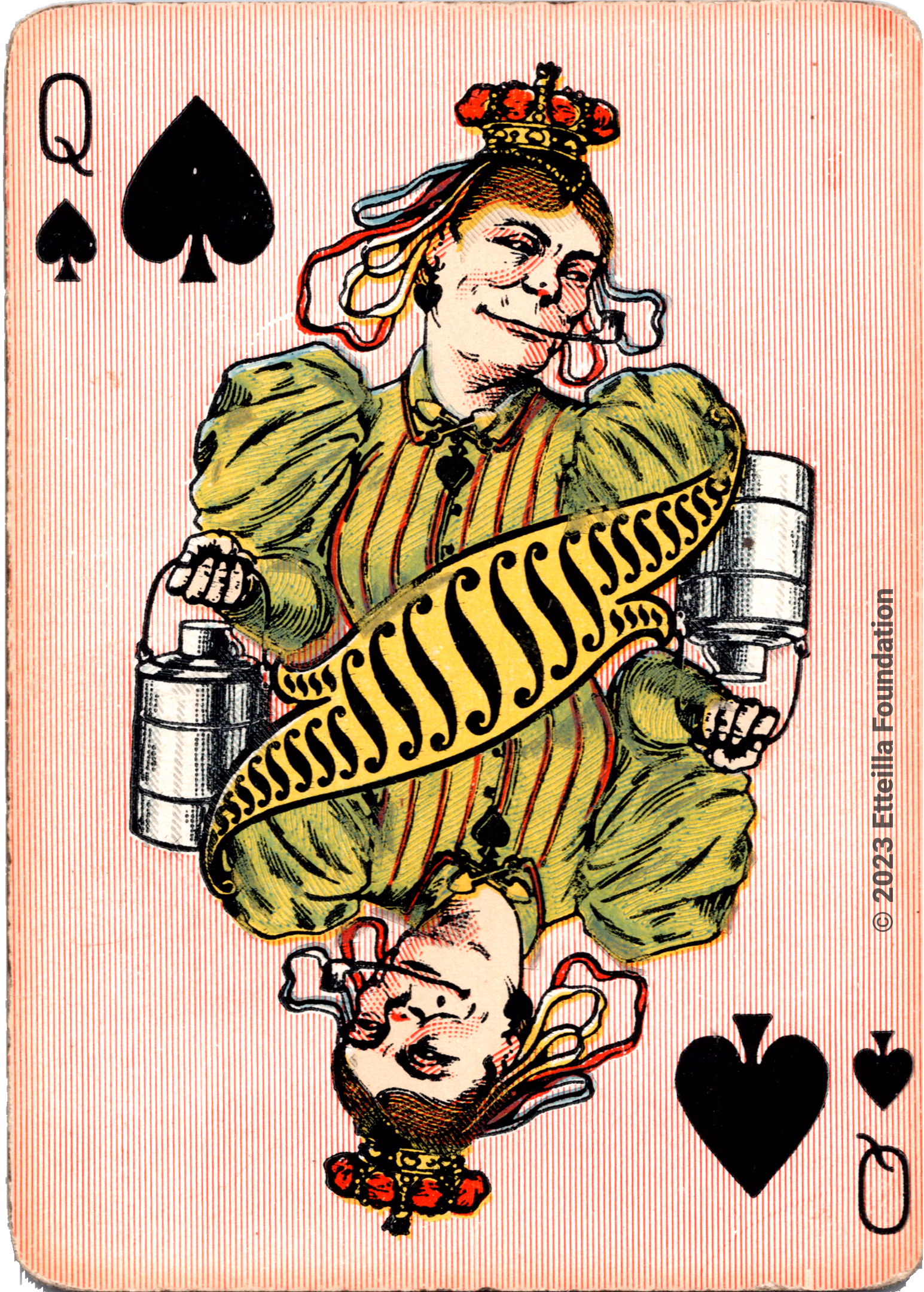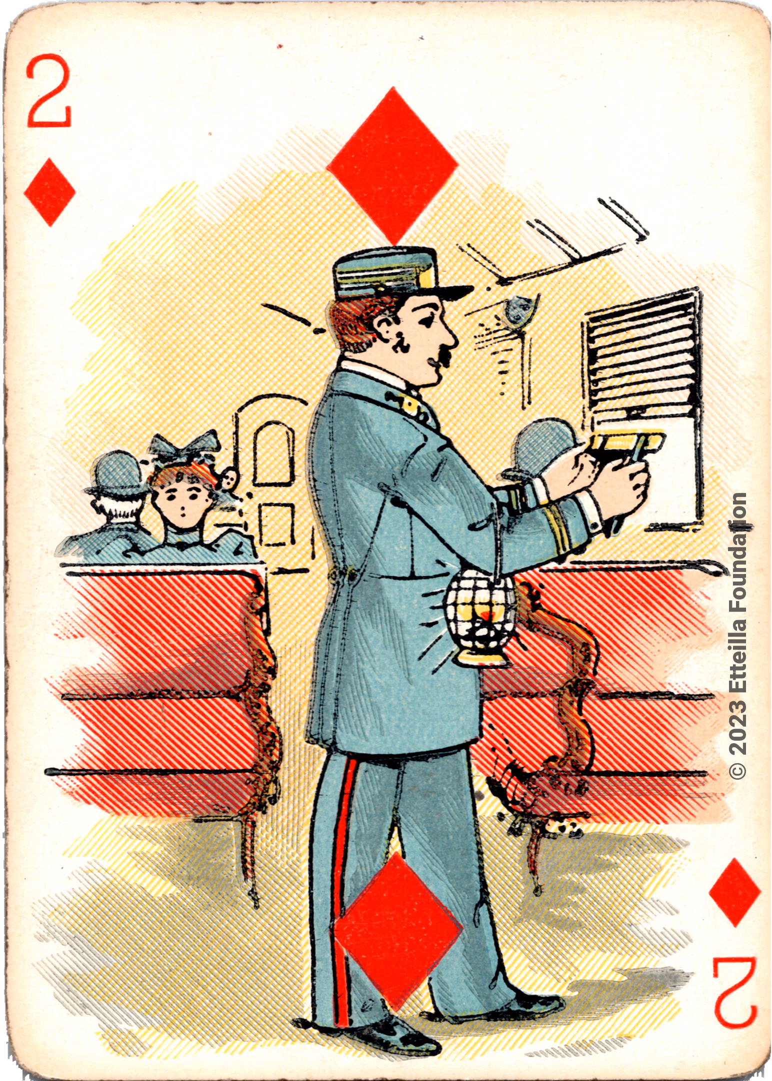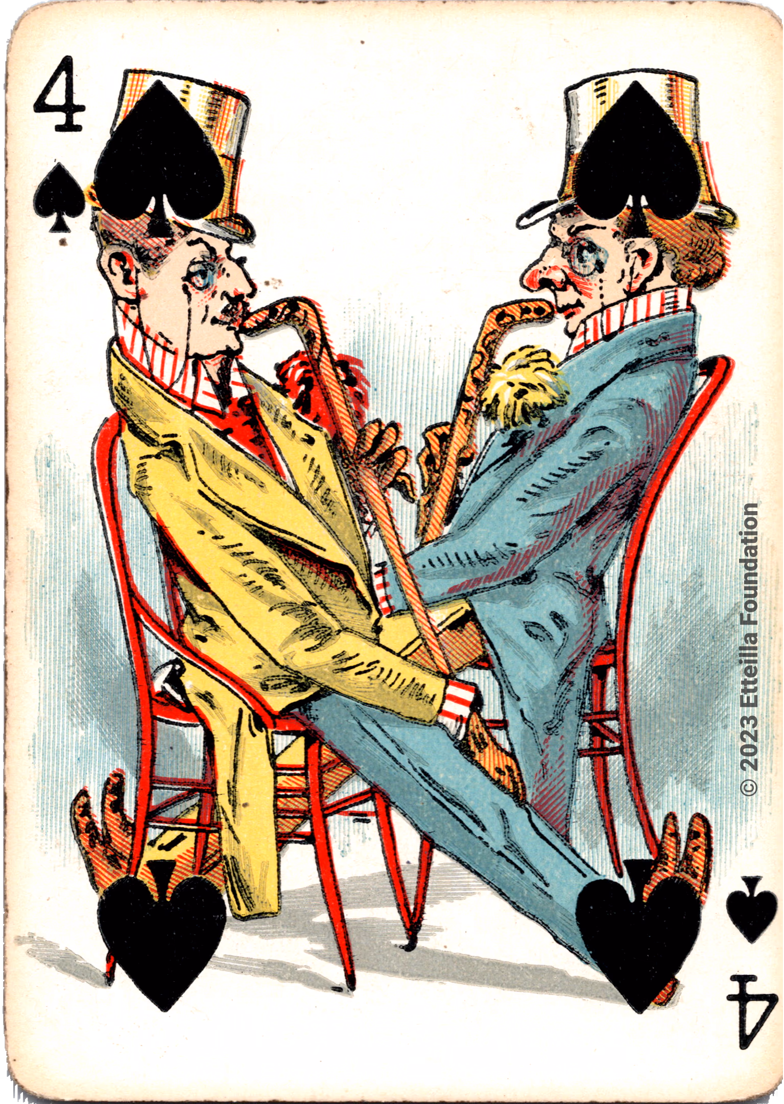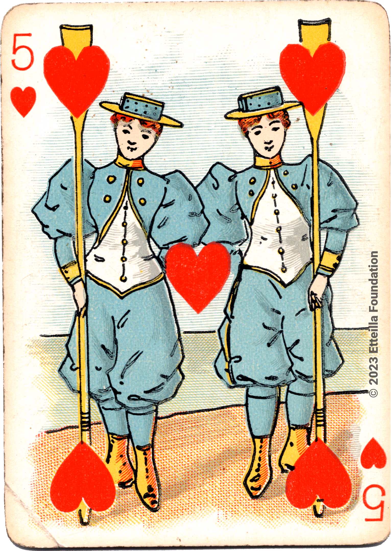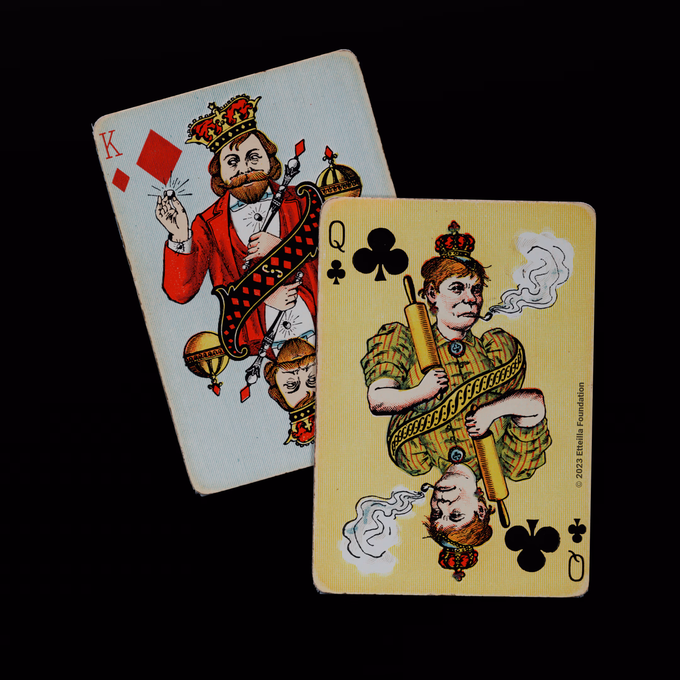 The Hustling Joe No 61 is a Transformation Deck type of playing cards, manufactured by The United States Playing Card Company in 1895. This is the first edition of the deck with the costume on the Ace of Spades in red. The second edition immediately issued after the intial release to correct some design flaws found in the first edition changed the costume to yellow. The back design is a double-ended black and white scene of gnomes ice skating in the moonlight.