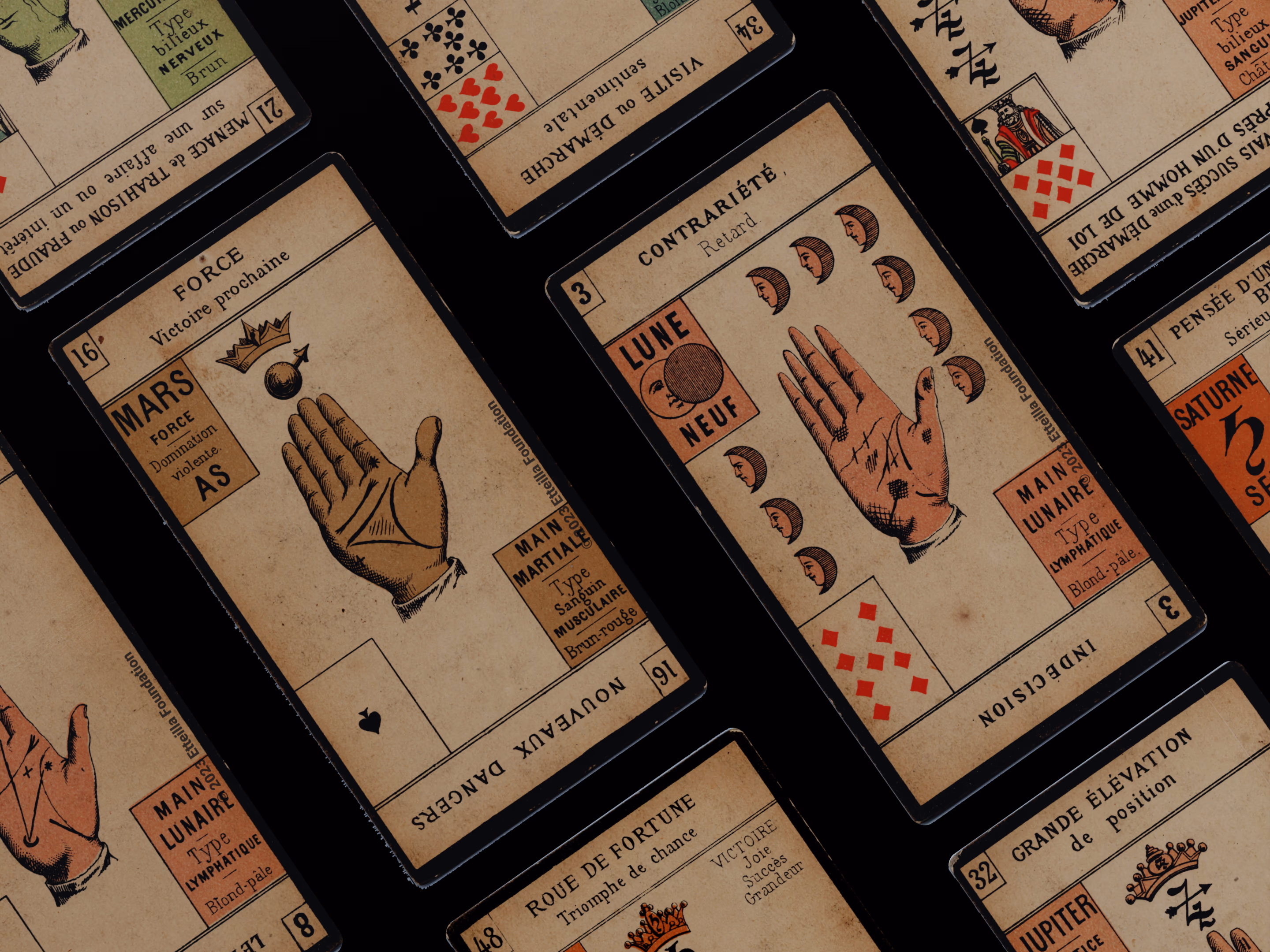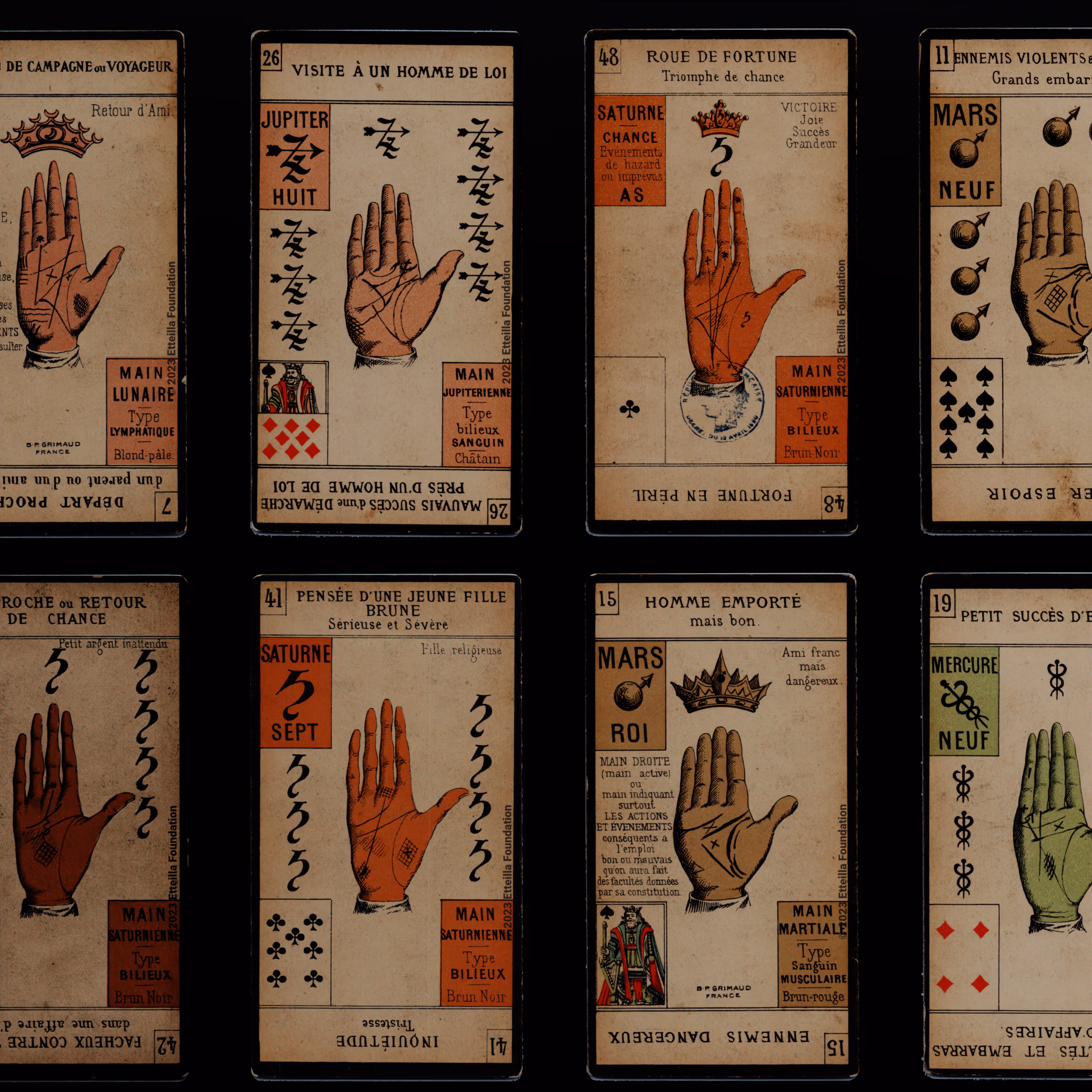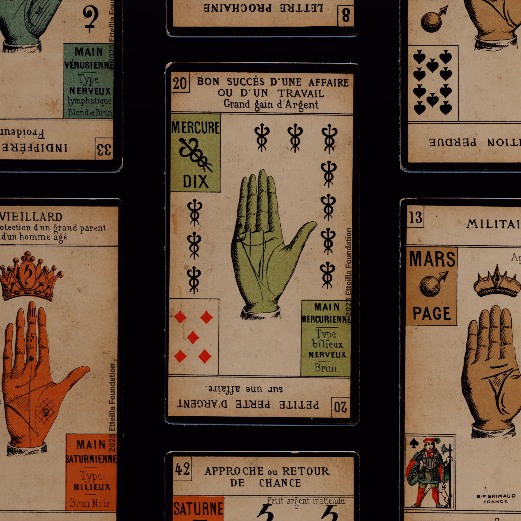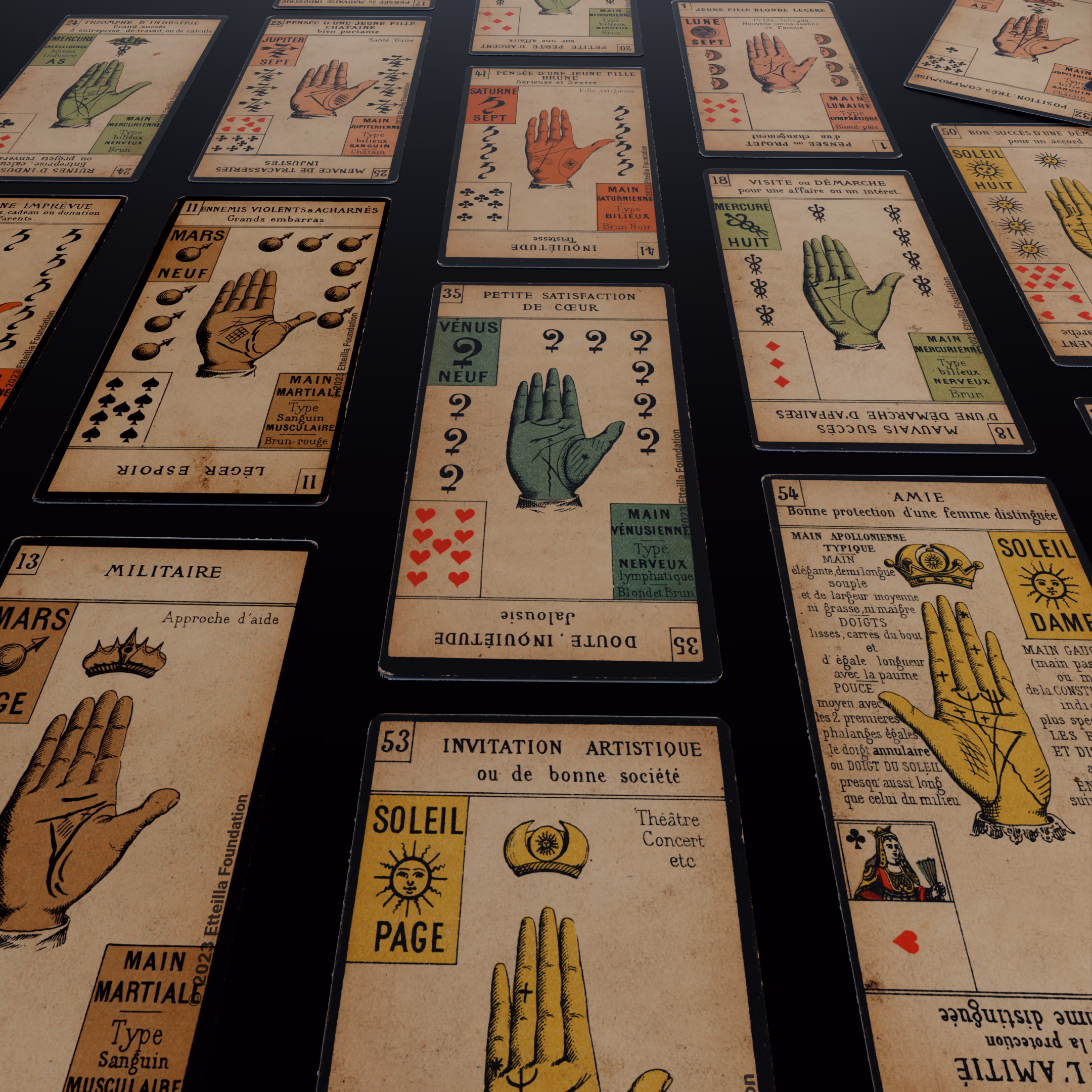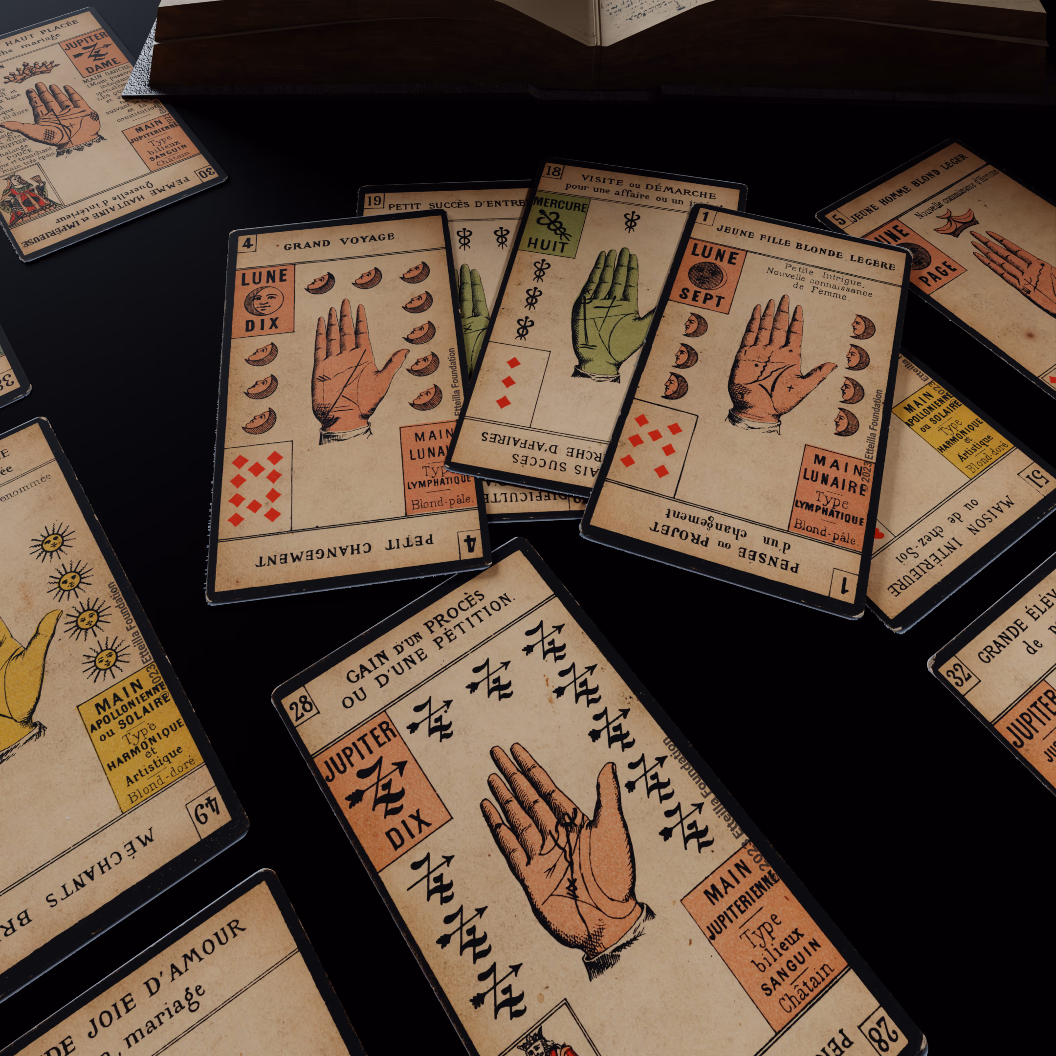The ‘Nouveau Jeu de la main’ created by Adèle Moreau a student of Mlle Lenormand is an Oracle Deck that uniquely combine card reading, astrology, and palm reading to offer a new approach to divination.