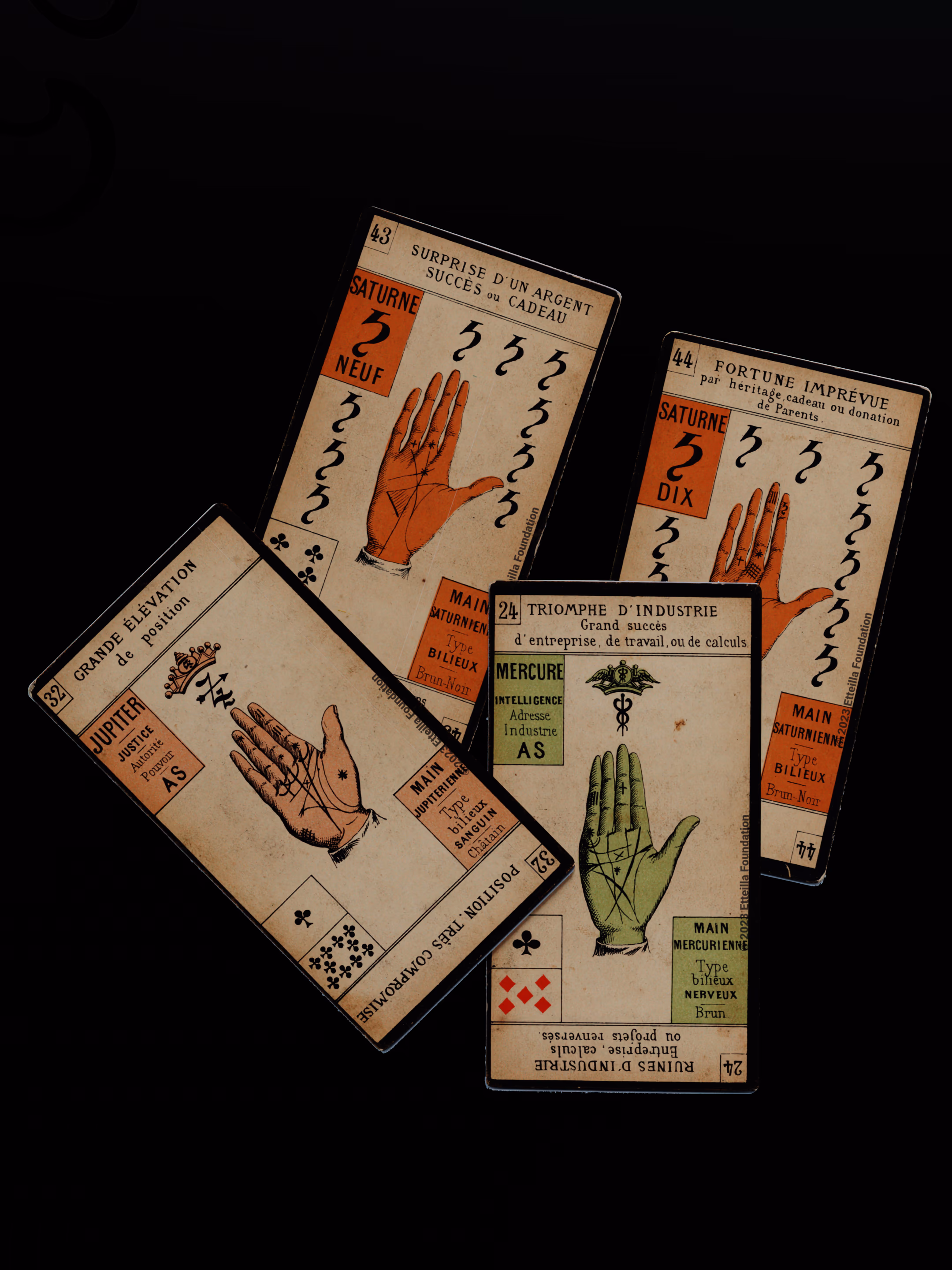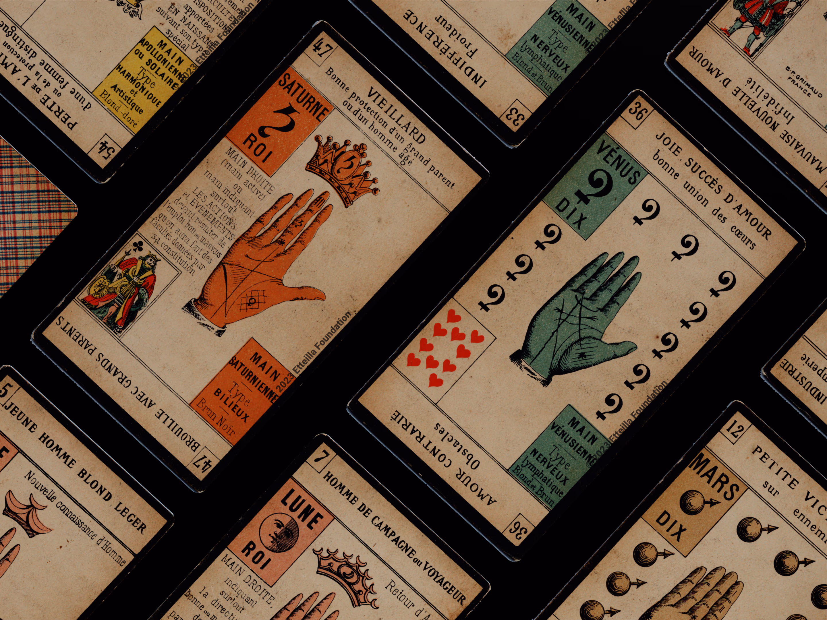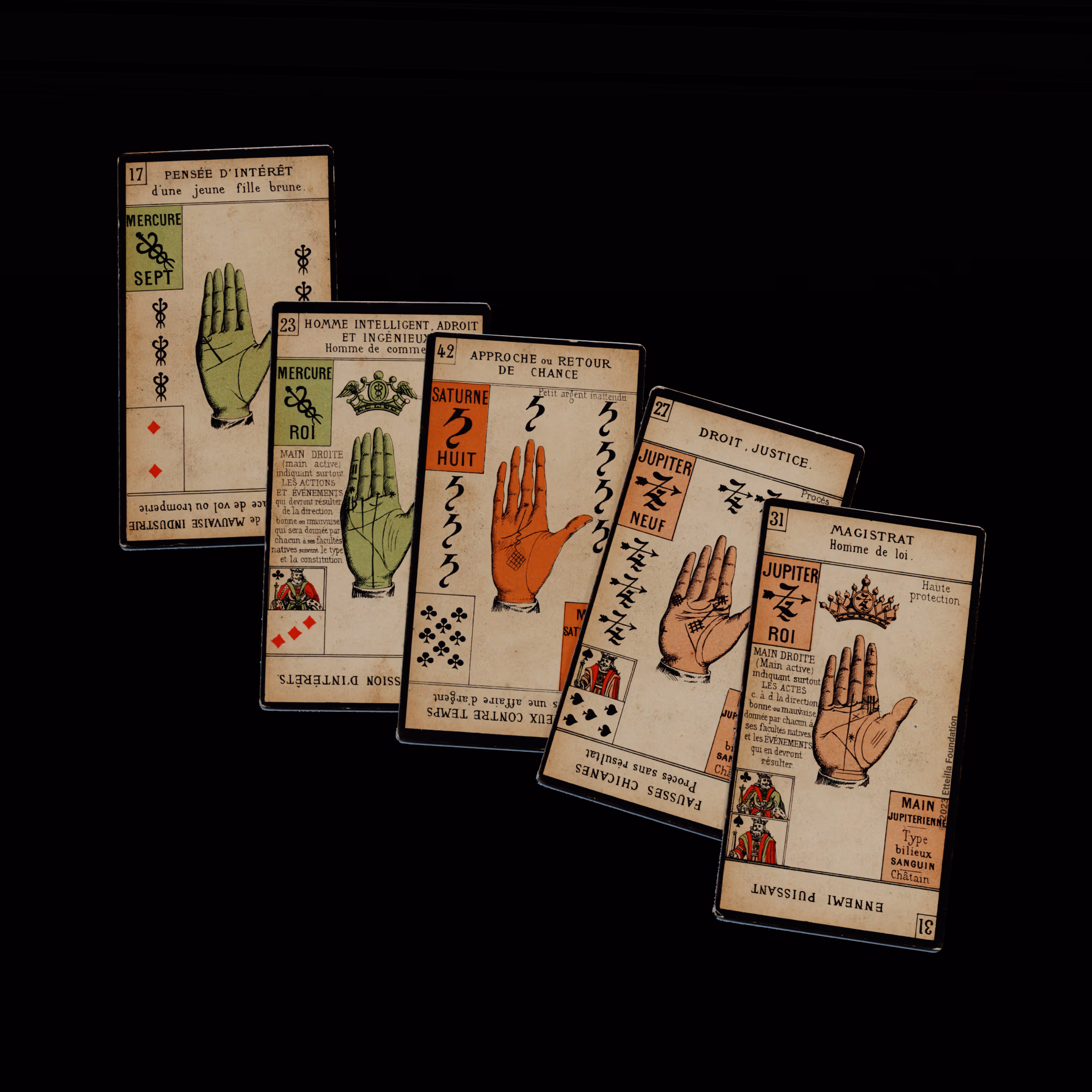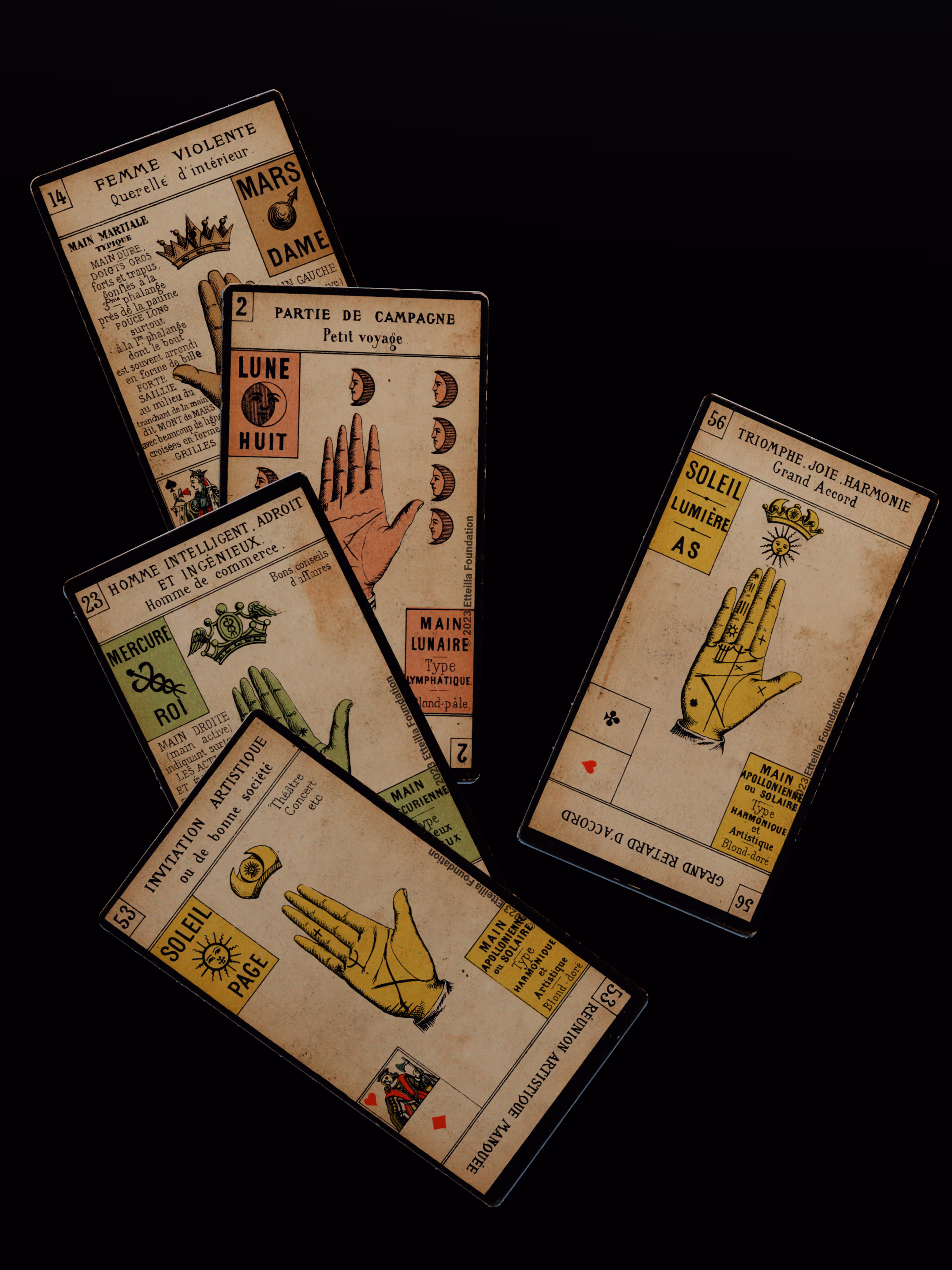 The ‘Nouveau Jeu de la main’ created by Adèle Moreau a student of Mlle Lenormand is an Oracle Deck that uniquely combine card reading, astrology, and palm reading to offer a new approach to divination.