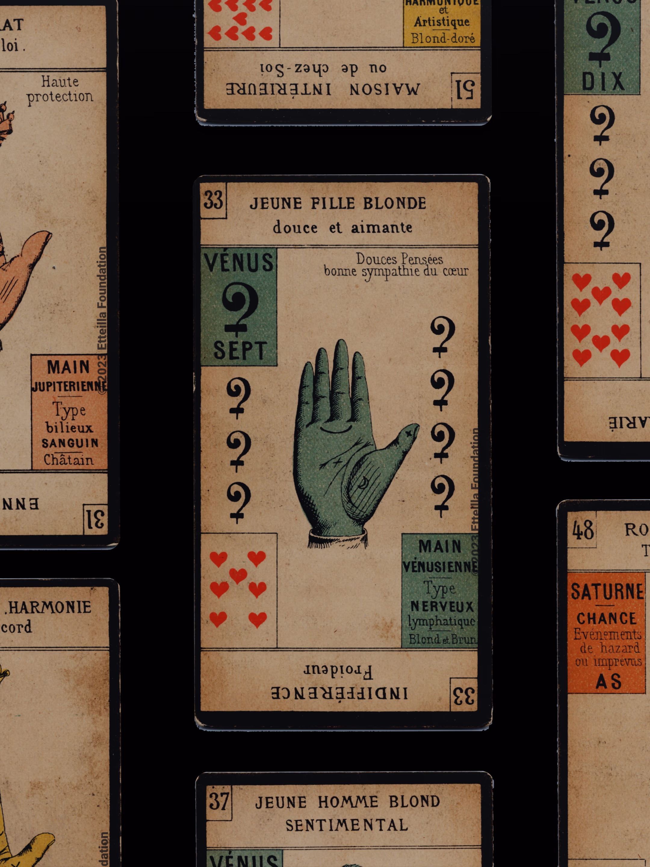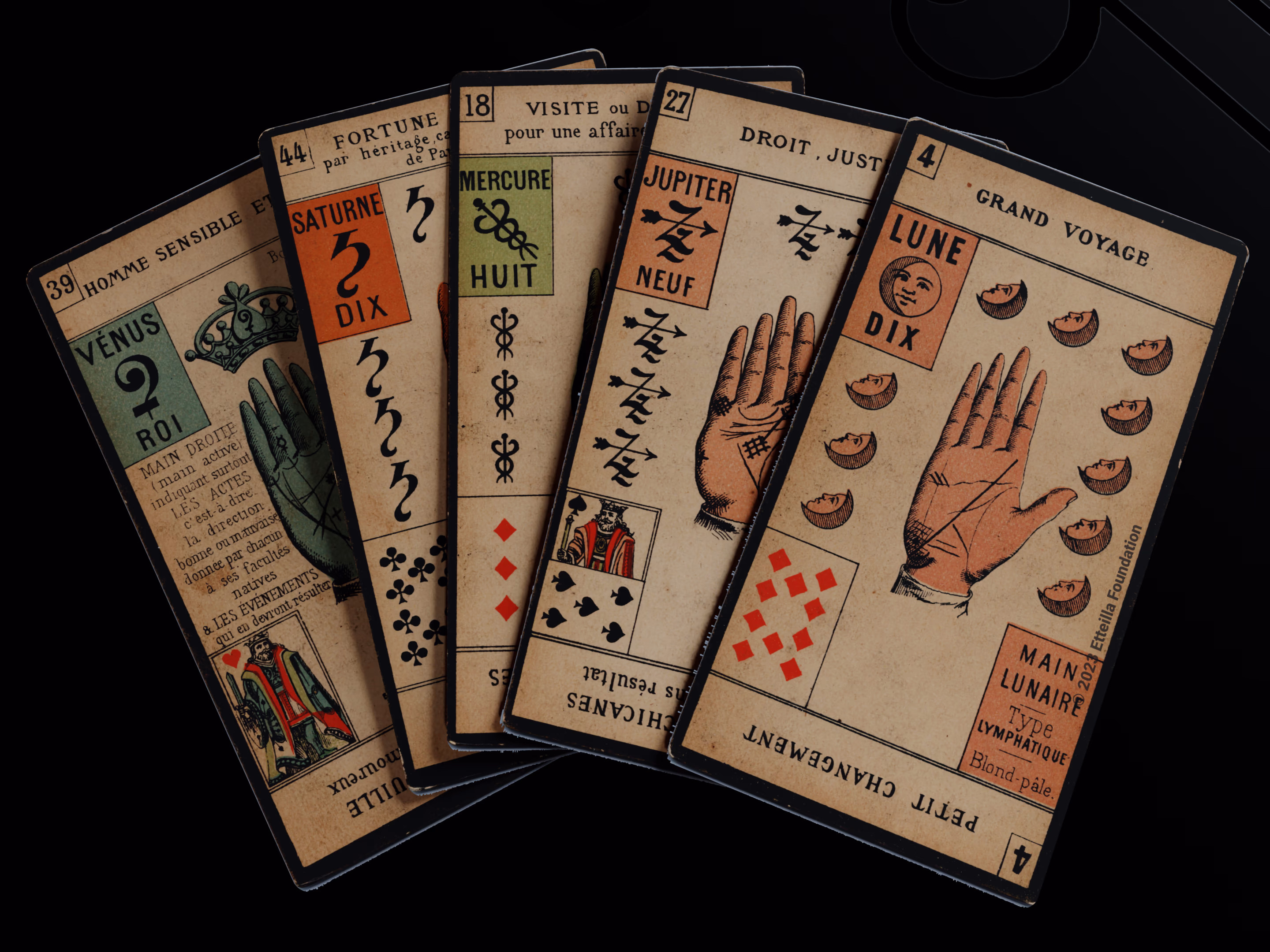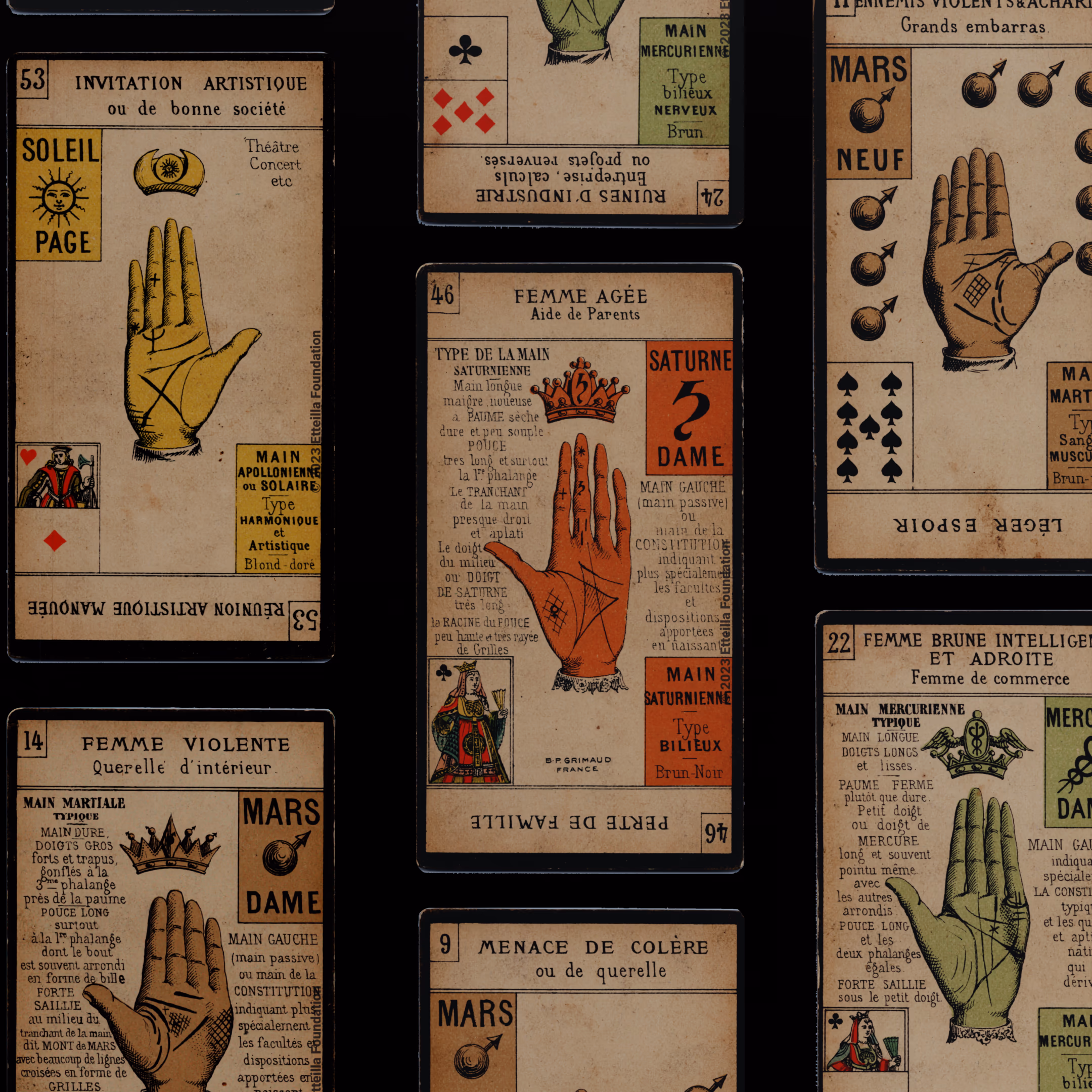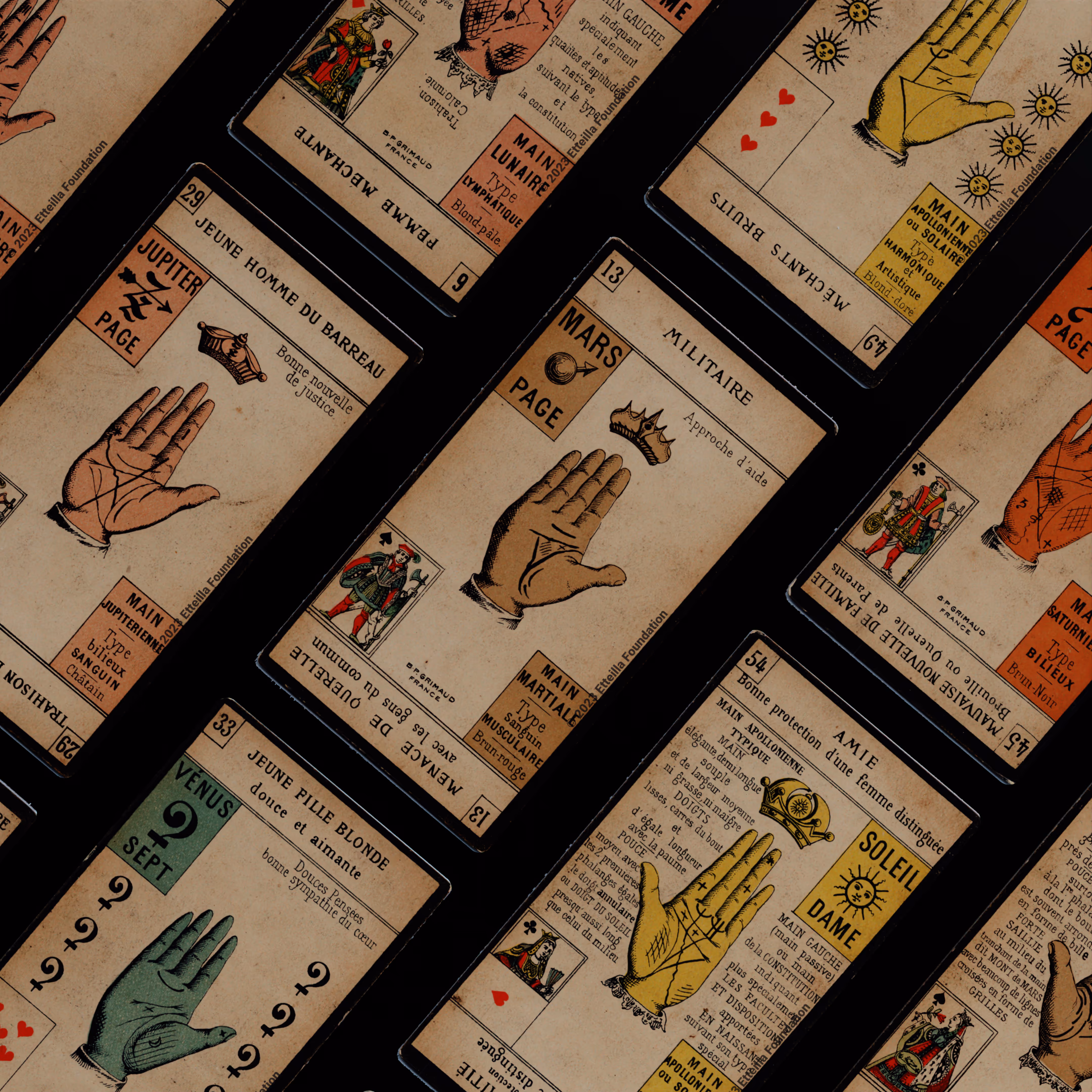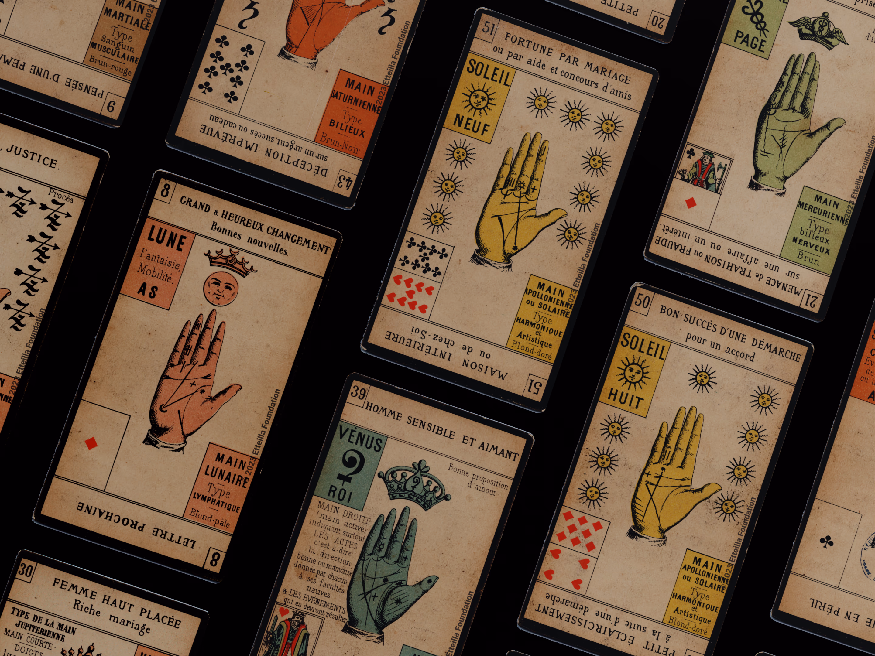 The ‘Nouveau Jeu de la main’ created by Adèle Moreau a student of Mlle Lenormand is an Oracle Deck that uniquely combine card reading, astrology, and palm reading to offer a new approach to divination.