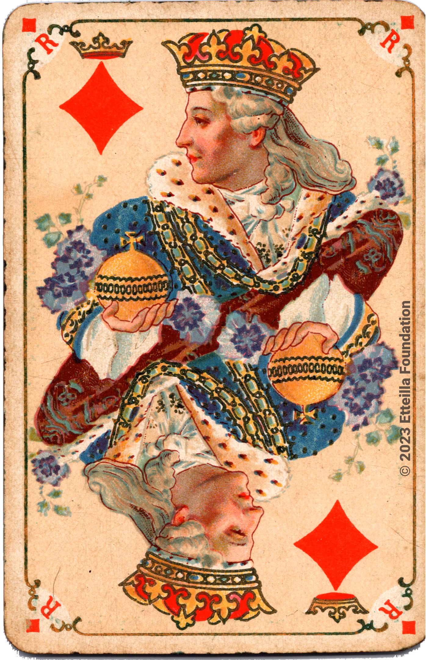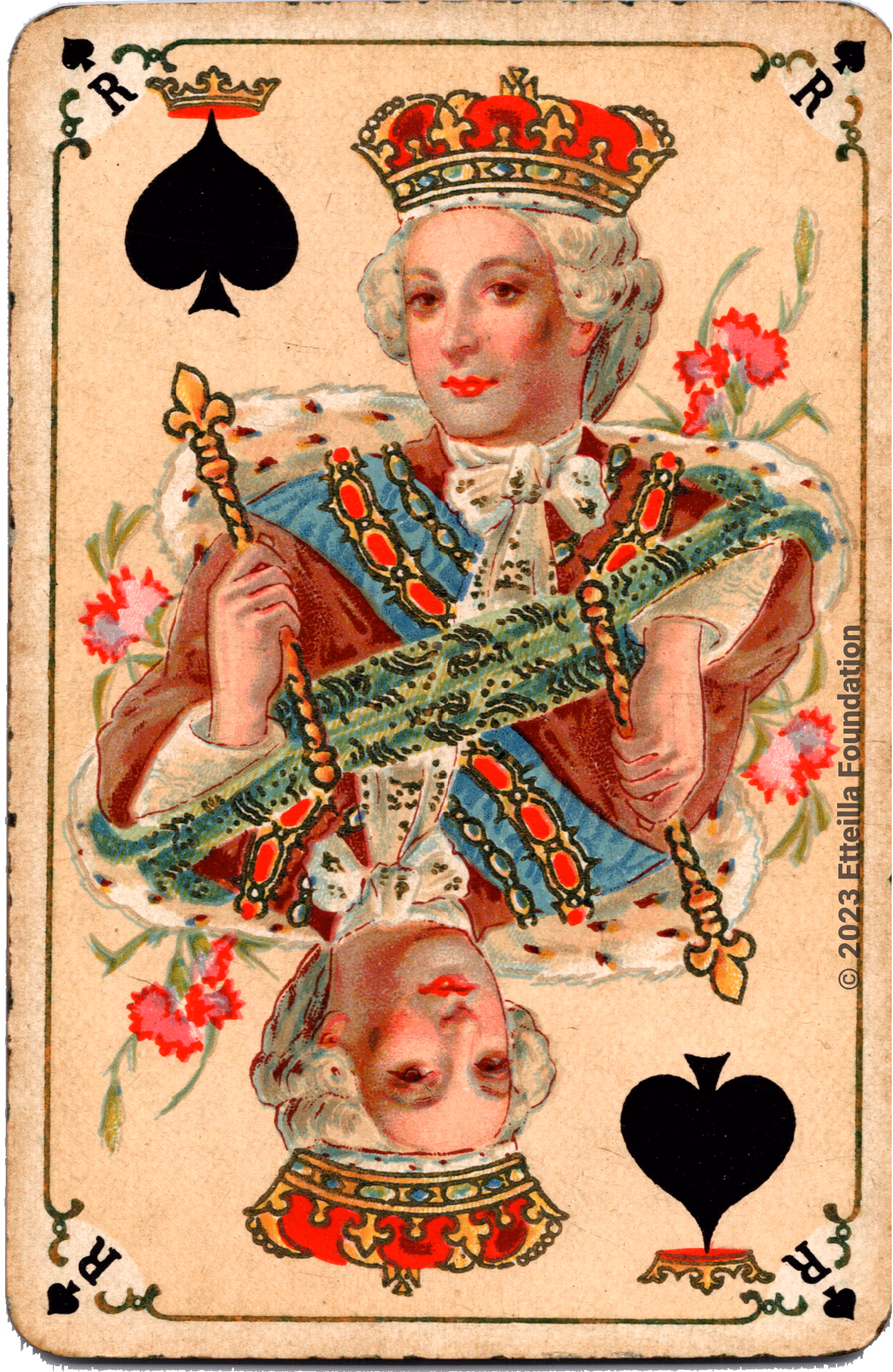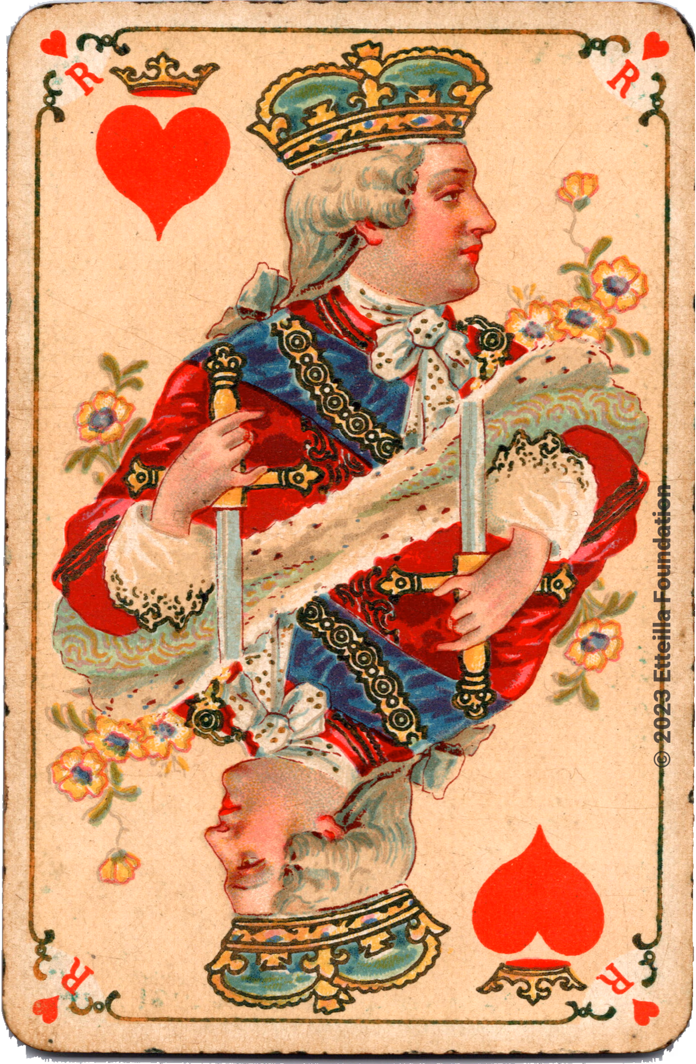 The Jeu Louis XV No.1502 is a Standard Deck of playing cards, manufactured by Baptiste-Paul Grimaud in France, 1895. The deck features a Paris face pattern, golden edge and was created using the chromolithography printing method. This very popular deck with a unique design aesthetics was reprinted multiple times.