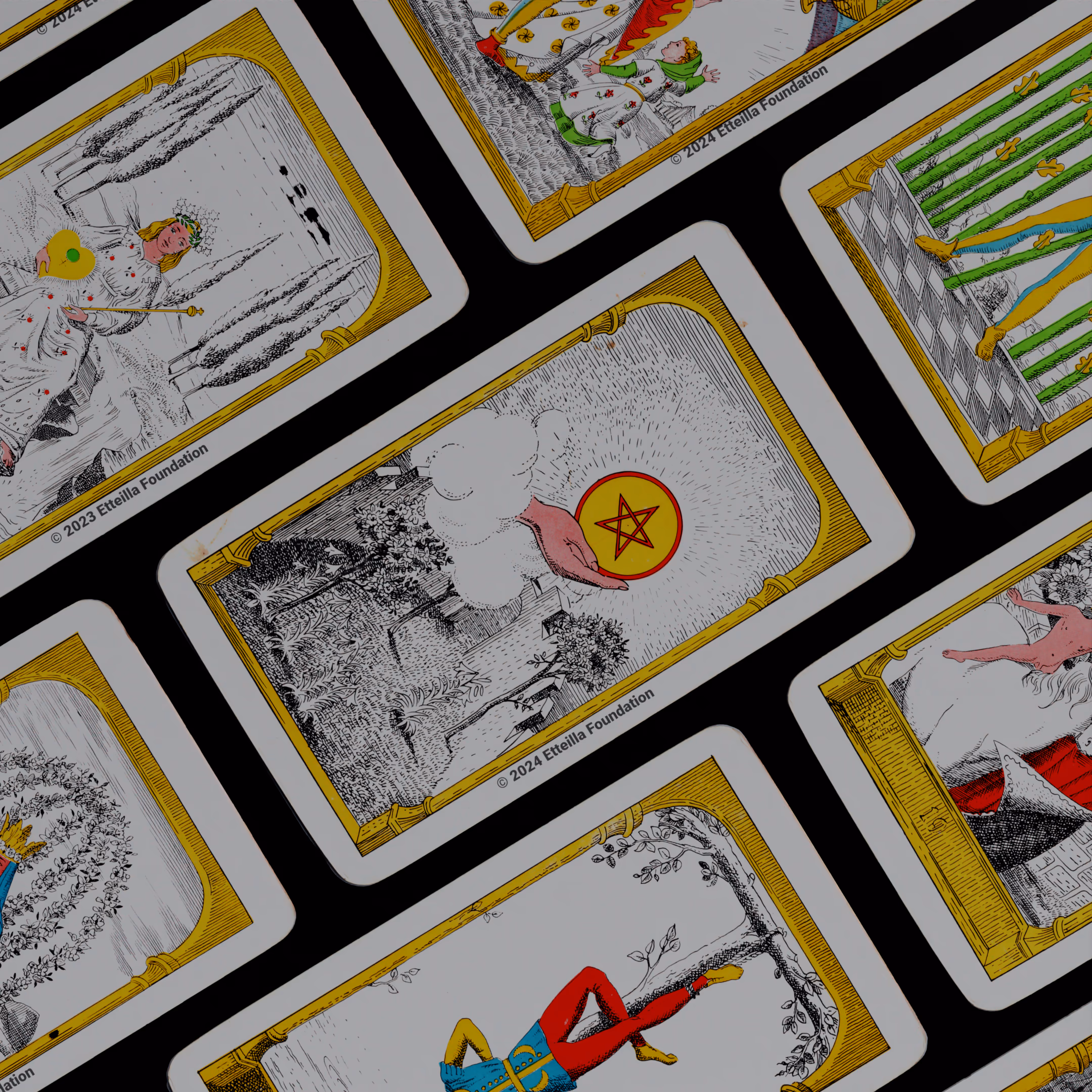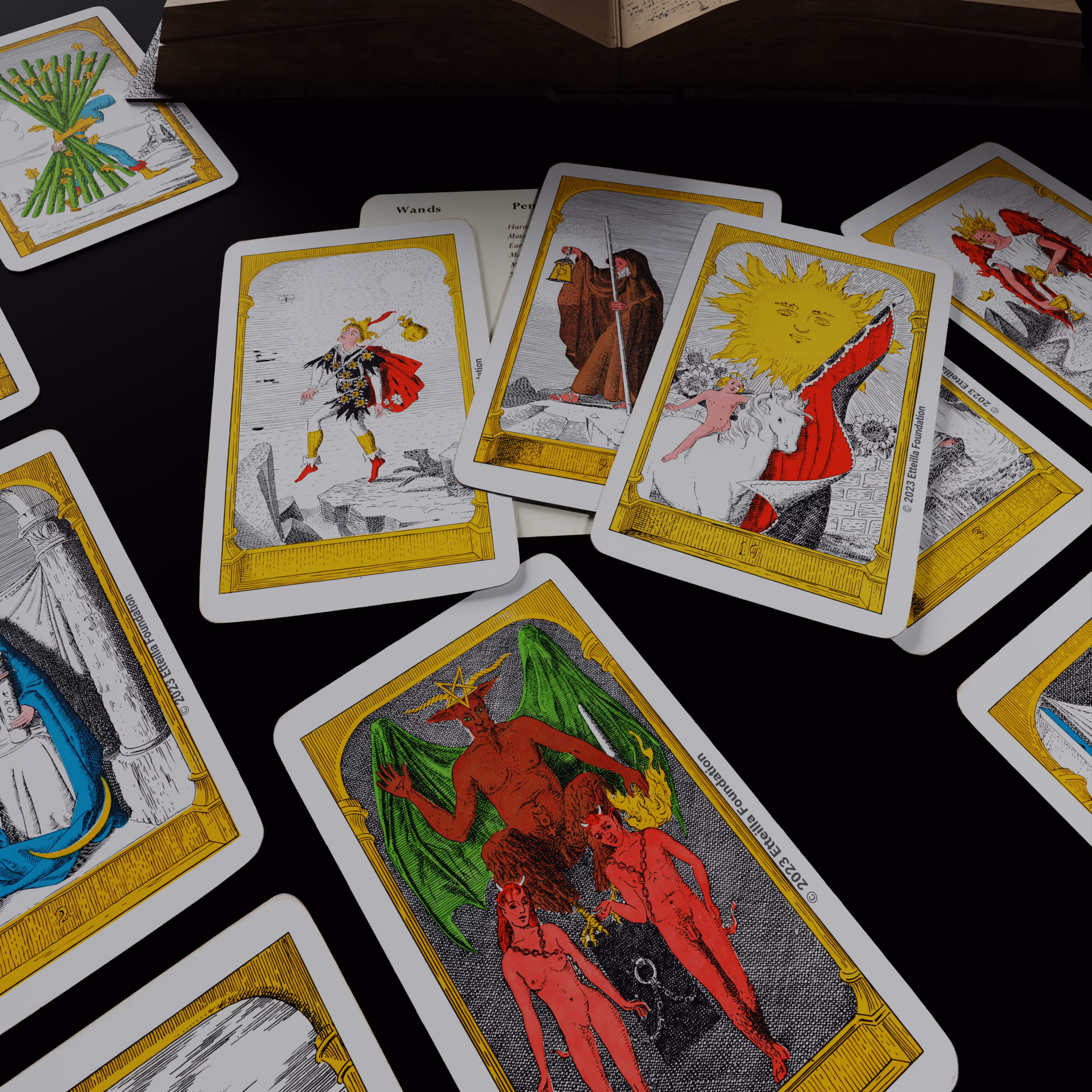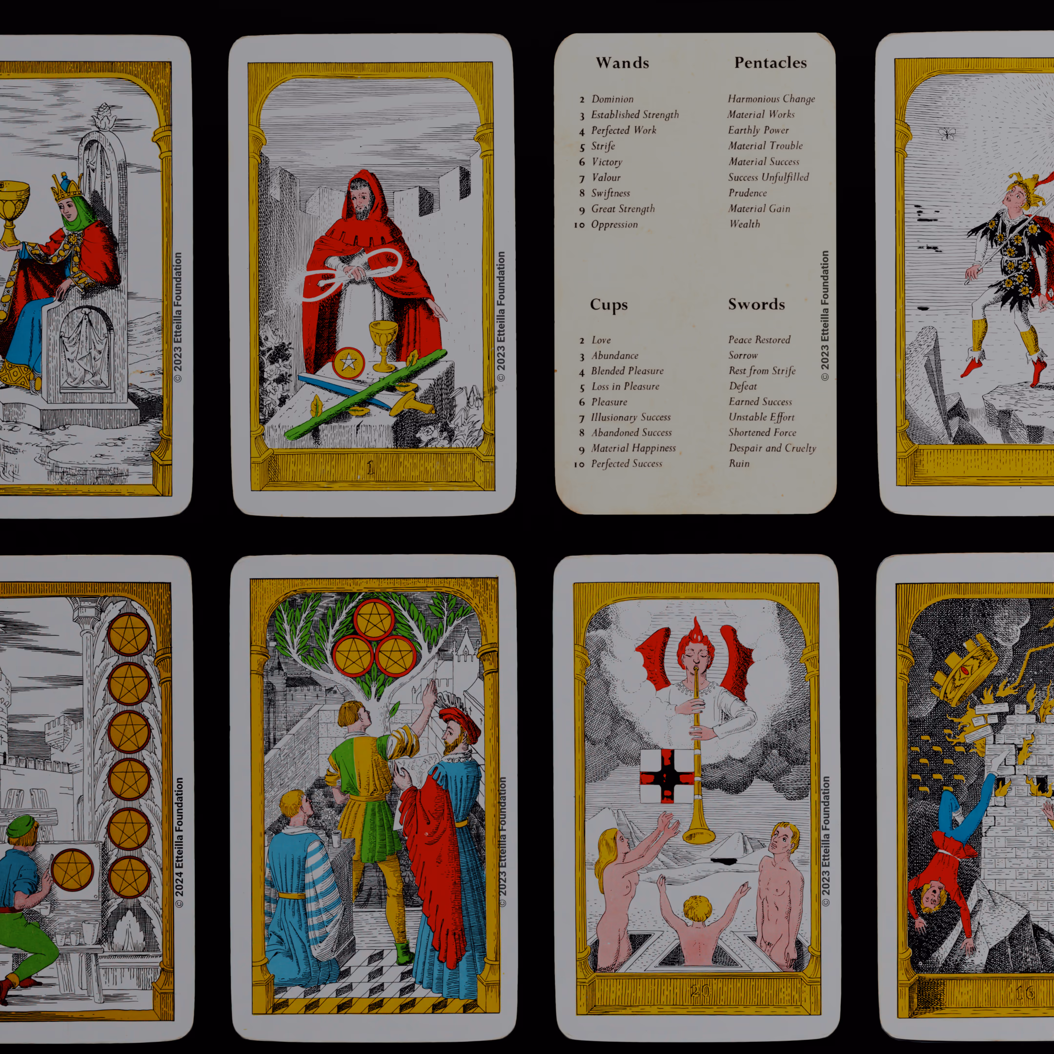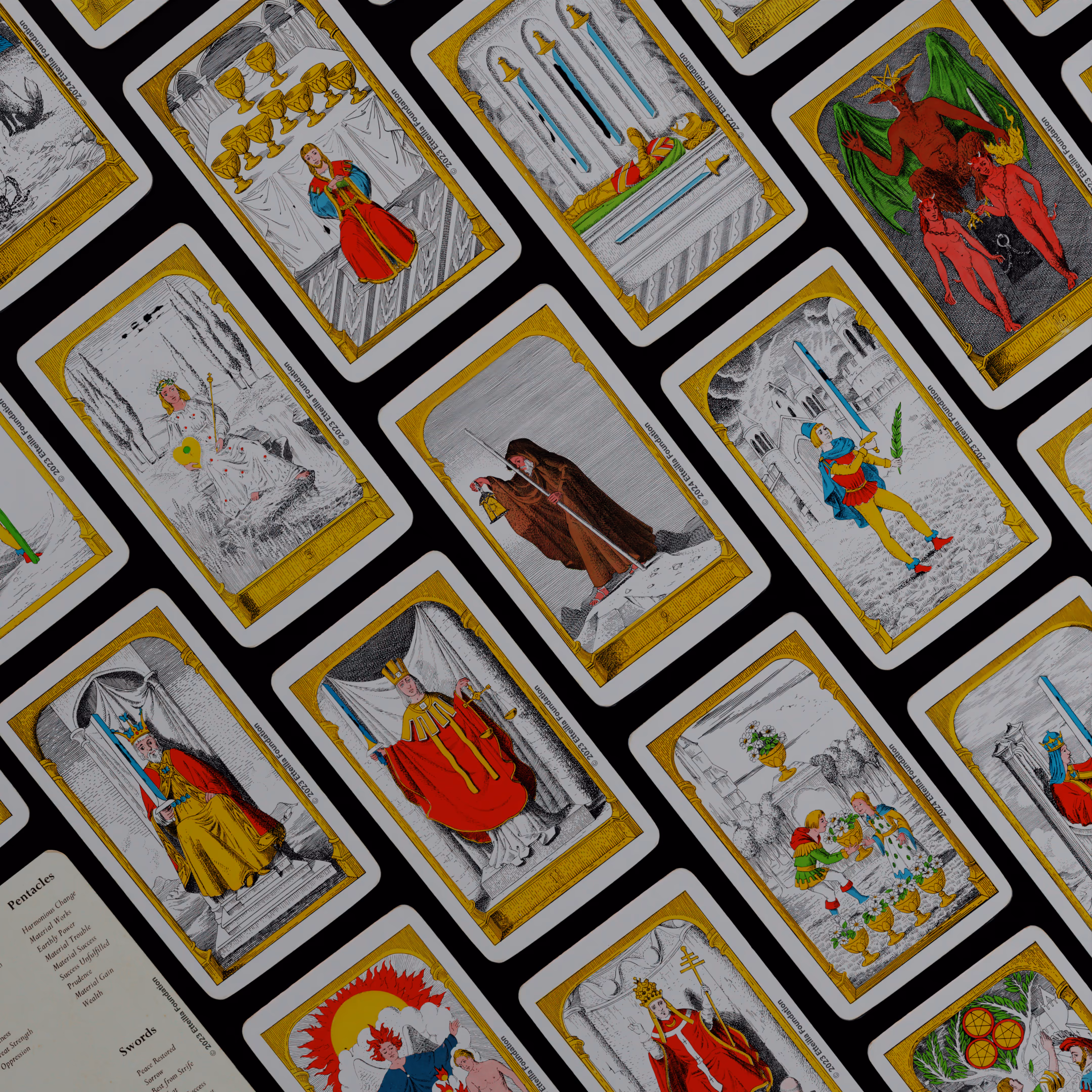 Original limited edition of the Tarot of Fez created by Roland Berrill and designed by Michael Hobdell around 1950. However due to Berrill death, the first version of this deck was delayed and ended up being printed as a limited edition of 500 copies in 1970 by Riglel Press. Design wise this tarot reflect Berrill’s alleged belief that the tarot had its origins in 12th century Moroccan secret societies while having cards design heavily inspired by the Waite-Smith tarot designs.