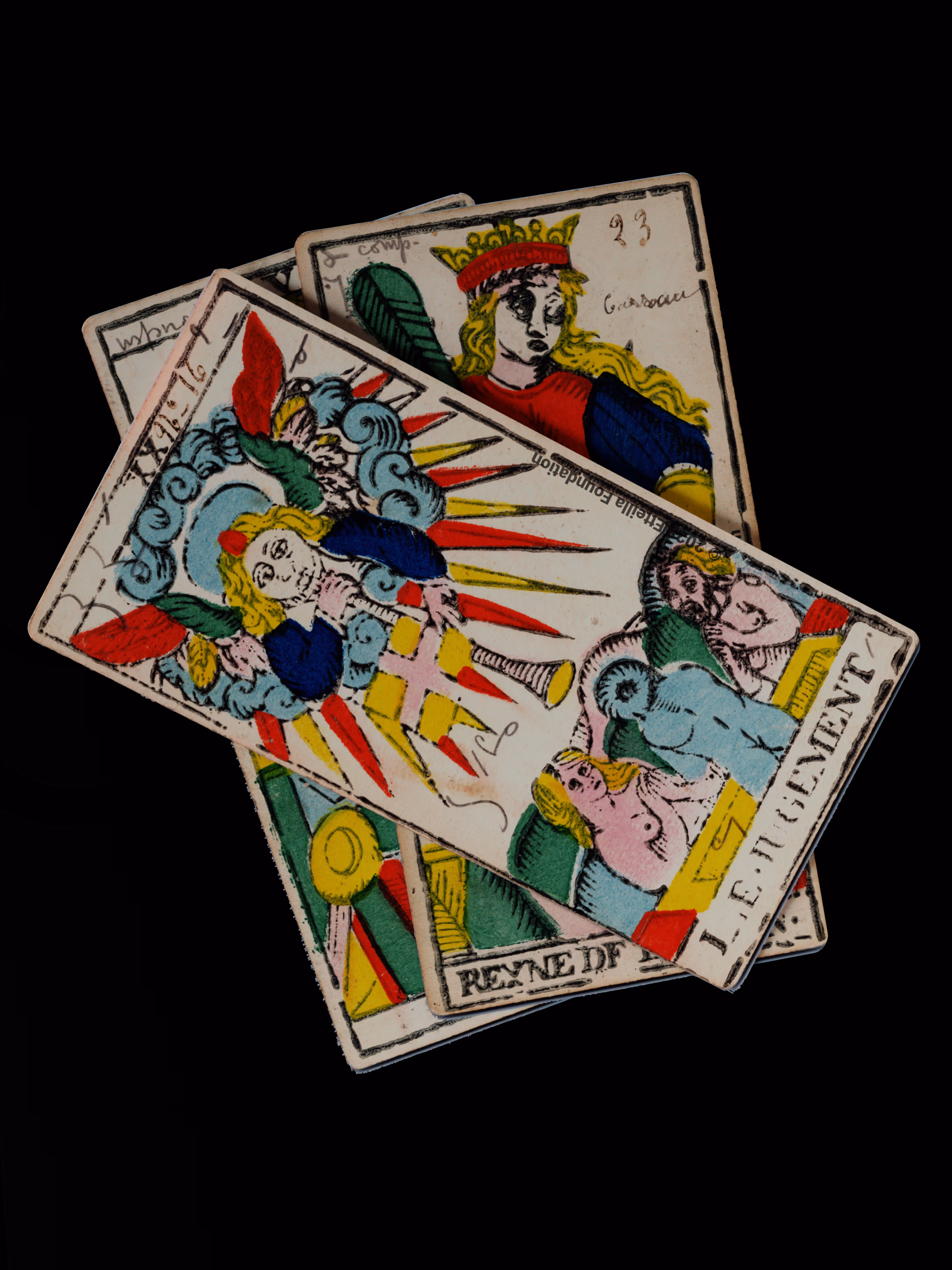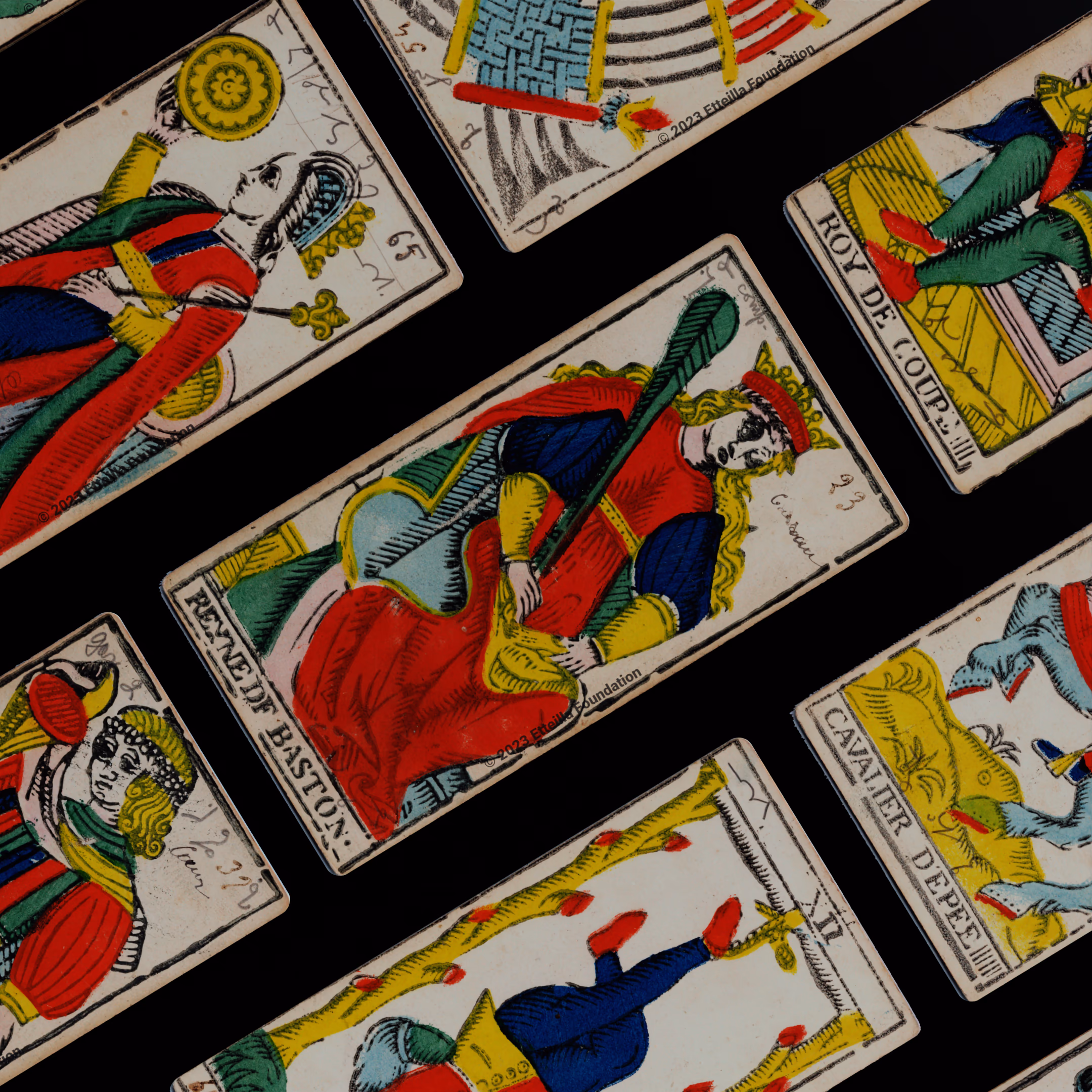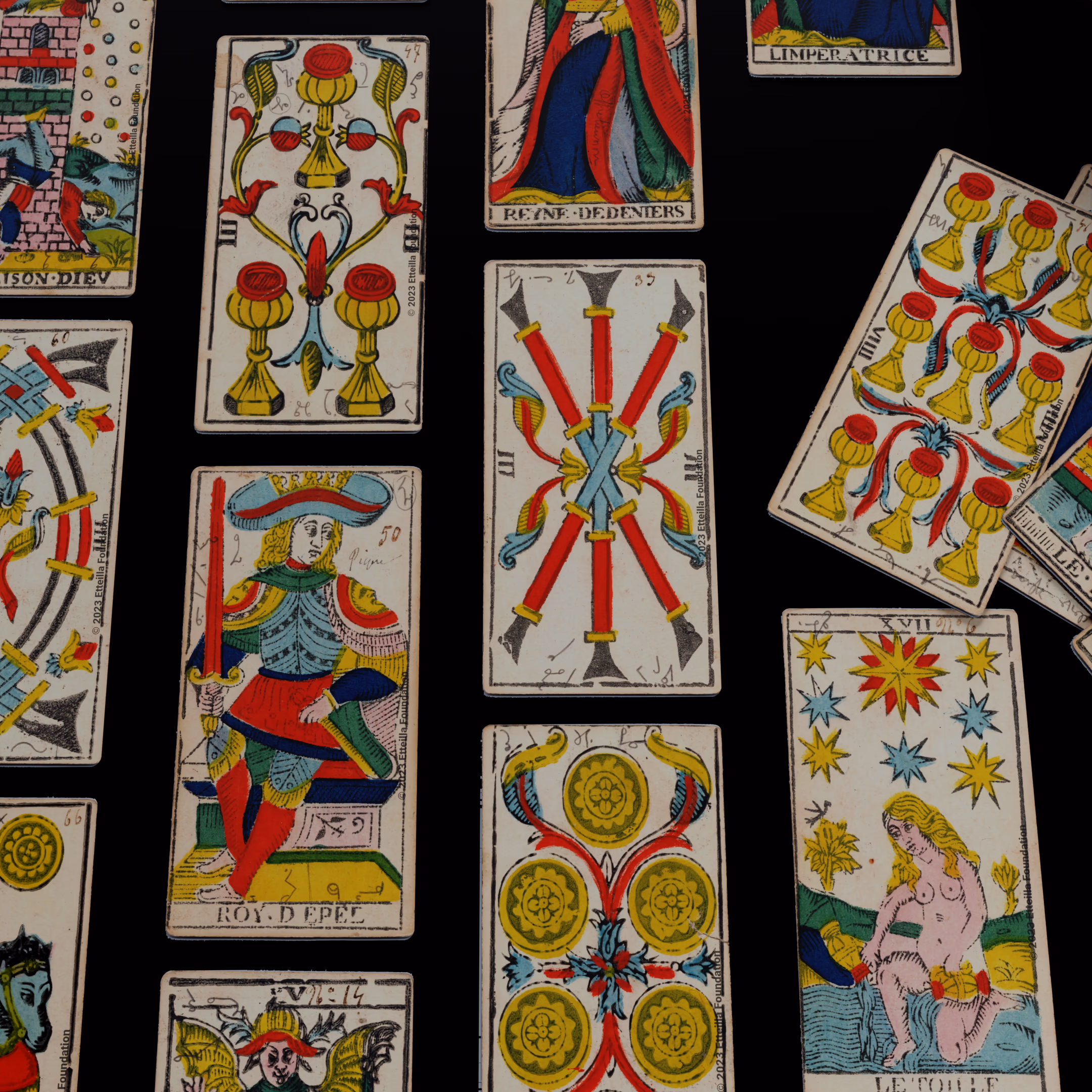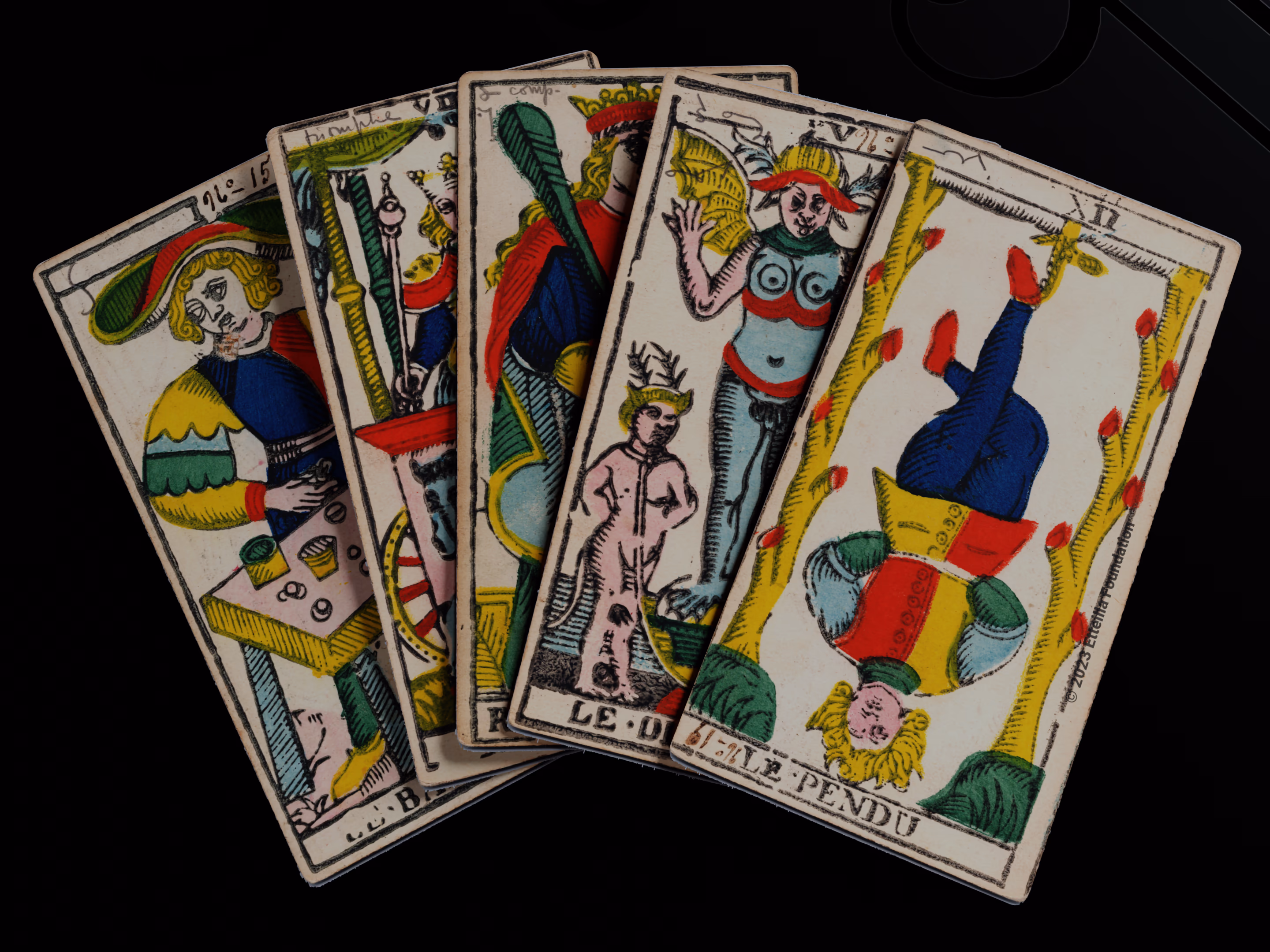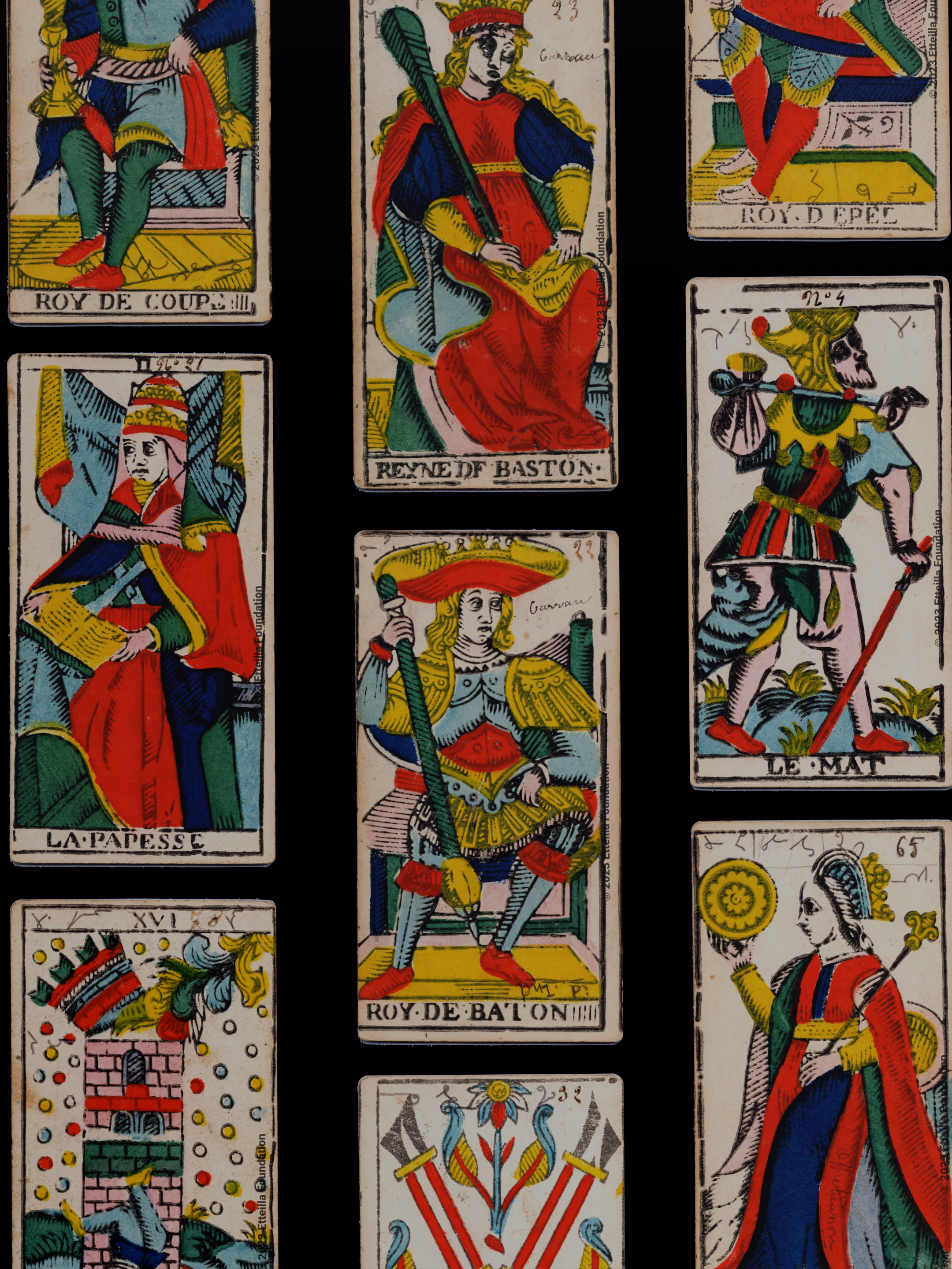 Divination Tarot de Marseille created by Nicolas Conver printed by A. Camoin & Cie in France circa 1760. Conver decks are the most renowed Tarot de Marseille and considered the canonical design. The Tarot de Marseille were the one that led to the use of Tarot for occult practices.
