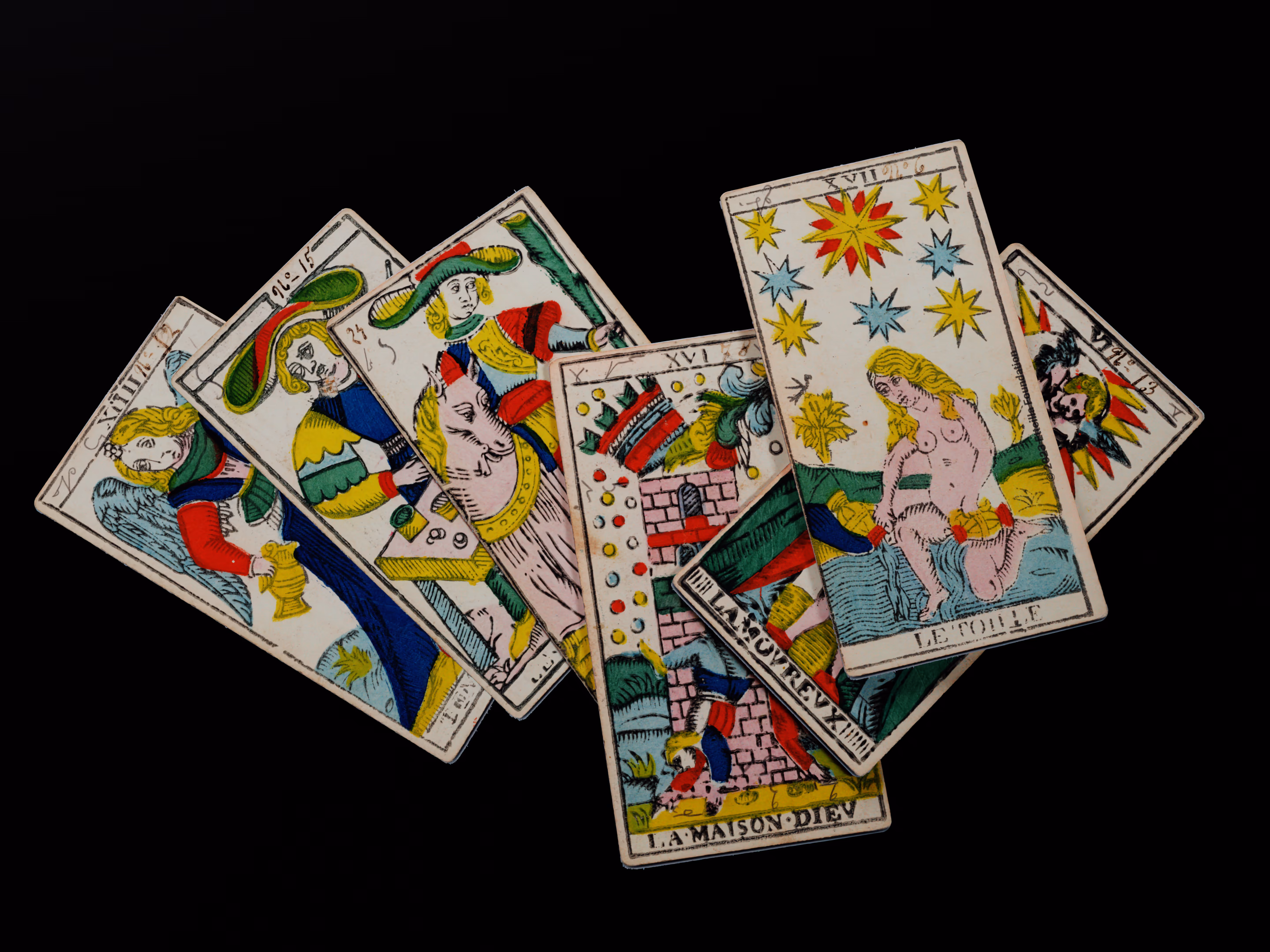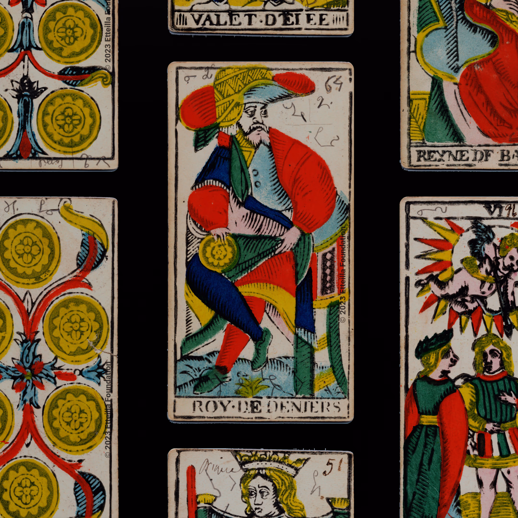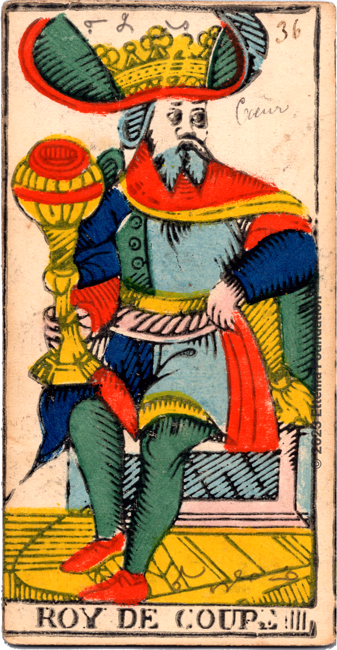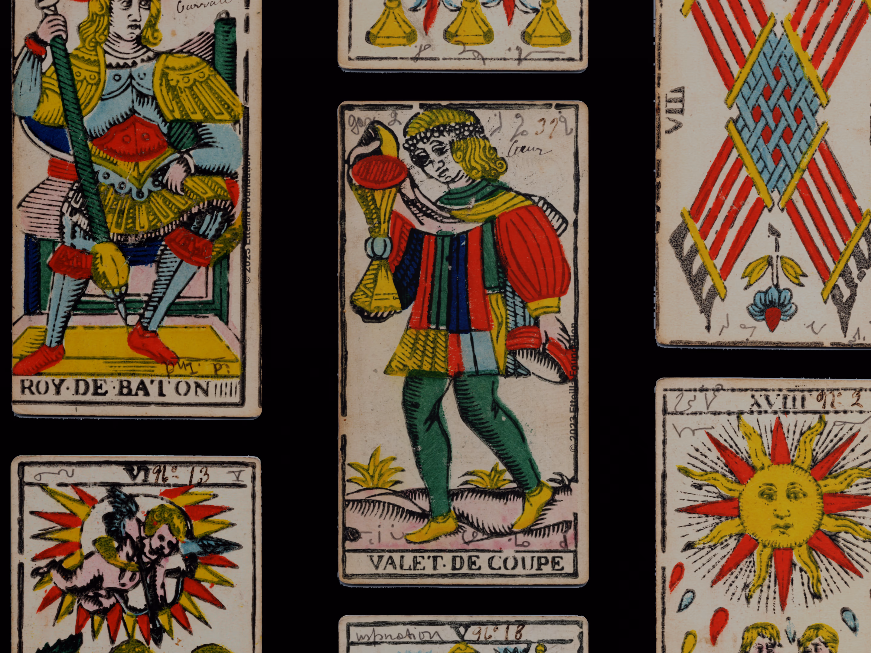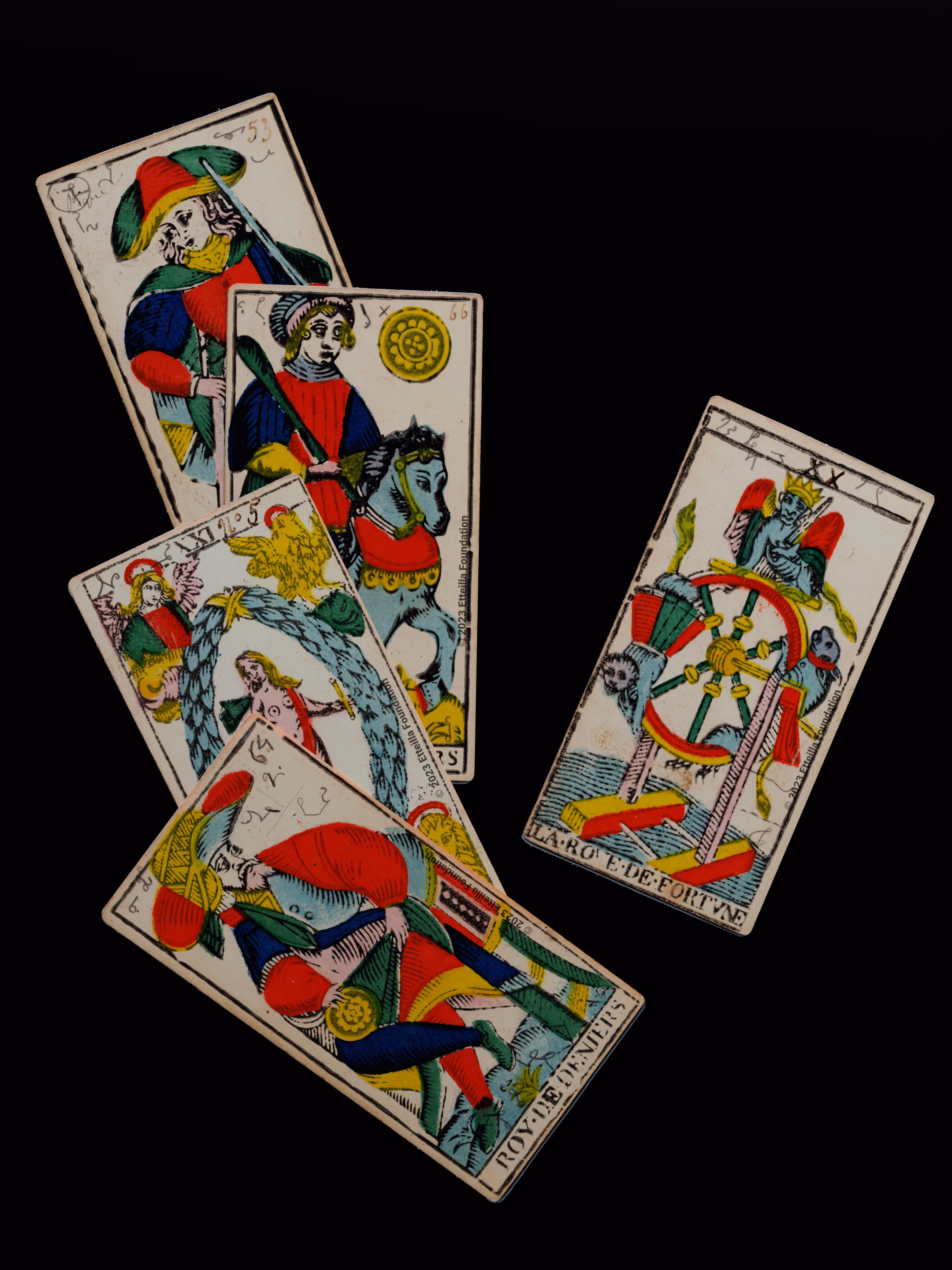 Divination Tarot de Marseille created by Nicolas Conver printed by A. Camoin & Cie in France circa 1760. Conver decks are the most renowed Tarot de Marseille and considered the canonical design. The Tarot de Marseille were the one that led to the use of Tarot for occult practices.