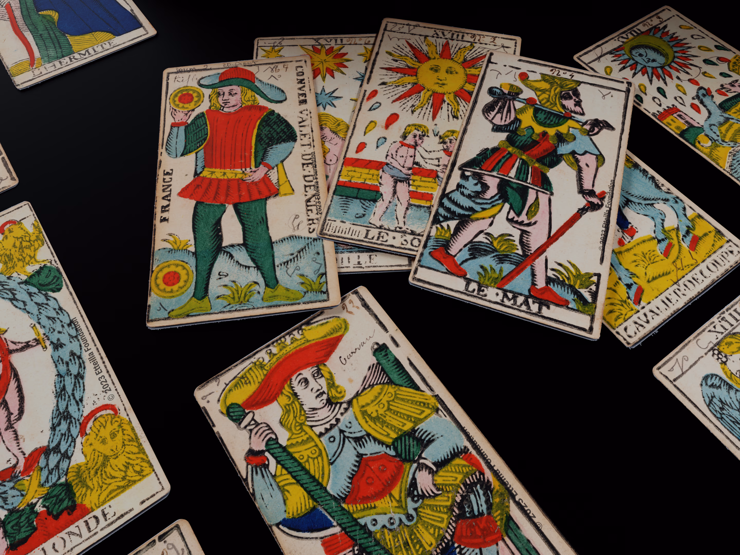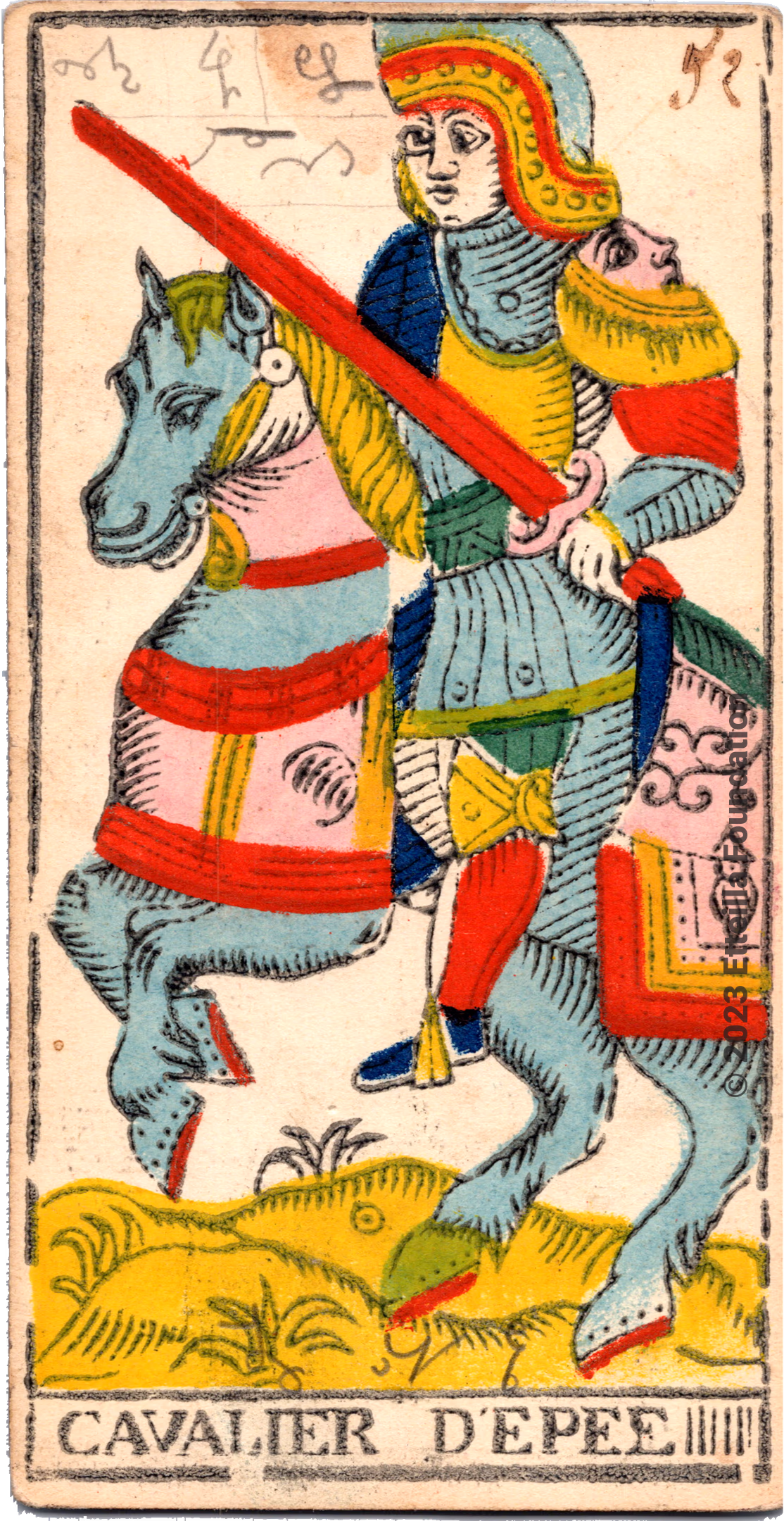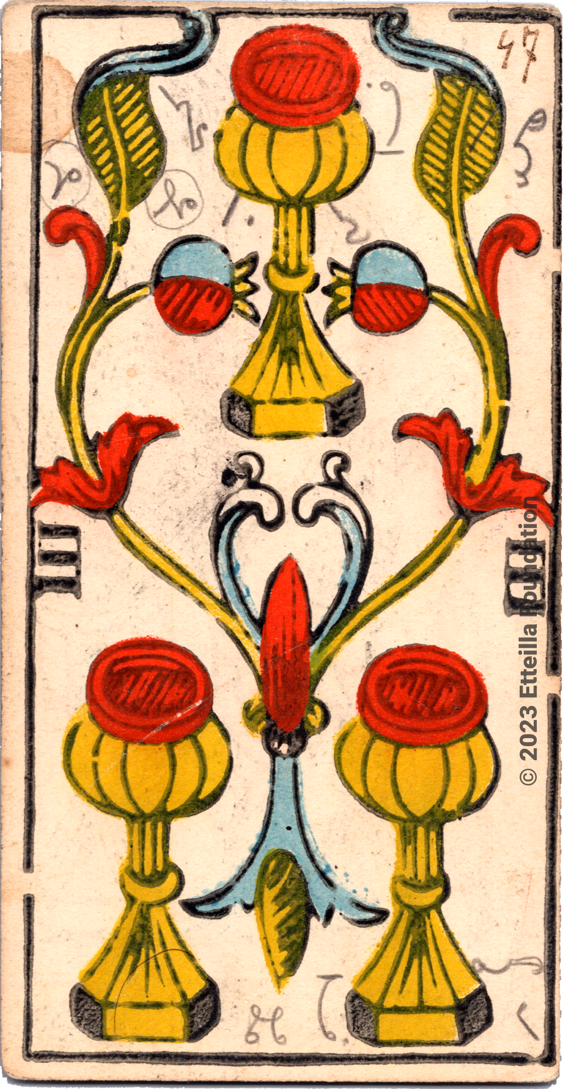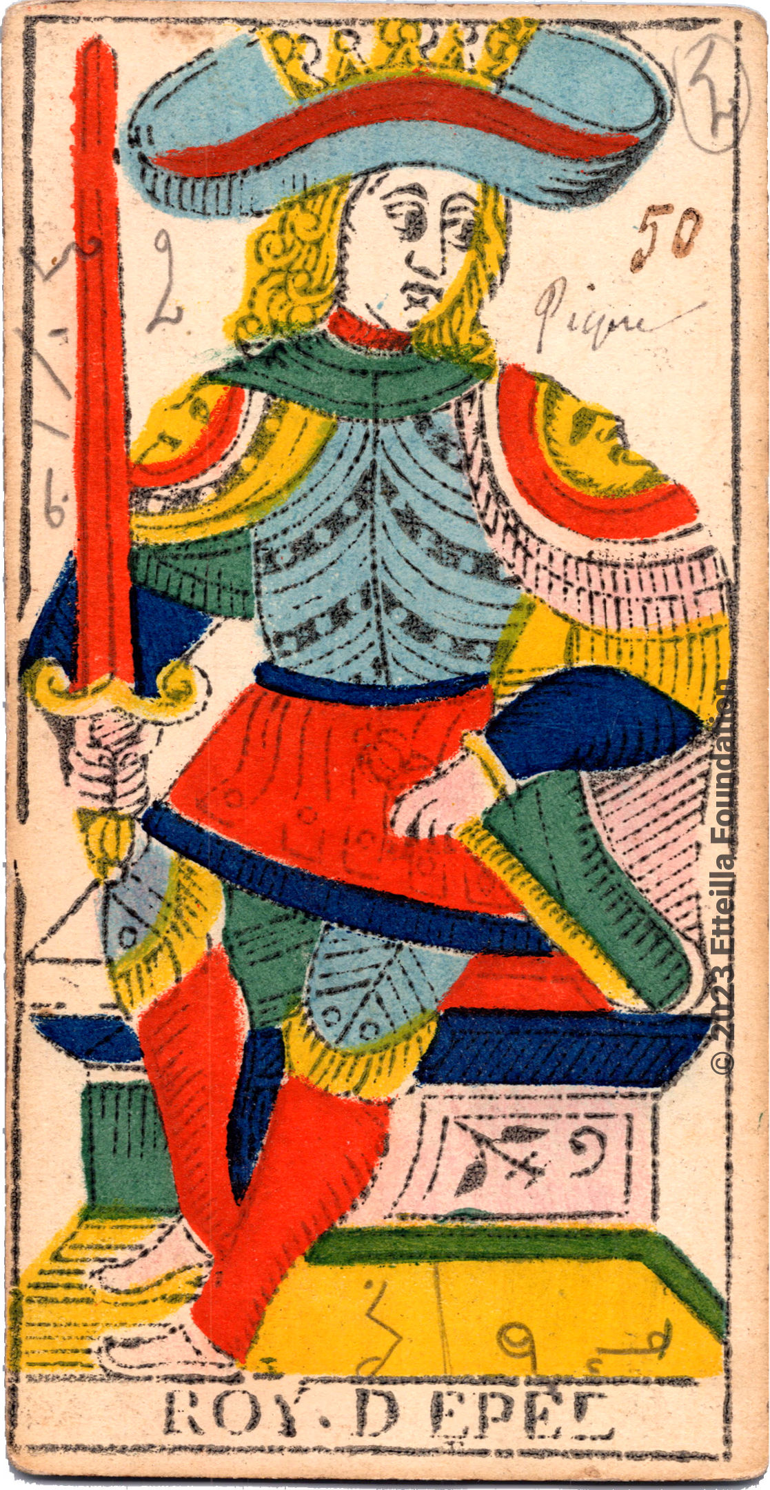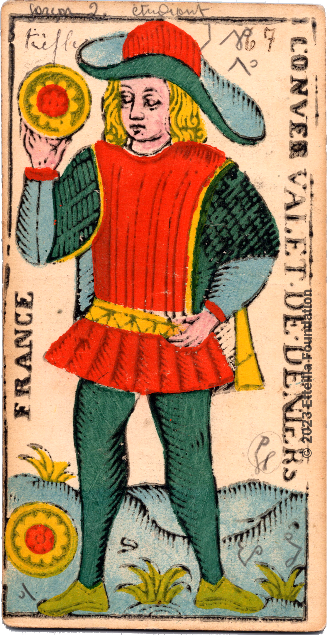 Divination Tarot de Marseille created by Nicolas Conver printed by A. Camoin & Cie in France circa 1760. Conver decks are the most renowed Tarot de Marseille and considered the canonical design. The Tarot de Marseille were the one that led to the use of Tarot for occult practices.