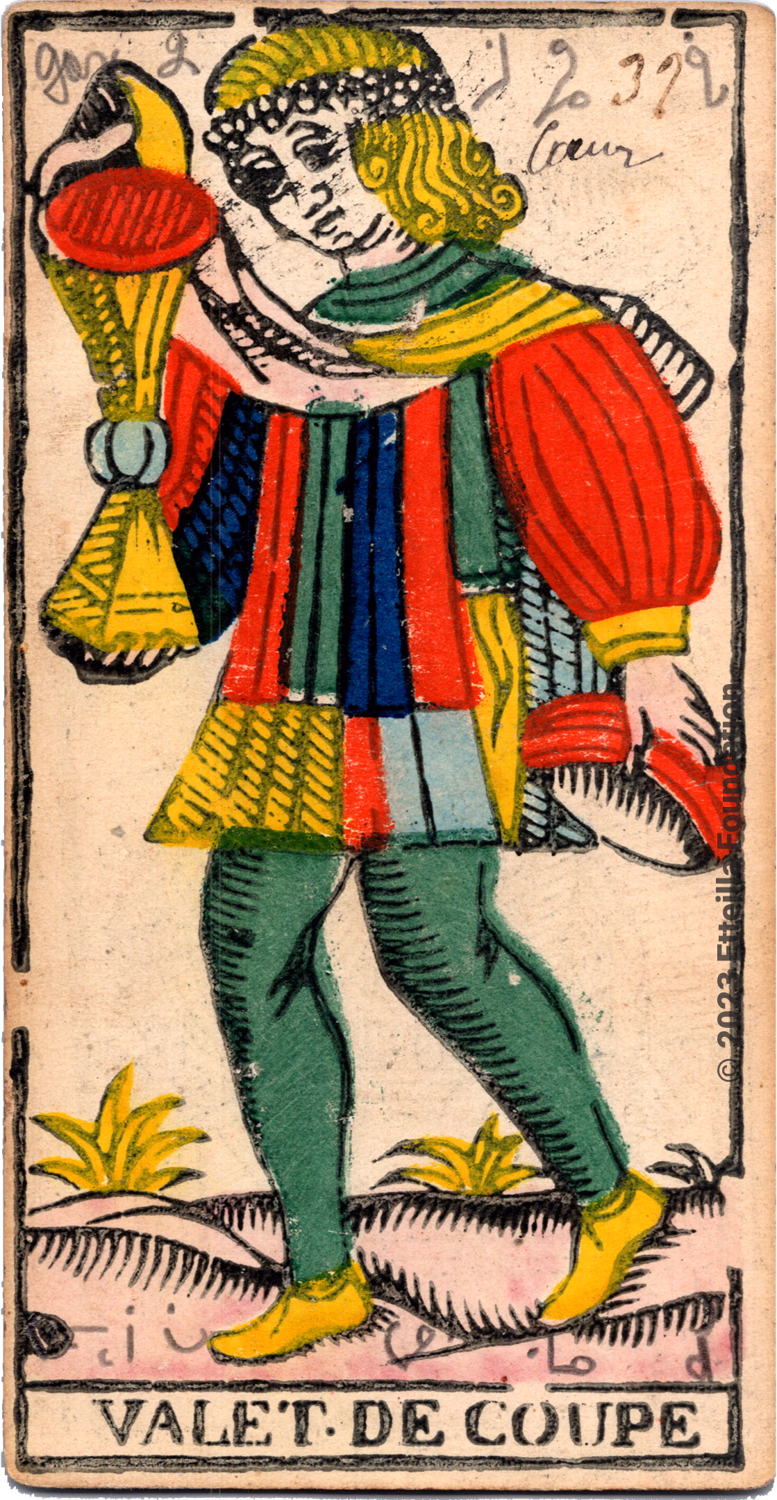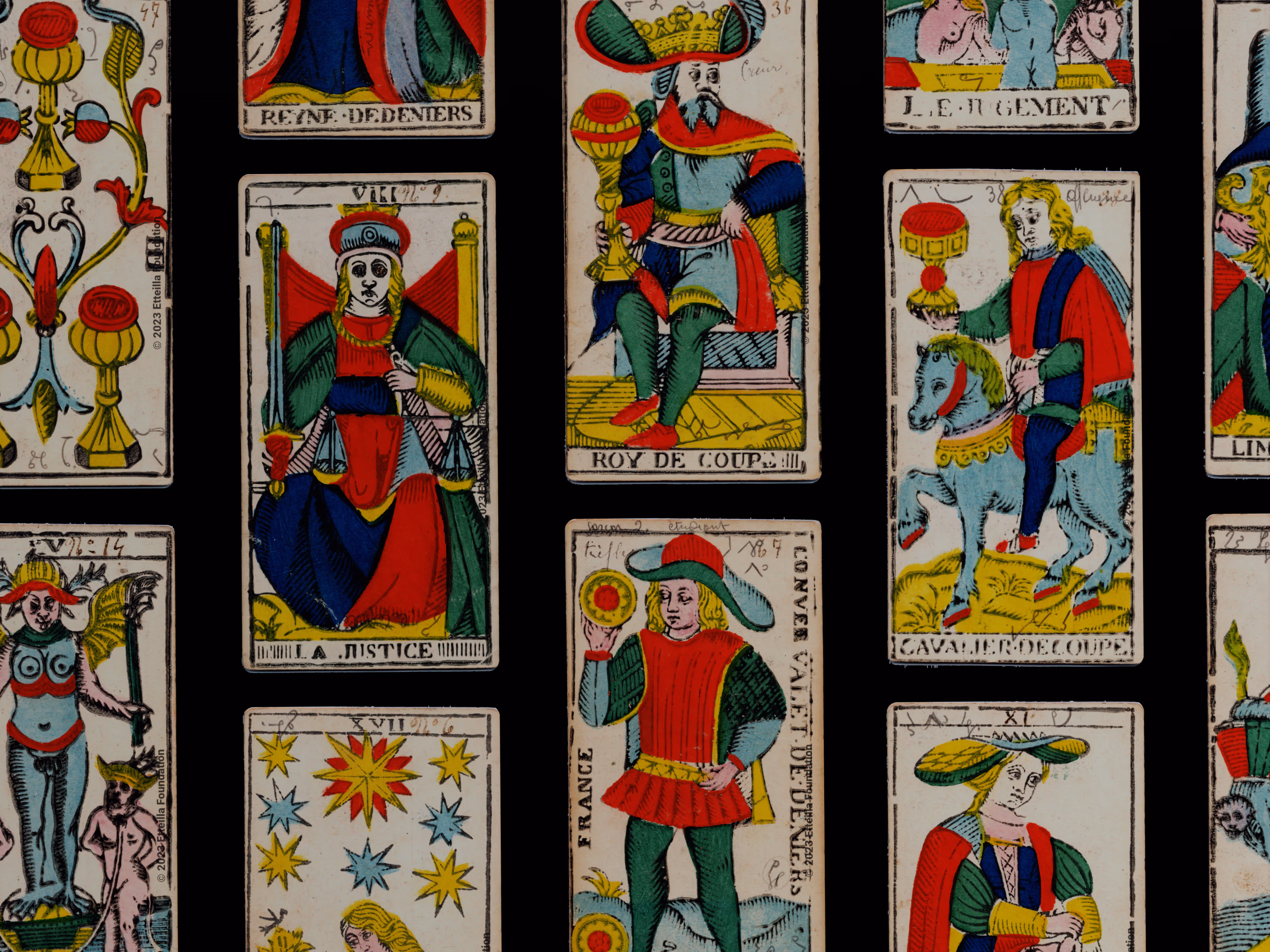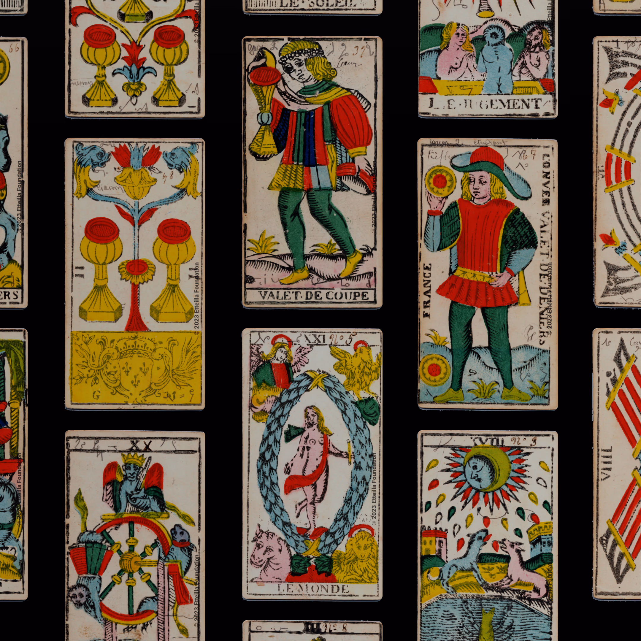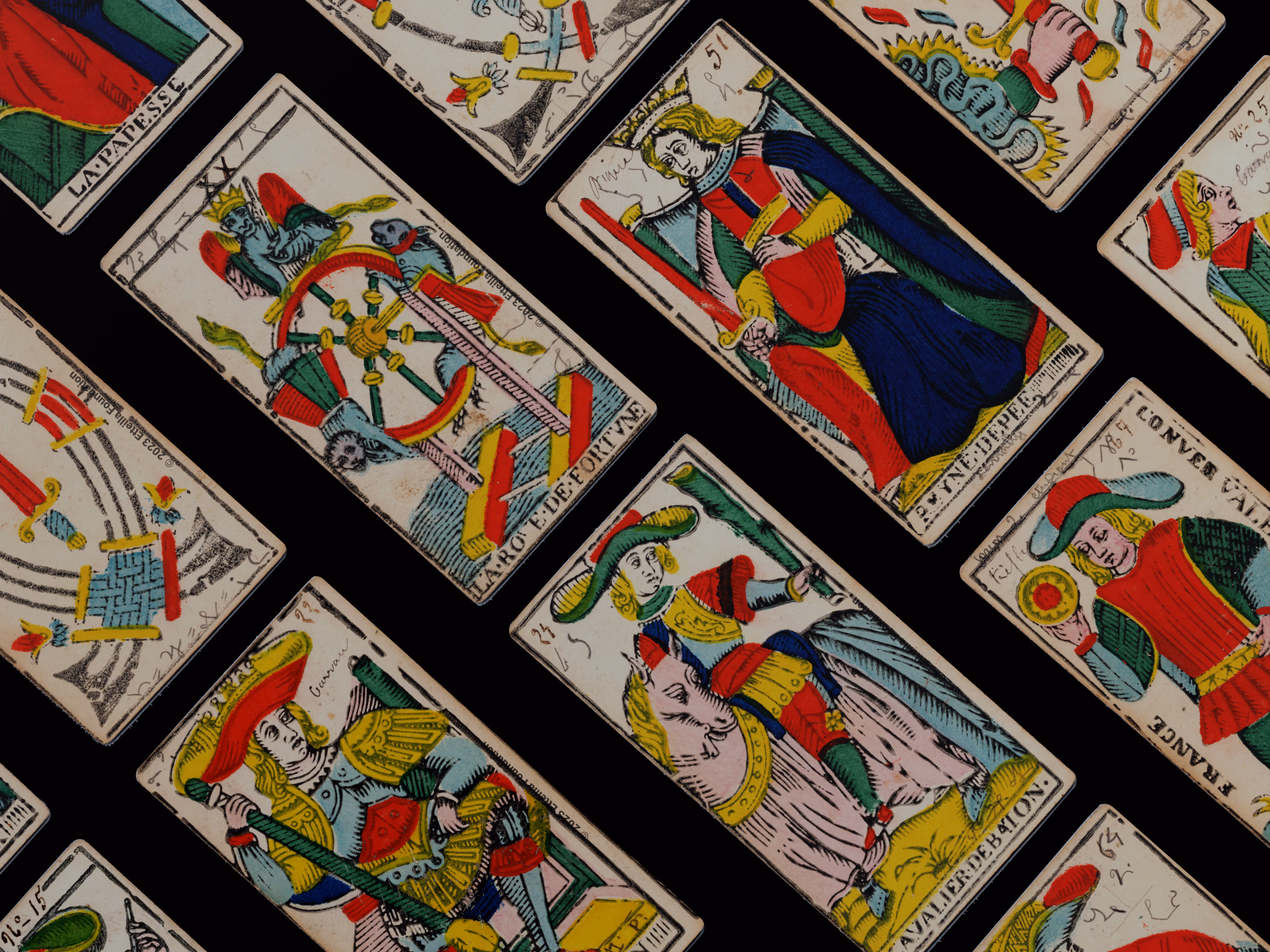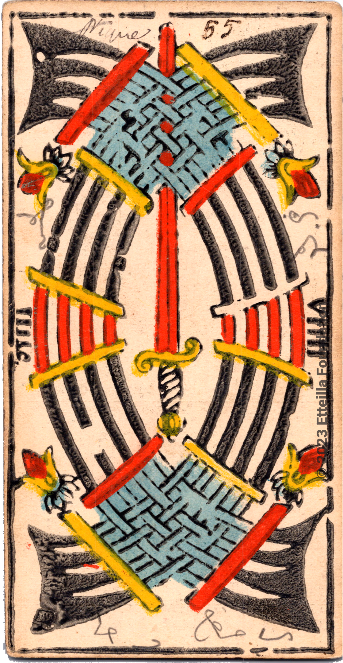 Divination Tarot de Marseille created by Nicolas Conver printed by A. Camoin & Cie in France circa 1760. Conver decks are the most renowed Tarot de Marseille and considered the canonical design. The Tarot de Marseille were the one that led to the use of Tarot for occult practices.