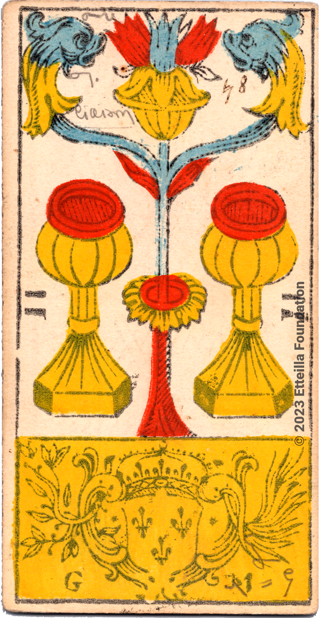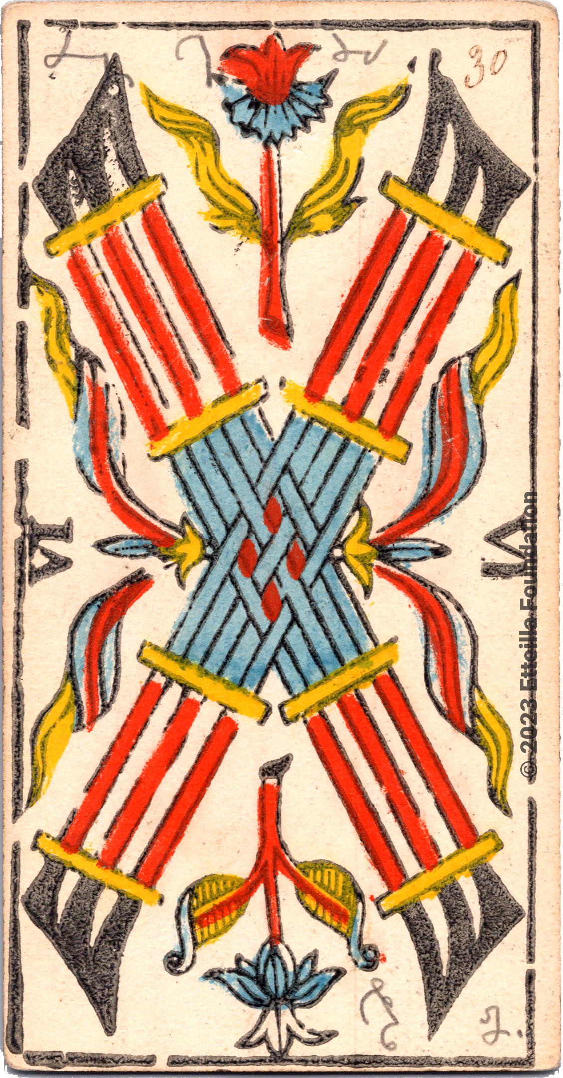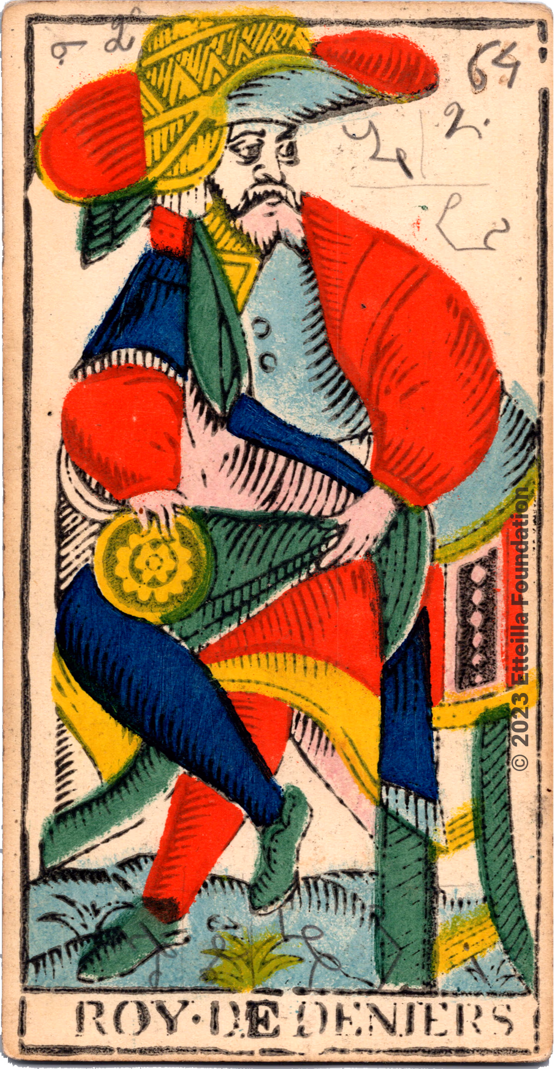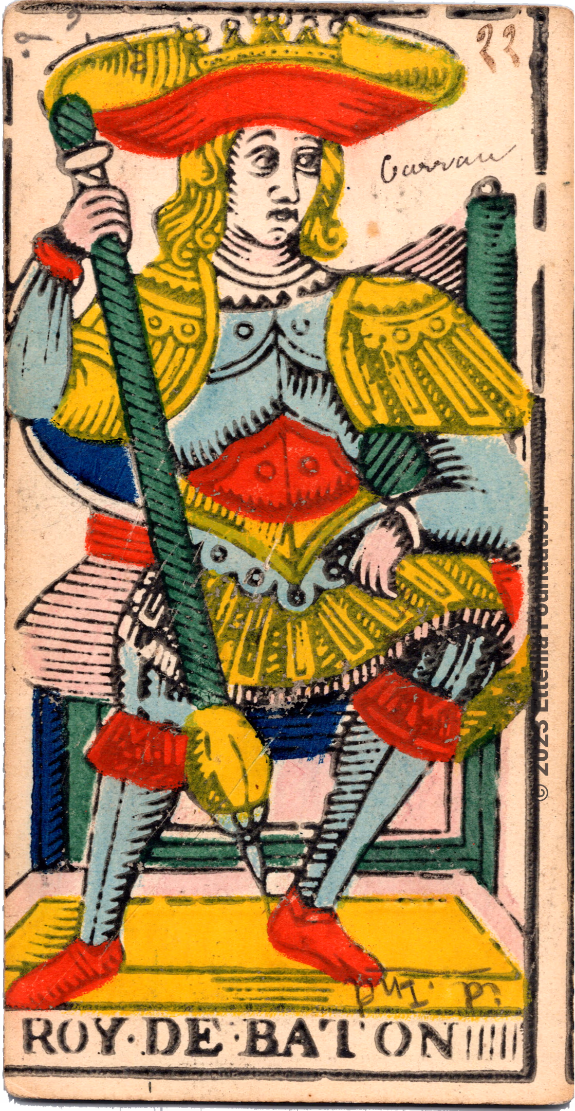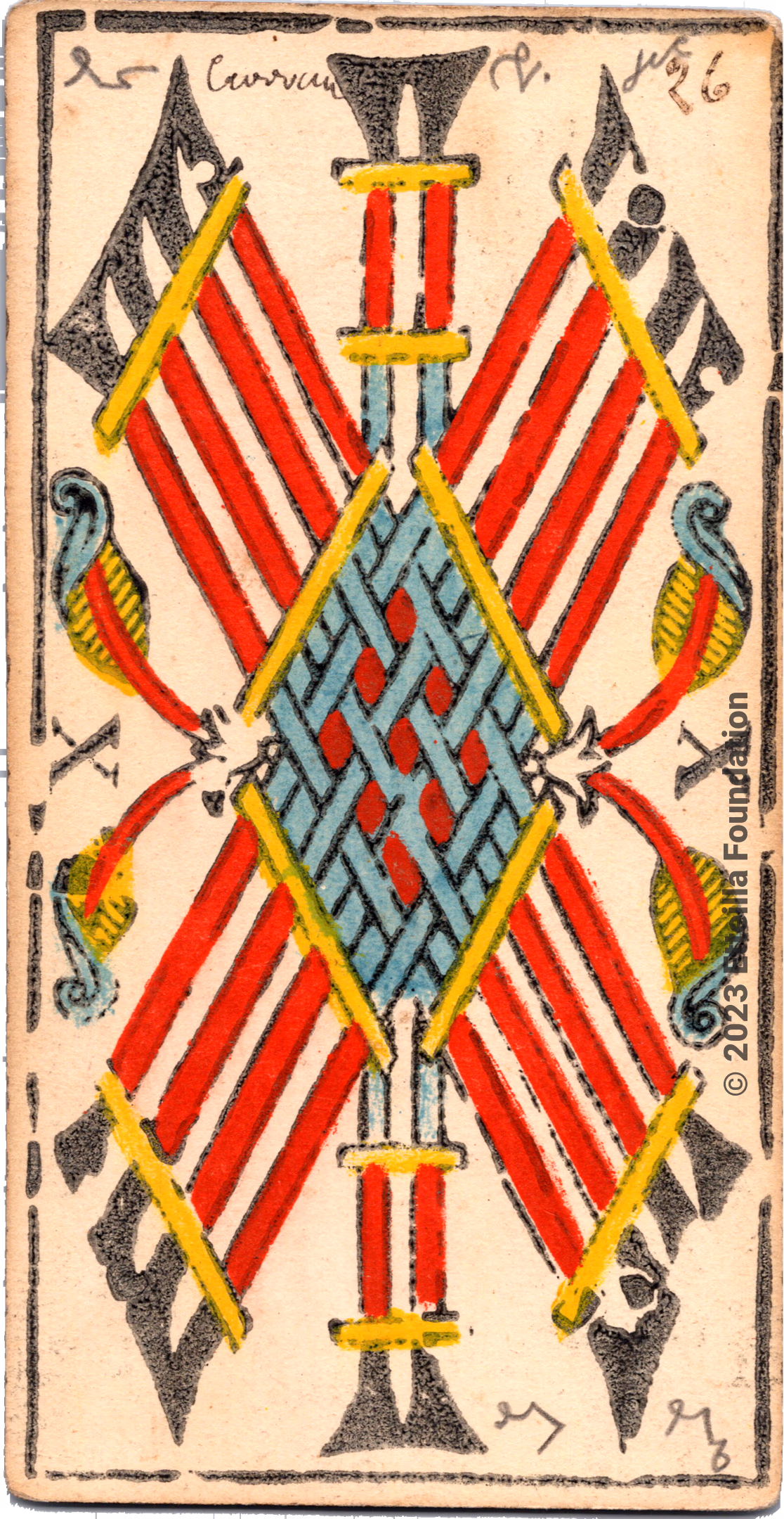 Divination Tarot de Marseille created by Nicolas Conver printed by A. Camoin & Cie in France circa 1760. Conver decks are the most renowed Tarot de Marseille and considered the canonical design. The Tarot de Marseille were the one that led to the use of Tarot for occult practices.