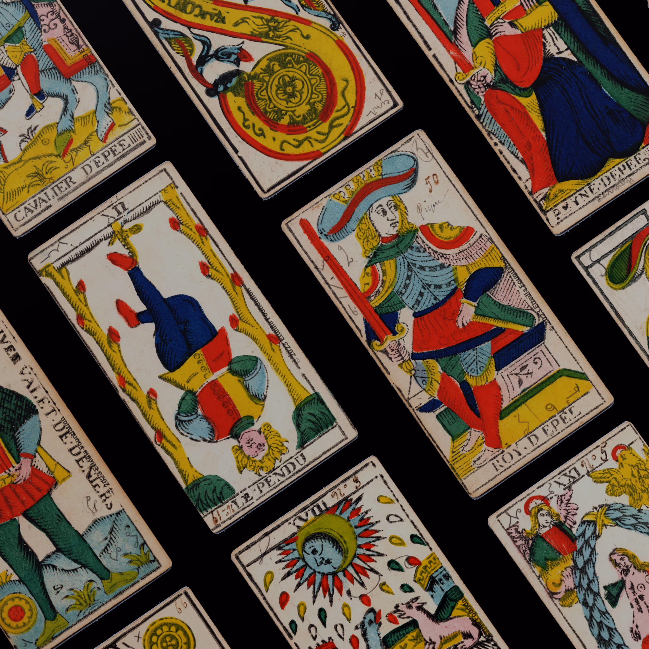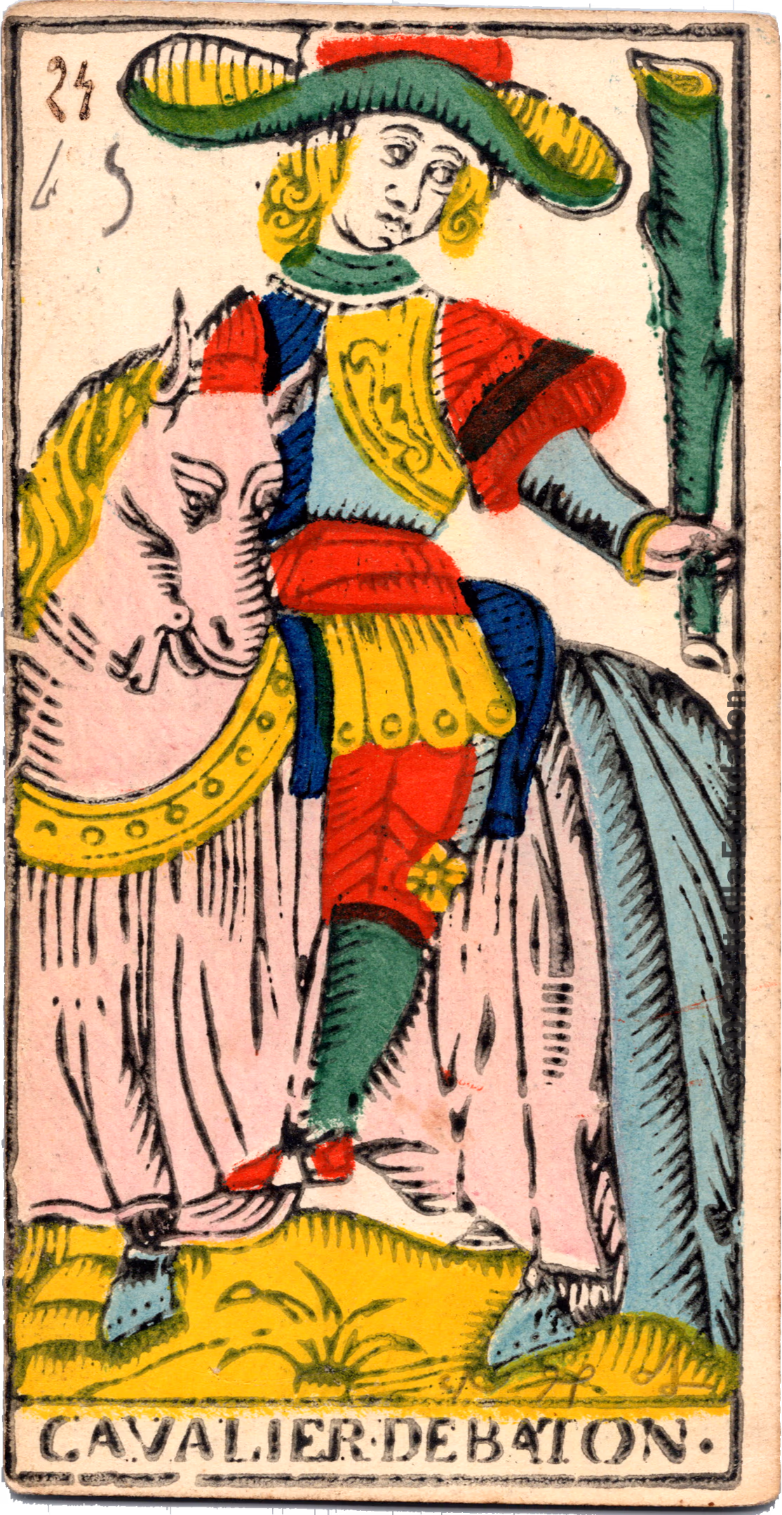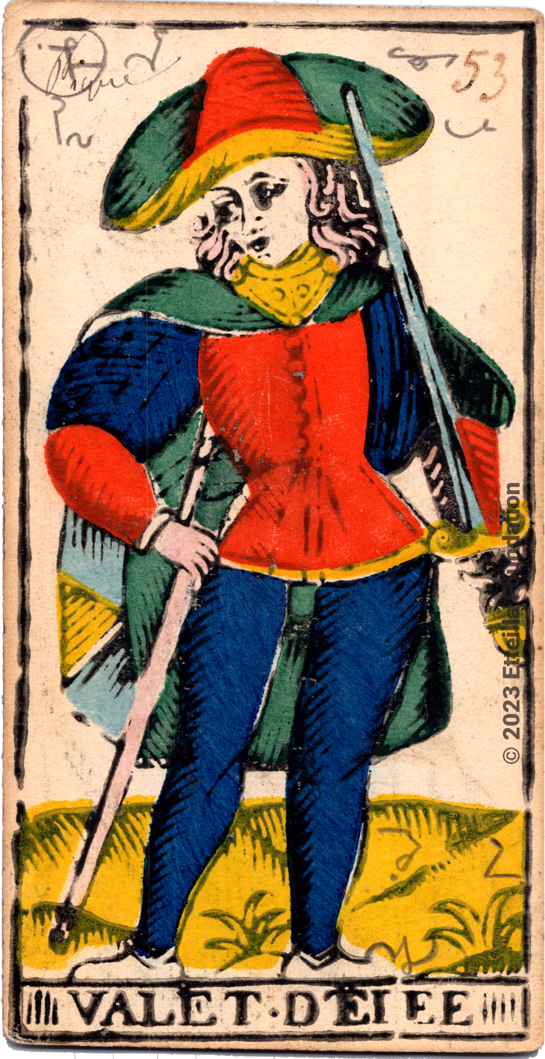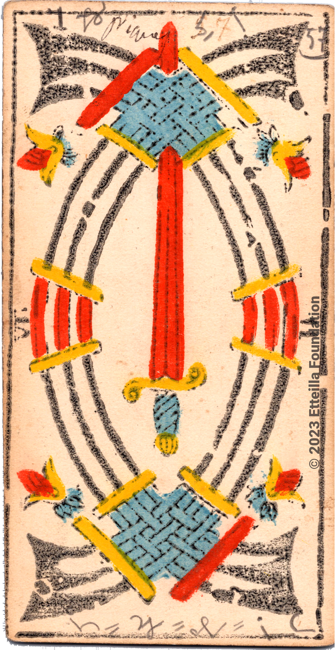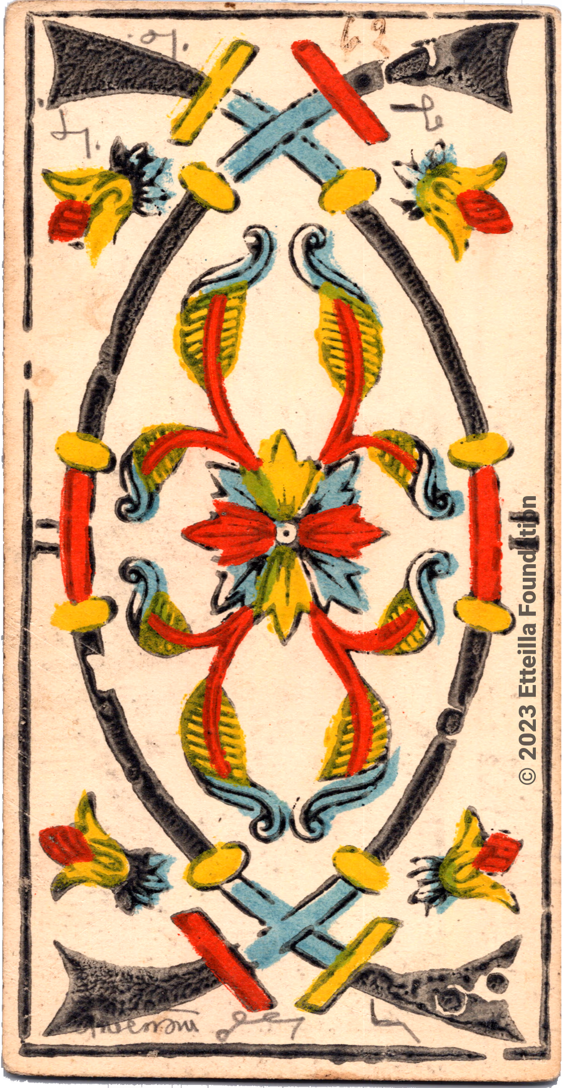Divination Tarot de Marseille created by Nicolas Conver printed by A. Camoin & Cie in France circa 1760. Conver decks are the most renowed Tarot de Marseille and considered the canonical design. The Tarot de Marseille were the one that led to the use of Tarot for occult practices.