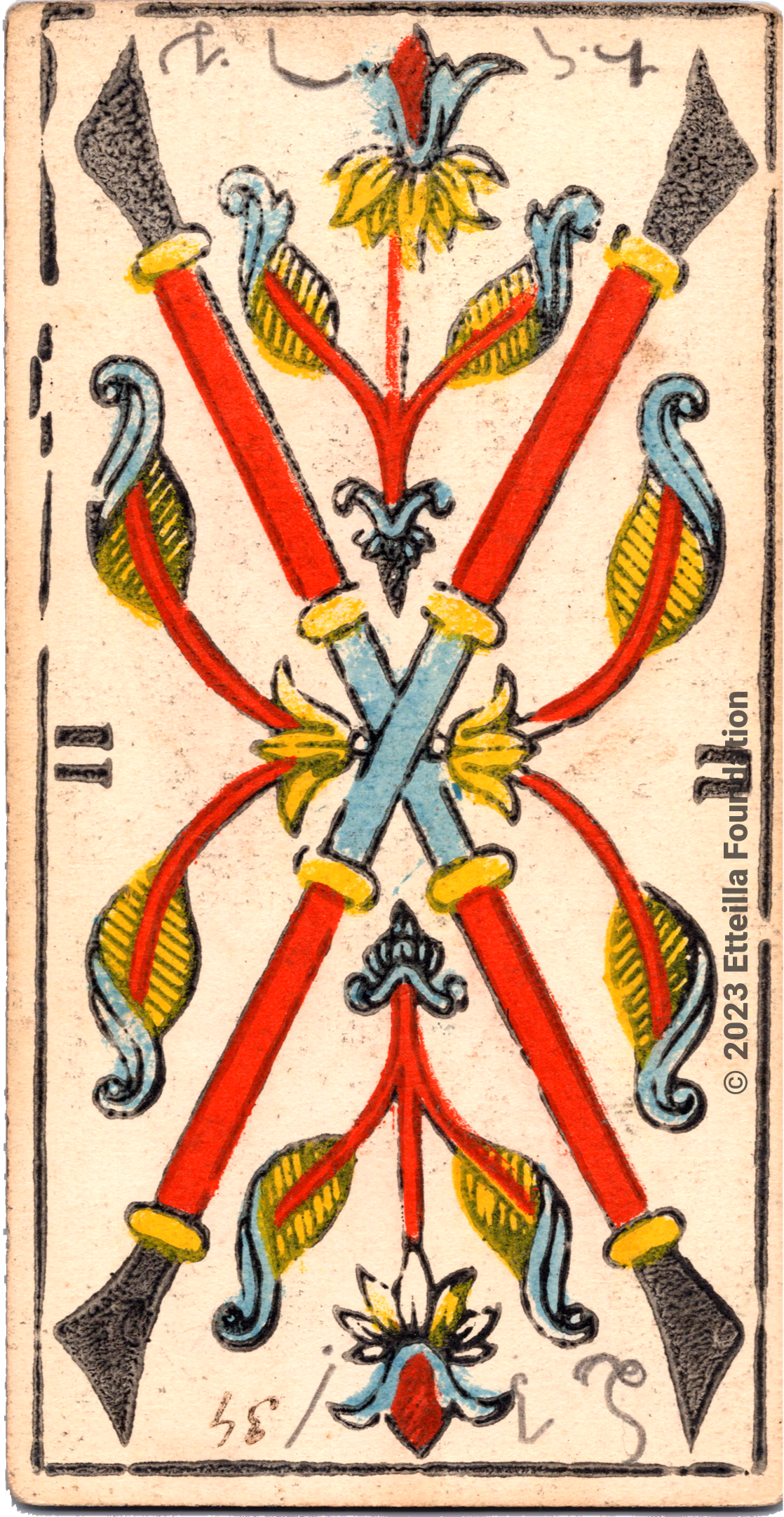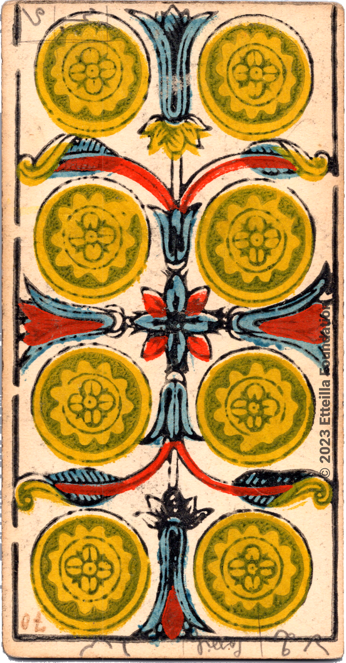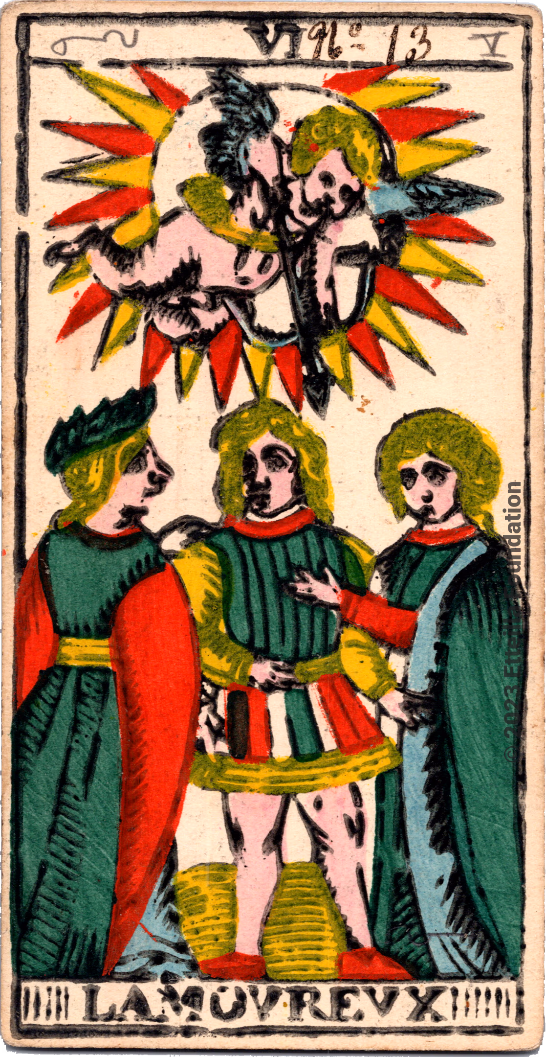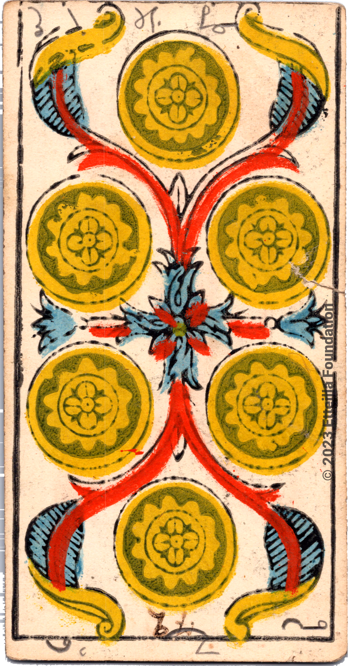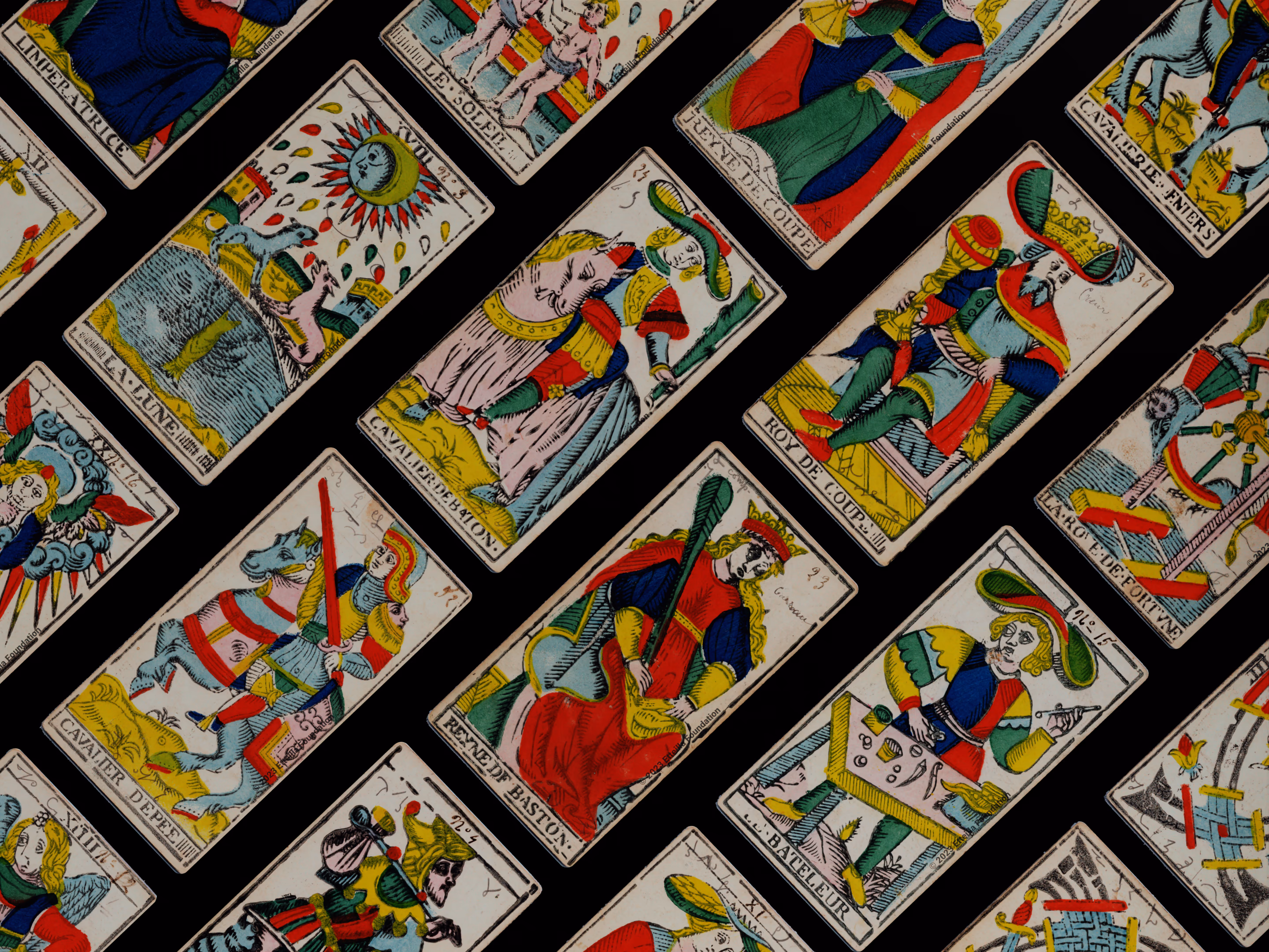 Divination Tarot de Marseille created by Nicolas Conver printed by A. Camoin & Cie in France circa 1760. Conver decks are the most renowed Tarot de Marseille and considered the canonical design. The Tarot de Marseille were the one that led to the use of Tarot for occult practices.