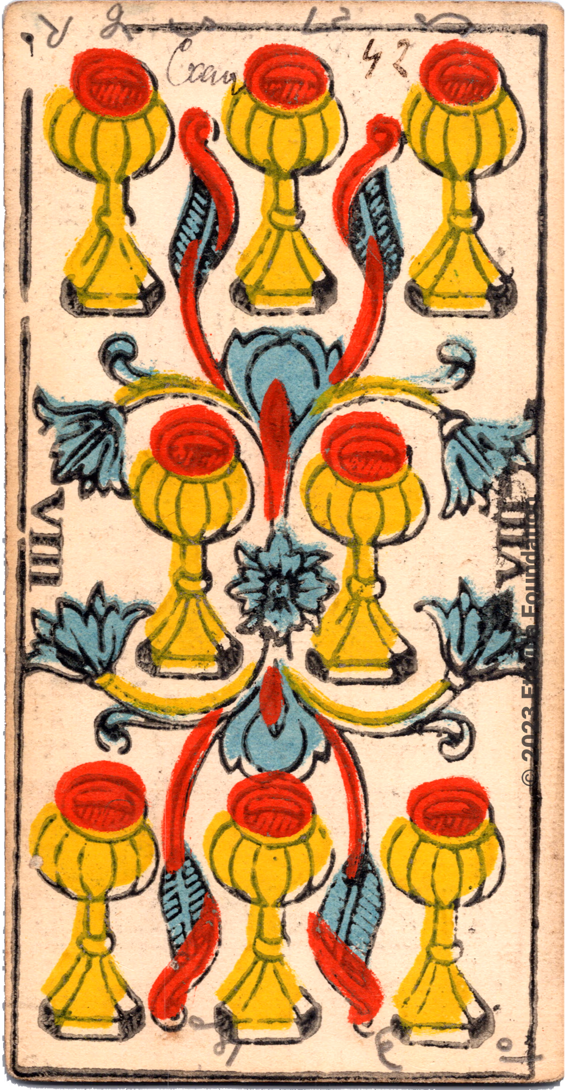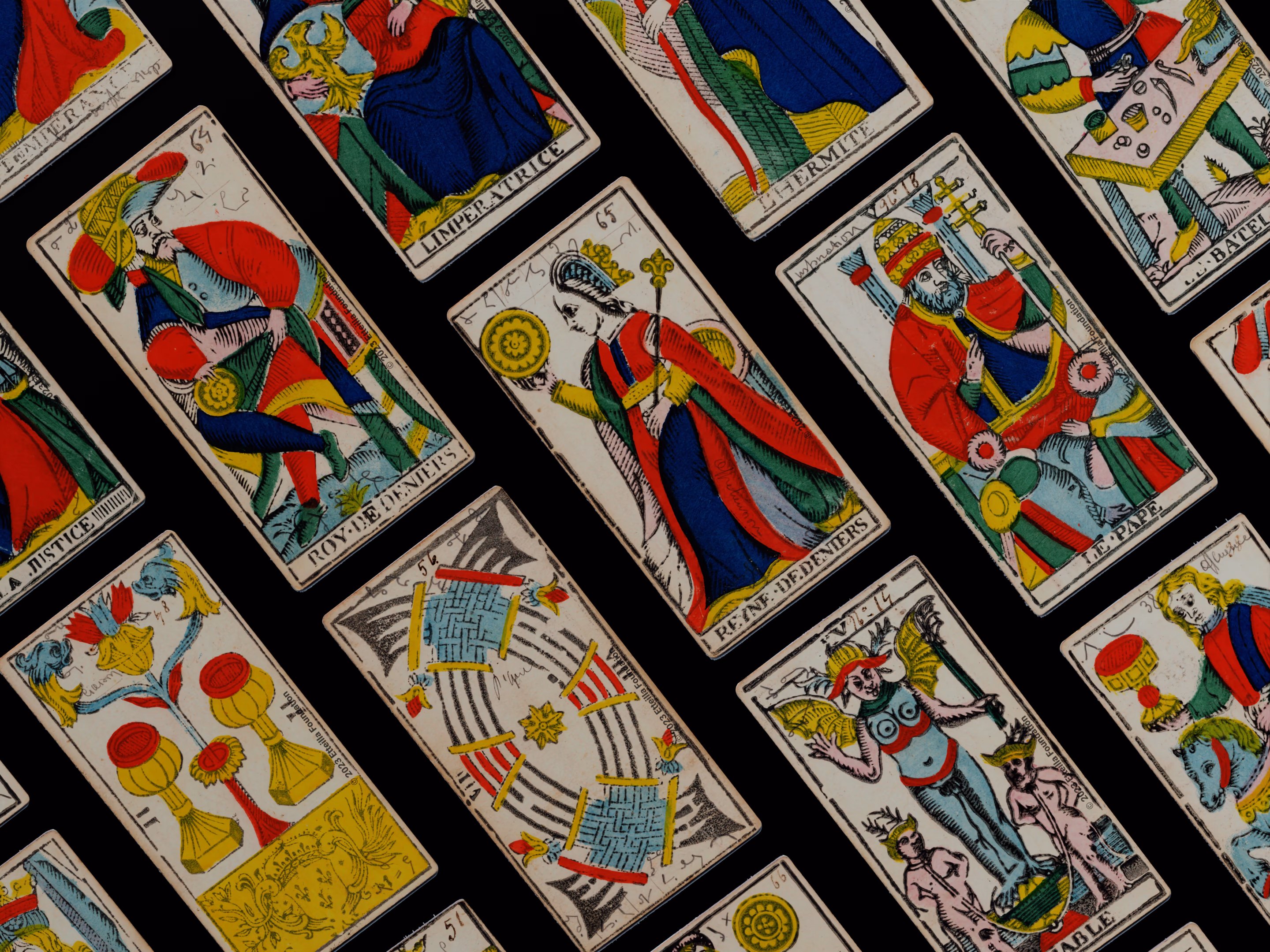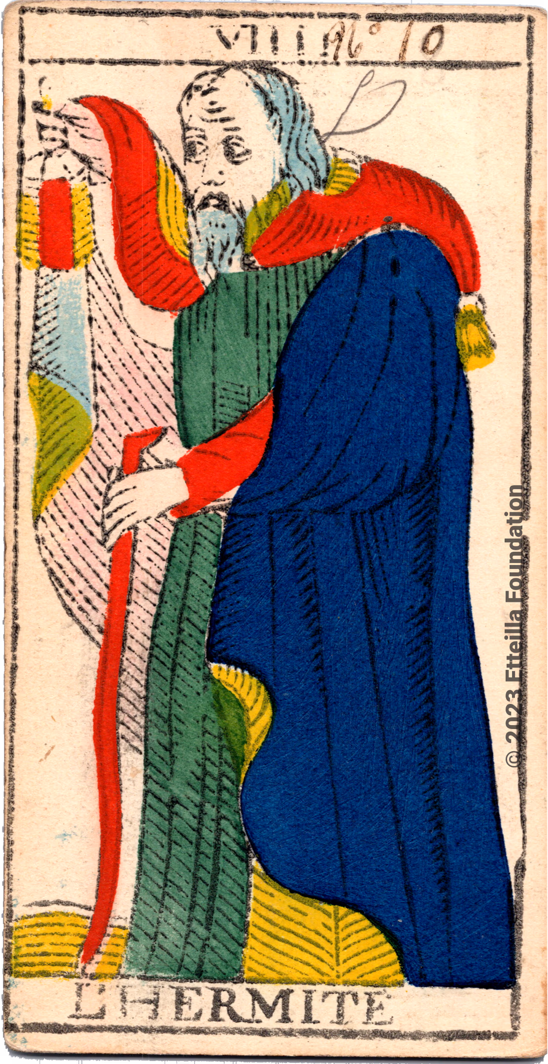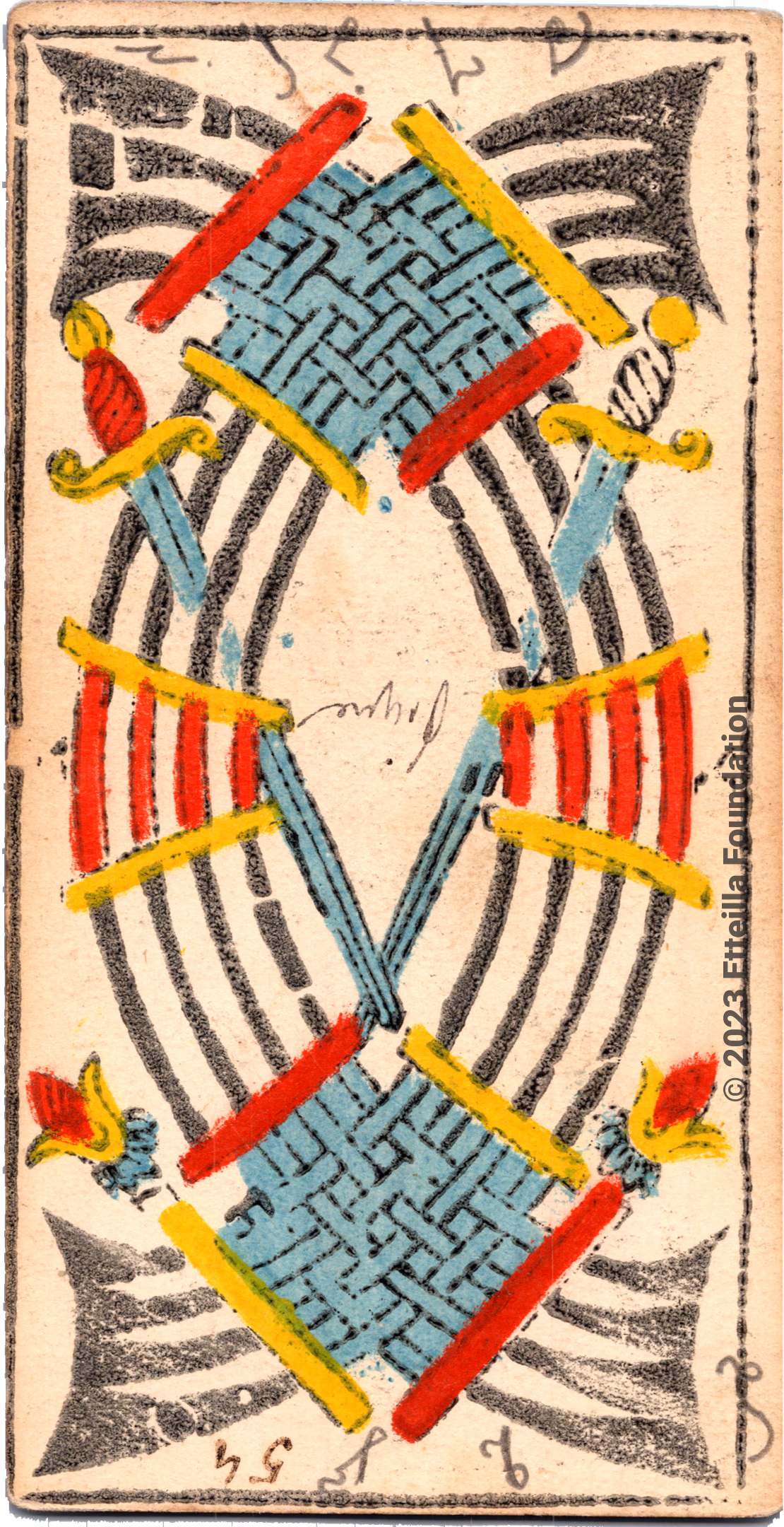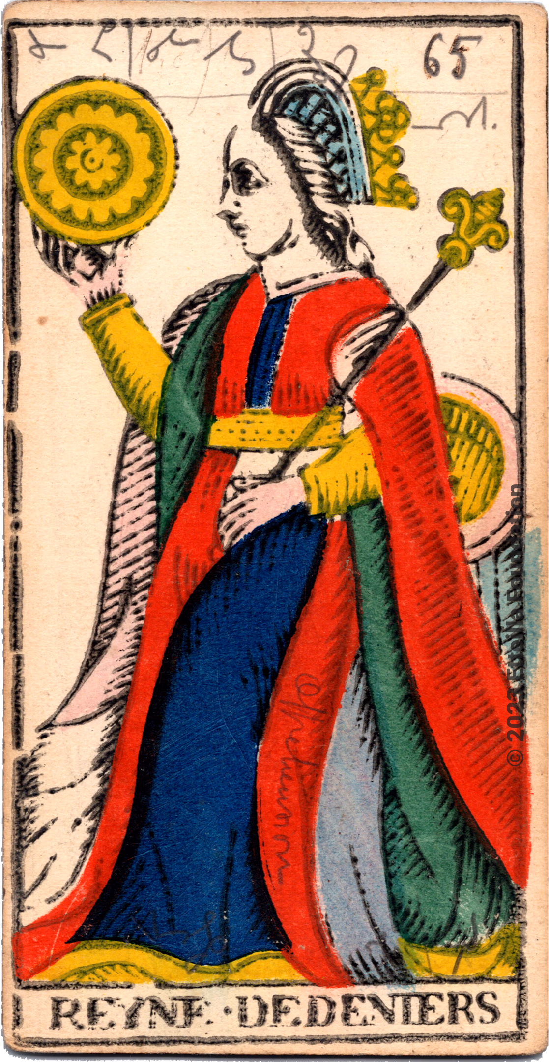 Divination Tarot de Marseille created by Nicolas Conver printed by A. Camoin & Cie in France circa 1760. Conver decks are the most renowed Tarot de Marseille and considered the canonical design. The Tarot de Marseille were the one that led to the use of Tarot for occult practices.