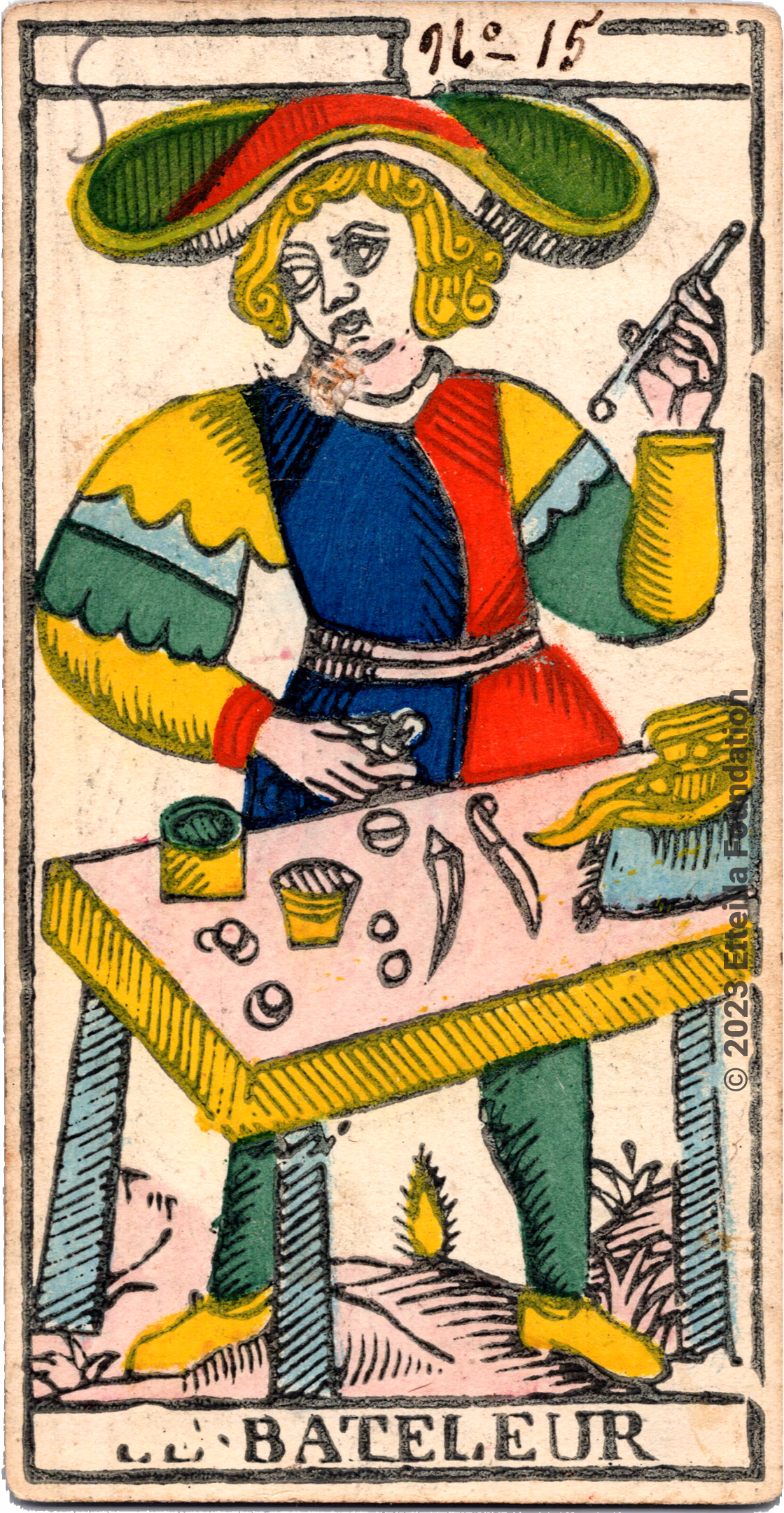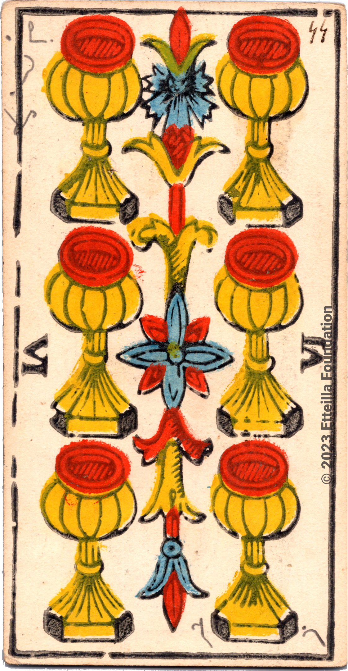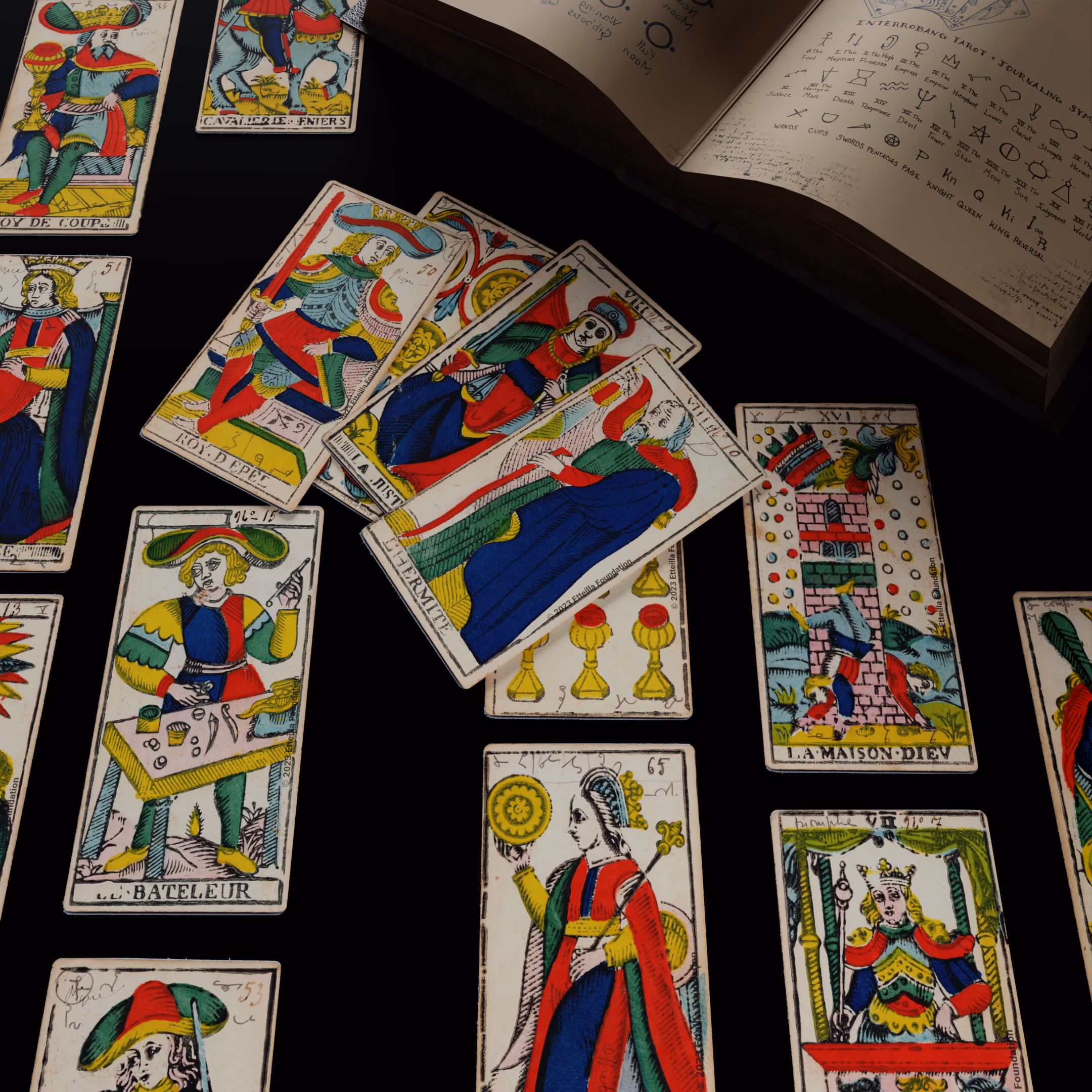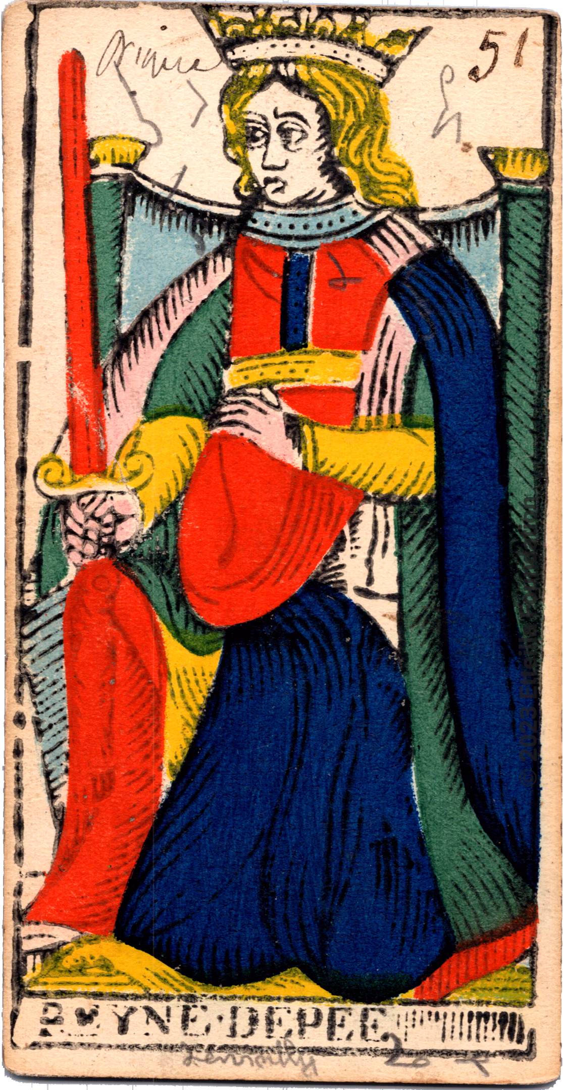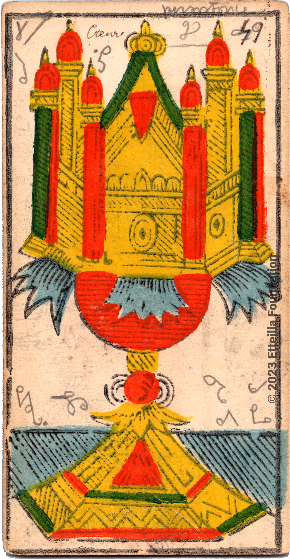 Divination Tarot de Marseille created by Nicolas Conver printed by A. Camoin & Cie in France circa 1760. Conver decks are the most renowed Tarot de Marseille and considered the canonical design. The Tarot de Marseille were the one that led to the use of Tarot for occult practices.