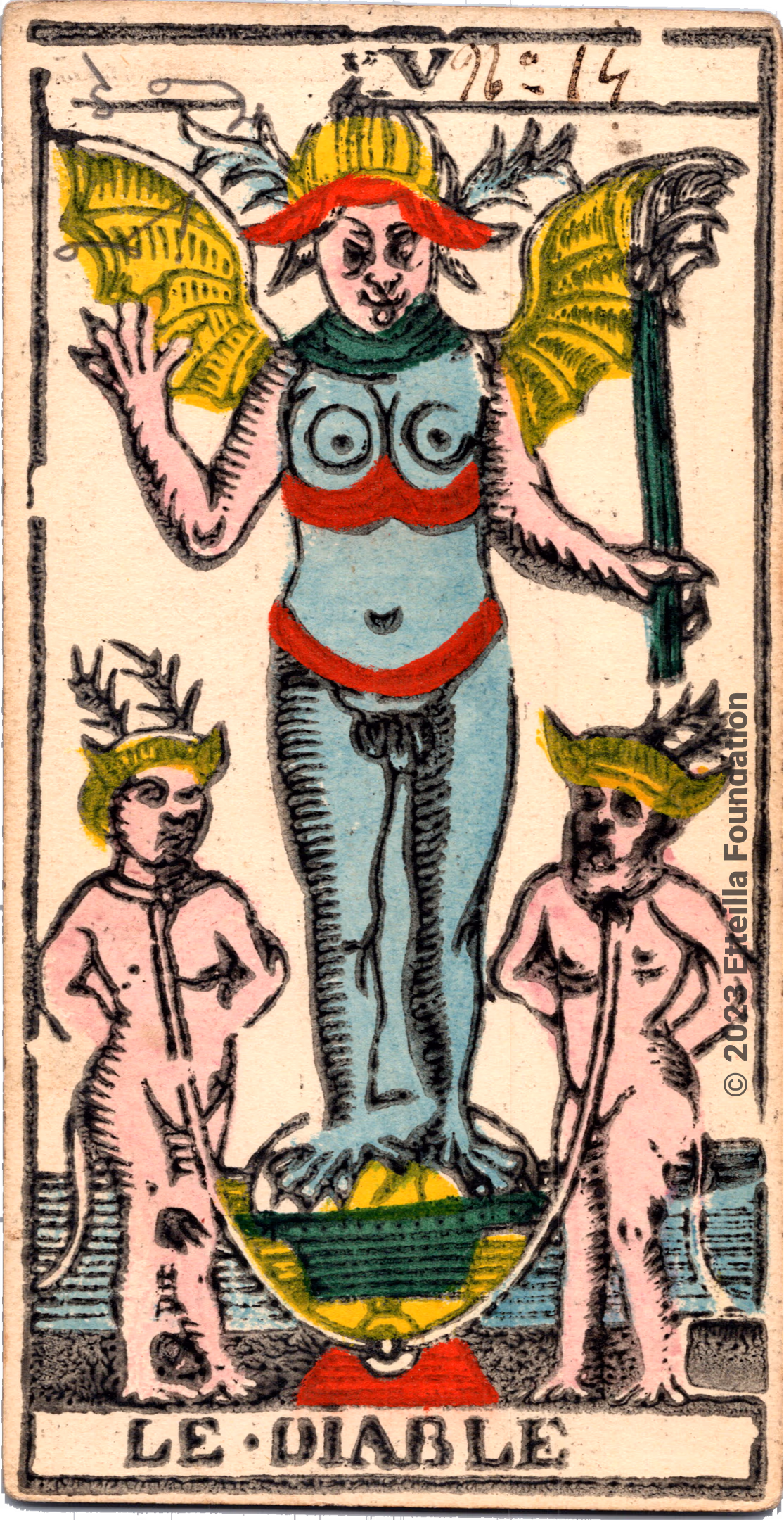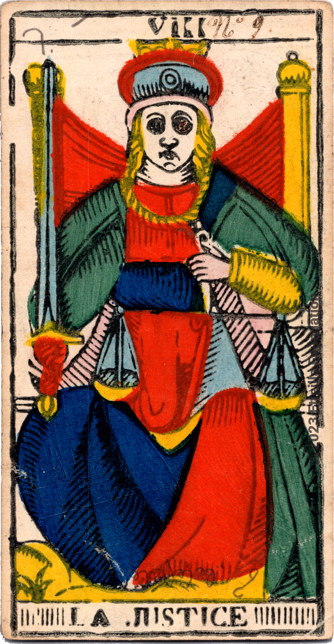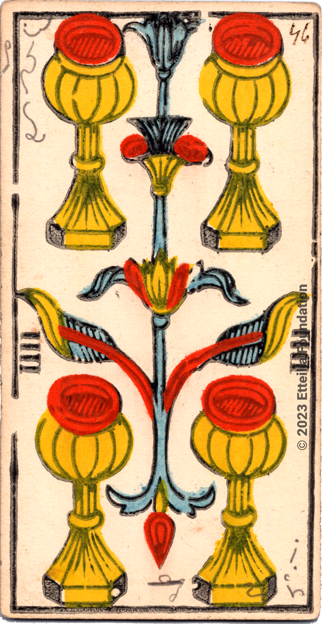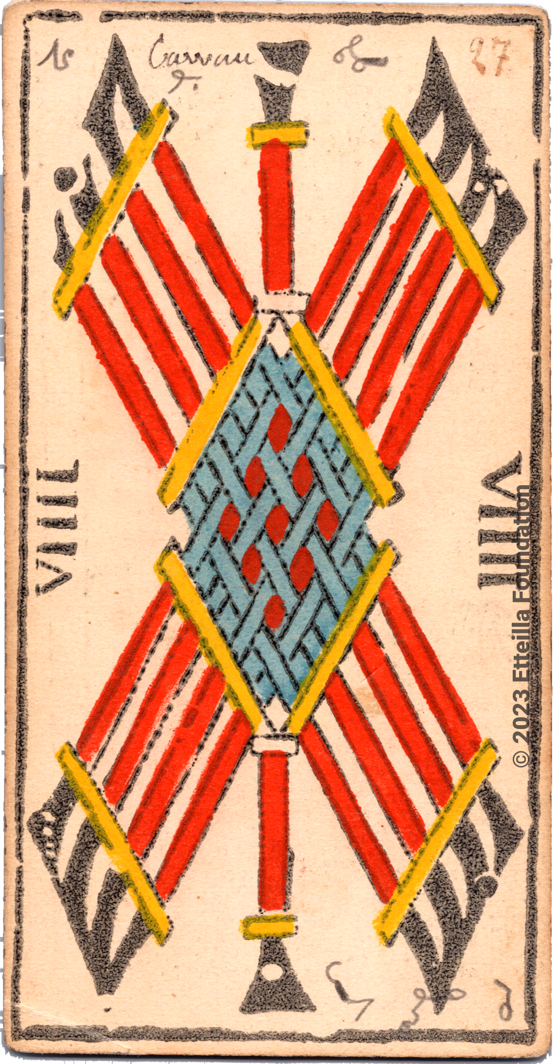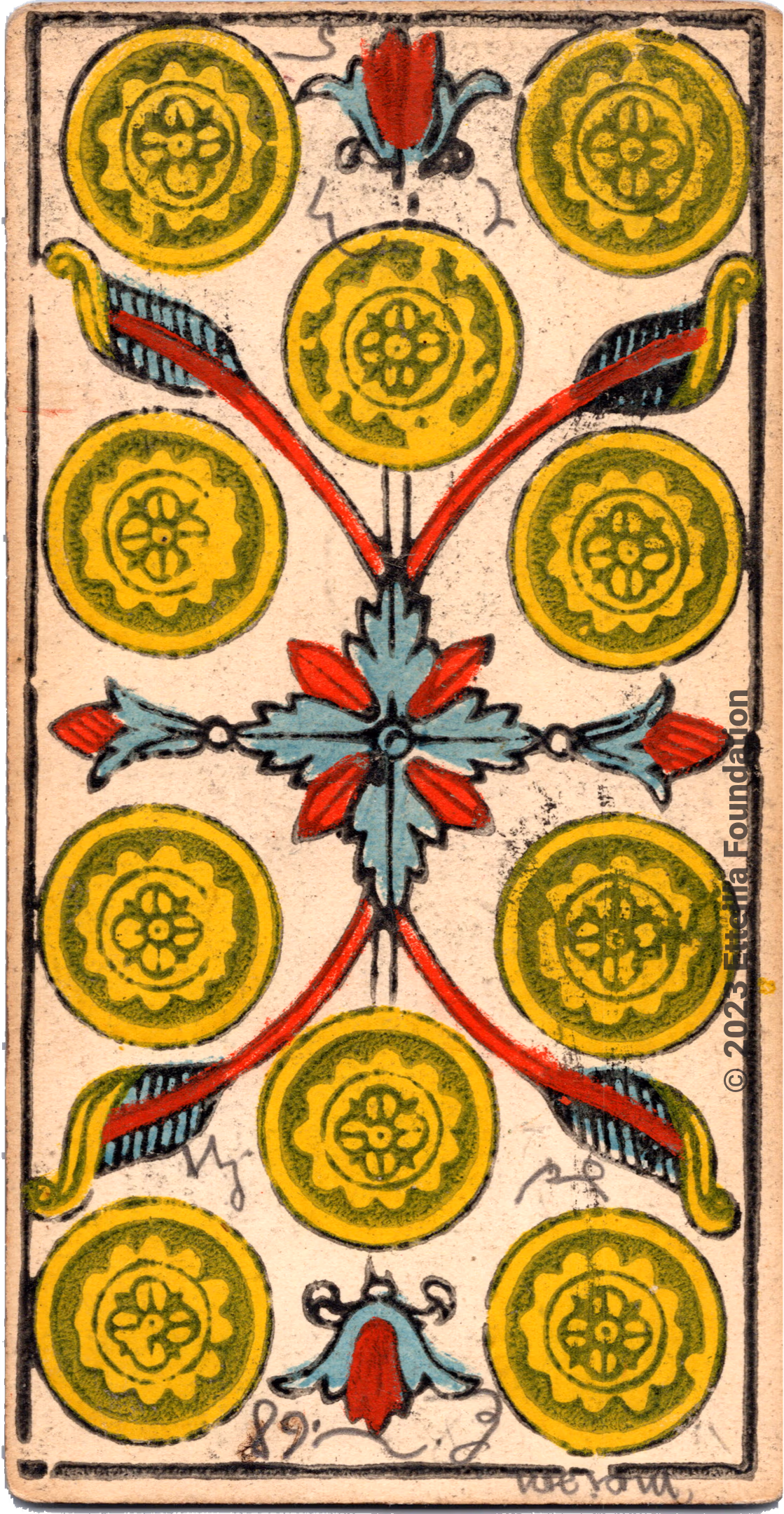 Divination Tarot de Marseille created by Nicolas Conver printed by A. Camoin & Cie in France circa 1760. Conver decks are the most renowed Tarot de Marseille and considered the canonical design. The Tarot de Marseille were the one that led to the use of Tarot for occult practices.