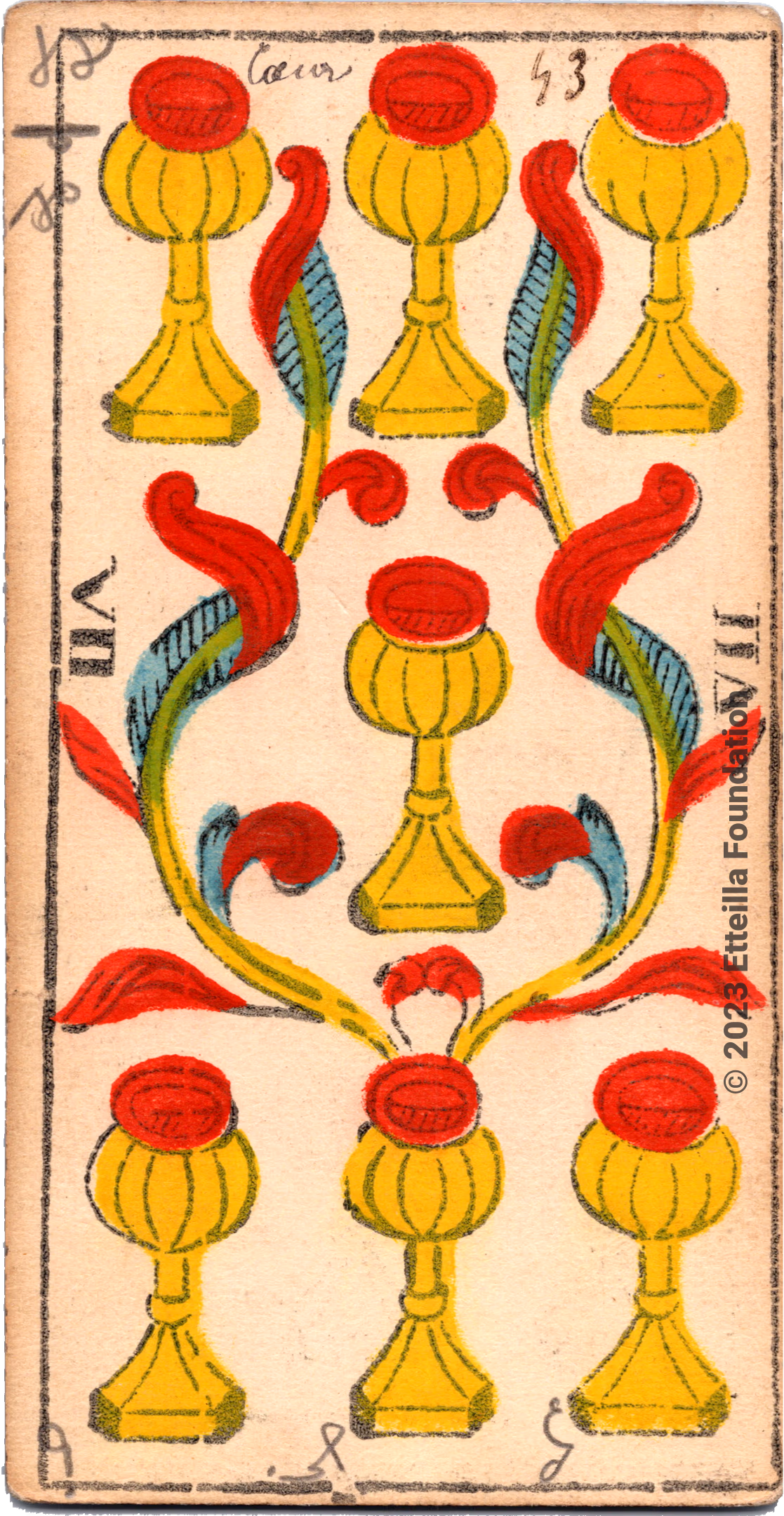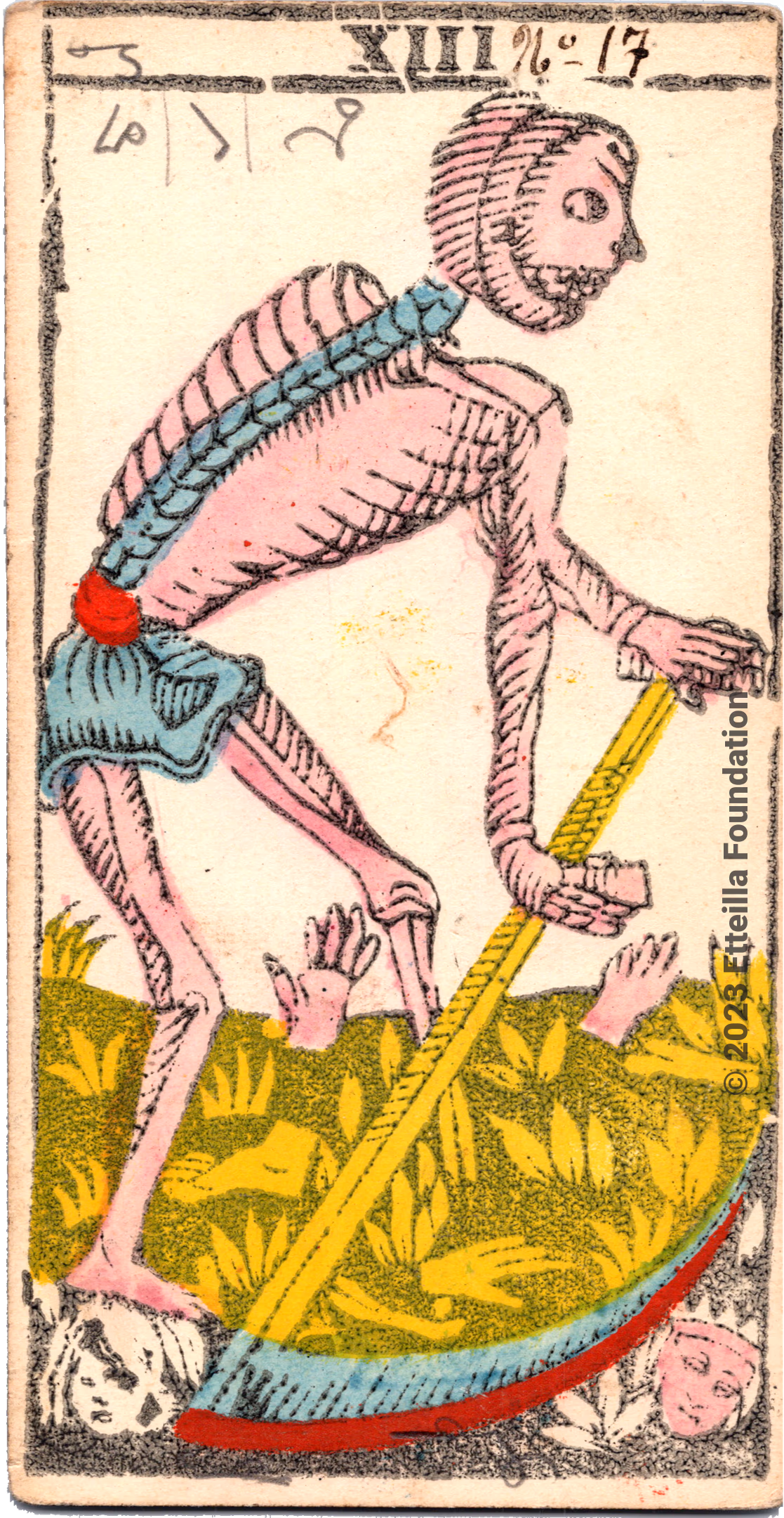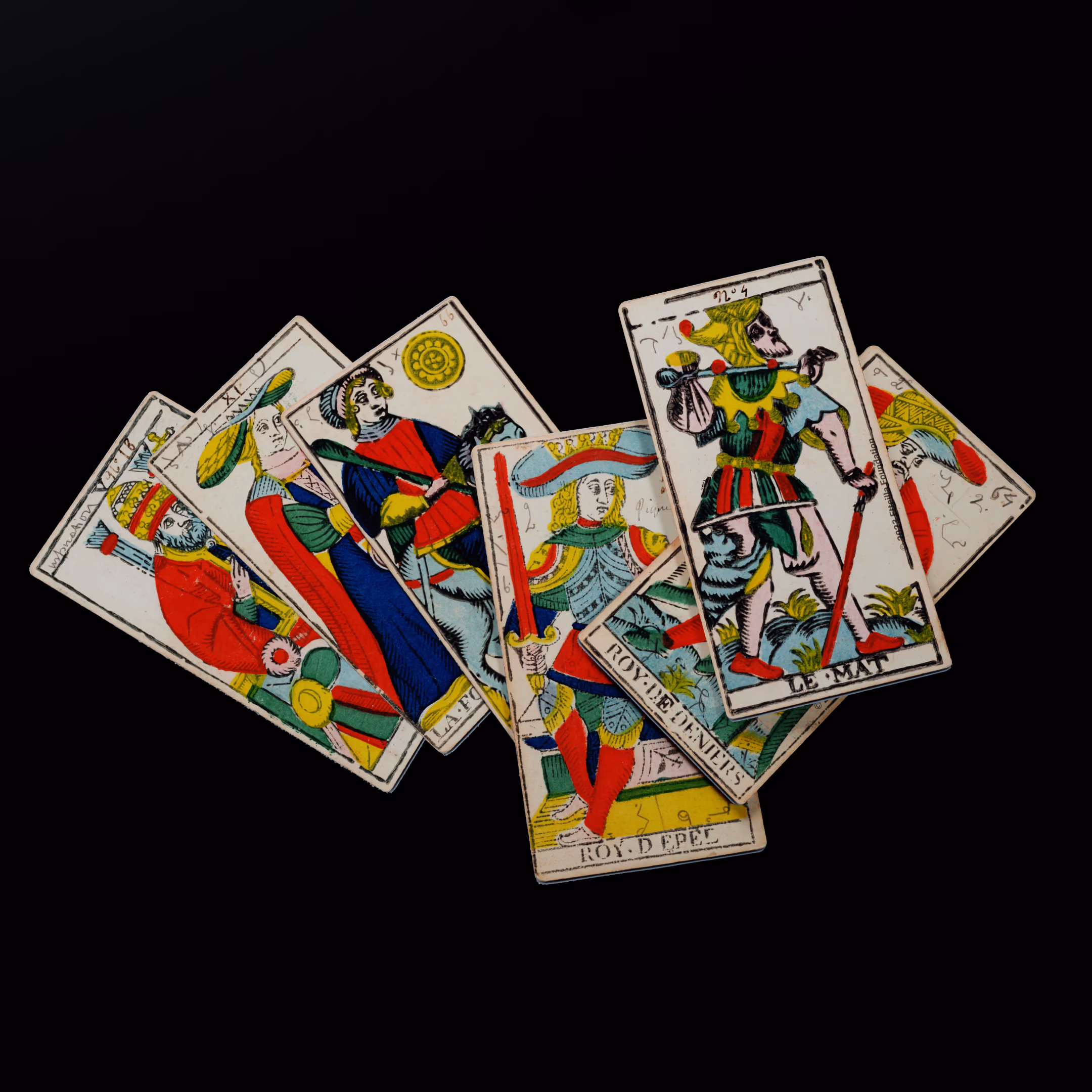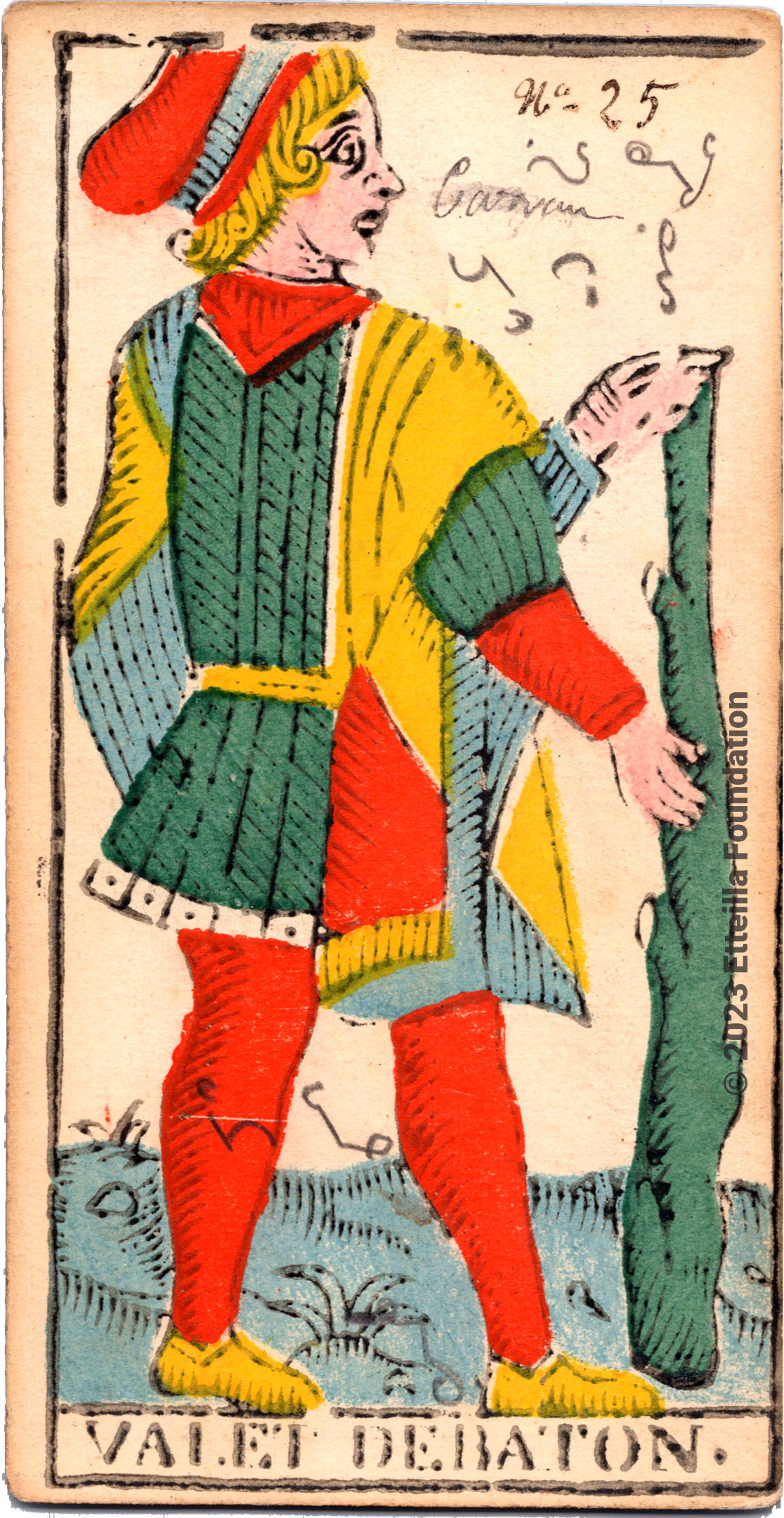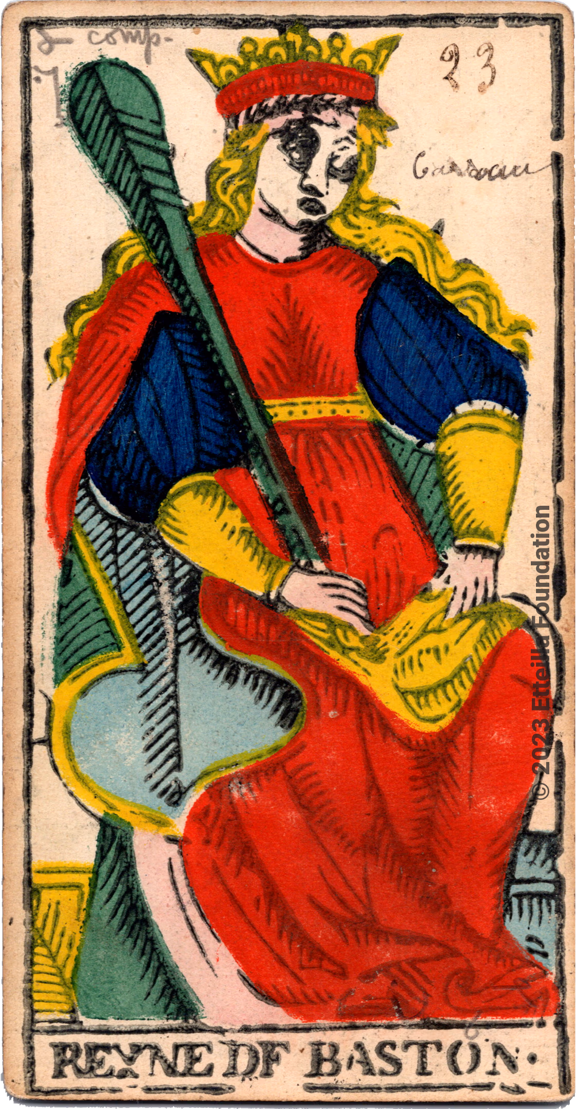 Divination Tarot de Marseille created by Nicolas Conver printed by A. Camoin & Cie in France circa 1760. Conver decks are the most renowed Tarot de Marseille and considered the canonical design. The Tarot de Marseille were the one that led to the use of Tarot for occult practices.