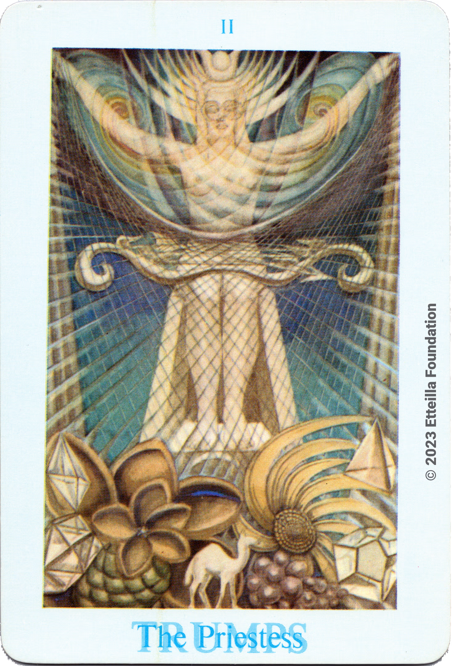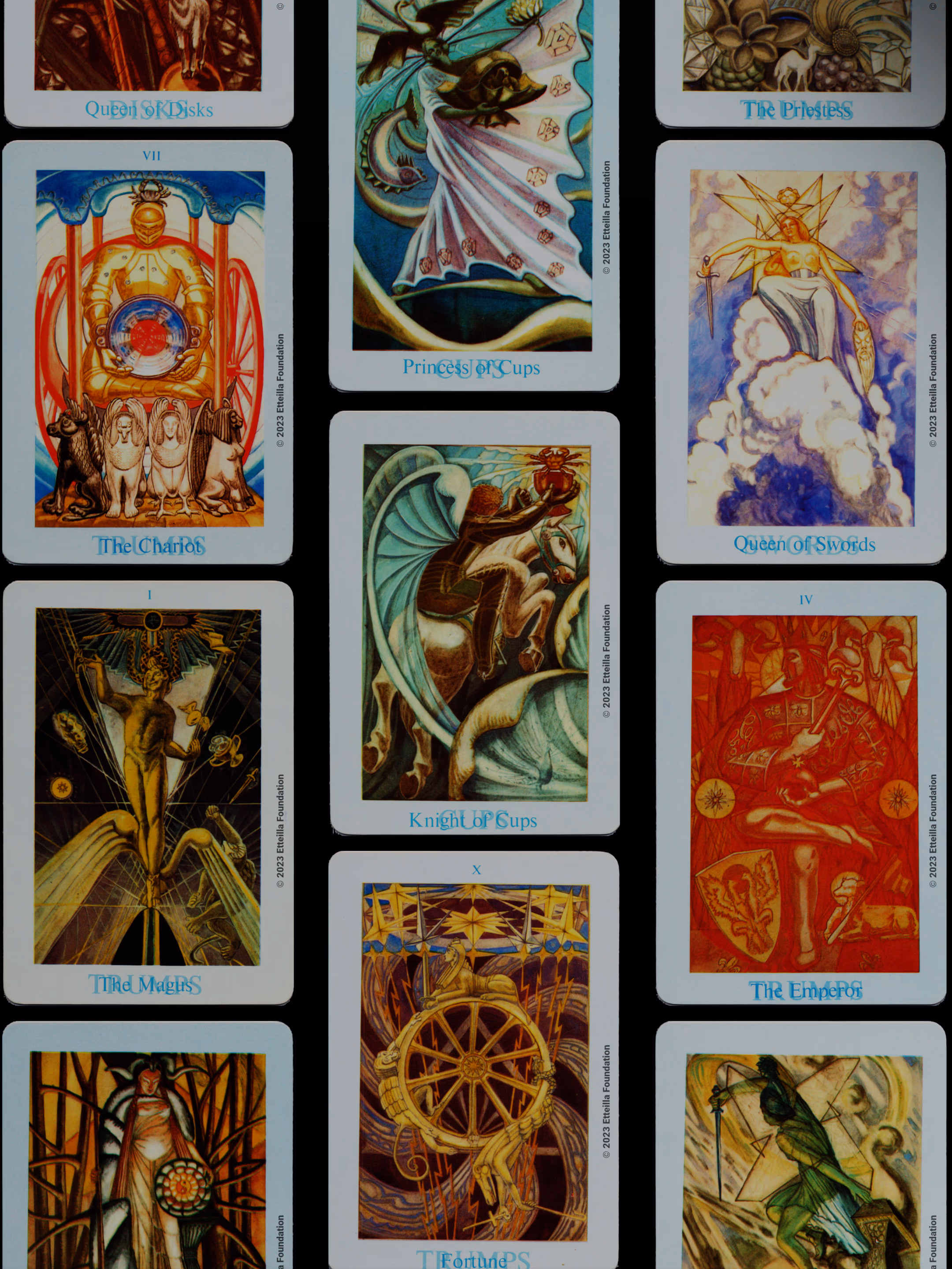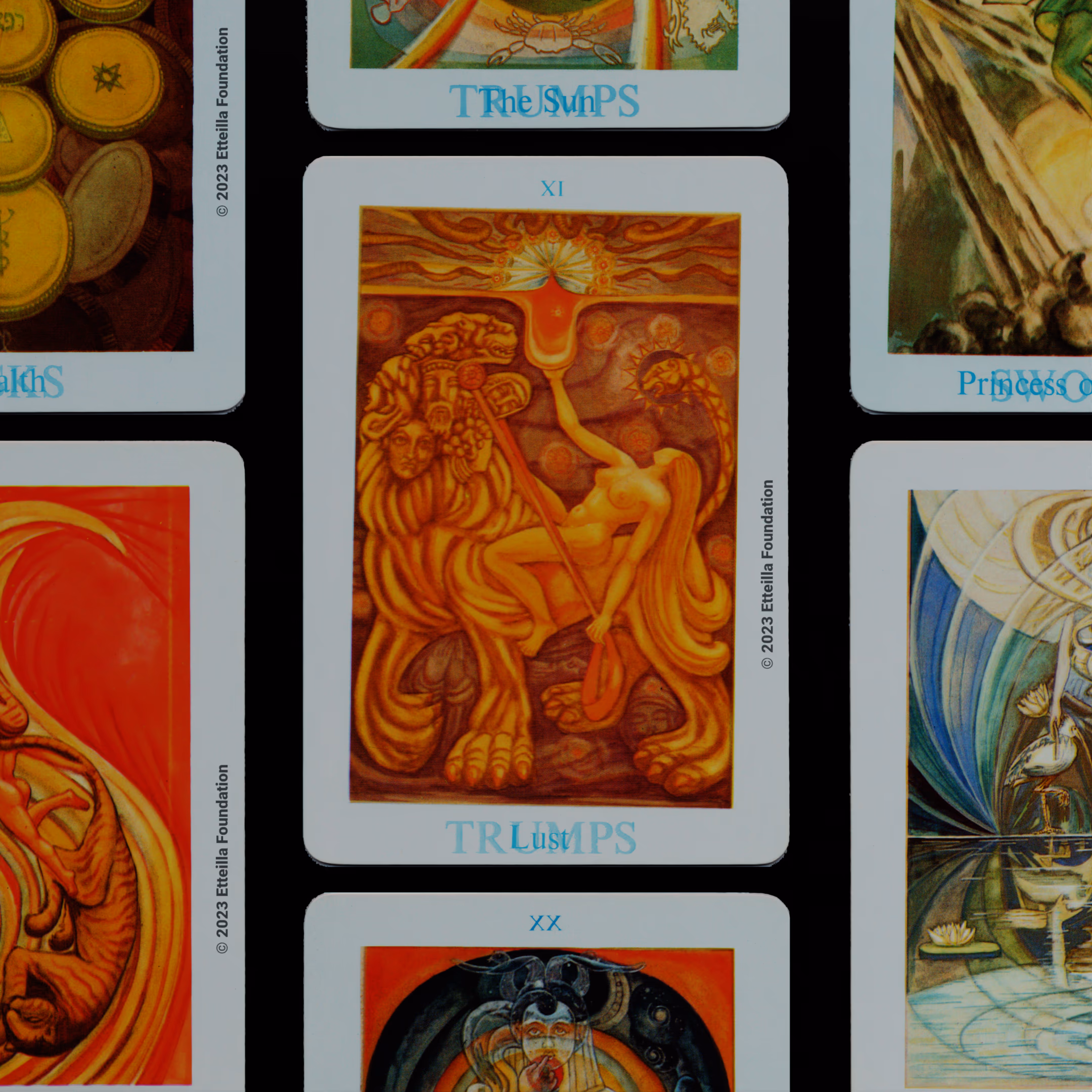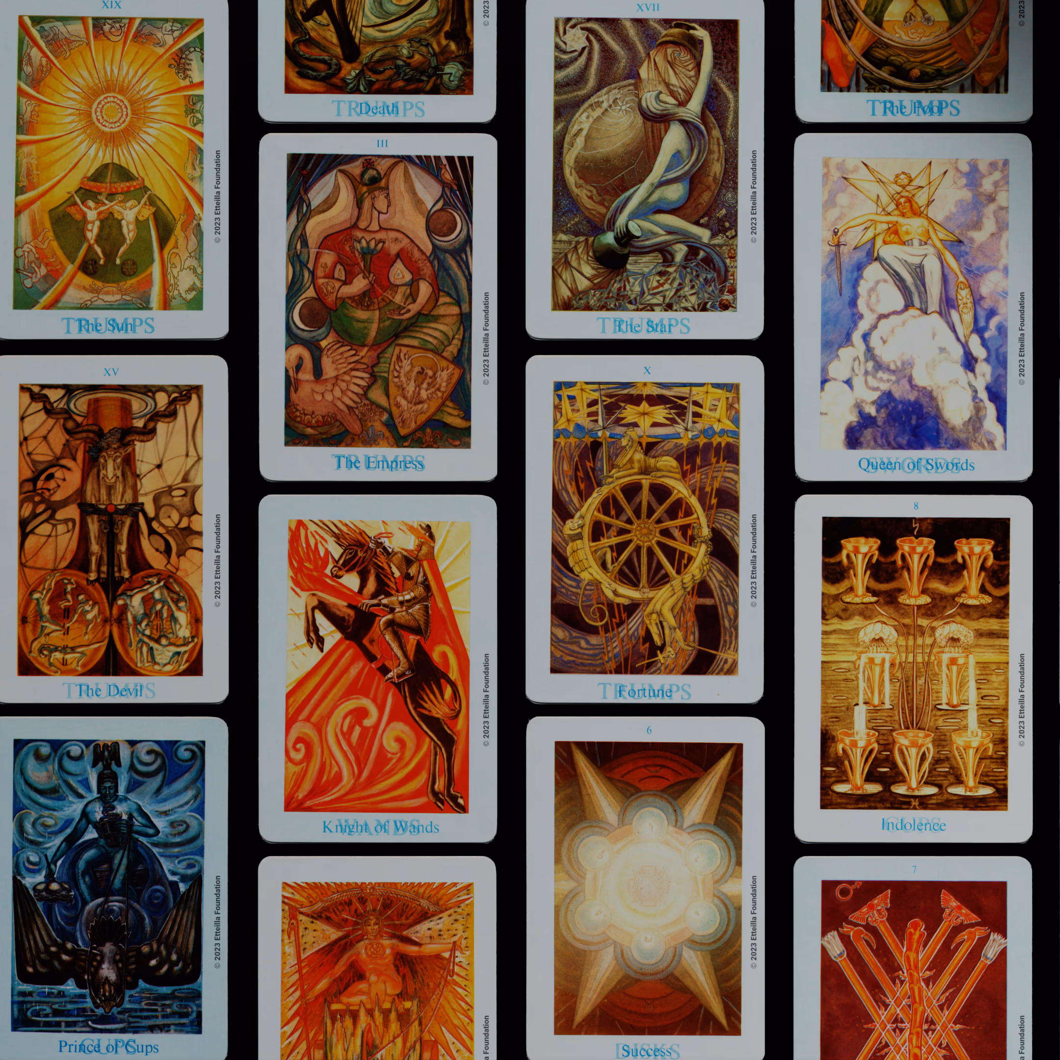 The Thoth Tarot which features very unique card designs and artistic direction is a collaboration between the famous occultist Aleister Crowley who designed the deck, and Lady Frieda Harris who painted the illustrations. This very popular divination tarot created between 1938 and 1943 is notable for having major arcana re-ordered and renamed to allow what Crowley calls the “double zodiac loop” for tarot reading. We note that the suit of disks replace the suit of pentacles found in the Waite-Smith decks and many cards have different names. In particular the Knights replace the Kings, The Knights become the Princes and the Pages are replaced by the Princesses. This previously unknown version, referred as A2 as it is from the same publisher, is the second colored version printed by Llewellyn but printed in the USA circa 1969 - It correct the two printing mistakes found in the original version A1.