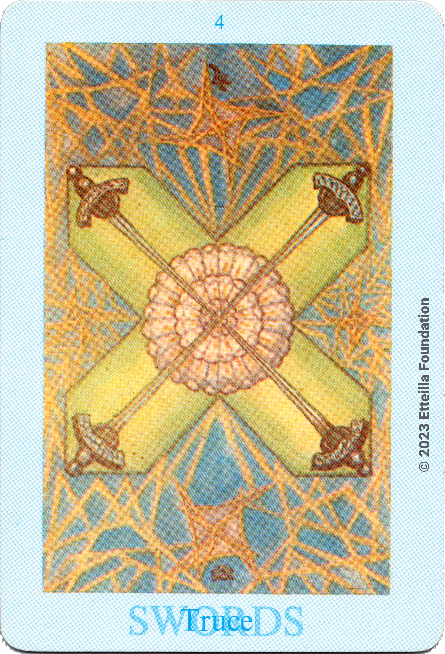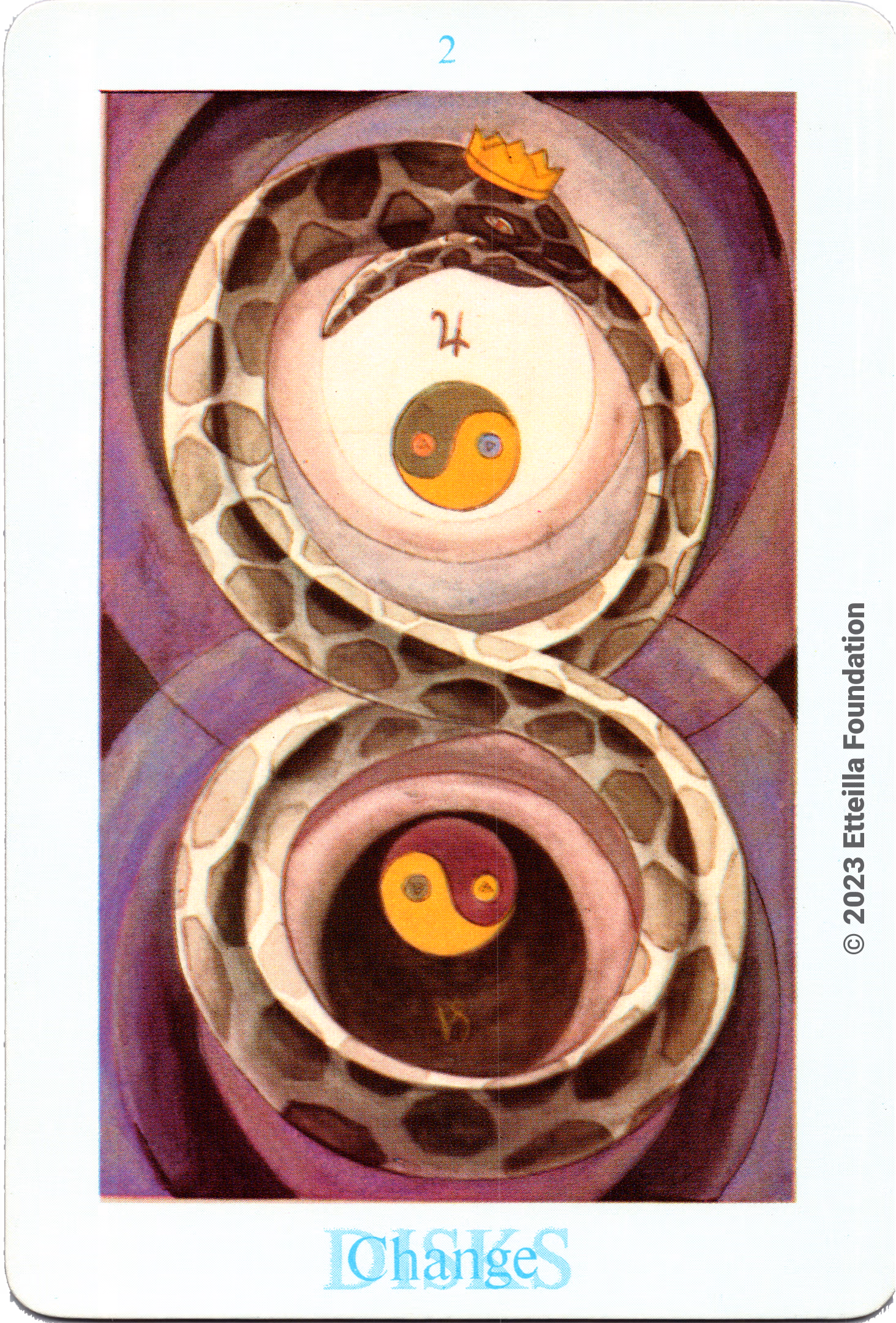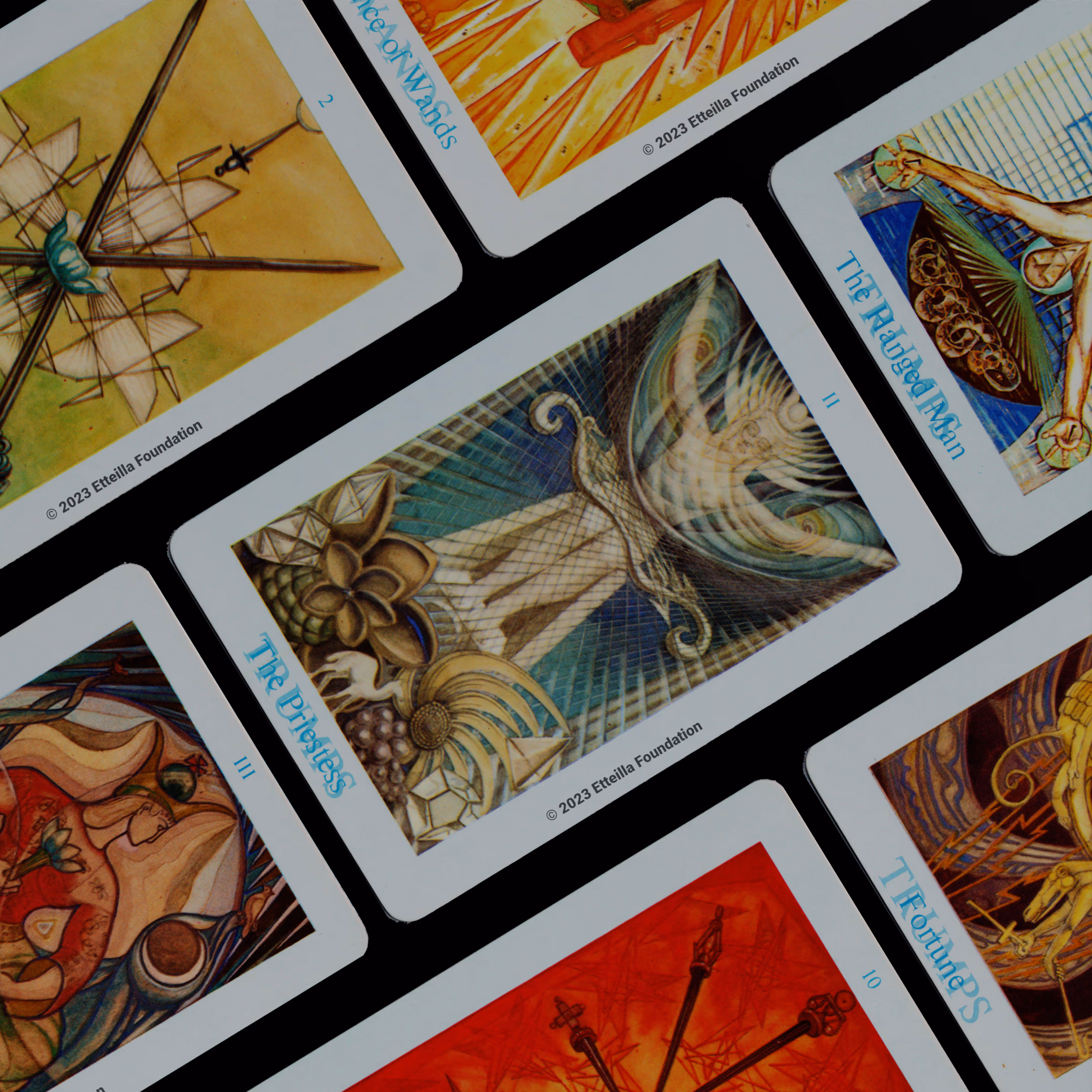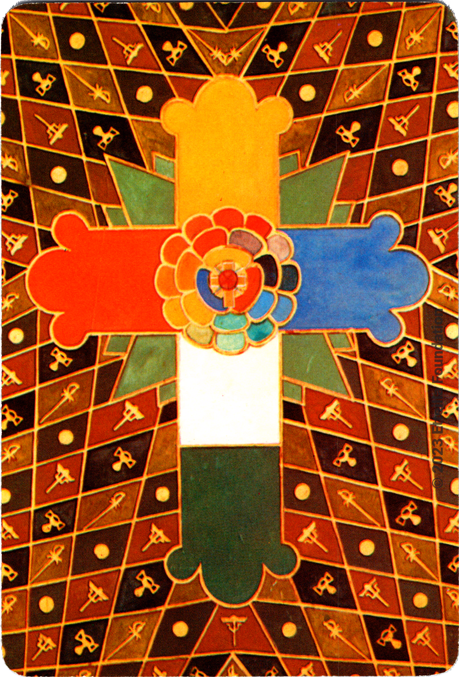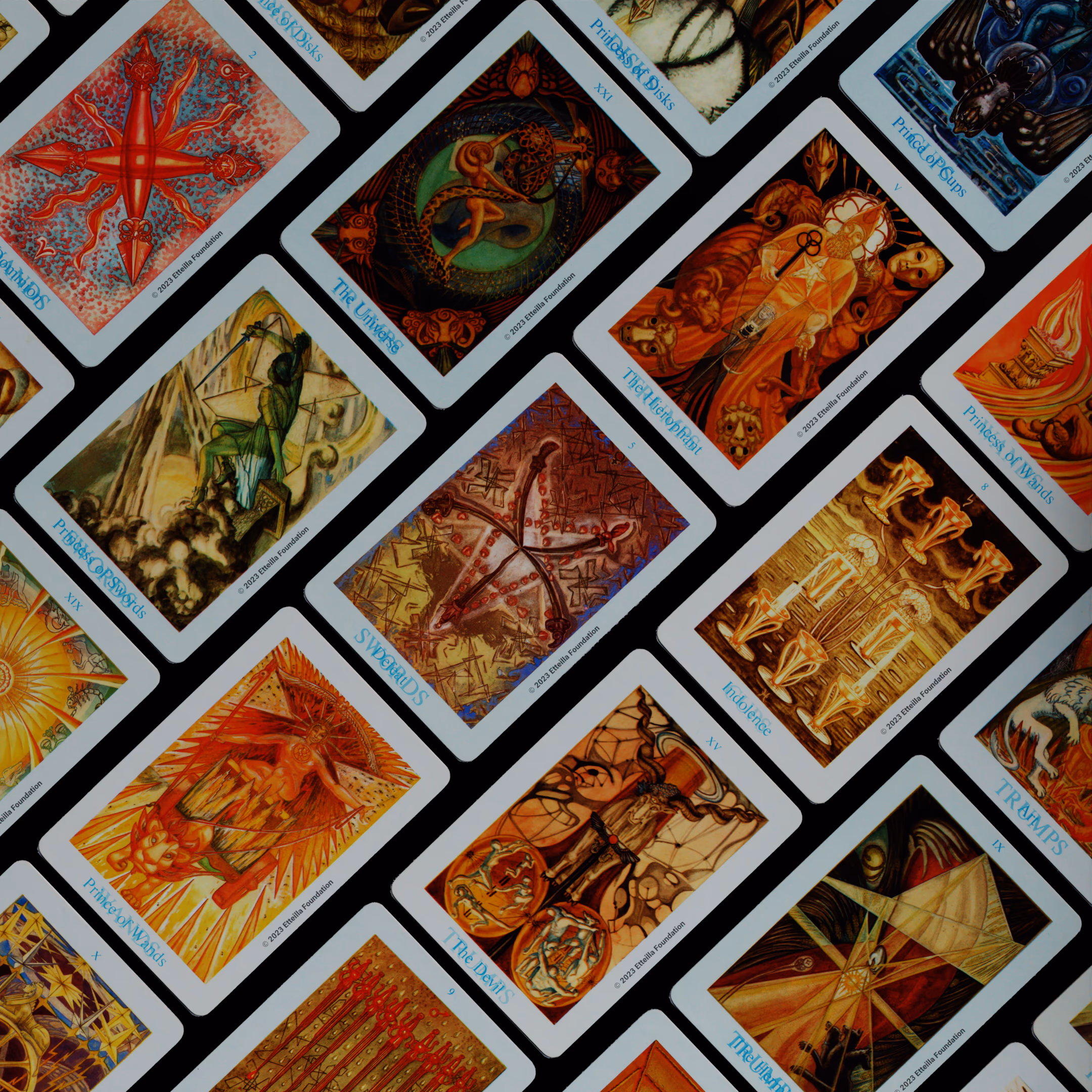The Thoth Tarot which features very unique card designs and artistic direction is a collaboration between the famous occultist Aleister Crowley who designed the deck, and Lady Frieda Harris who painted the illustrations. This very popular divination tarot created between 1938 and 1943 is notable for having major arcana re-ordered and renamed to allow what Crowley calls the “double zodiac loop” for tarot reading. We note that the suit of disks replace the suit of pentacles found in the Waite-Smith decks and many cards have different names. In particular the Knights replace the Kings, The Knights become the Princes and the Pages are replaced by the Princesses. This previously unknown version, referred as A2 as it is from the same publisher, is the second colored version printed by Llewellyn but printed in the USA circa 1969 - It correct the two printing mistakes found in the original version A1.