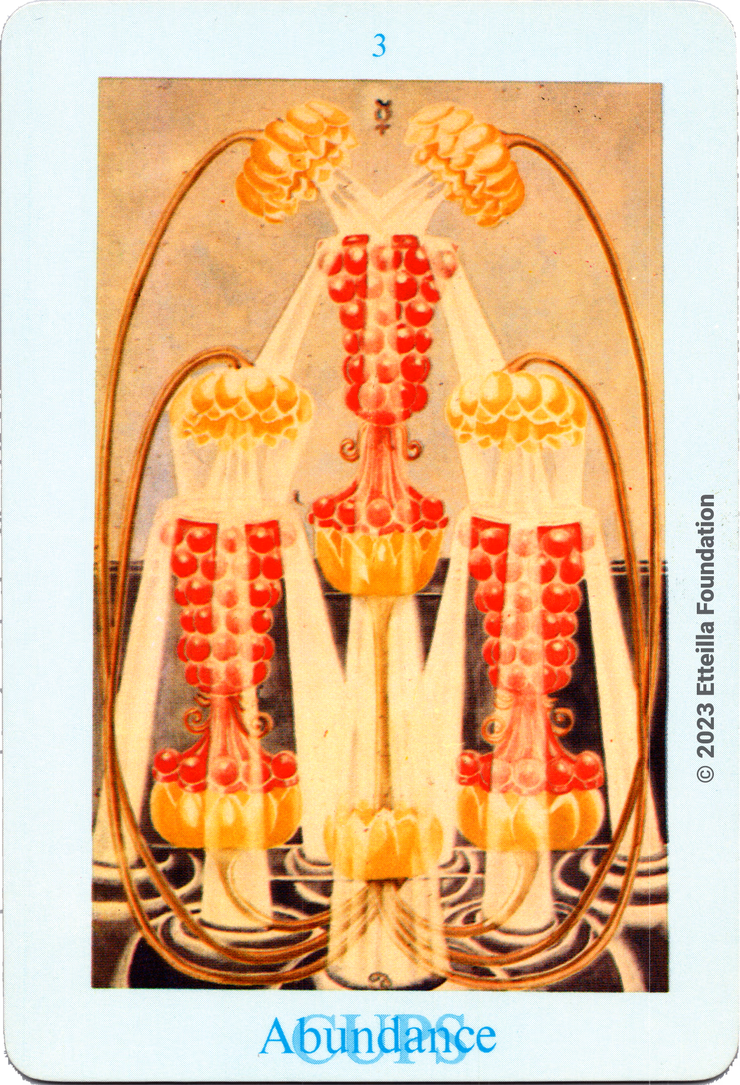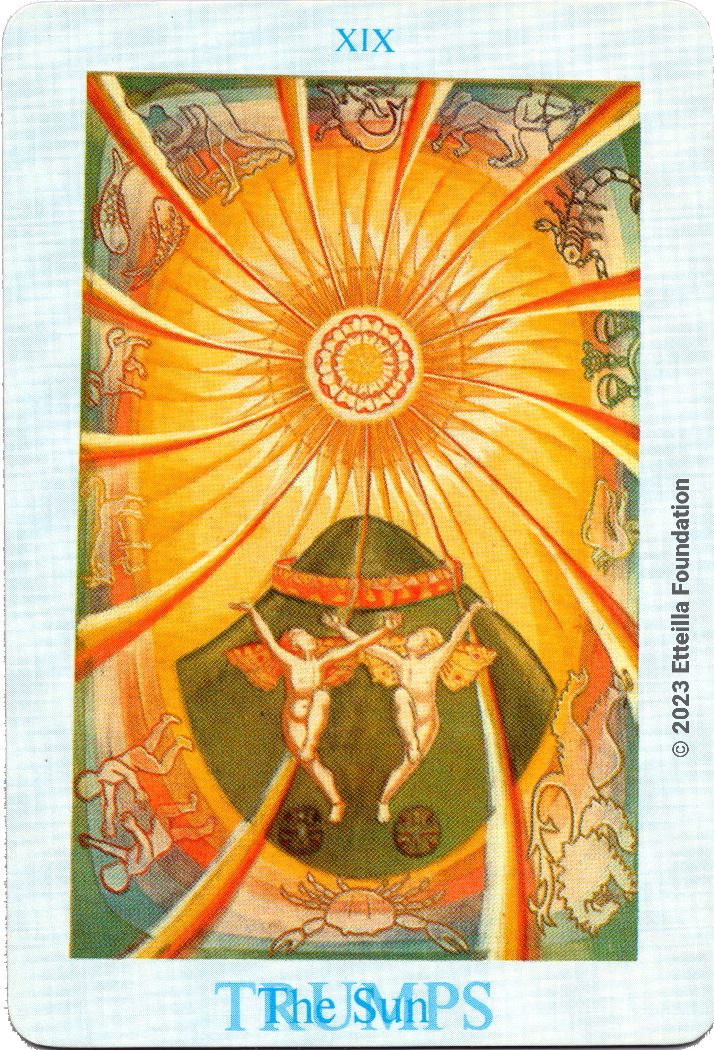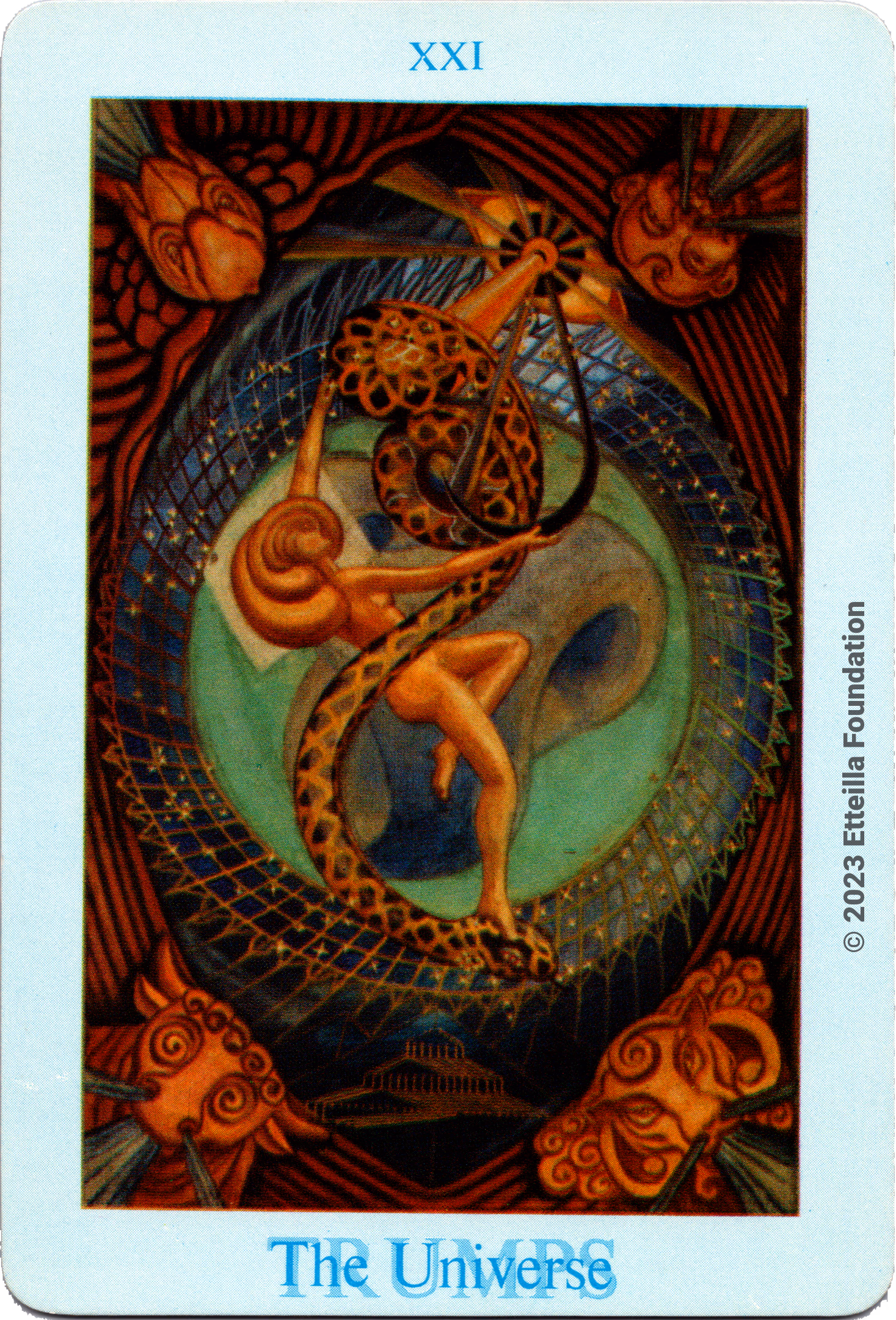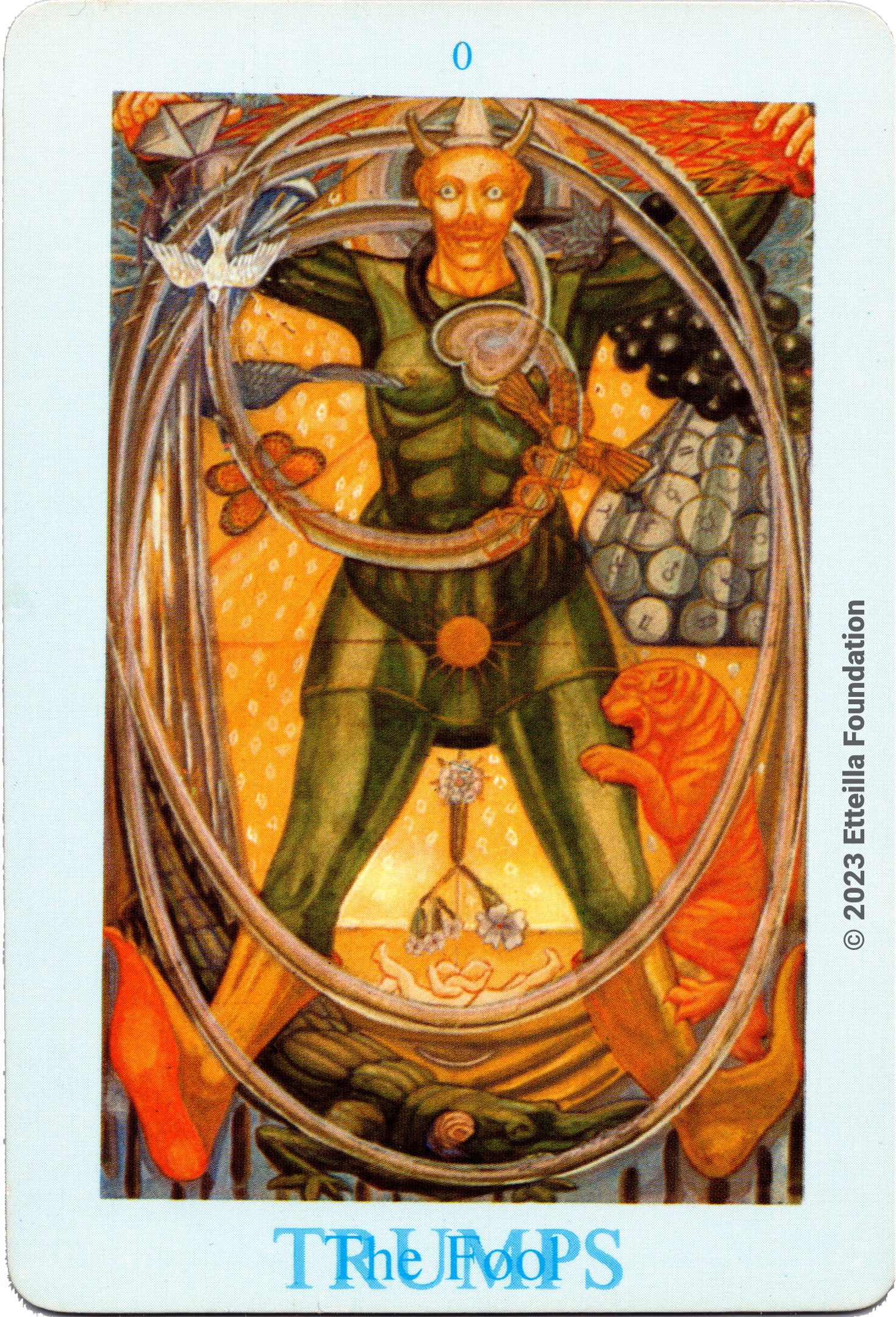 The Thoth Tarot which features very unique card designs and artistic direction is a collaboration between the famous occultist Aleister Crowley who designed the deck, and Lady Frieda Harris who painted the illustrations. This very popular divination tarot created between 1938 and 1943 is notable for having major arcana re-ordered and renamed to allow what Crowley calls the “double zodiac loop” for tarot reading. We note that the suit of disks replace the suit of pentacles found in the Waite-Smith decks and many cards have different names. In particular the Knights replace the Kings, The Knights become the Princes and the Pages are replaced by the Princesses. This previously unknown version, referred as A2 as it is from the same publisher, is the second colored version printed by Llewellyn but printed in the USA circa 1969 - It correct the two printing mistakes found in the original version A1.
