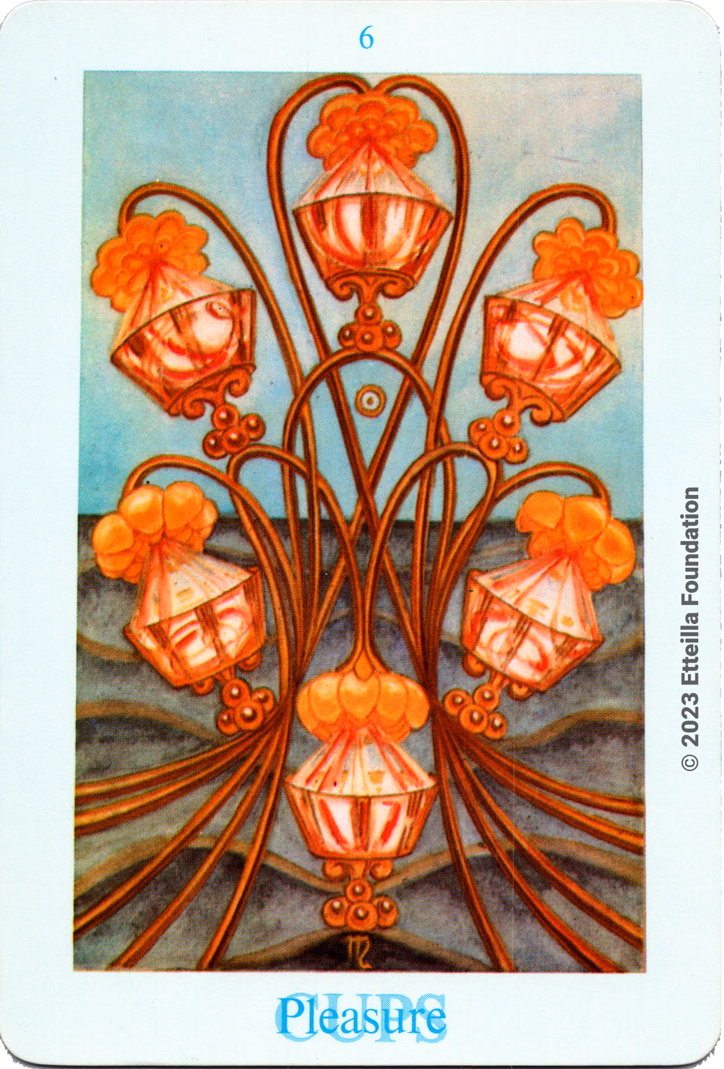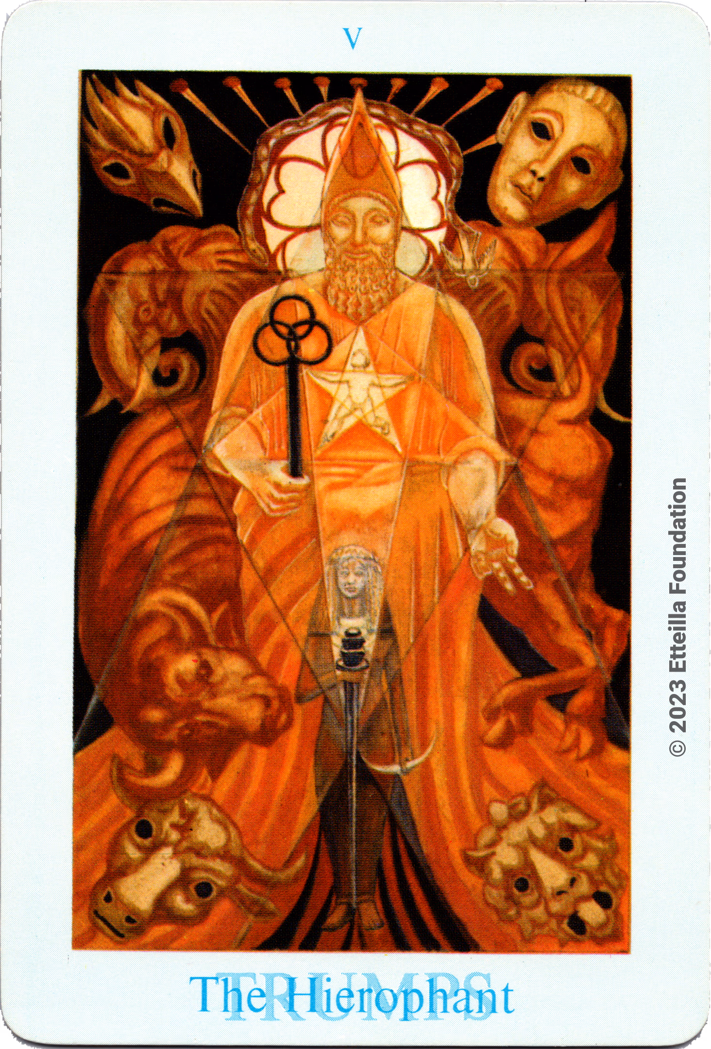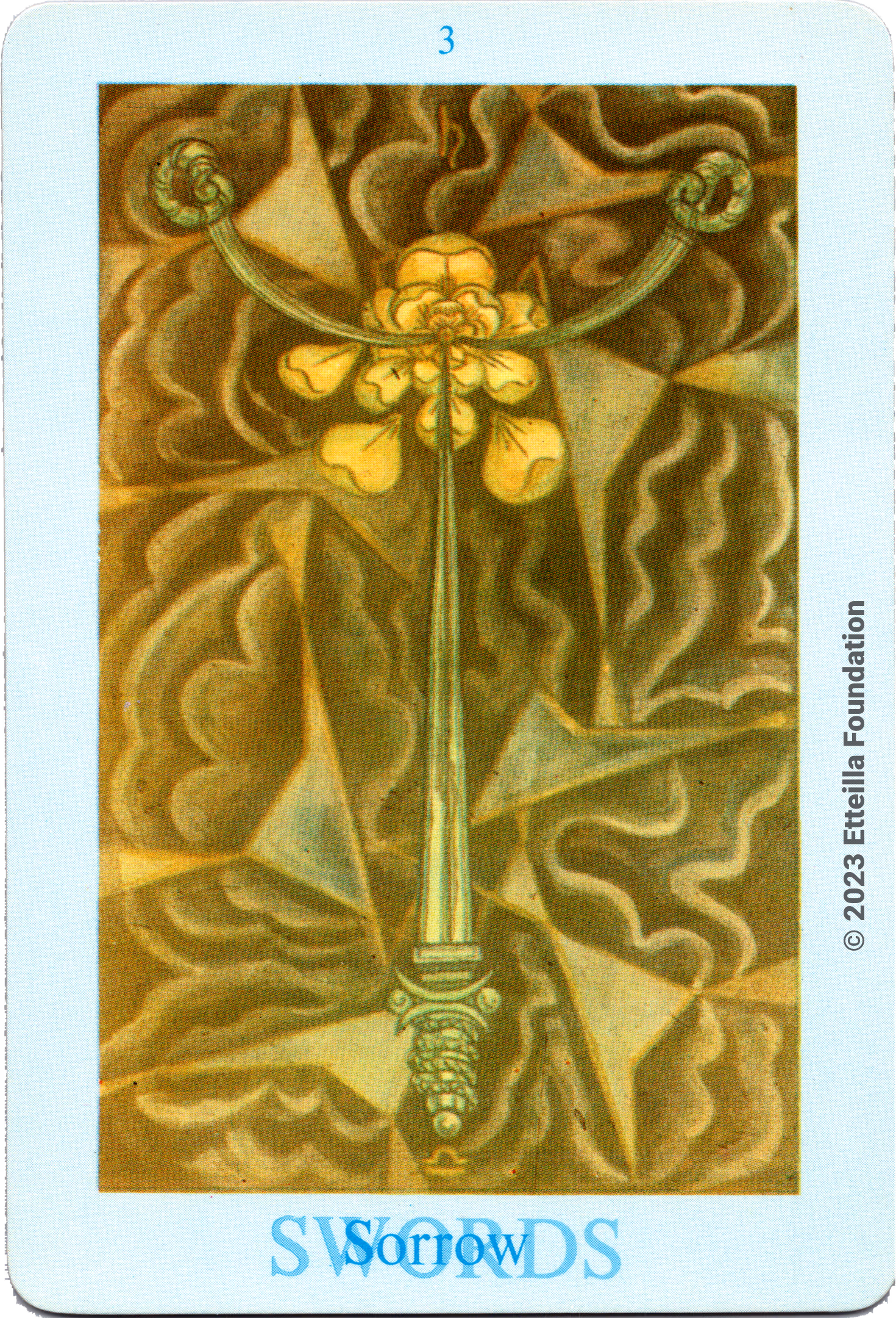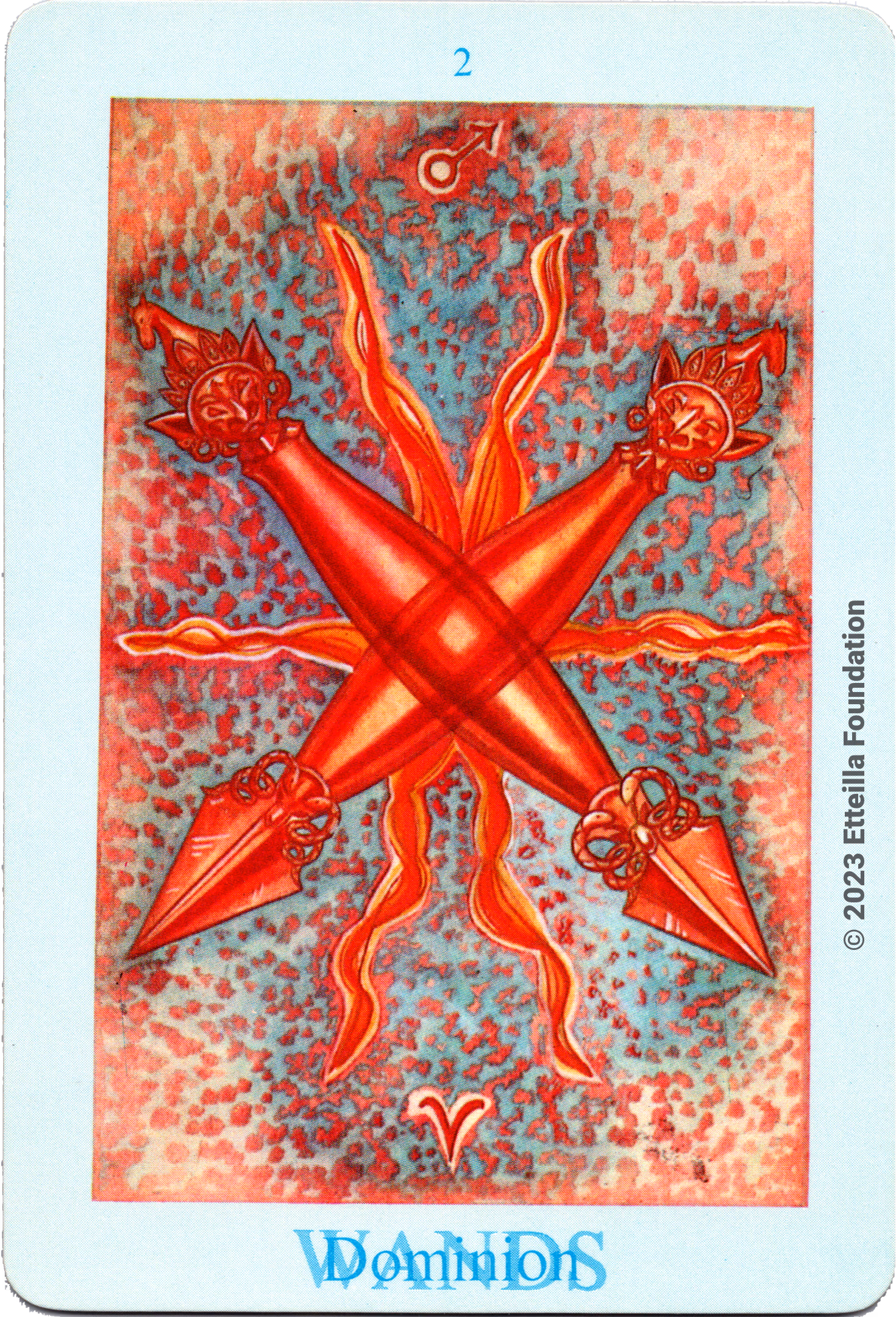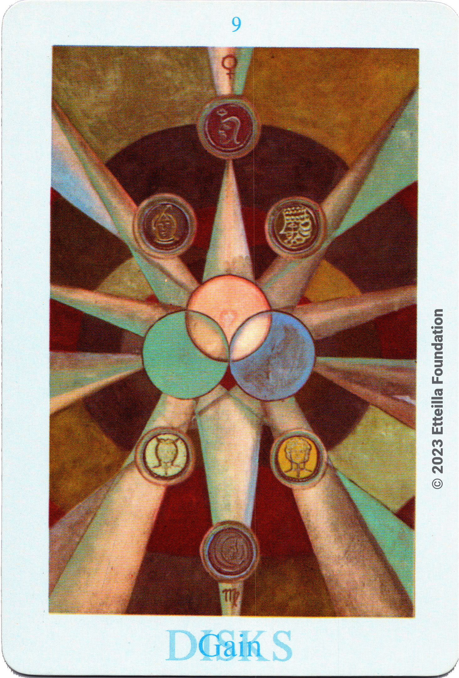The Thoth Tarot which features very unique card designs and artistic direction is a collaboration between the famous occultist Aleister Crowley who designed the deck, and Lady Frieda Harris who painted the illustrations. This very popular divination tarot created between 1938 and 1943 is notable for having major arcana re-ordered and renamed to allow what Crowley calls the “double zodiac loop” for tarot reading. We note that the suit of disks replace the suit of pentacles found in the Waite-Smith decks and many cards have different names. In particular the Knights replace the Kings, The Knights become the Princes and the Pages are replaced by the Princesses. This previously unknown version, referred as A2 as it is from the same publisher, is the second colored version printed by Llewellyn but printed in the USA circa 1969 - It correct the two printing mistakes found in the original version A1.