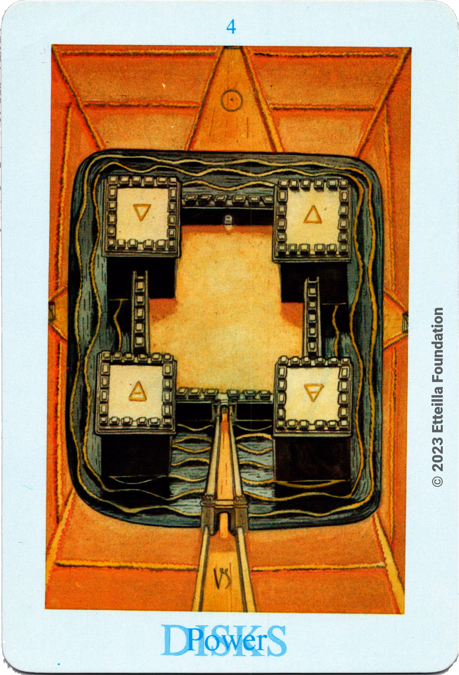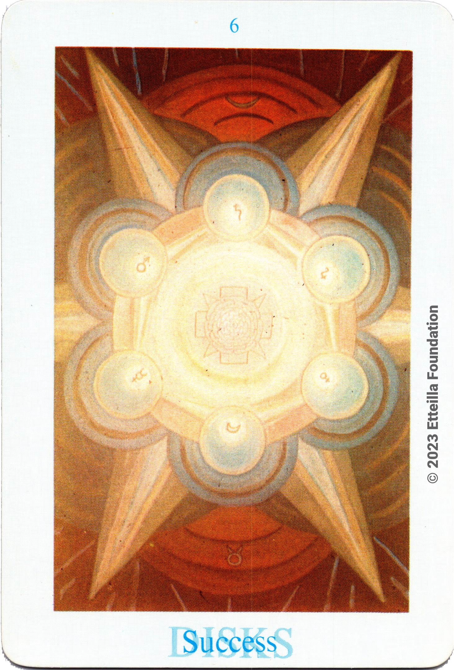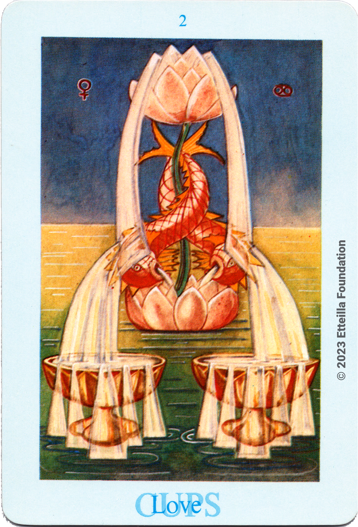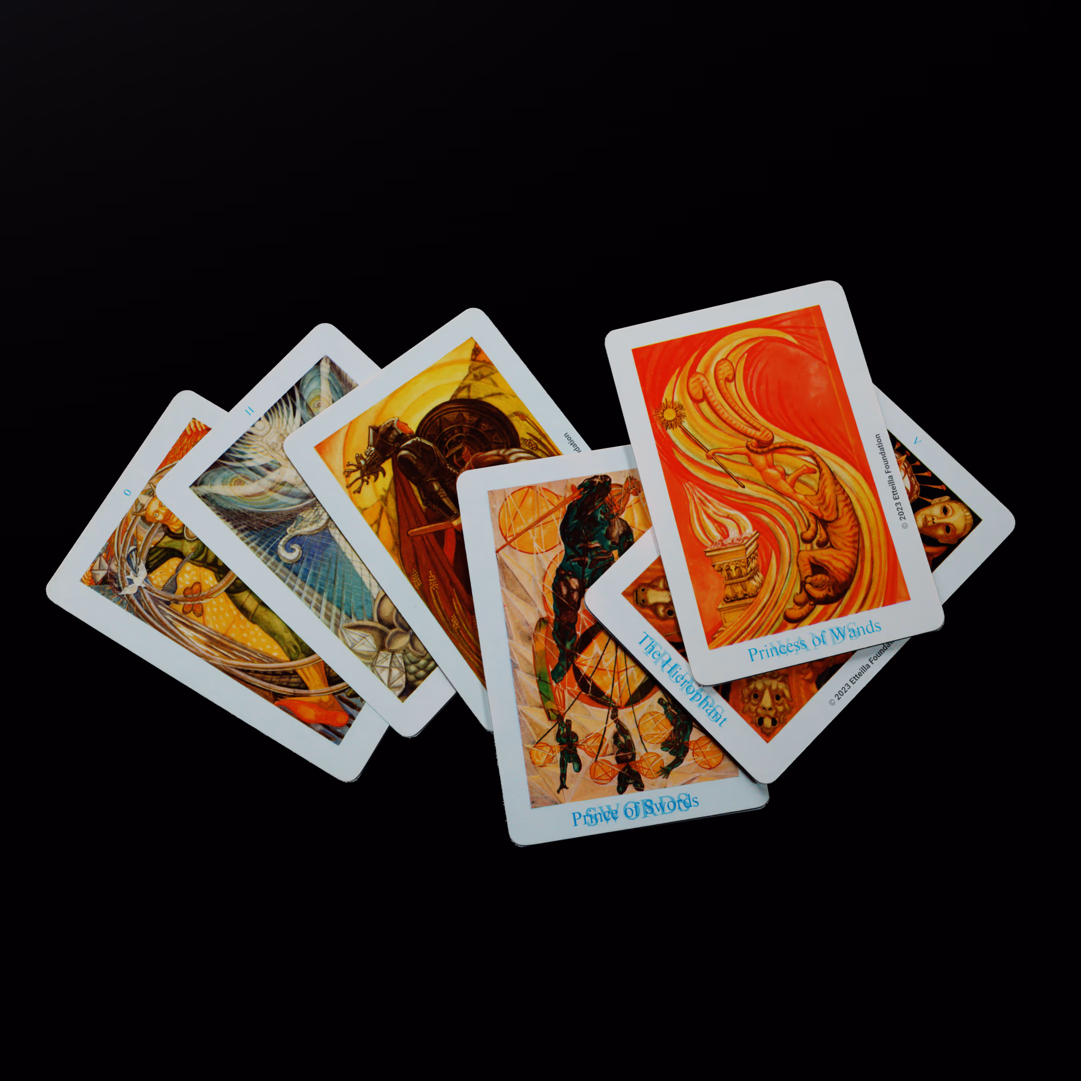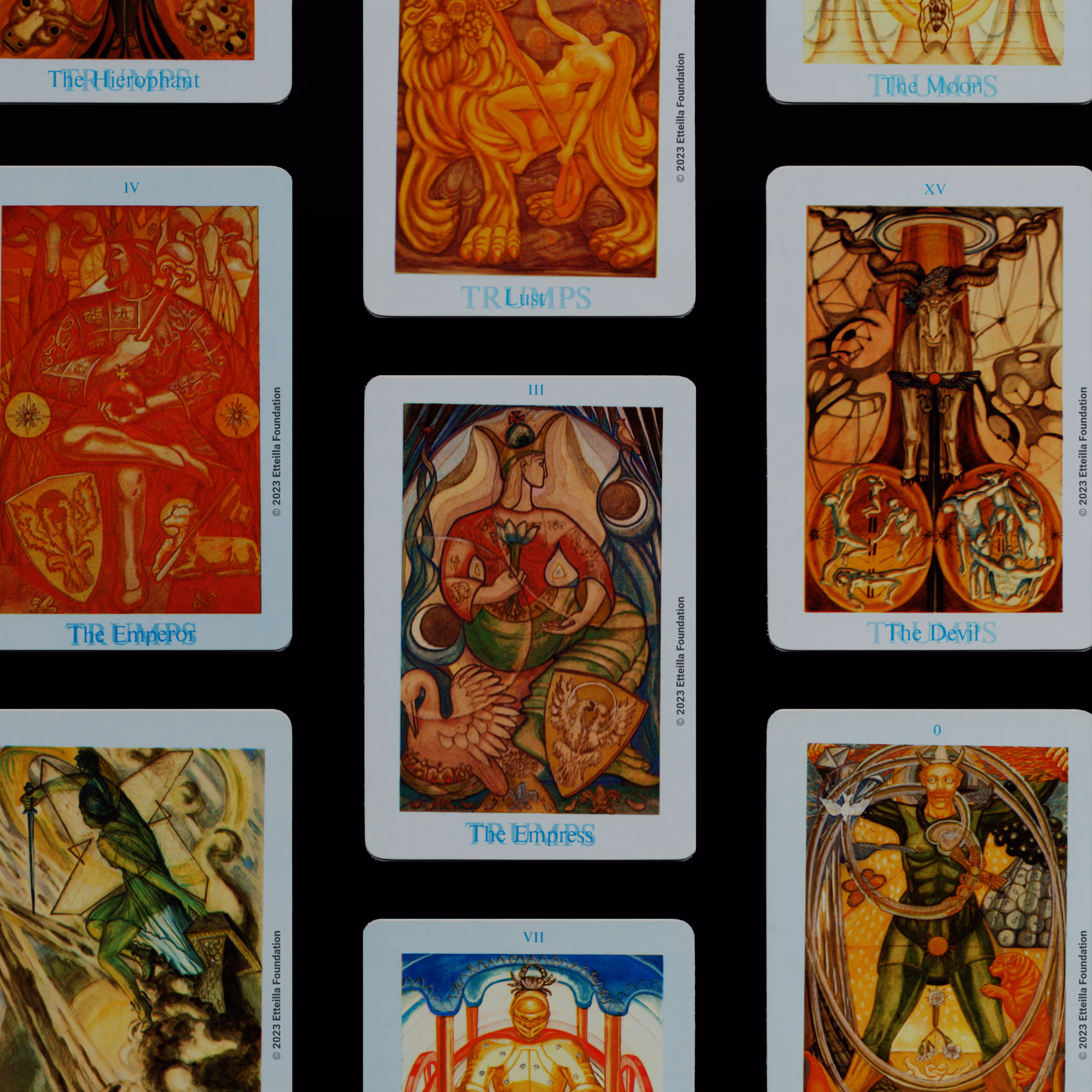 The deck is complete, in excellent condition and come with its box. All colored versions of the Toth decks are believed to be derived from the prints included in the original limited edition of the Toth book printed by Crowley circa 1944 not Frieda original painting.