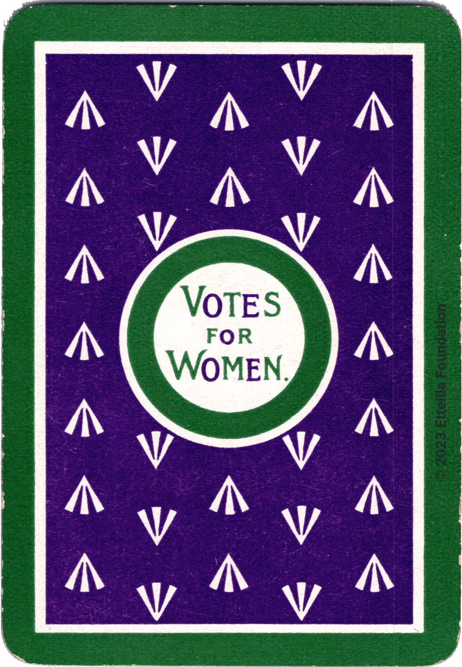 Its back design that carry the slogan “Votes for Women” surrounded by prison arrows, all in the Union’s symbolic colors of purple, green, and white. This deck was sold in WSPU shops throughout the country and through advertisements in the WSPU’s official paper, Votes for Women.