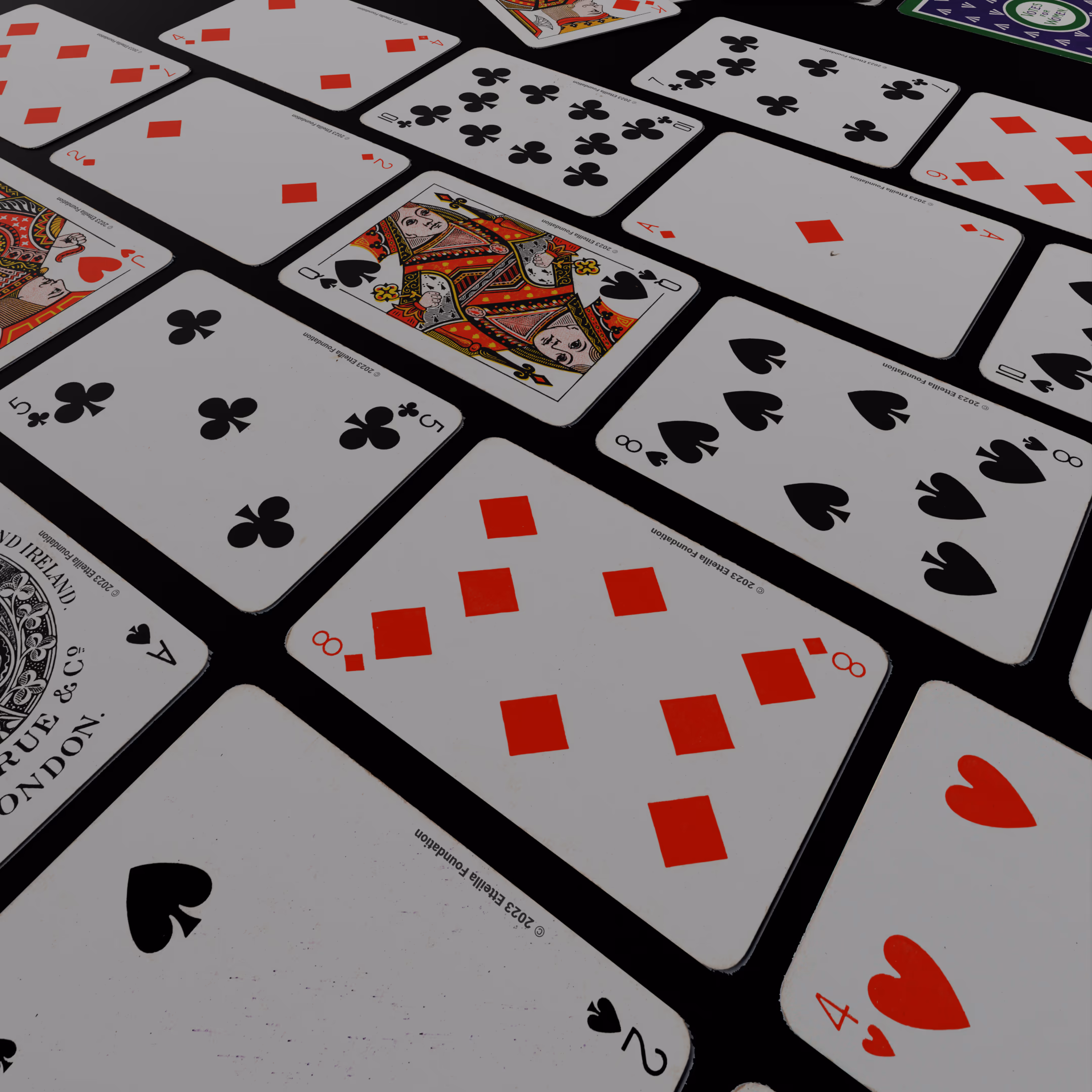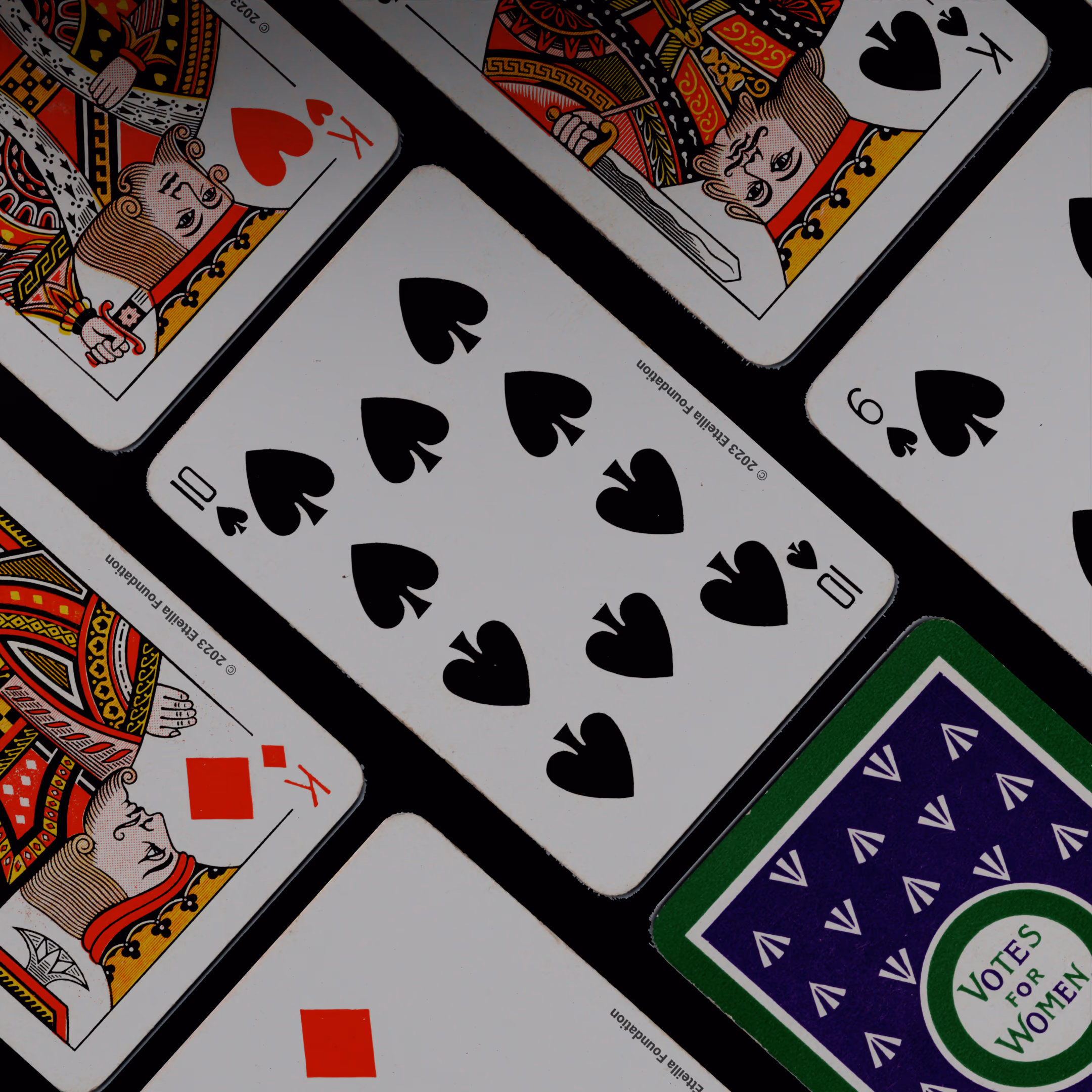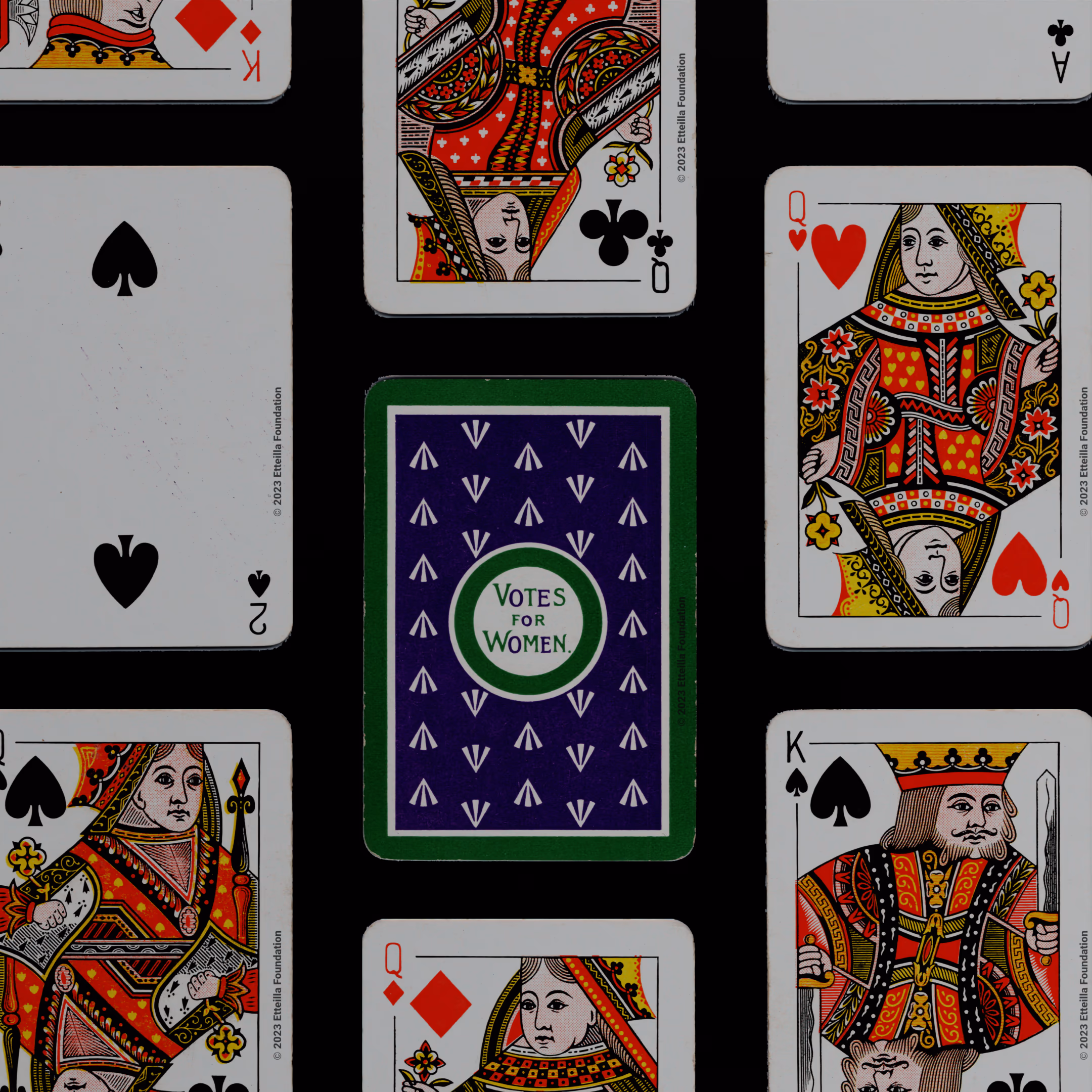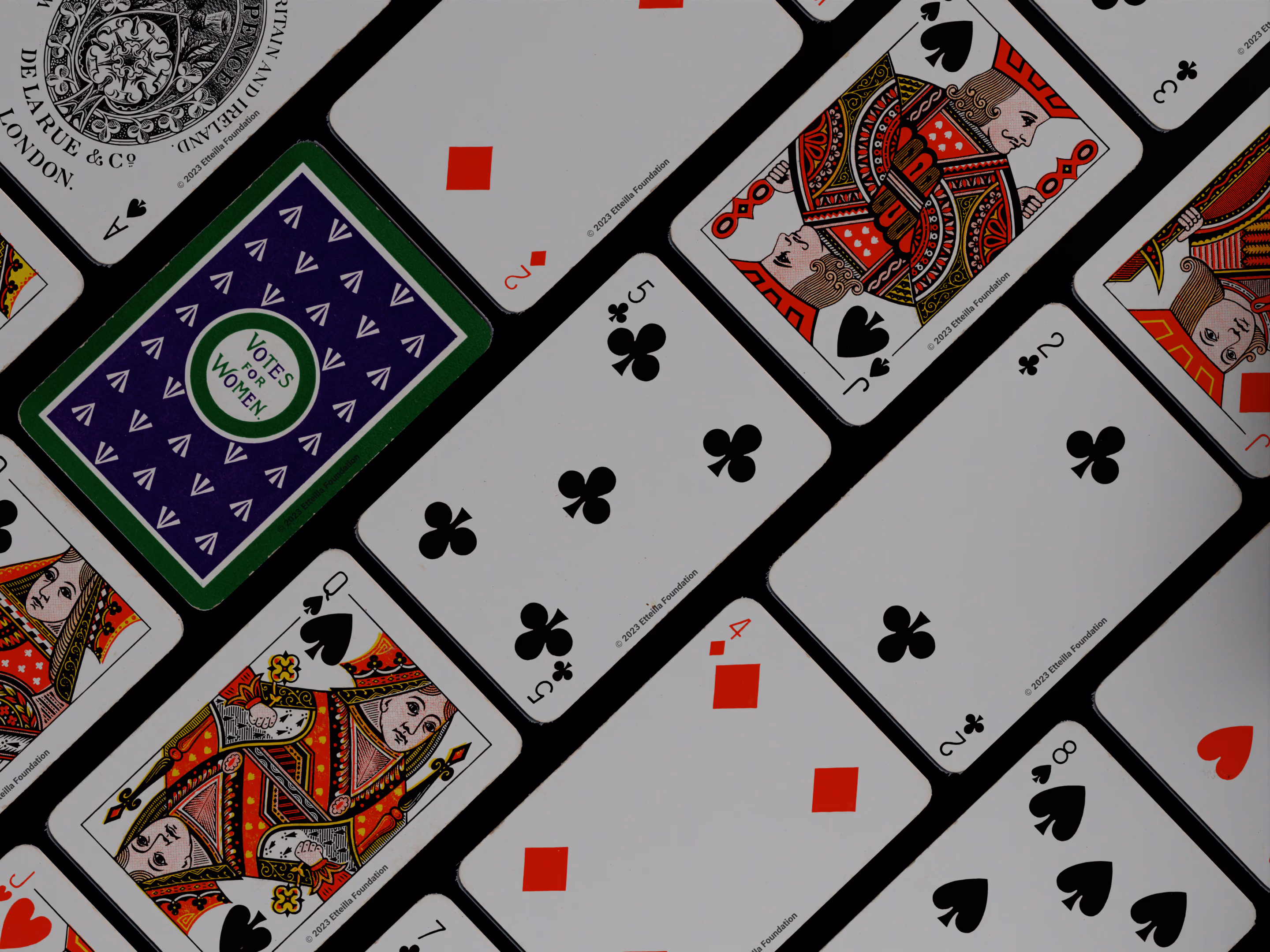 Deck manufactured by DeLarue and Company in 1910. What mak this deck historically signficant is that it is the only known deck produced by Emmeline Pankhurst’s Women’s Social and Political Union (WPSU) to support the suffragettes and the Votes For Women movement.