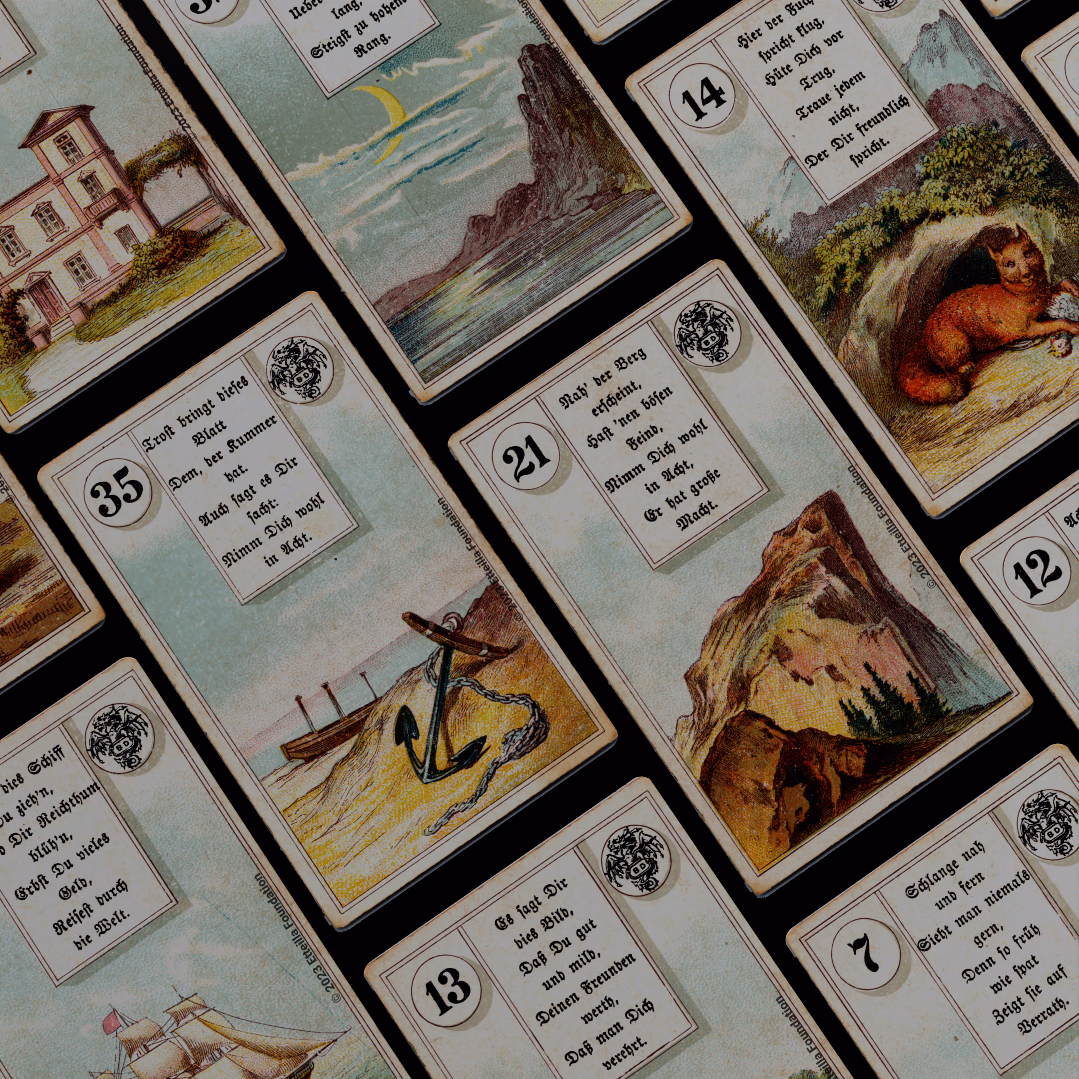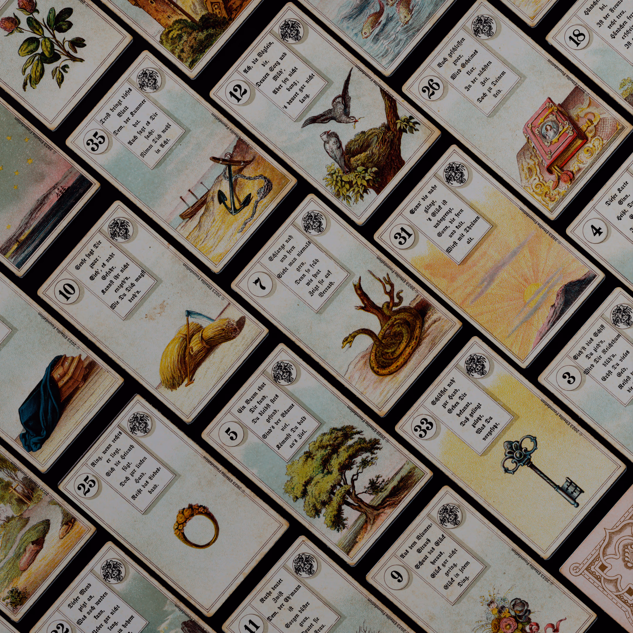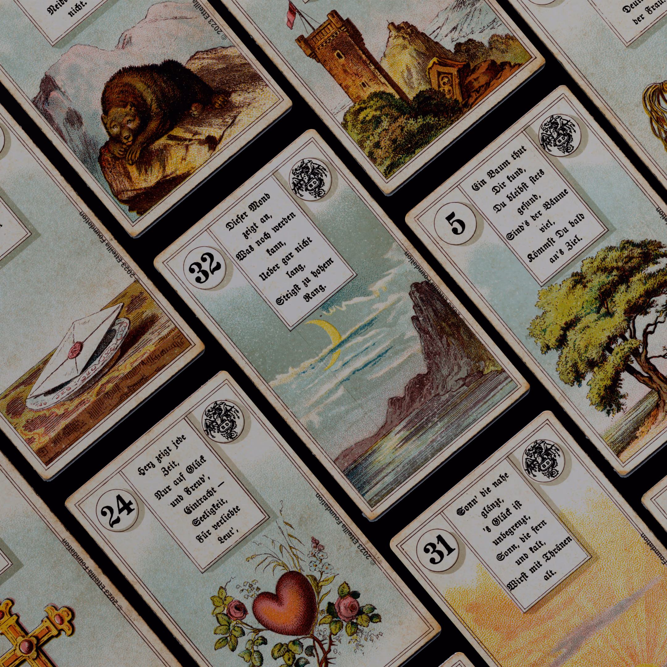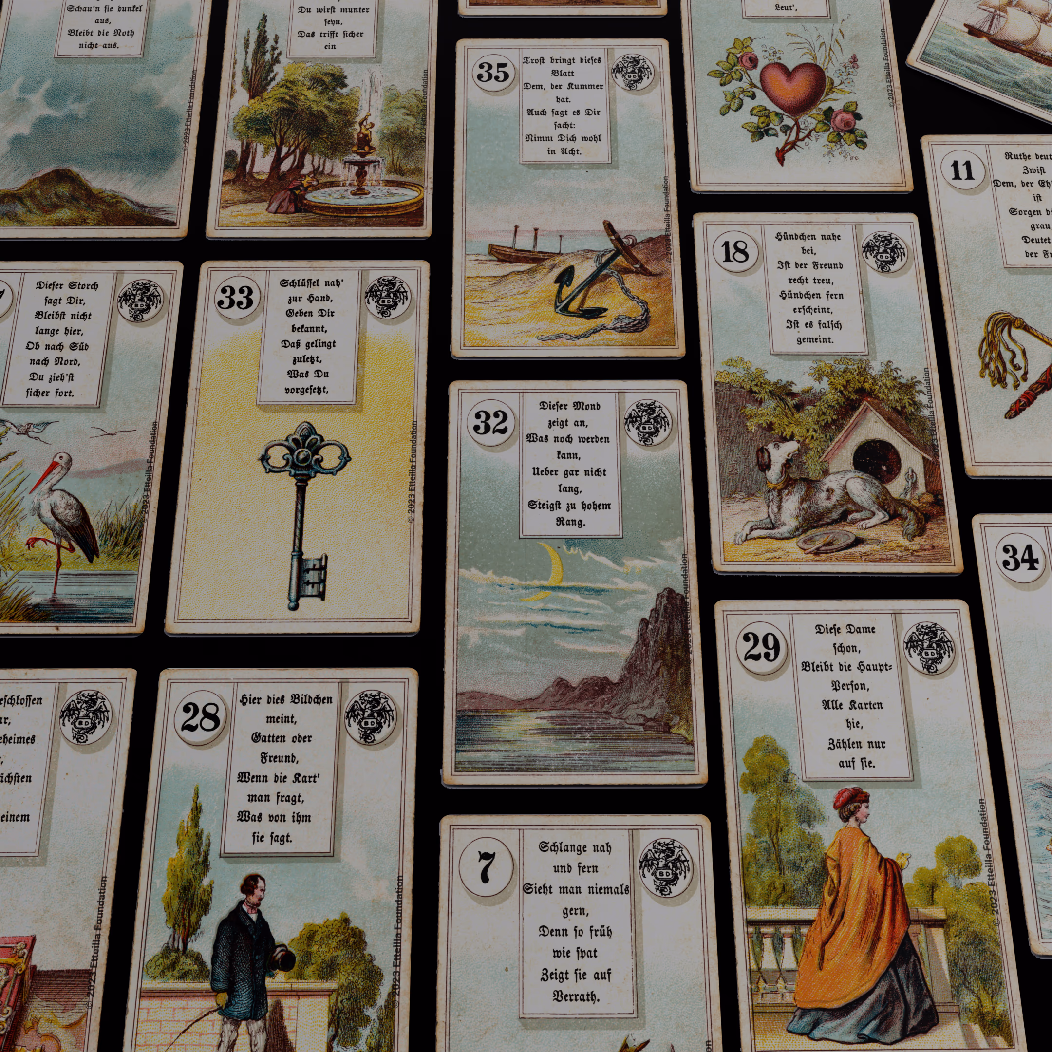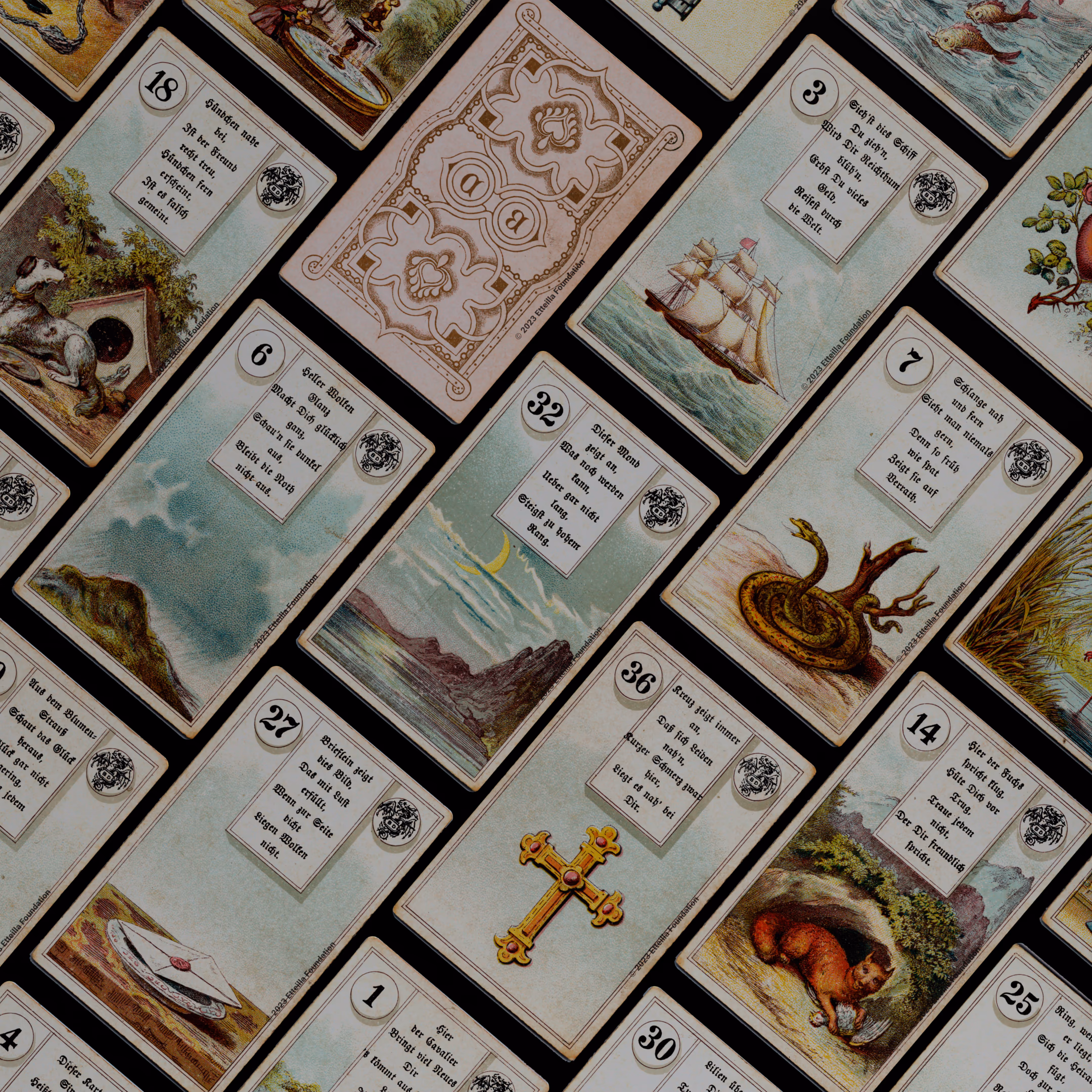 This Dondorf Wahrsage-Karten is an Oracle Deck from the Petit Lenormand family. It was manufactured by Bernard J. Dondorf in Germany in the year 1910. The deck features the Petit Lenormand face pattern which is a popular style in oracle decks and text in German on all cards.
