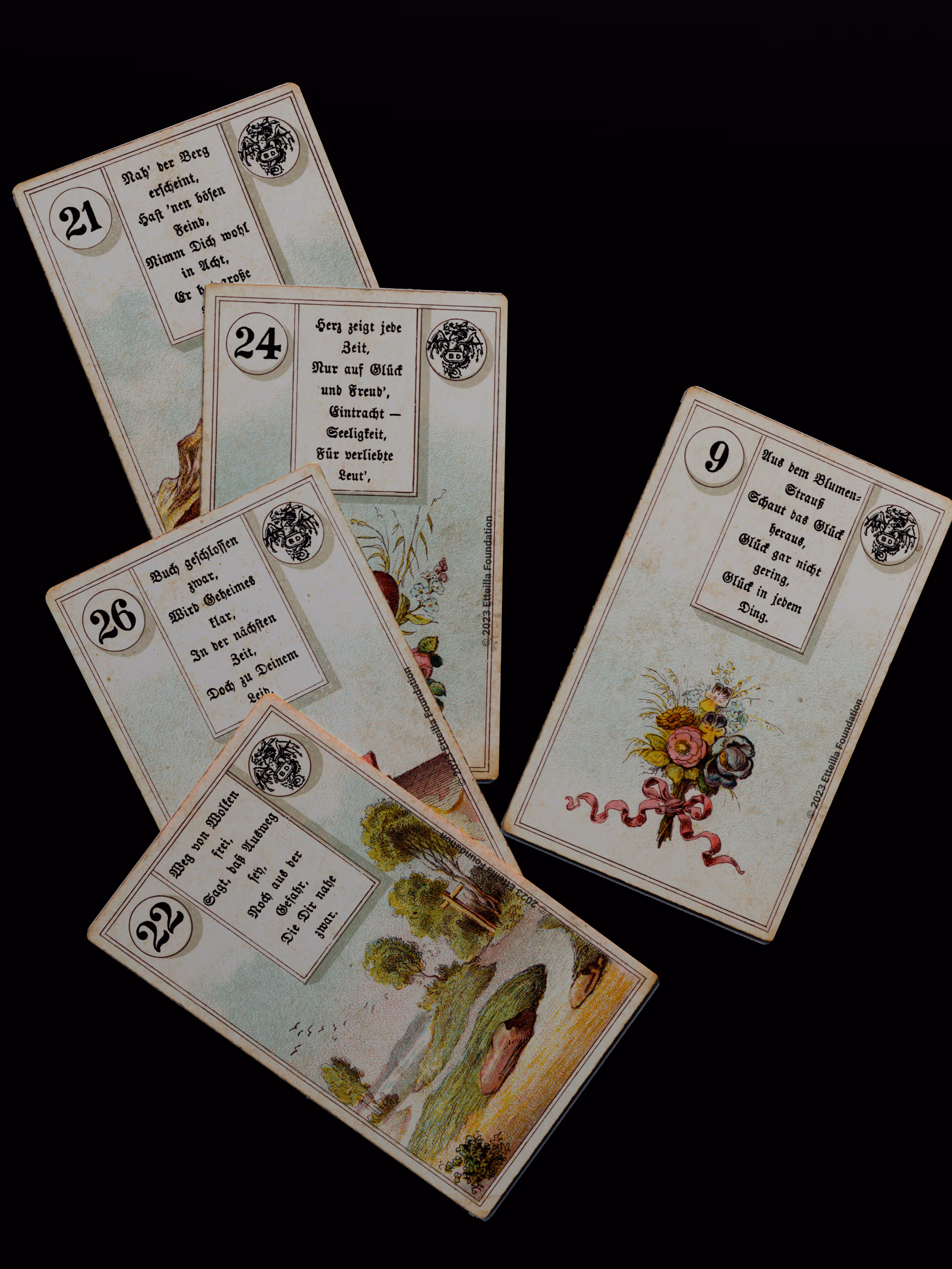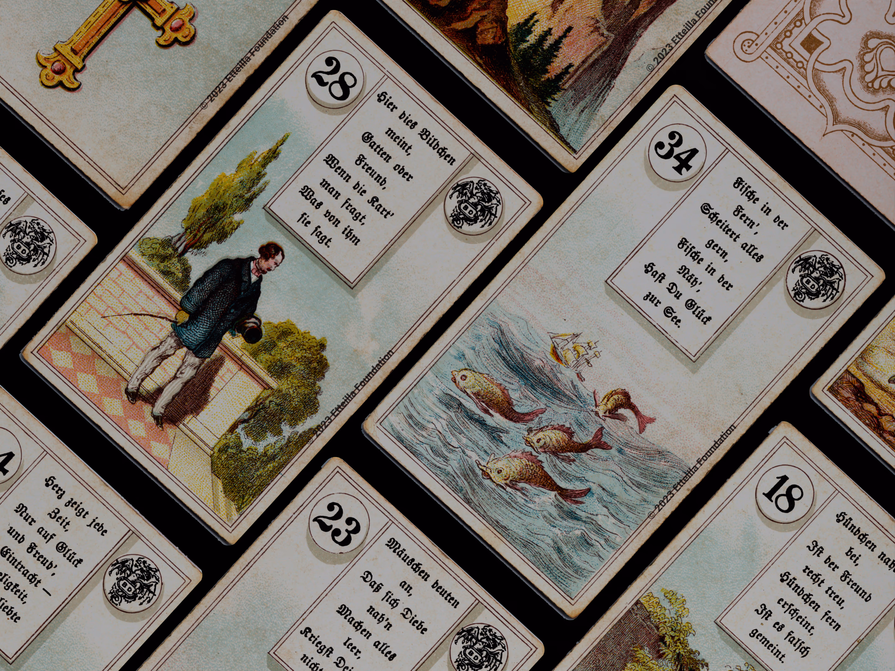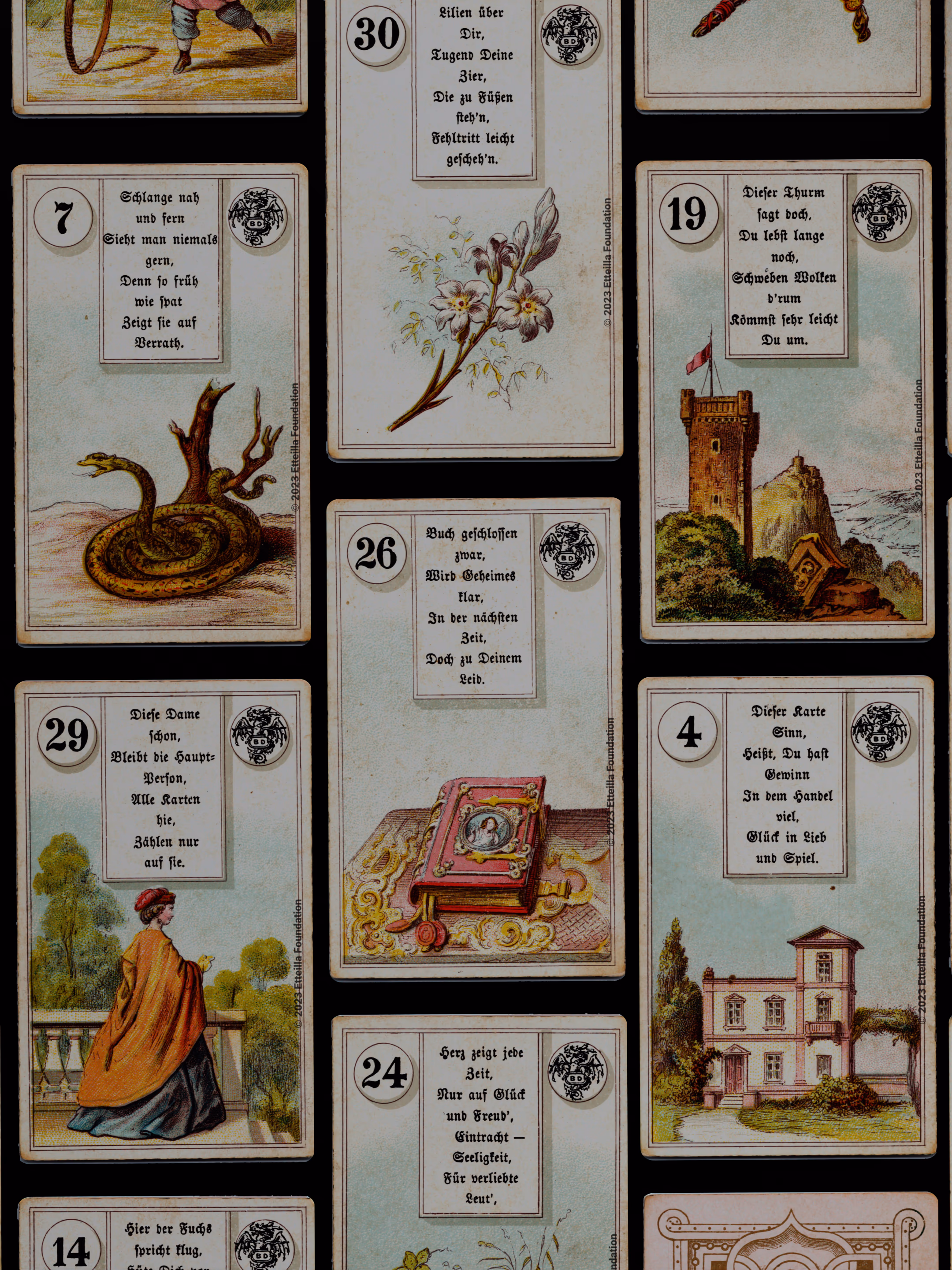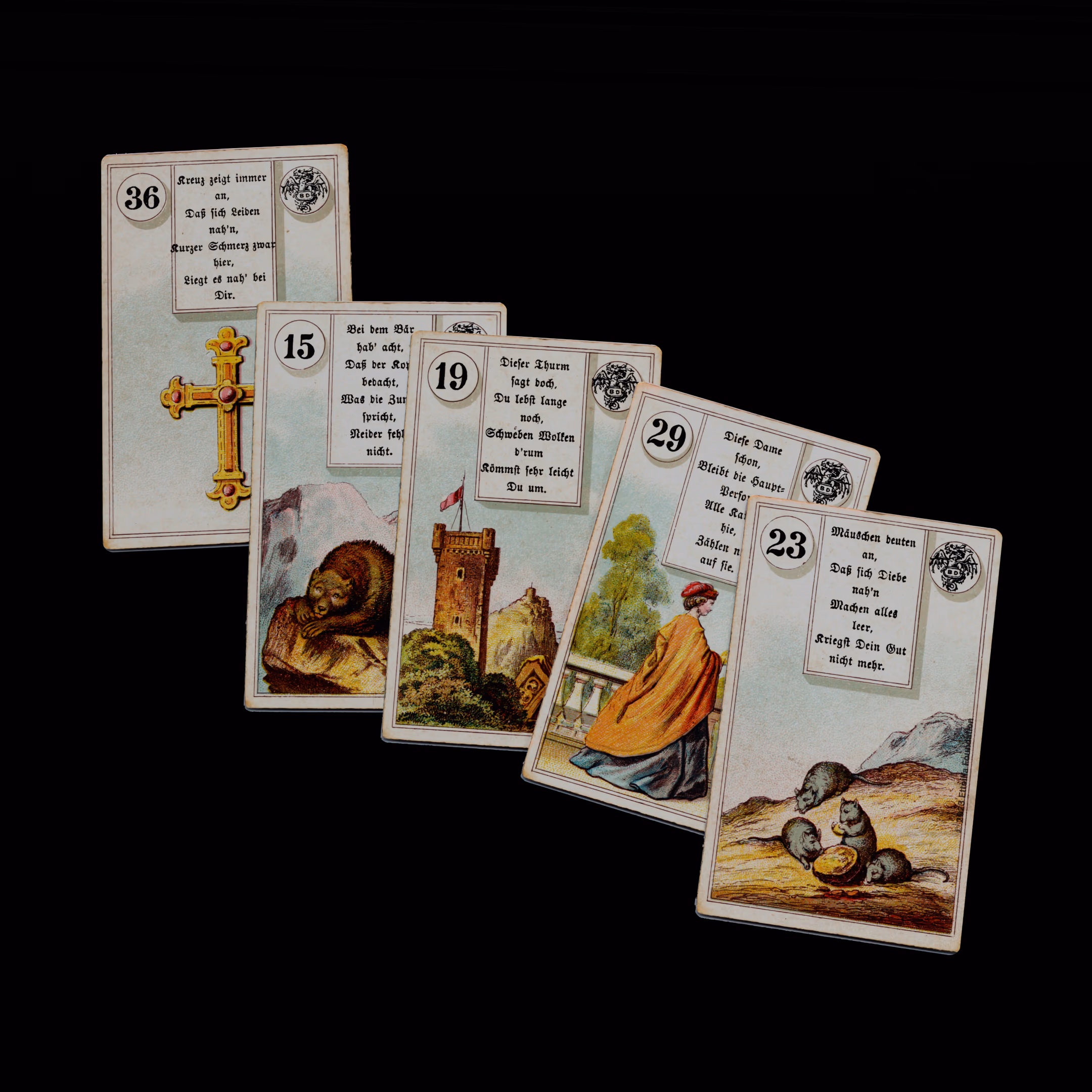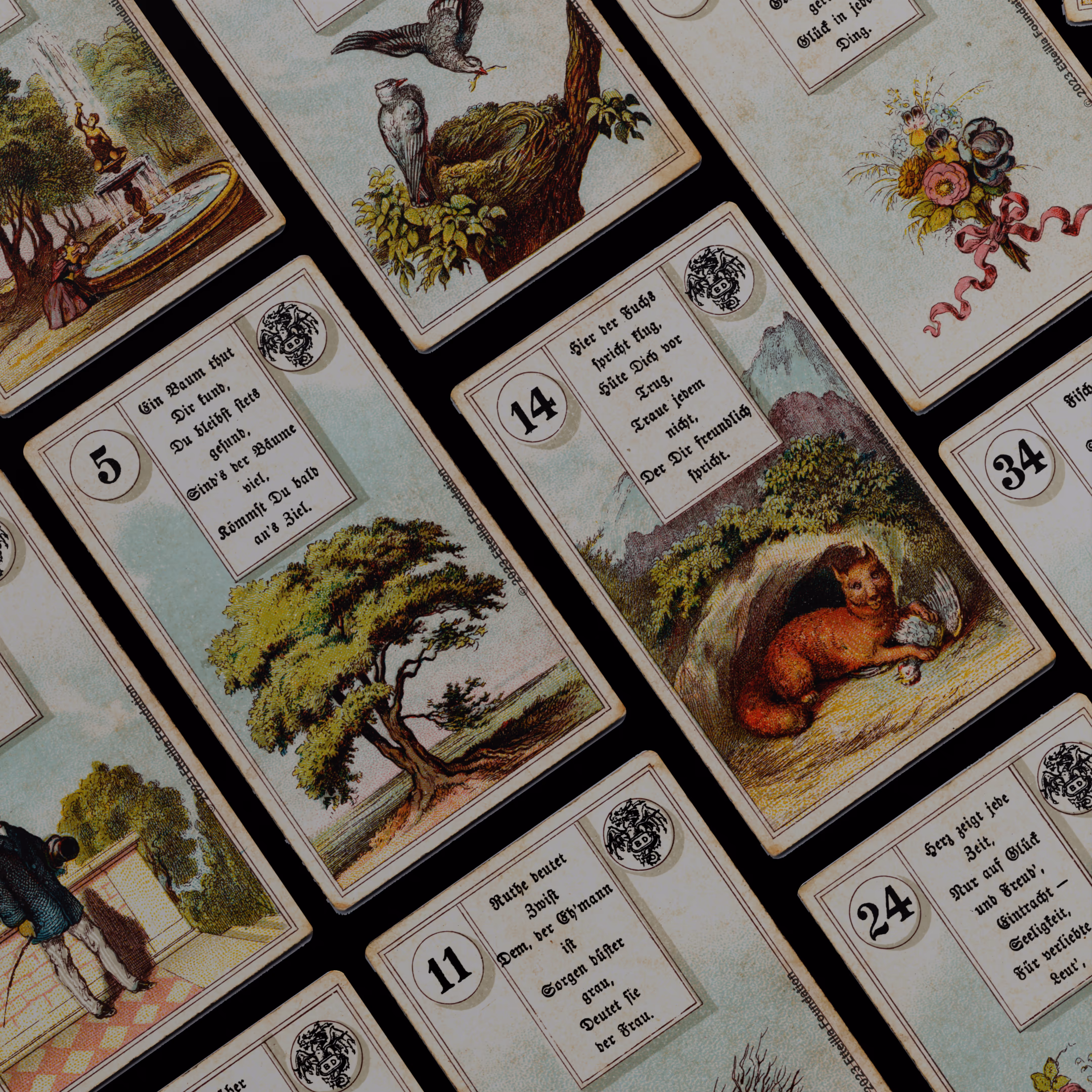 This Dondorf Wahrsage-Karten is an Oracle Deck from the Petit Lenormand family. It was manufactured by Bernard J. Dondorf in Germany in the year 1910. The deck features the Petit Lenormand face pattern which is a popular style in oracle decks and text in German on all cards.