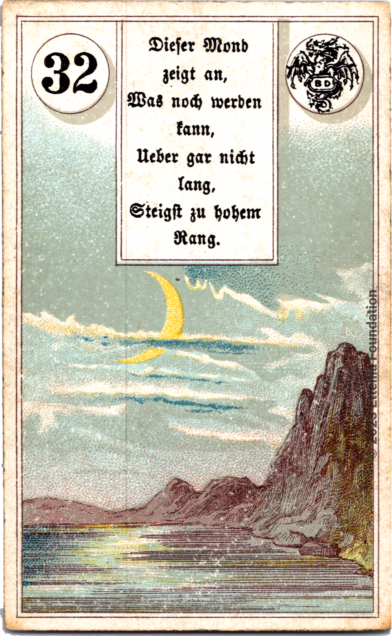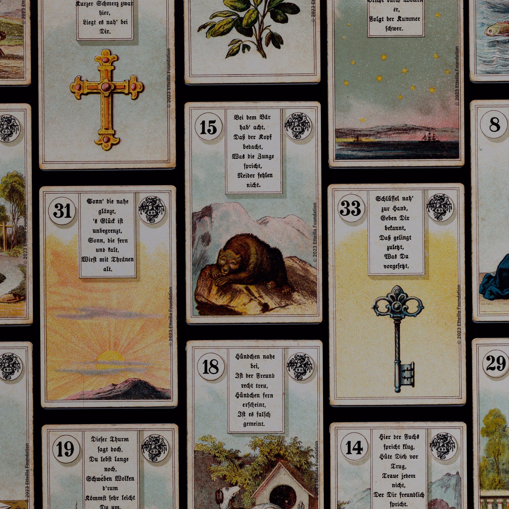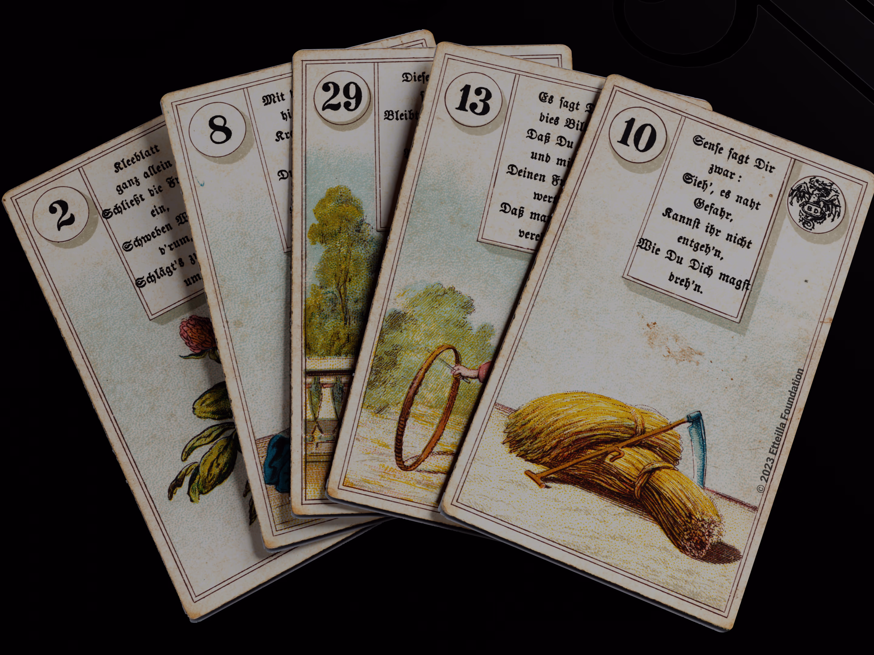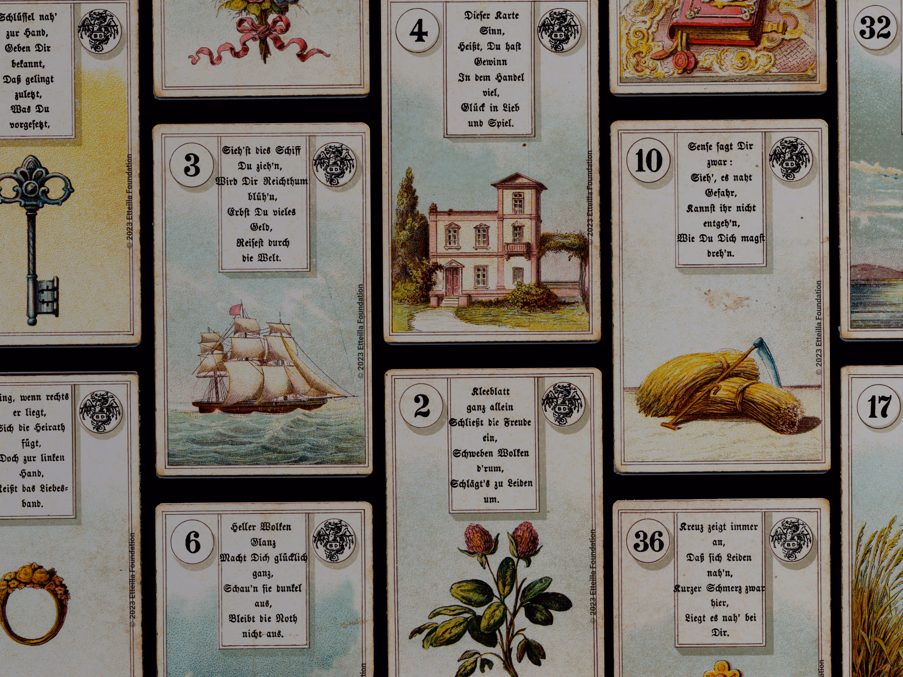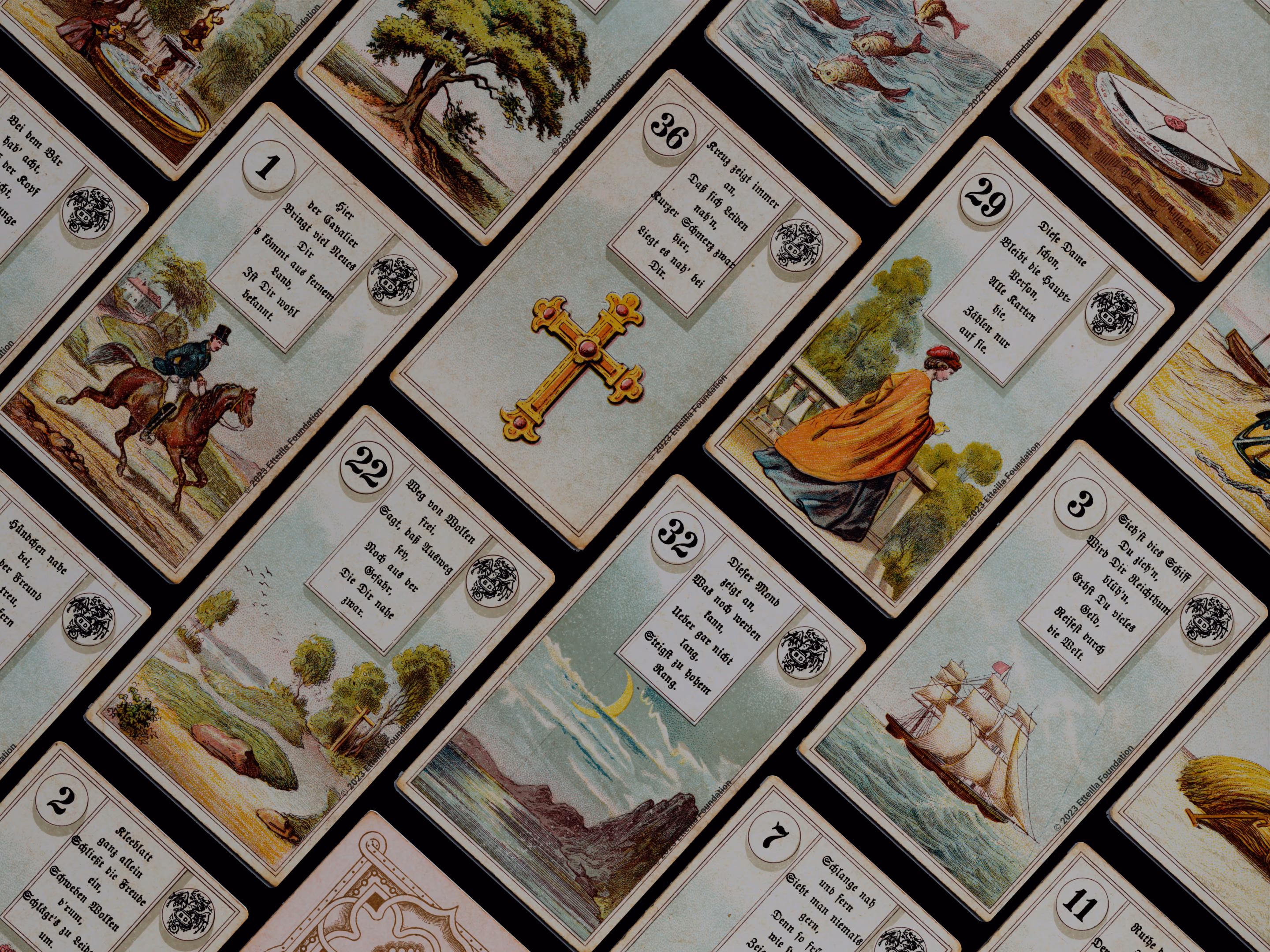 This Dondorf Wahrsage-Karten is an Oracle Deck from the Petit Lenormand family. It was manufactured by Bernard J. Dondorf in Germany in the year 1910. The deck features the Petit Lenormand face pattern which is a popular style in oracle decks and text in German on all cards.