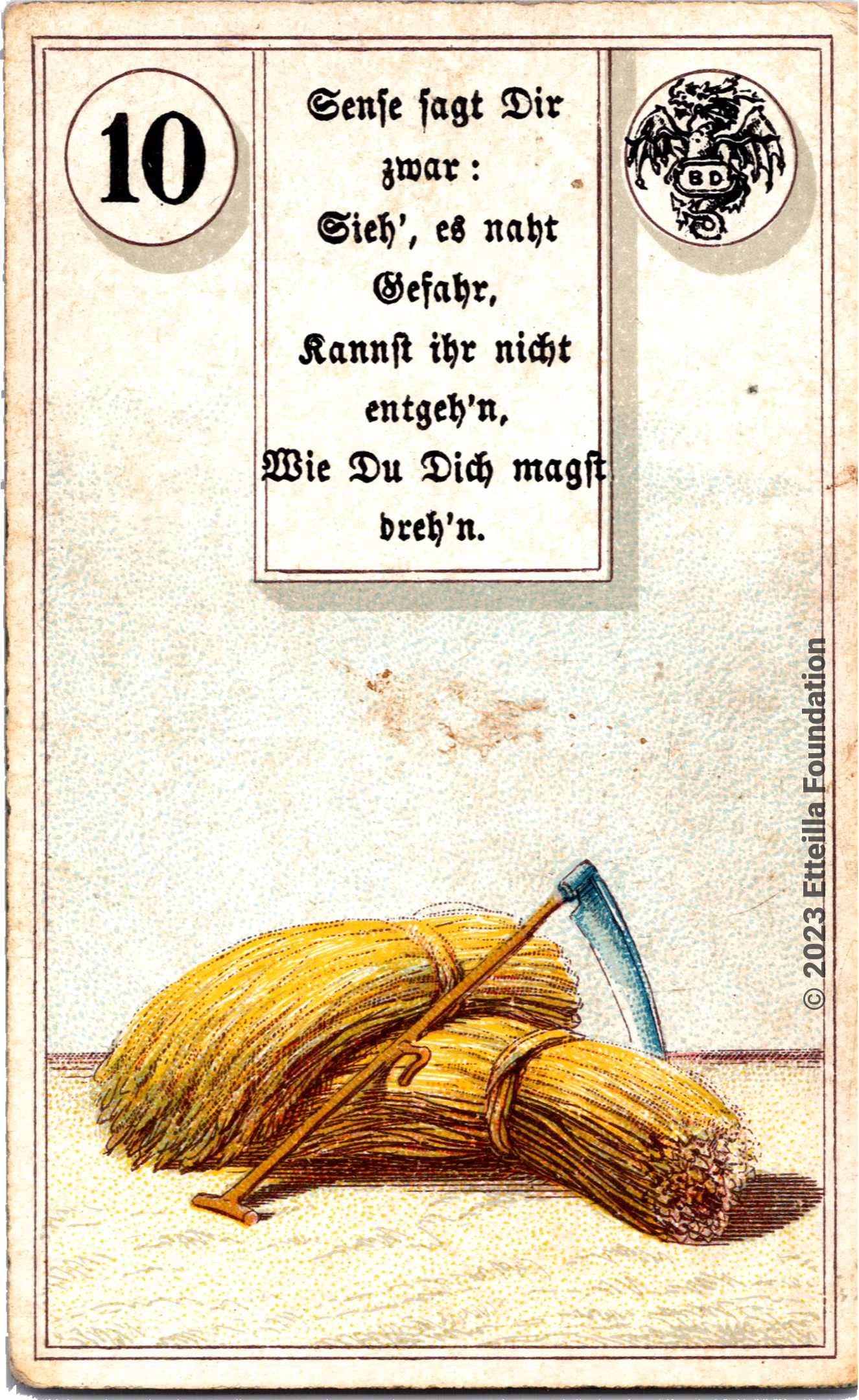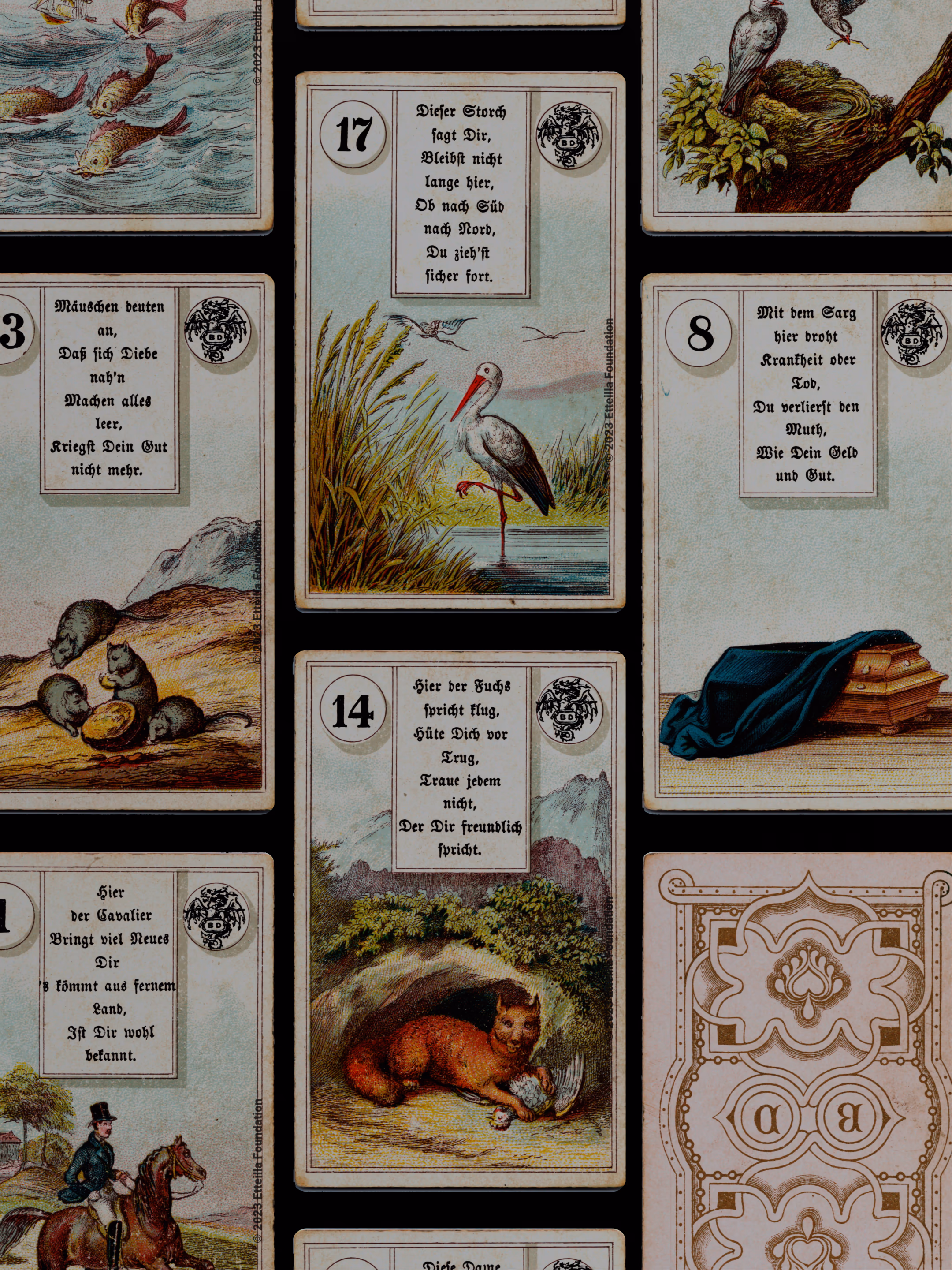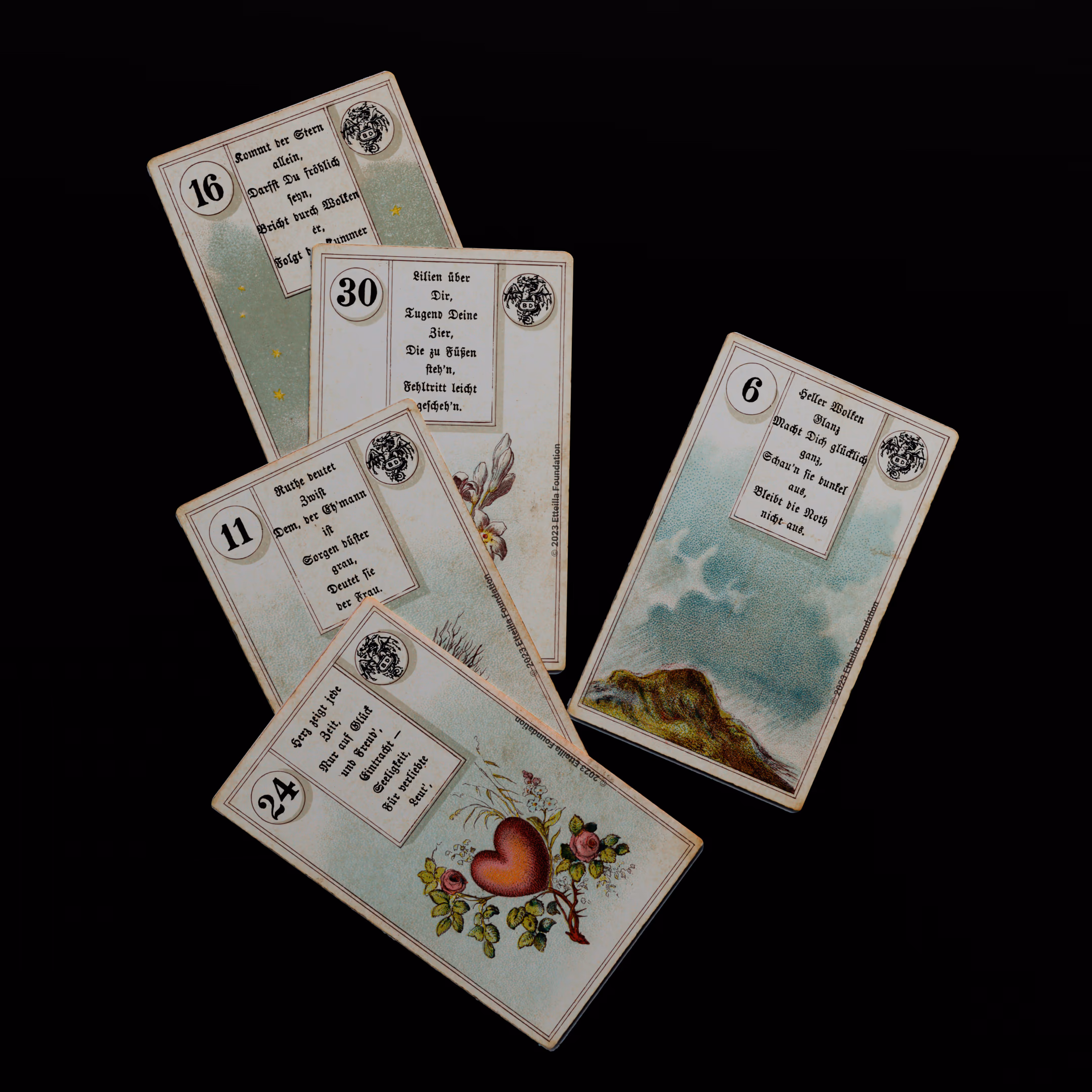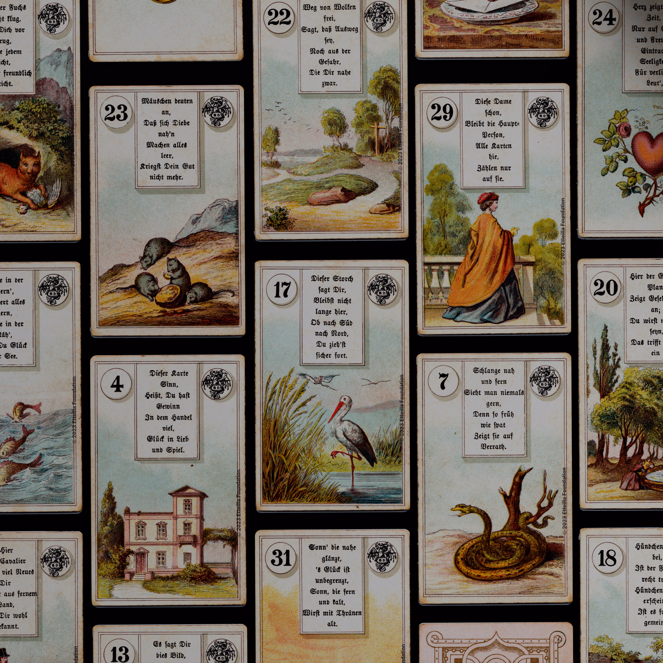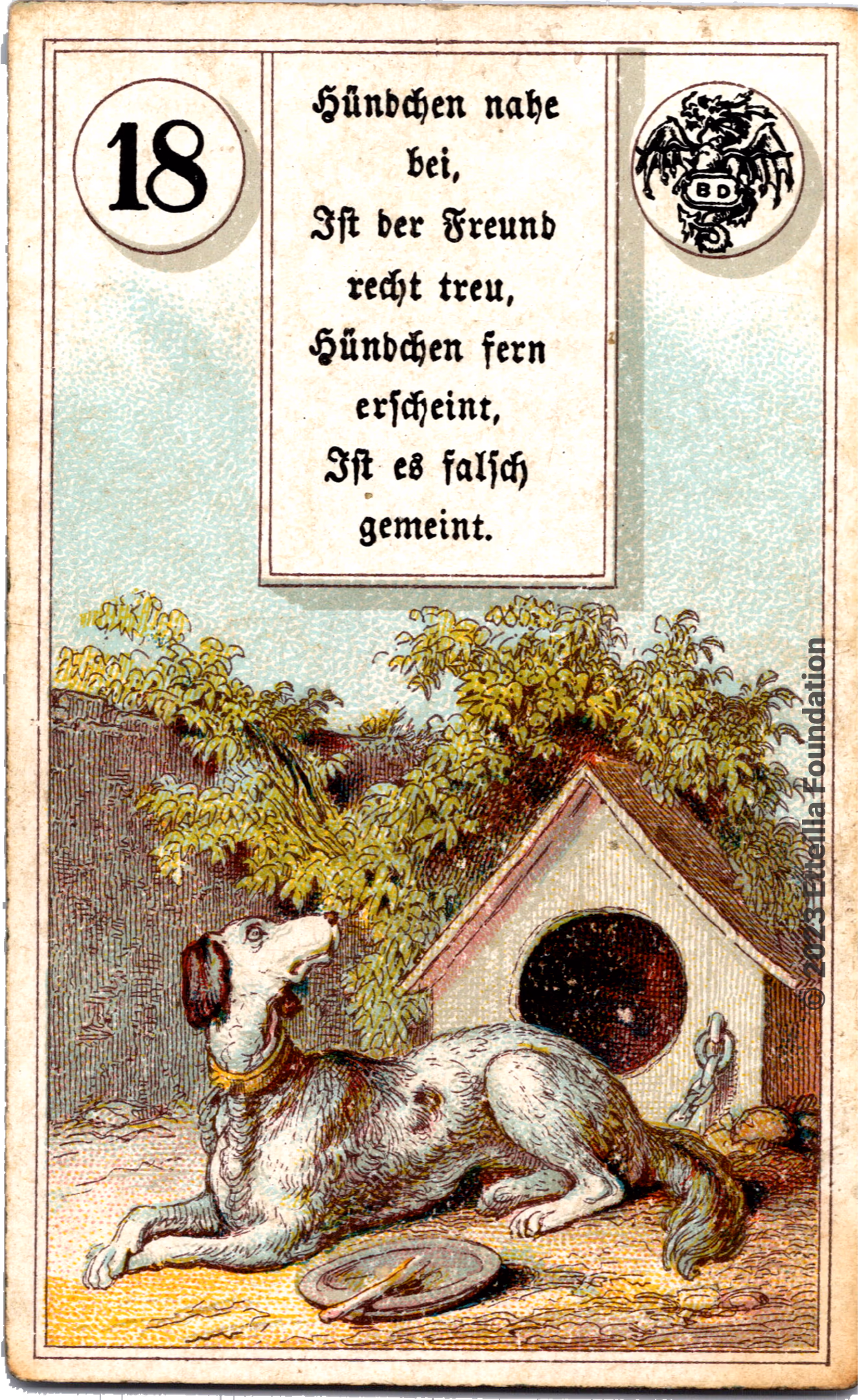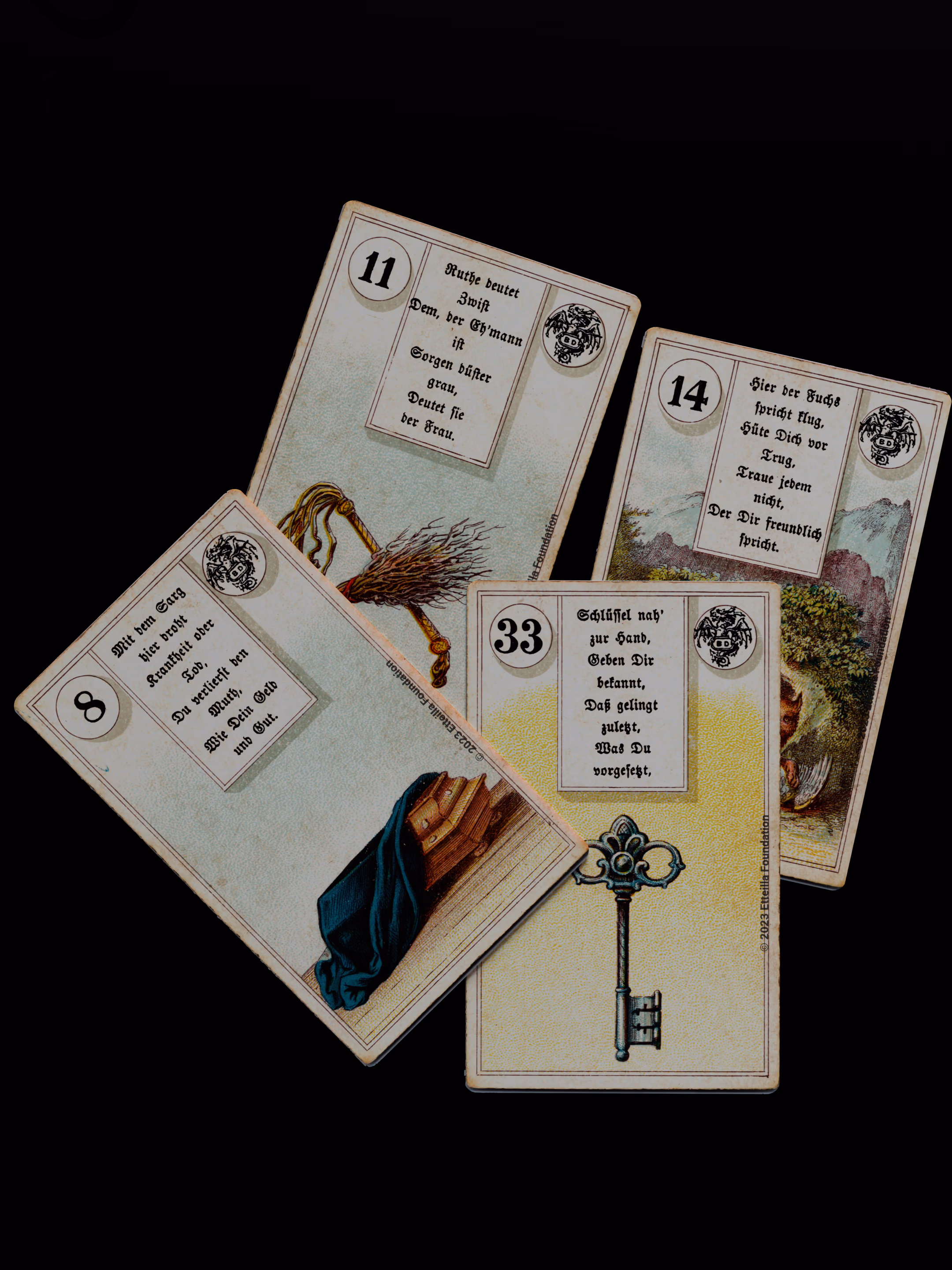 This Dondorf Wahrsage-Karten is an Oracle Deck from the Petit Lenormand family. It was manufactured by Bernard J. Dondorf in Germany in the year 1910. The deck features the Petit Lenormand face pattern which is a popular style in oracle decks and text in German on all cards.
