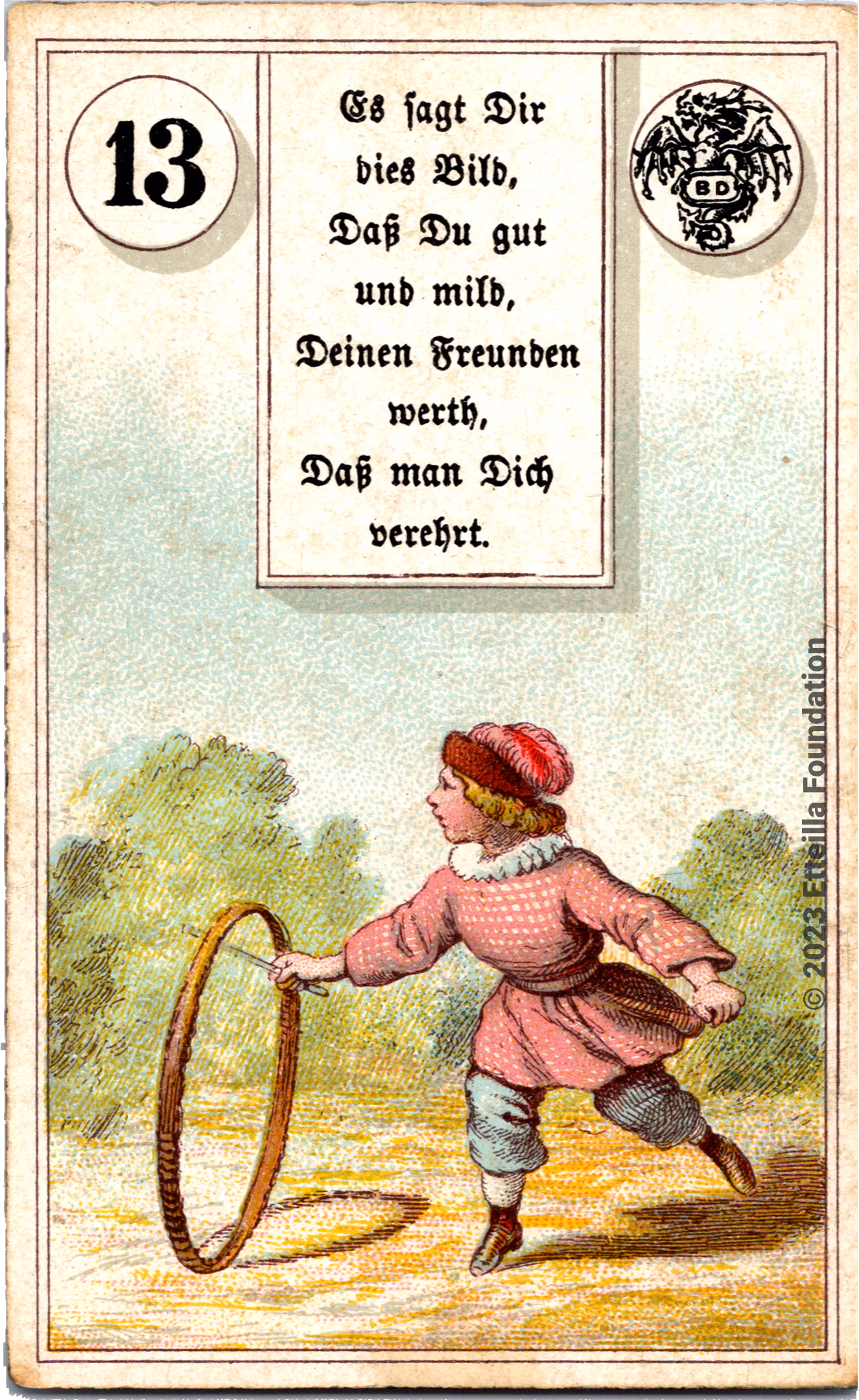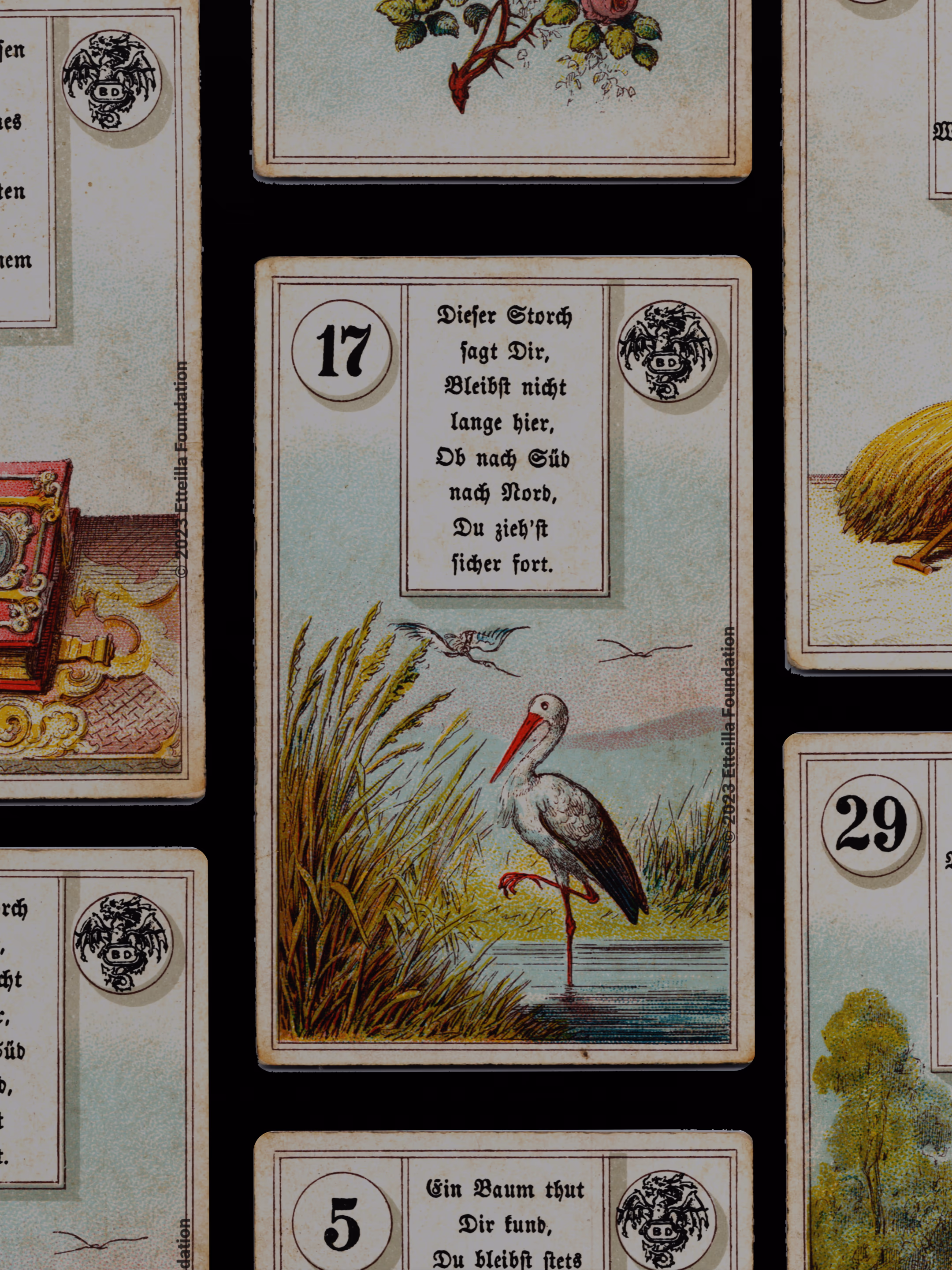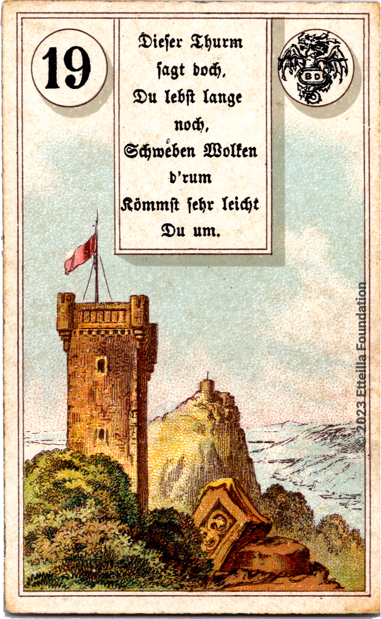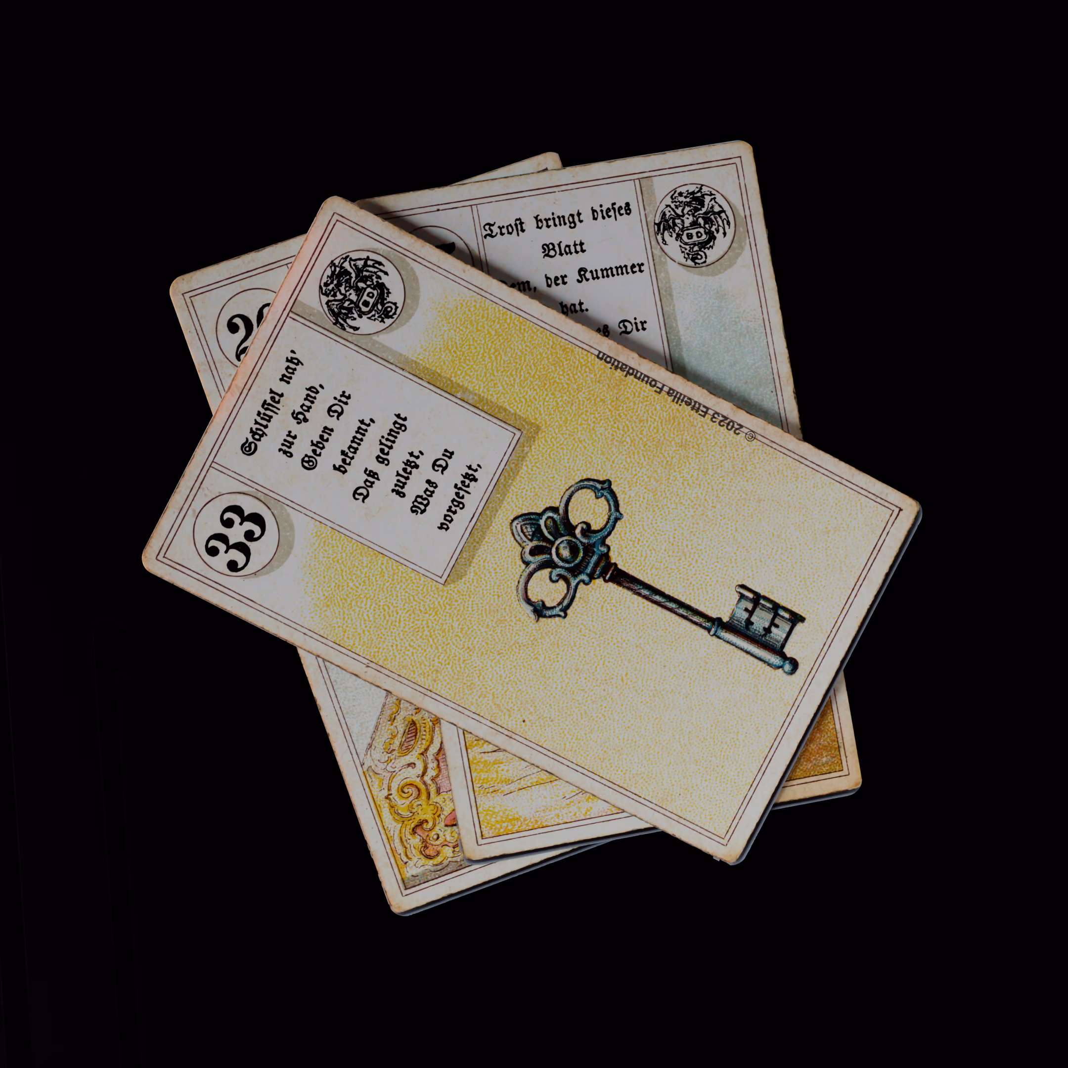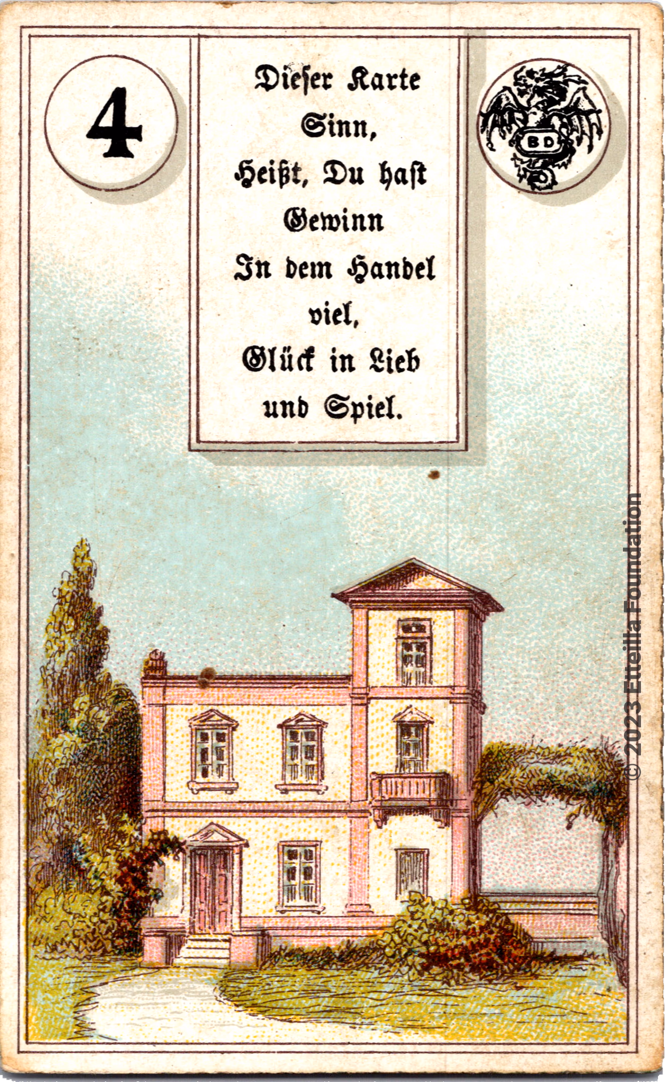 This Dondorf Wahrsage-Karten is an Oracle Deck from the Petit Lenormand family. It was manufactured by Bernard J. Dondorf in Germany in the year 1910. The deck features the Petit Lenormand face pattern which is a popular style in oracle decks and text in German on all cards.